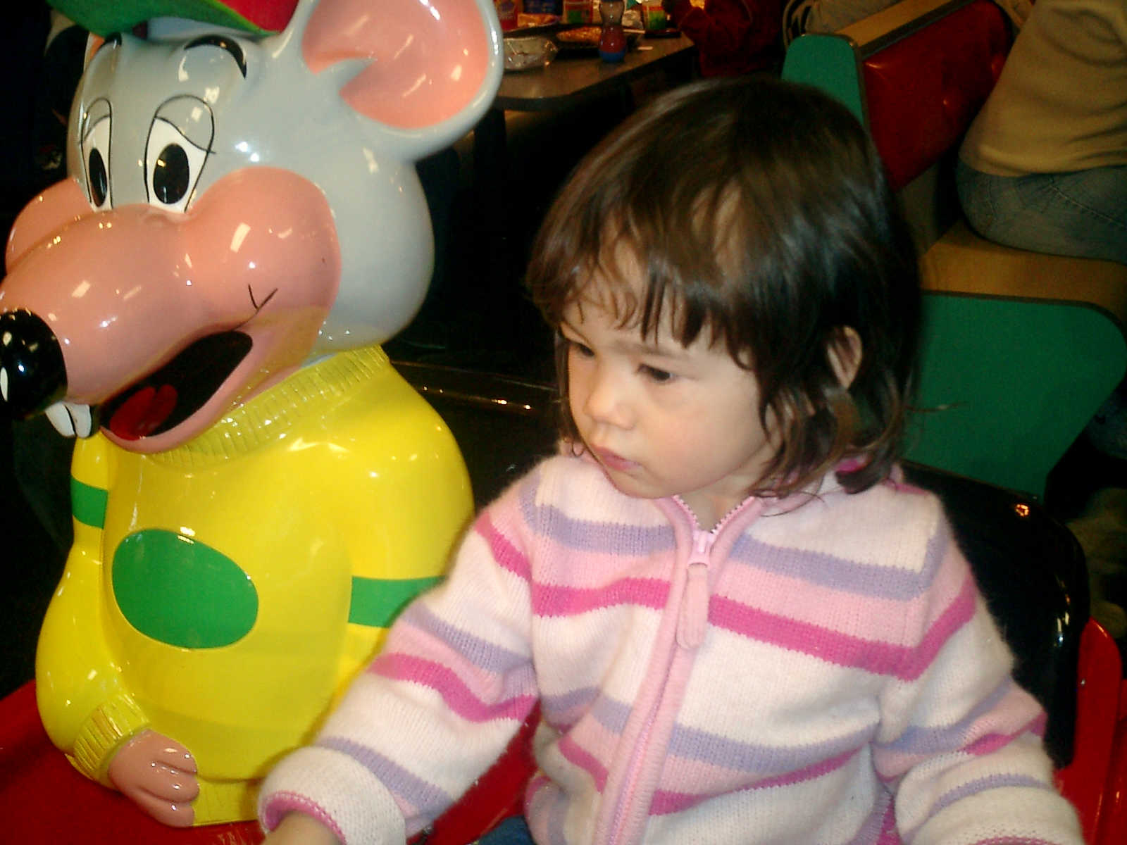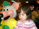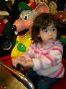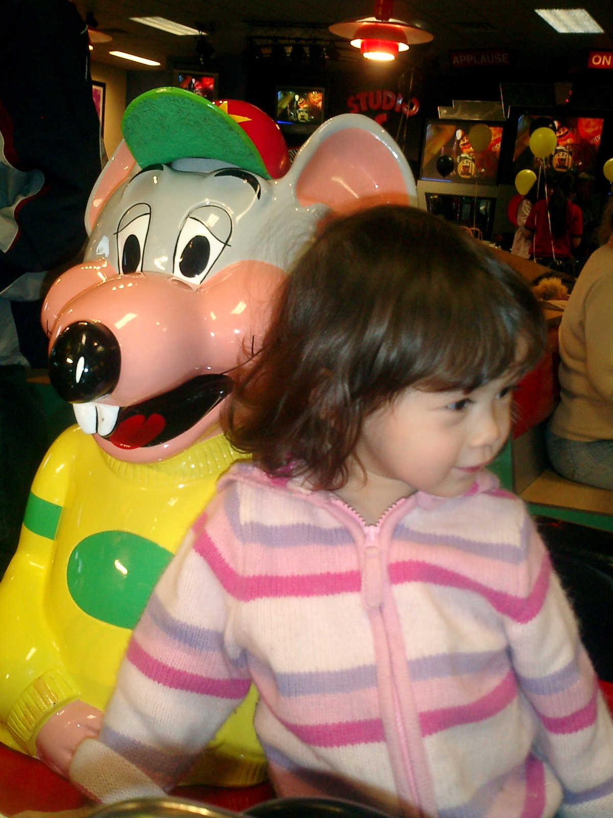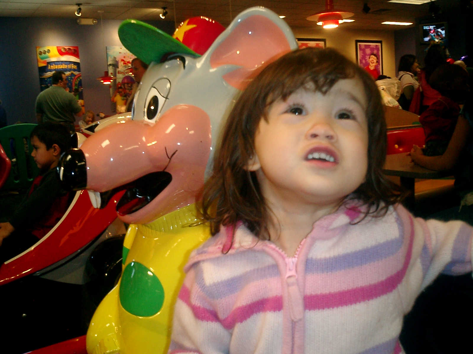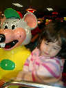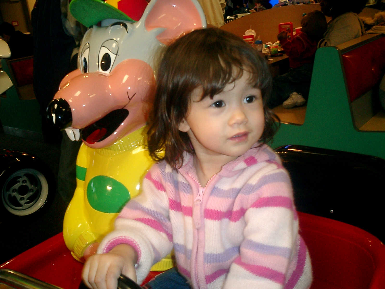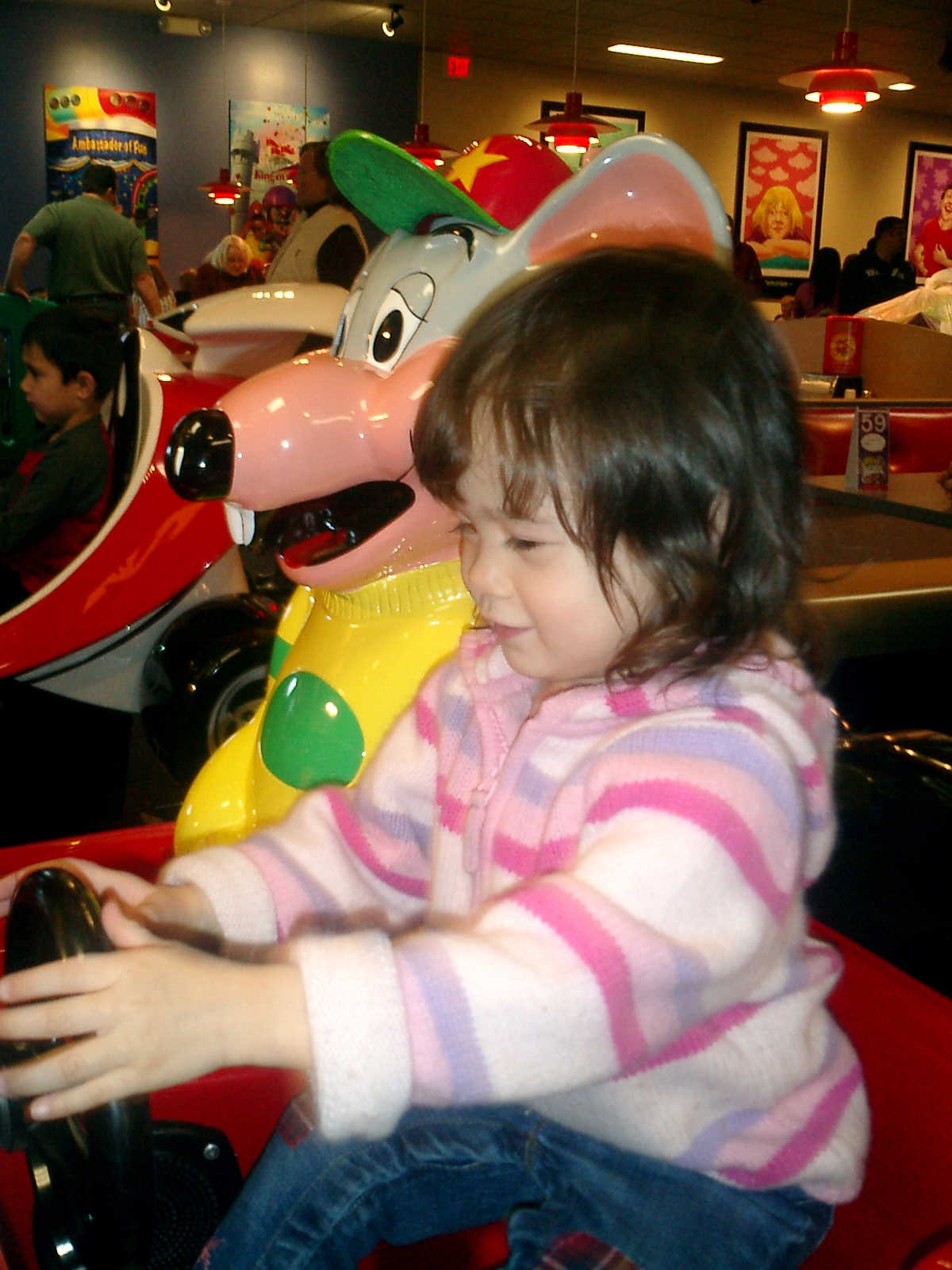 Nadine at 2 years and 2 months (January 31, 2009), on an outing to Chuck-E-Cheese's. Nadine, did you have fun riding in the car with Chuck-E-Cheese? (I know you did!)