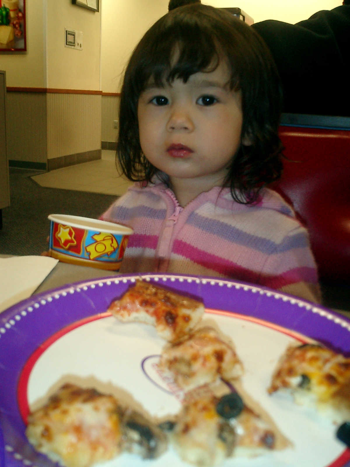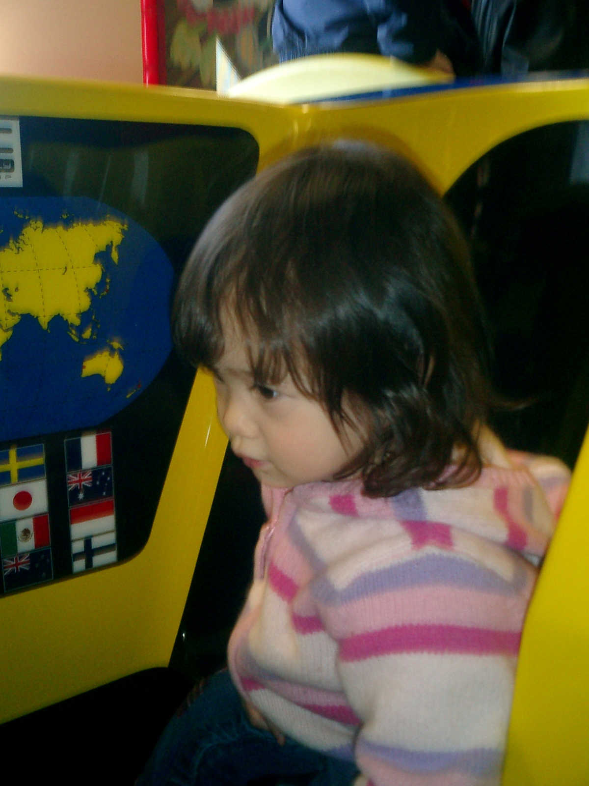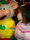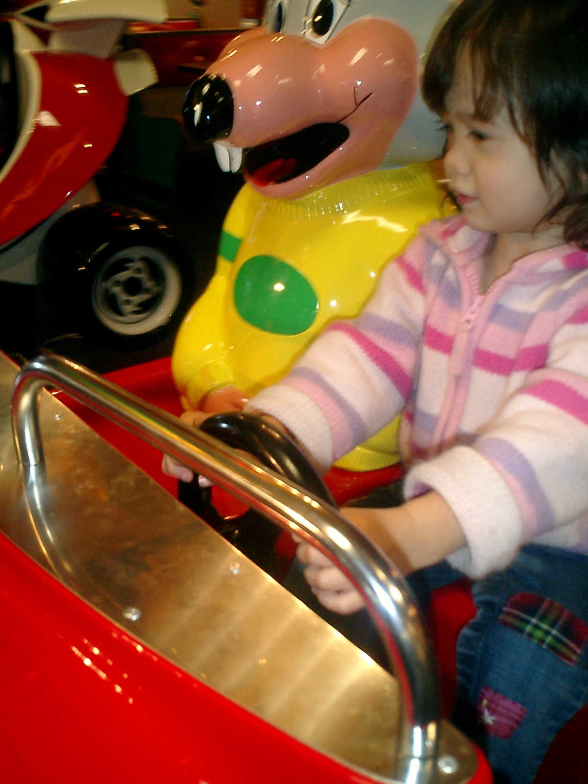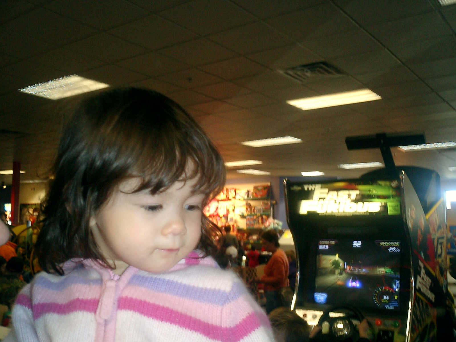 Nadine at 2 years and 2 months (January 31, 2009), on an outing to Chuck-E-Cheese's. Nadine, did you have fun riding in the car with Chuck-E-Cheese? (I know you did!)