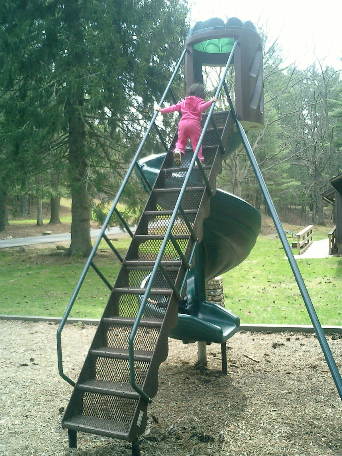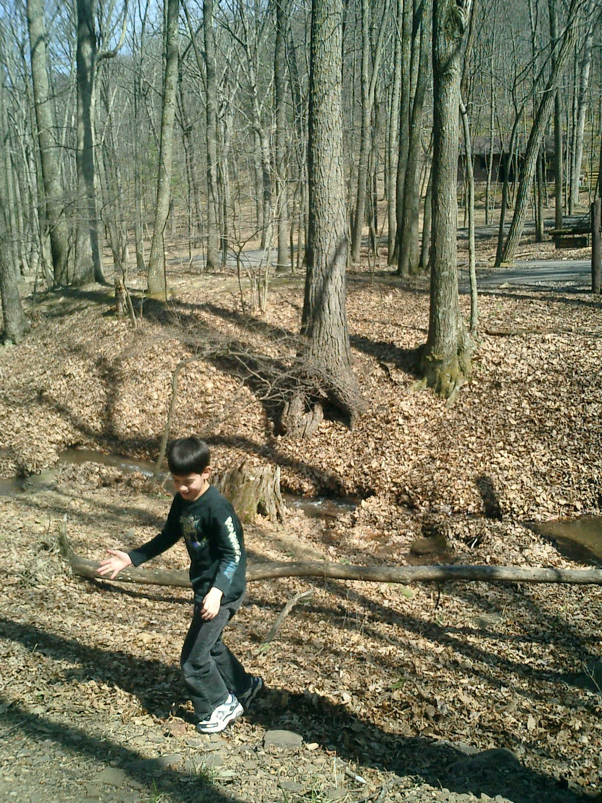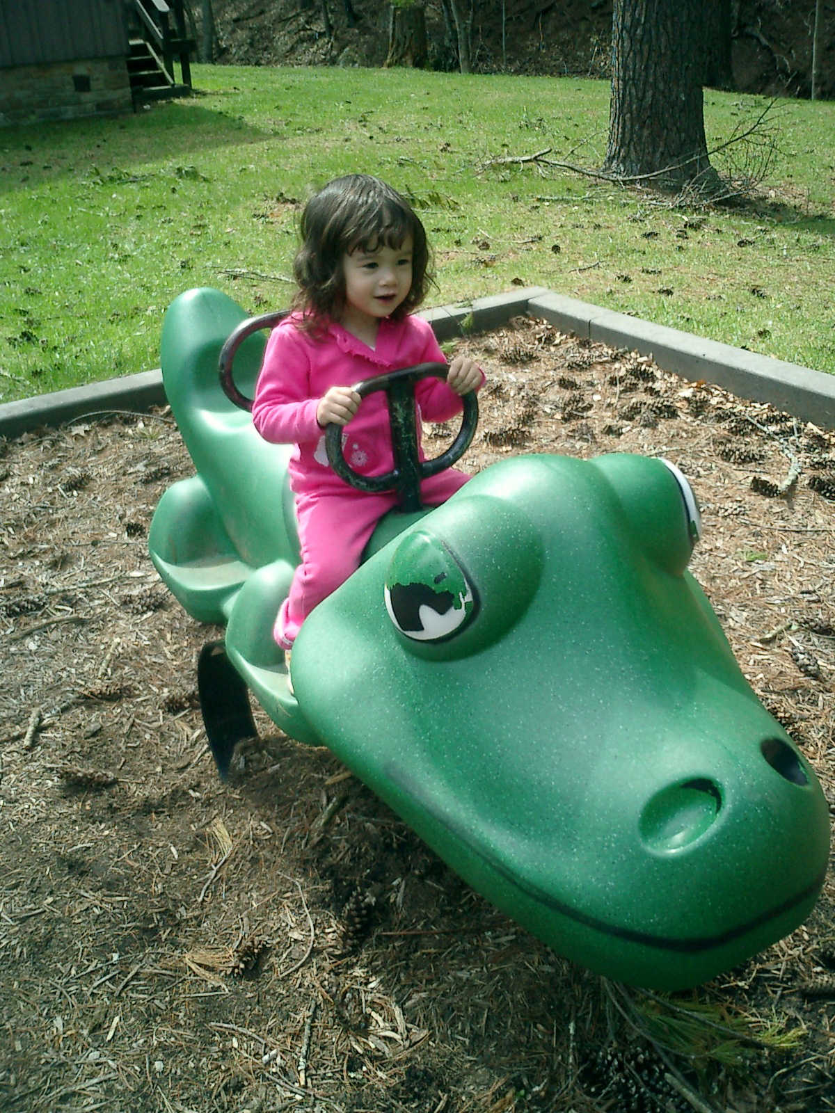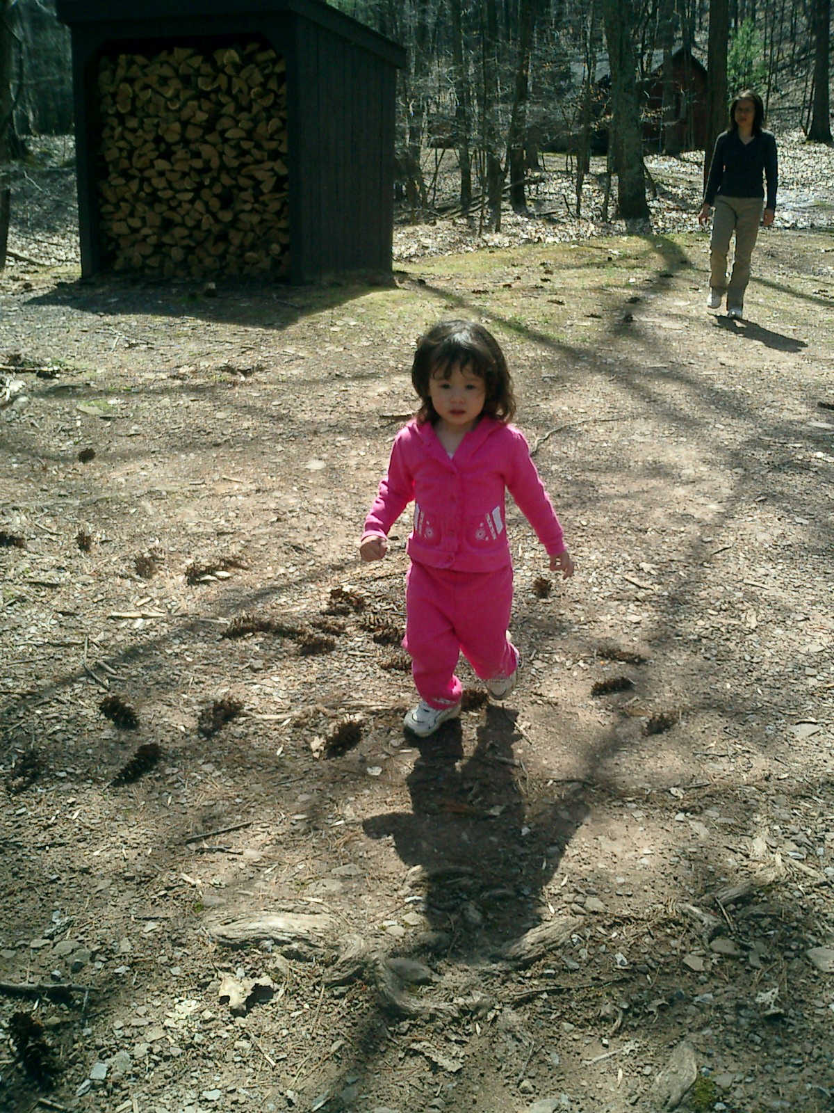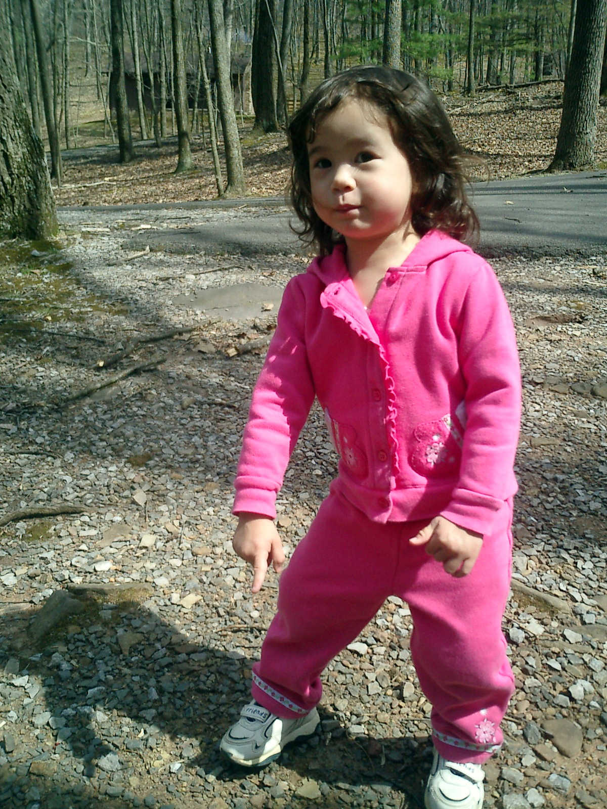 Nadine at 2 years and 4 months (April 5, 2009), enjoying Lost River State Park, including the stream running down the mountainside, and the playground.