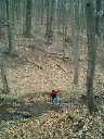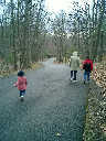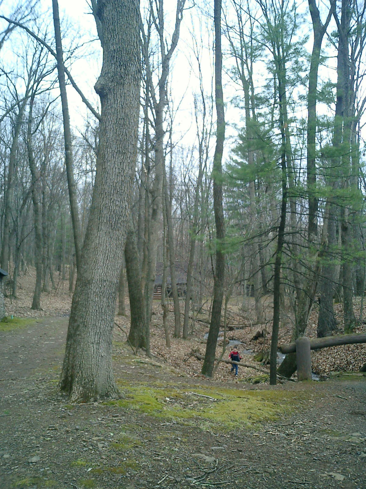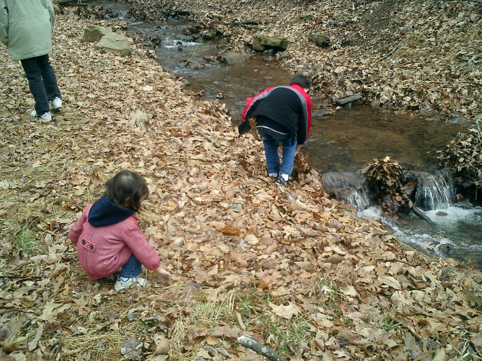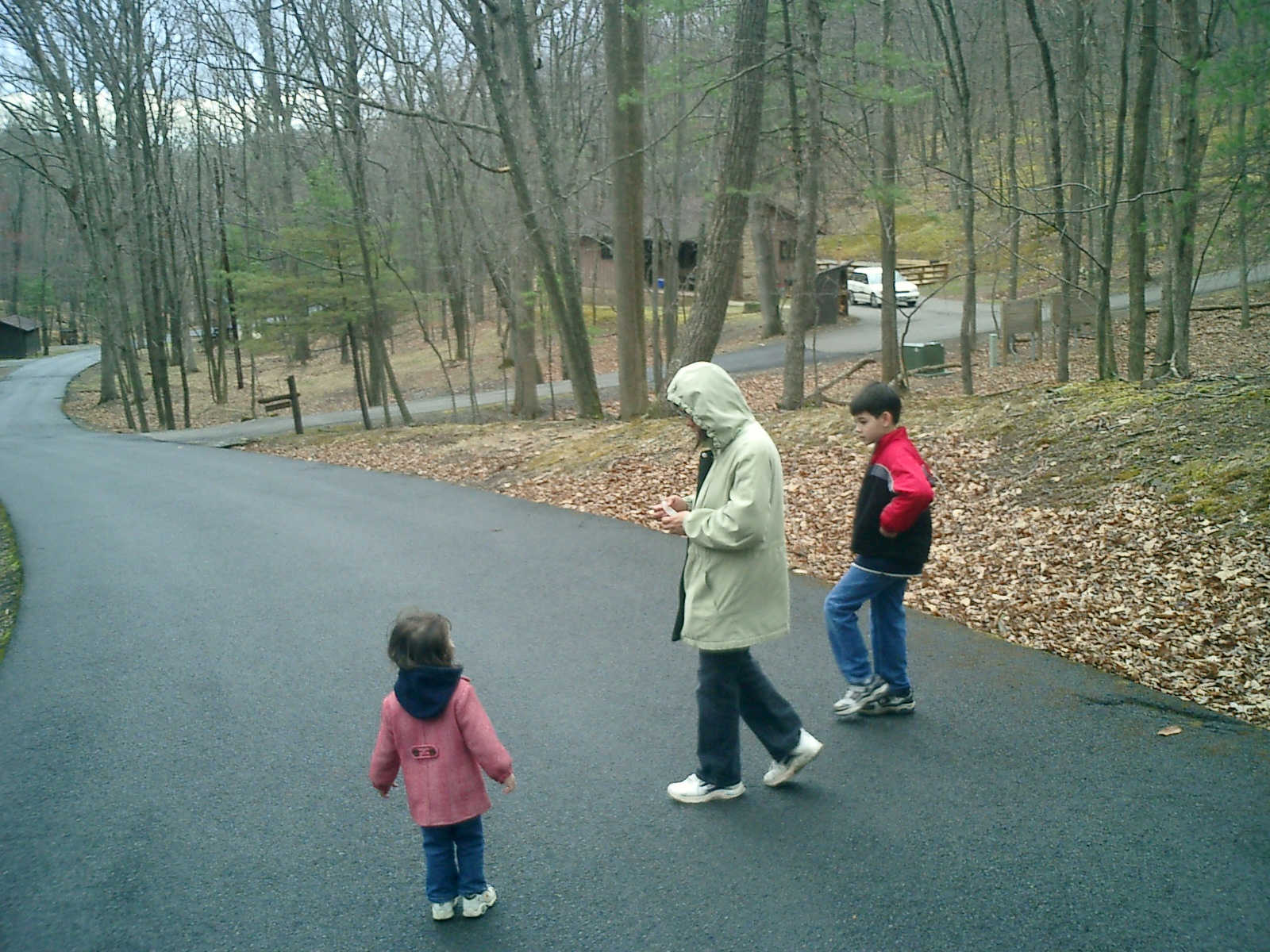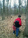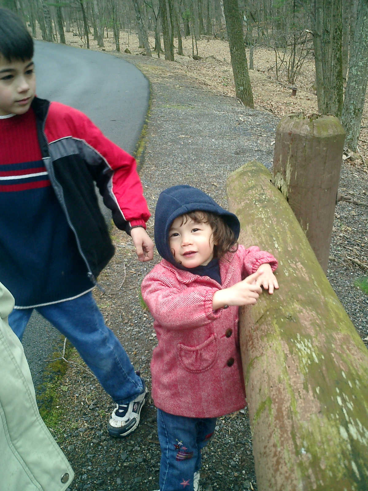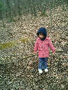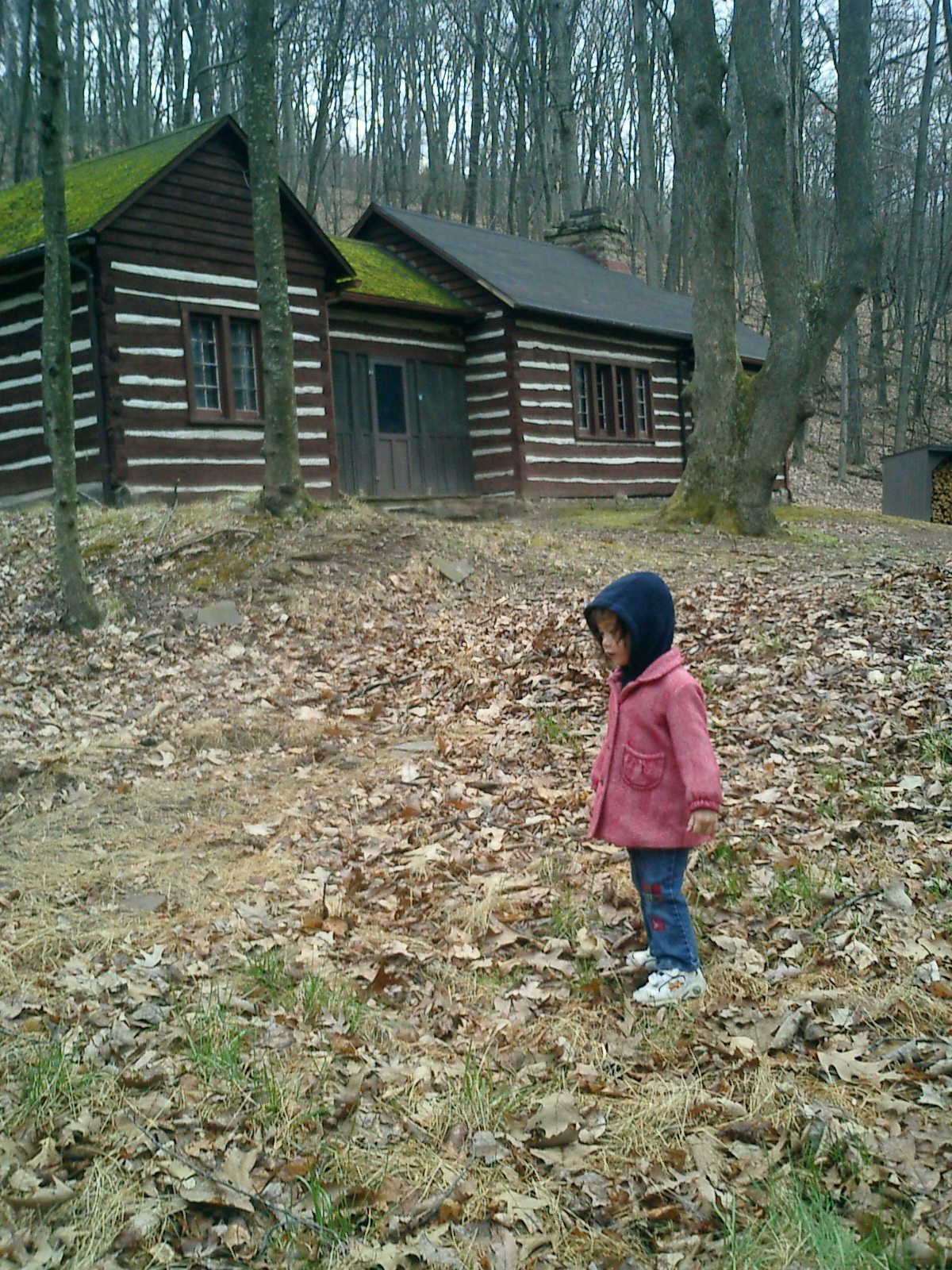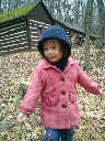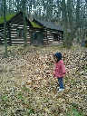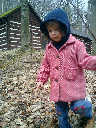 Nadine at 2 years and 4 months (April 6, 2009), exploring the trails nearby our cabin. Nadine, do you like the old-style cabin? You sure did have fun with all those leaves!