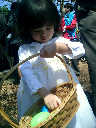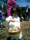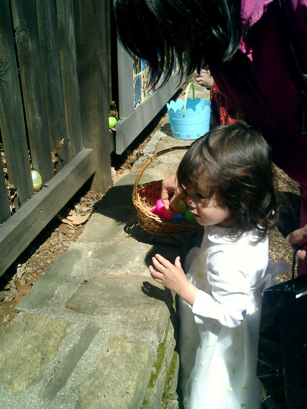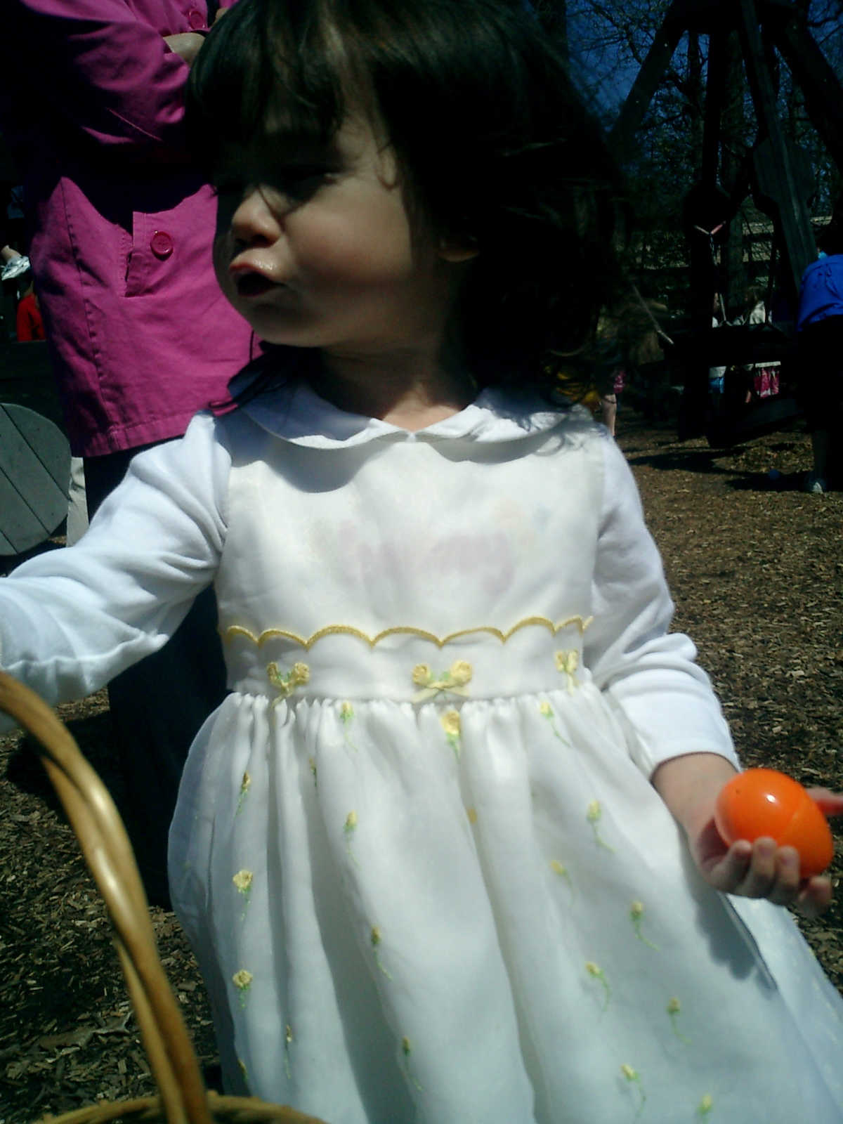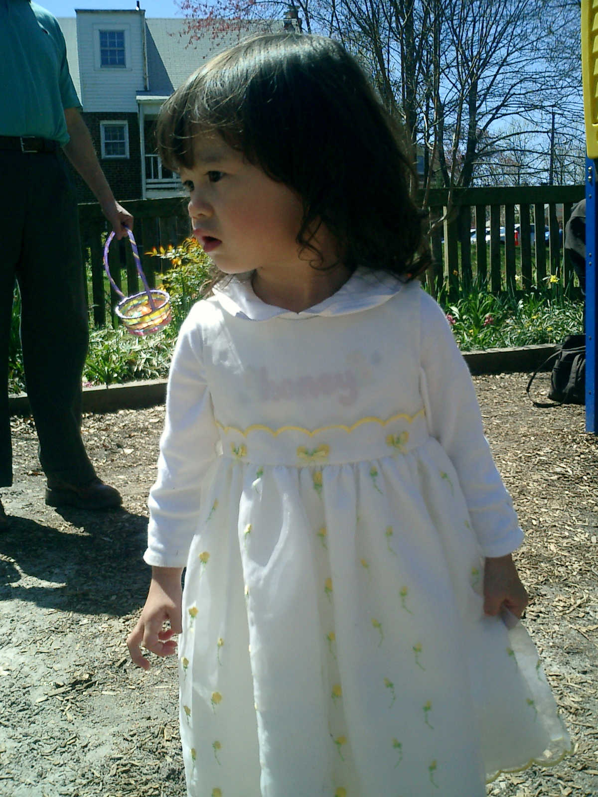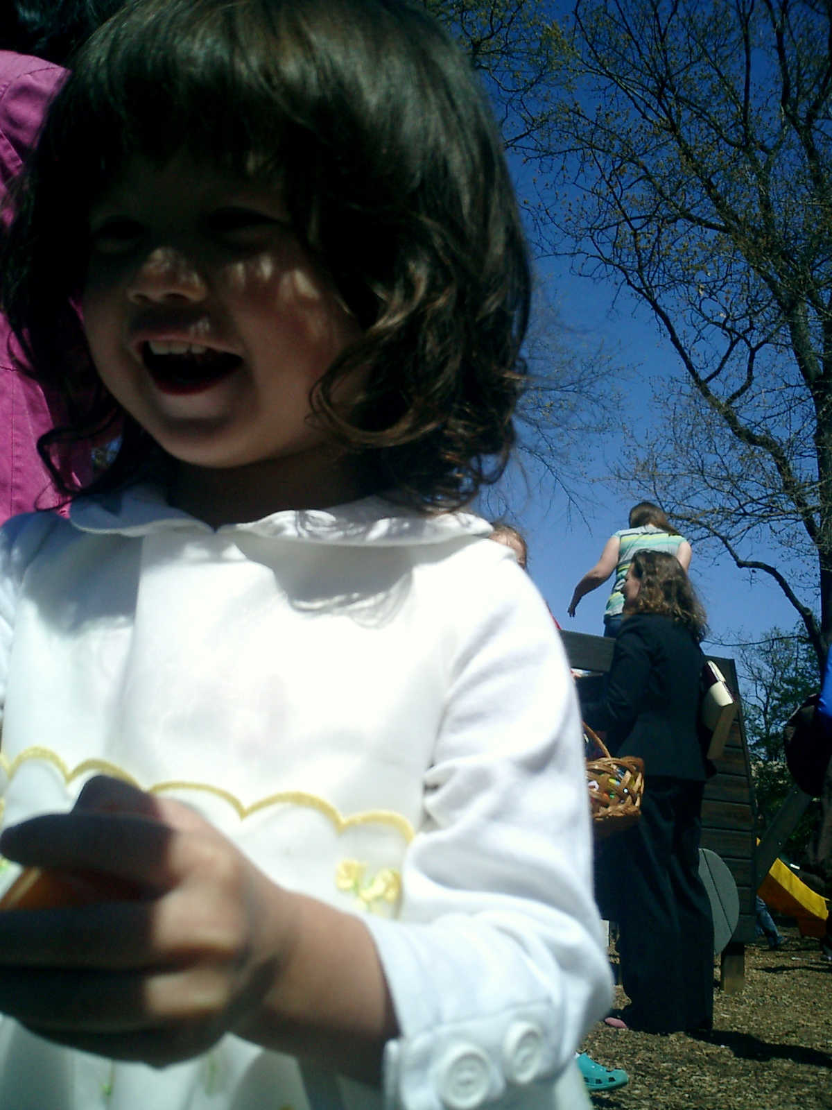 Nadine at 2 years and 5 months (April 12, 2009), enjoying the Easter Egg hunt at Arlington Unitarian Church. Nadine, you look so happy when you find a plastic egg, and even happier when you find chocolate candies inside!