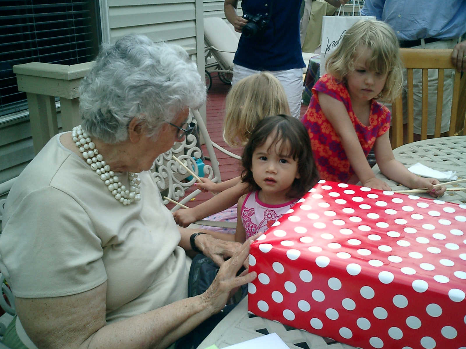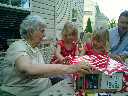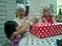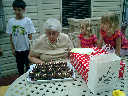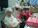 | Nadine at 2 years and 8 months (July 18, 2009), helping celebrate Grandma Alexander's brithday, along with her cousins from Poland -- Charlotte, Katie, and Kaz. You really enjoyed the chocolate cupcakes Mommy made, blowing out the candles, and helping Grandma open her big present -- the brand new laptop computer! |