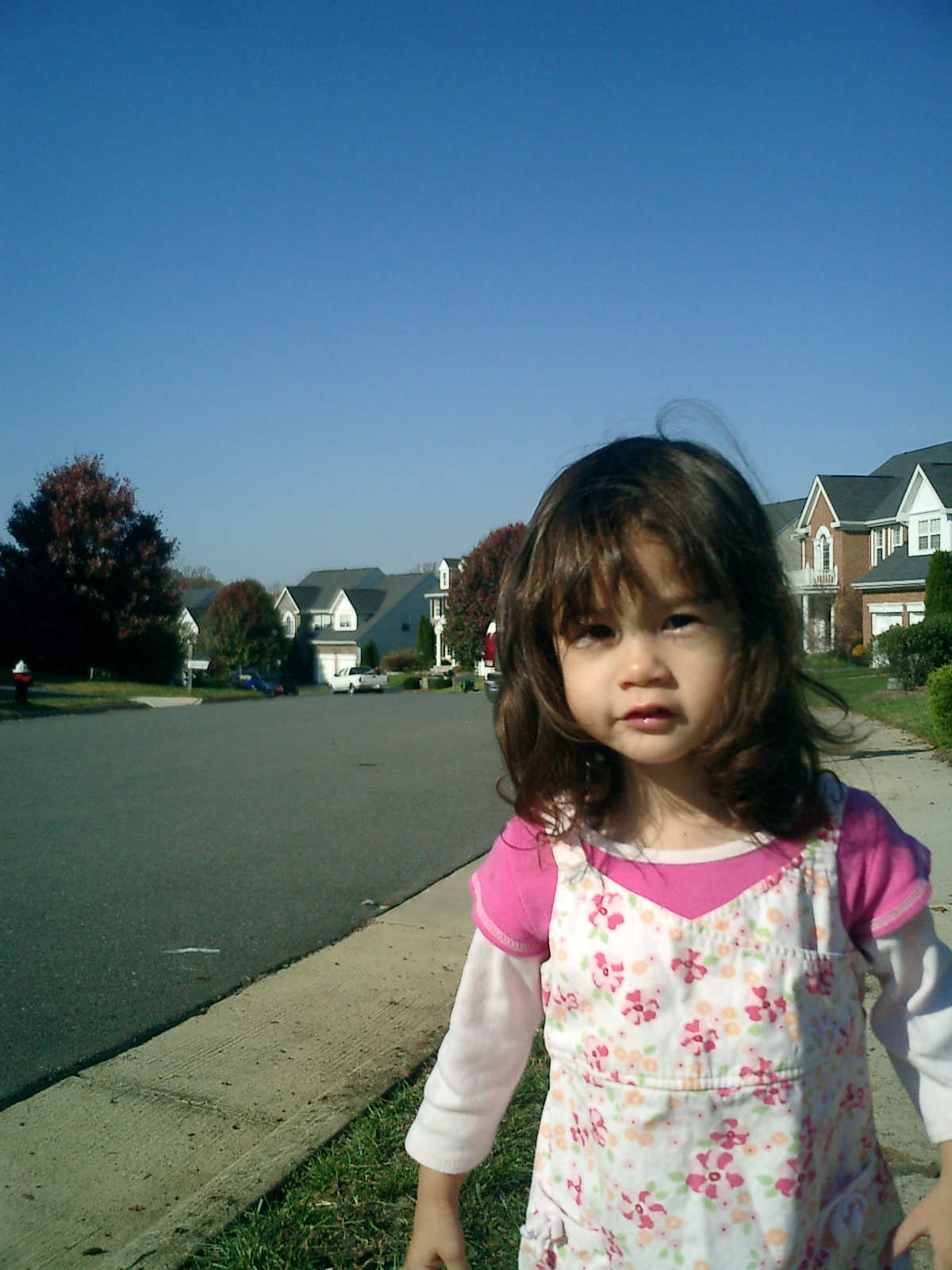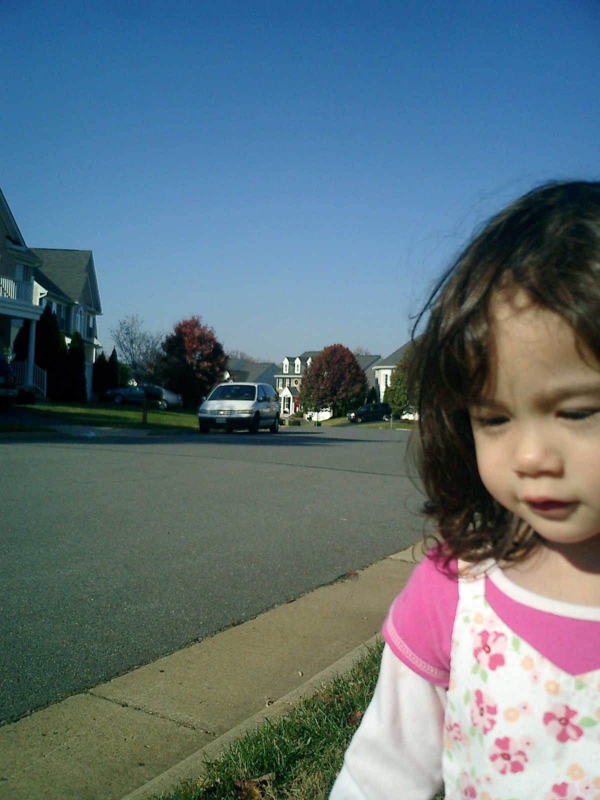 Nadine at 2 years 11 months (Nov 8, 2009), taking a short walk in the neighborhood. Nadine, is that you sucking the thumb?