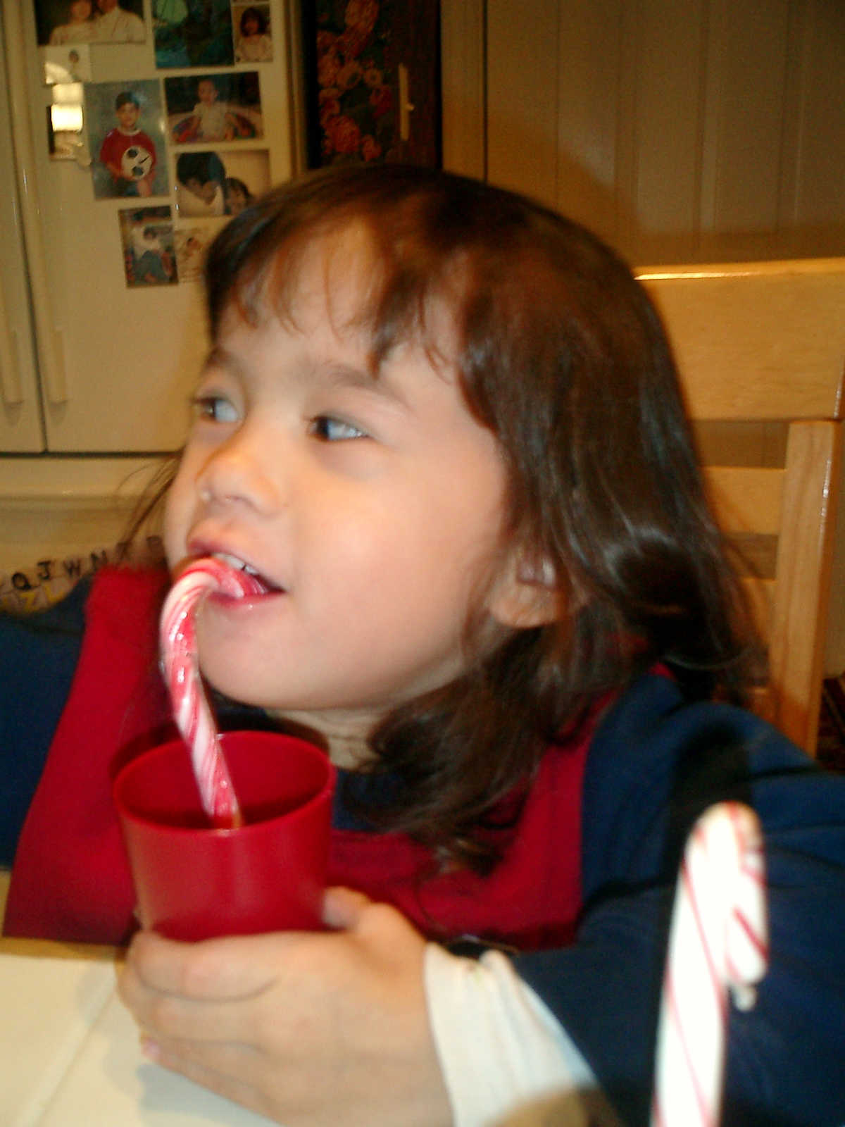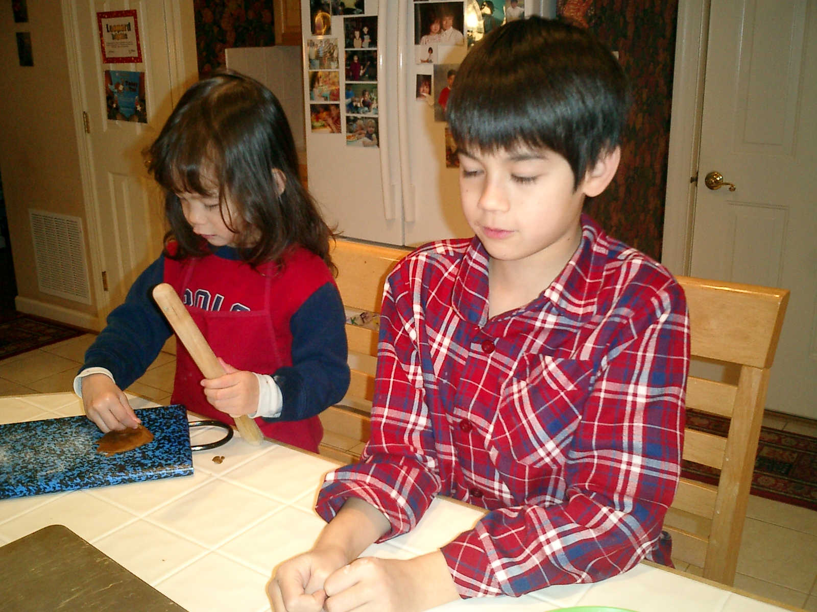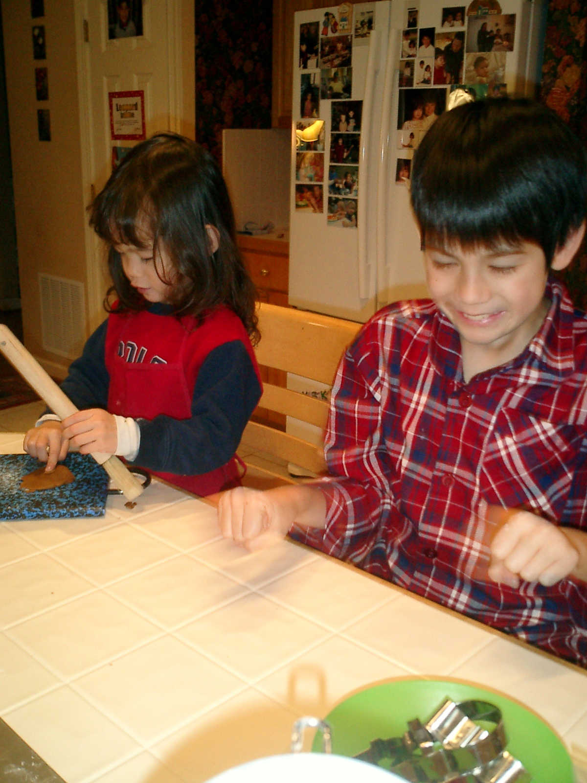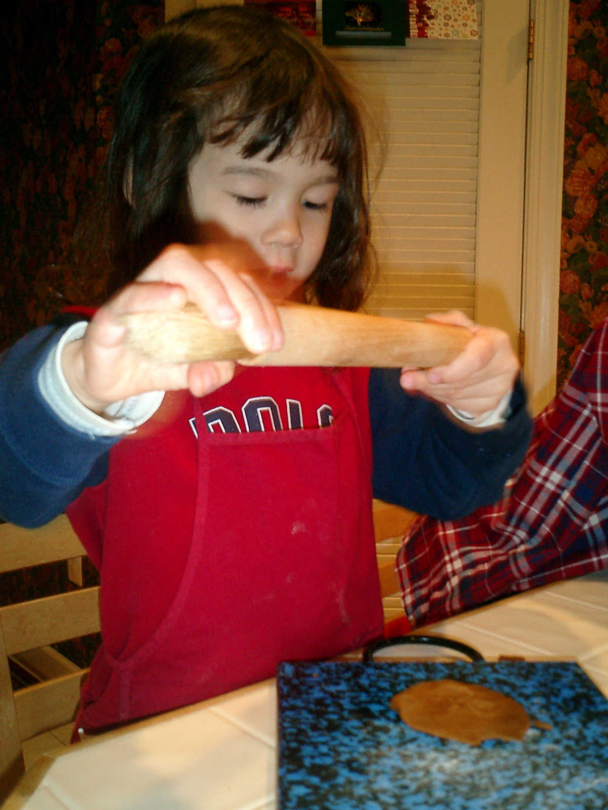 Nadine at 3 years (Dec 13, 2009), making gingerbread cookies with Mommy and Nolan. Nadine, did you roll them flat with your roller? Where did you get that candy cane?