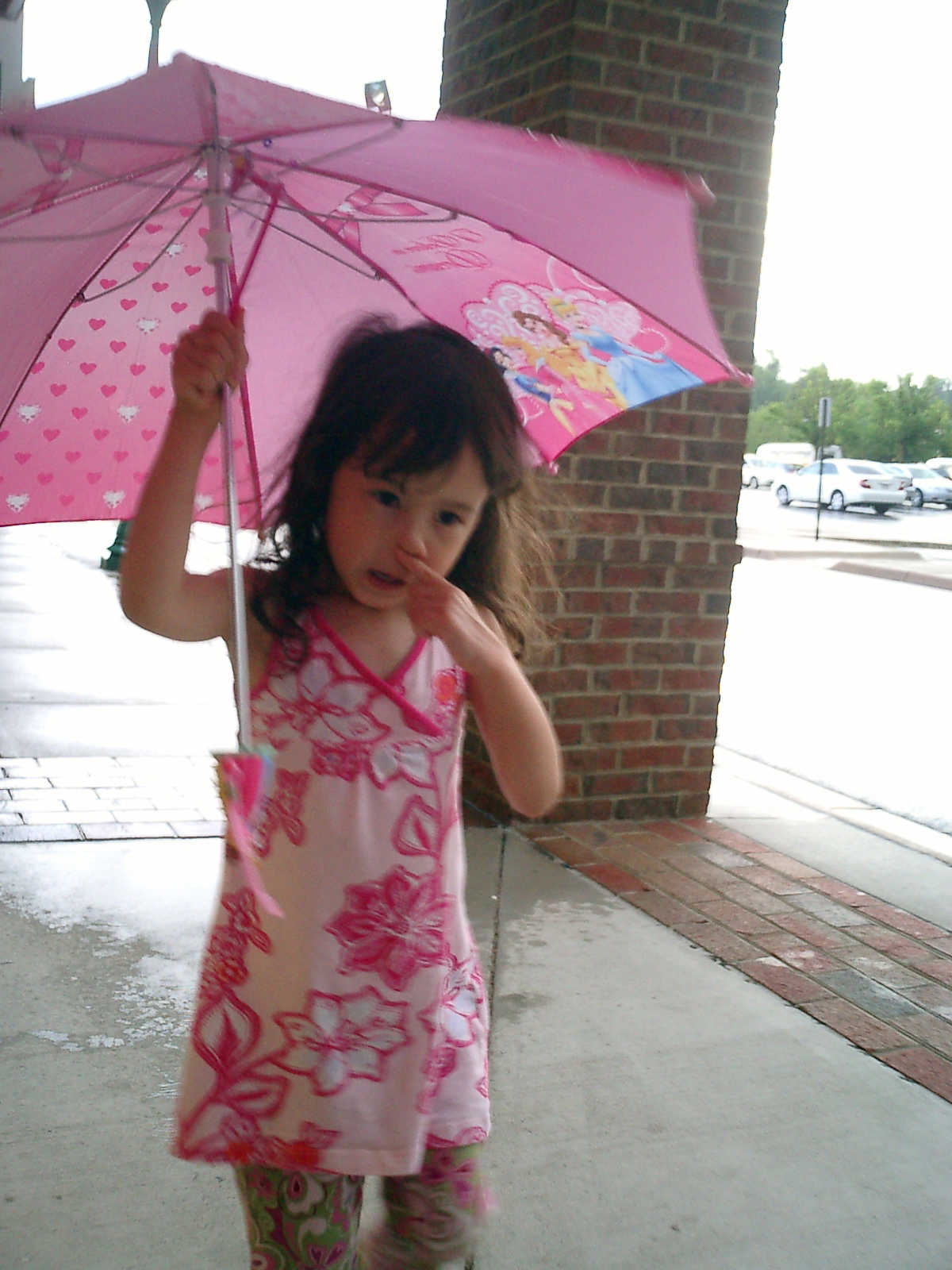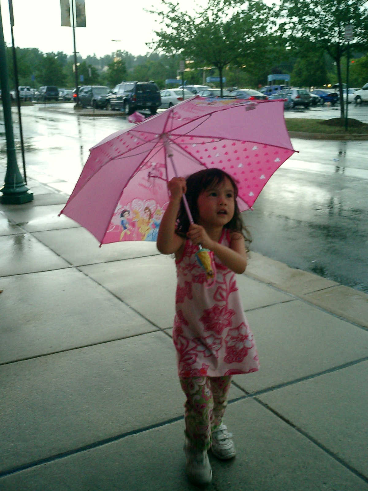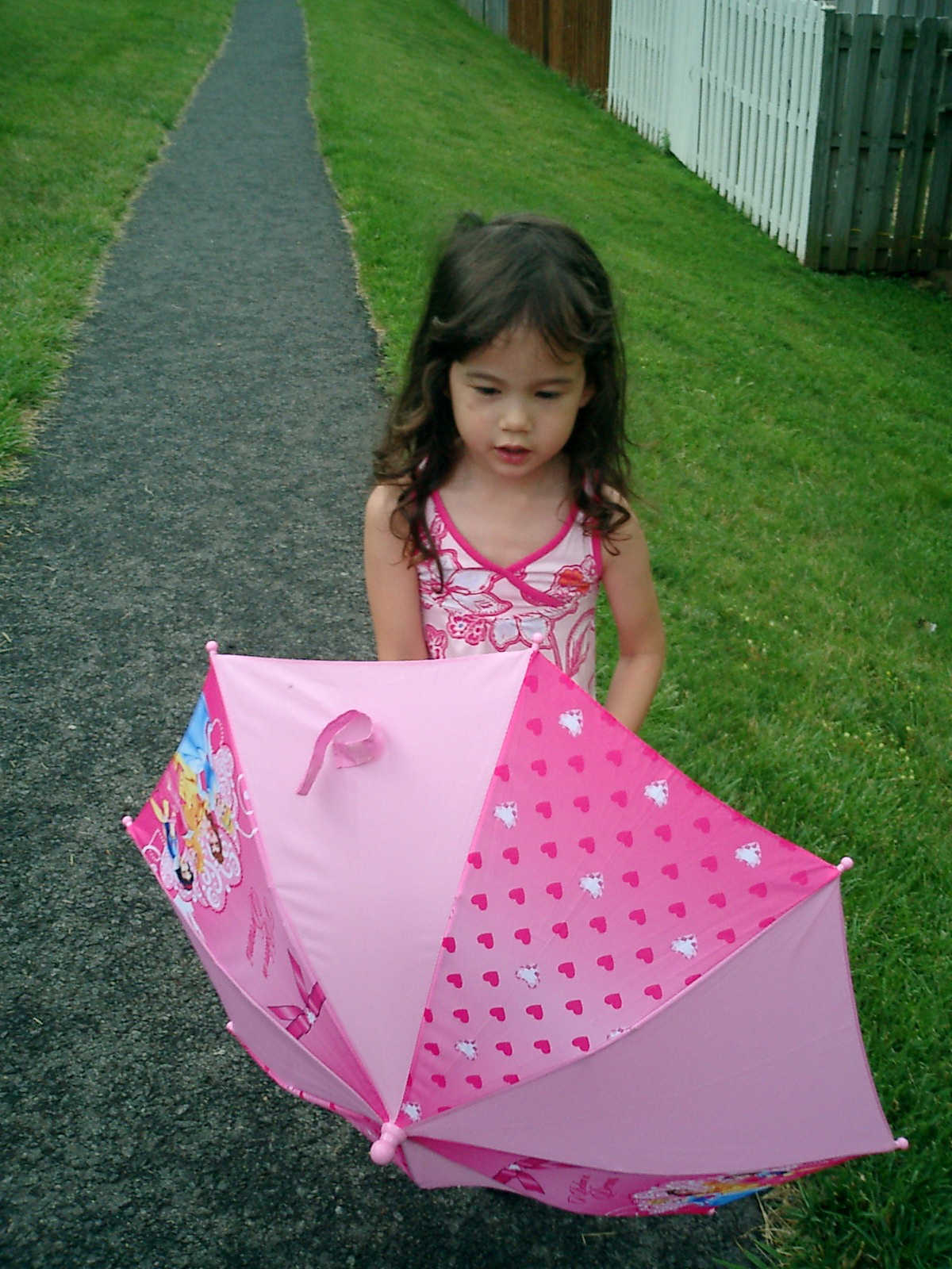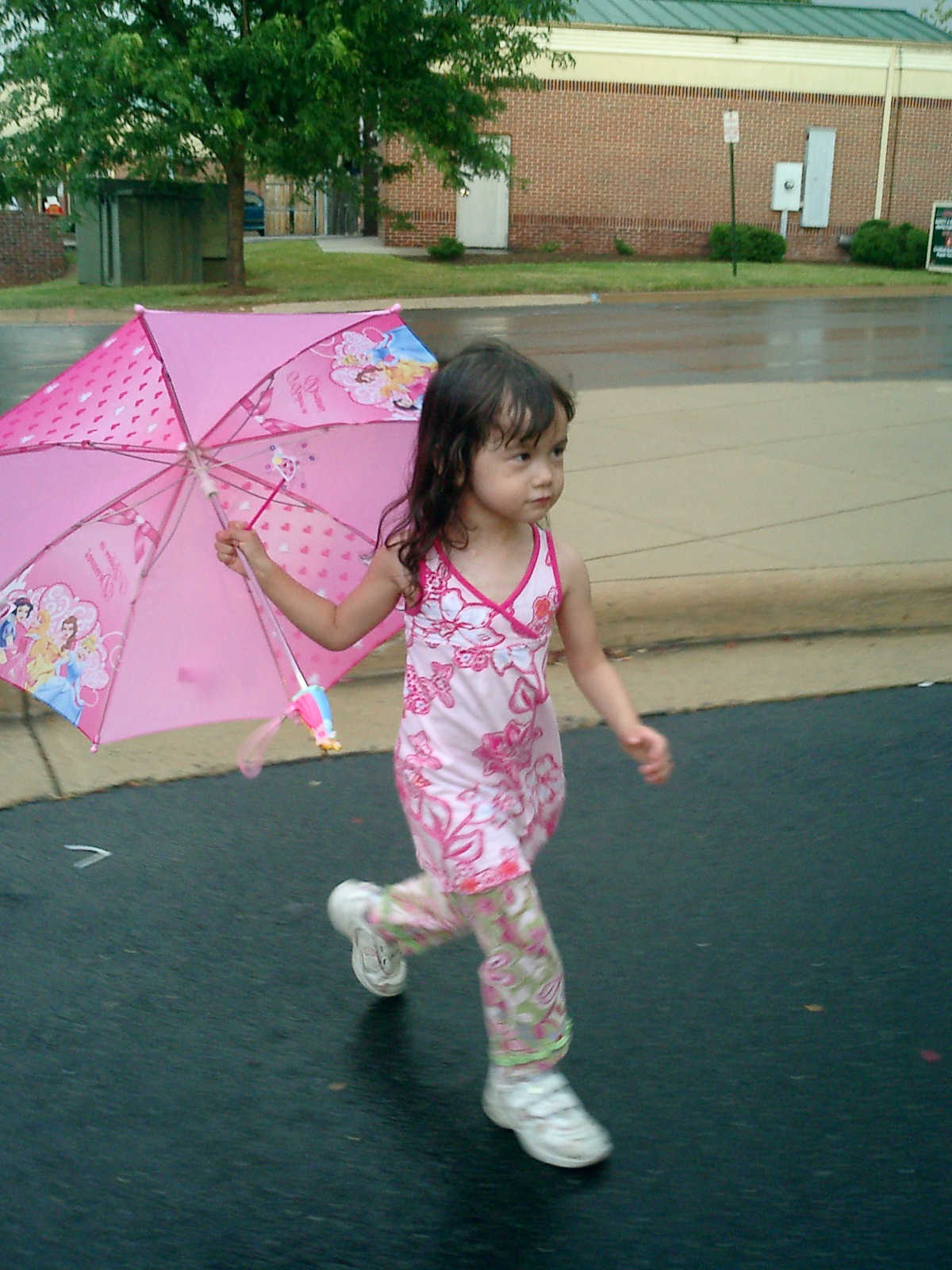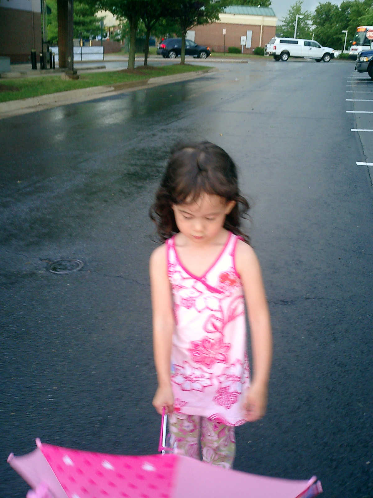 Nadine at 3 years and 6 months (June 14, 2010), walking up to Carmine's for dinner, with the rain clouds threatening. Nadine, that's a cute pink umbrella!