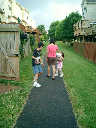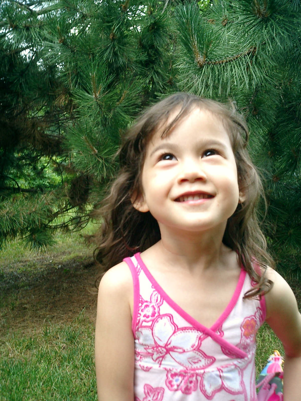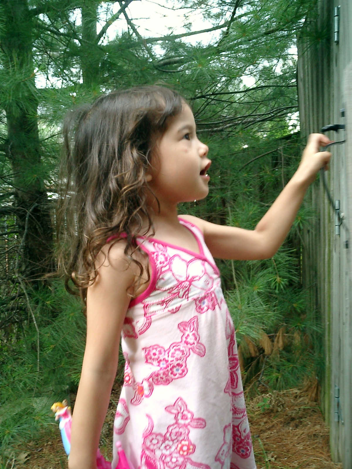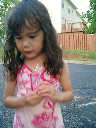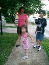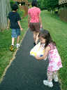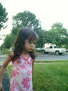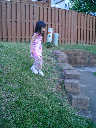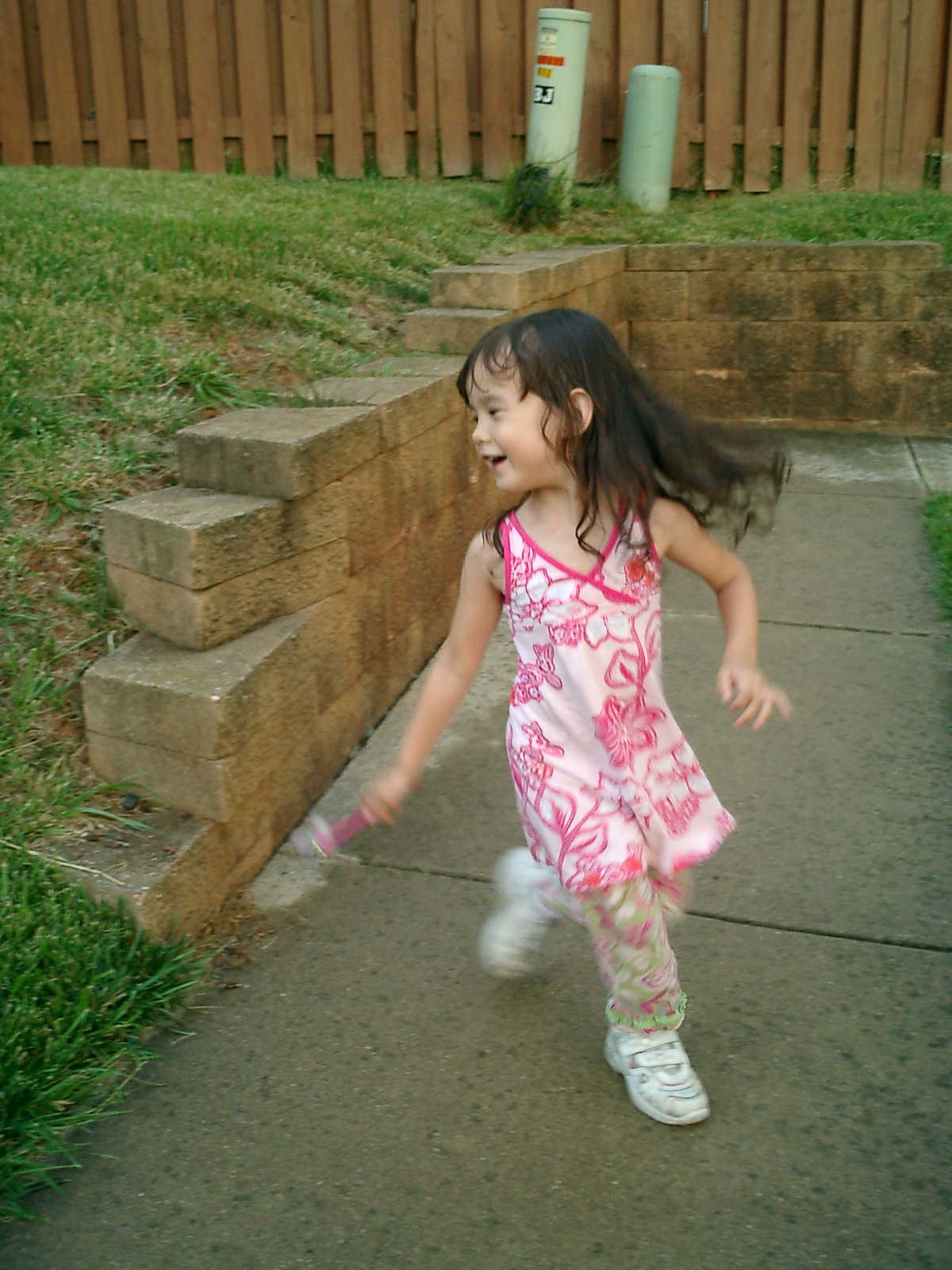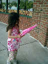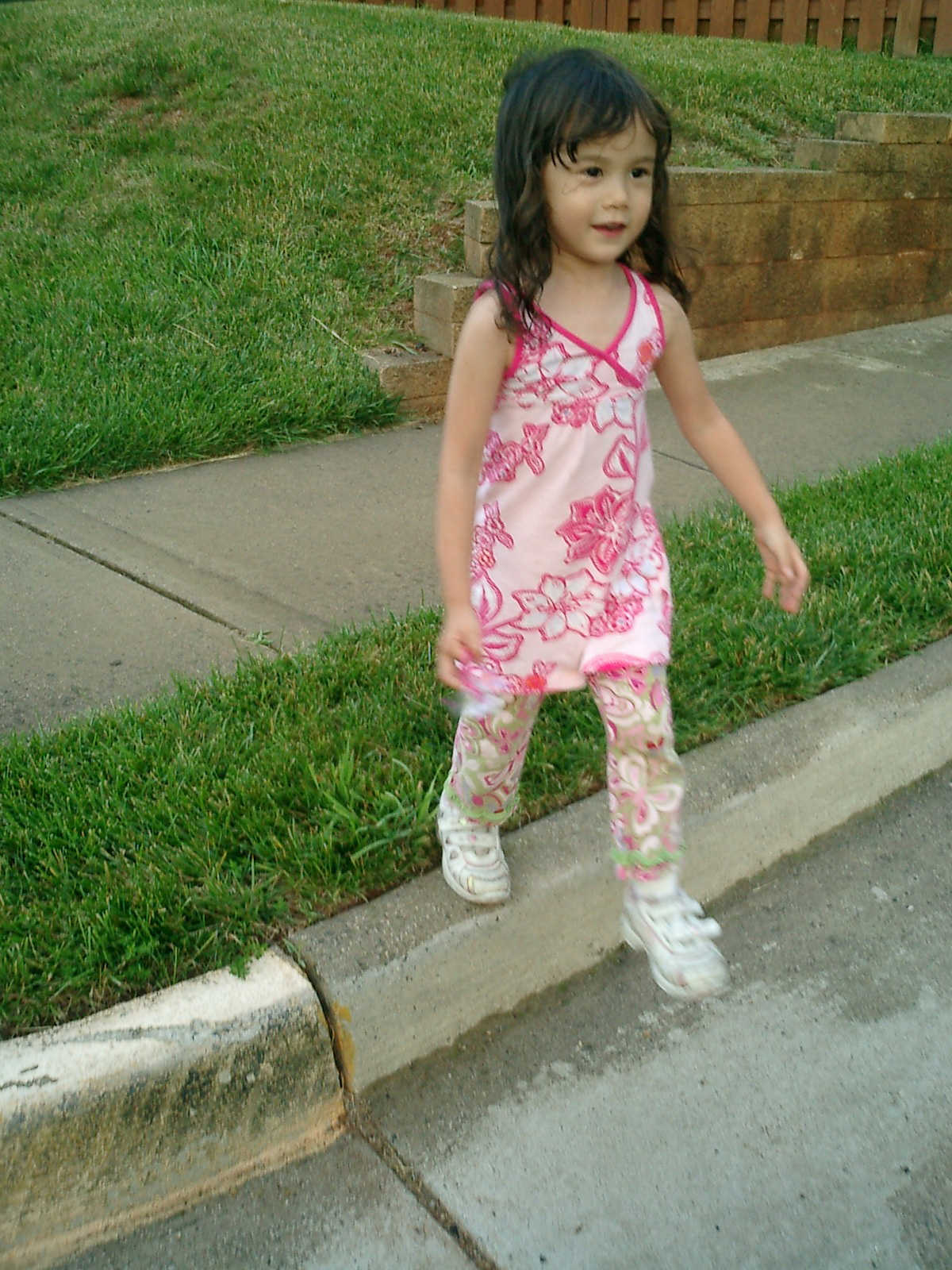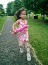 Nadine at 3 years and 6 months (June 14, 2010), walking up to Carmine's for dinner, with the rain clouds threatening. Nadine, that's a cute pink umbrella!