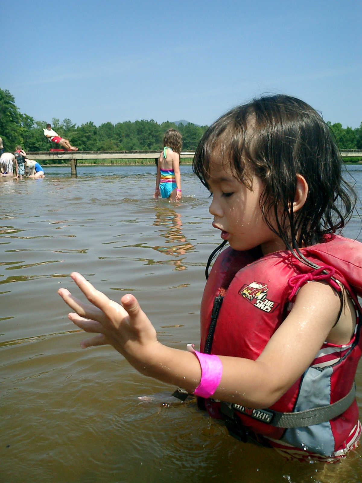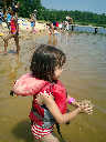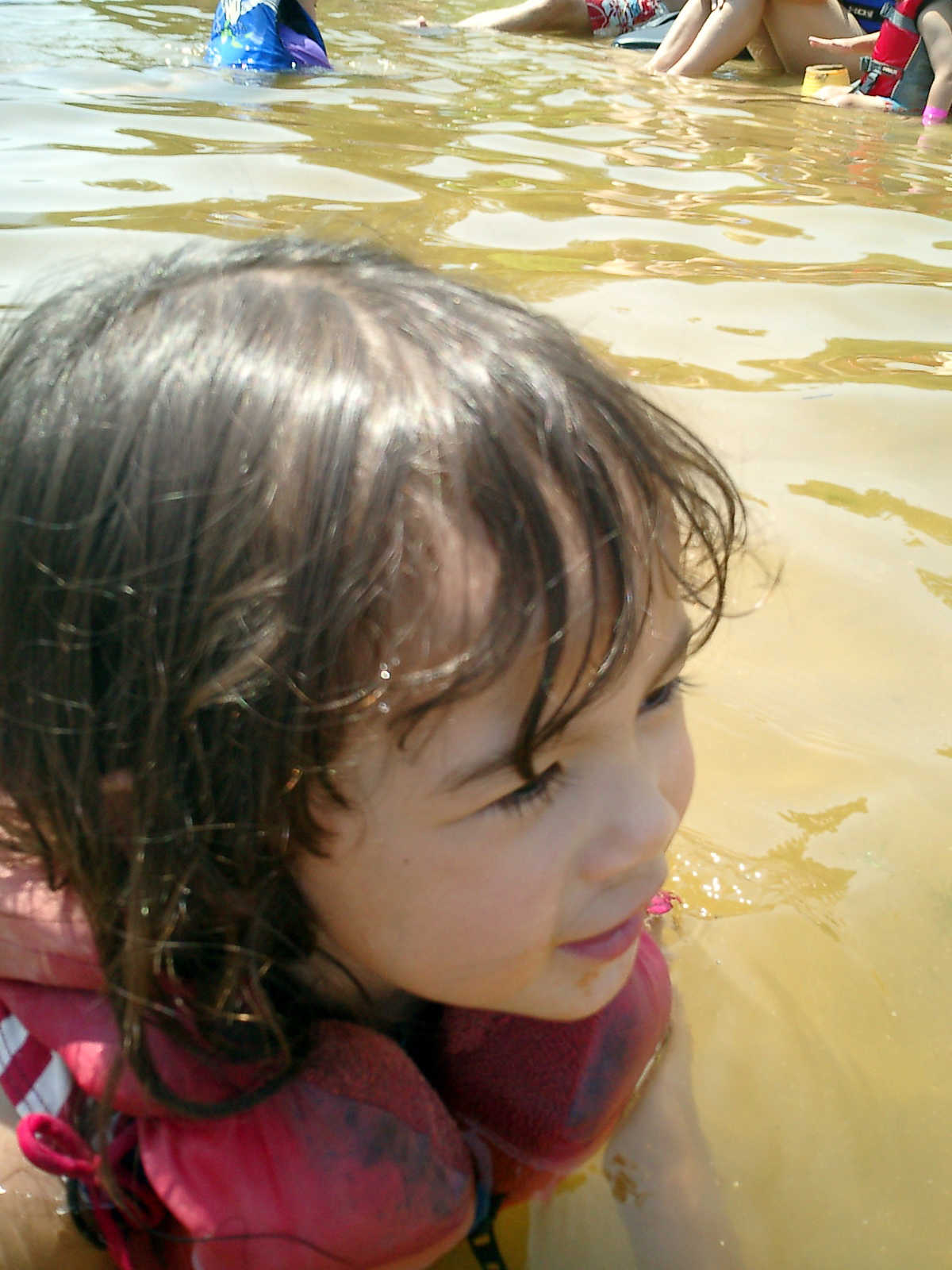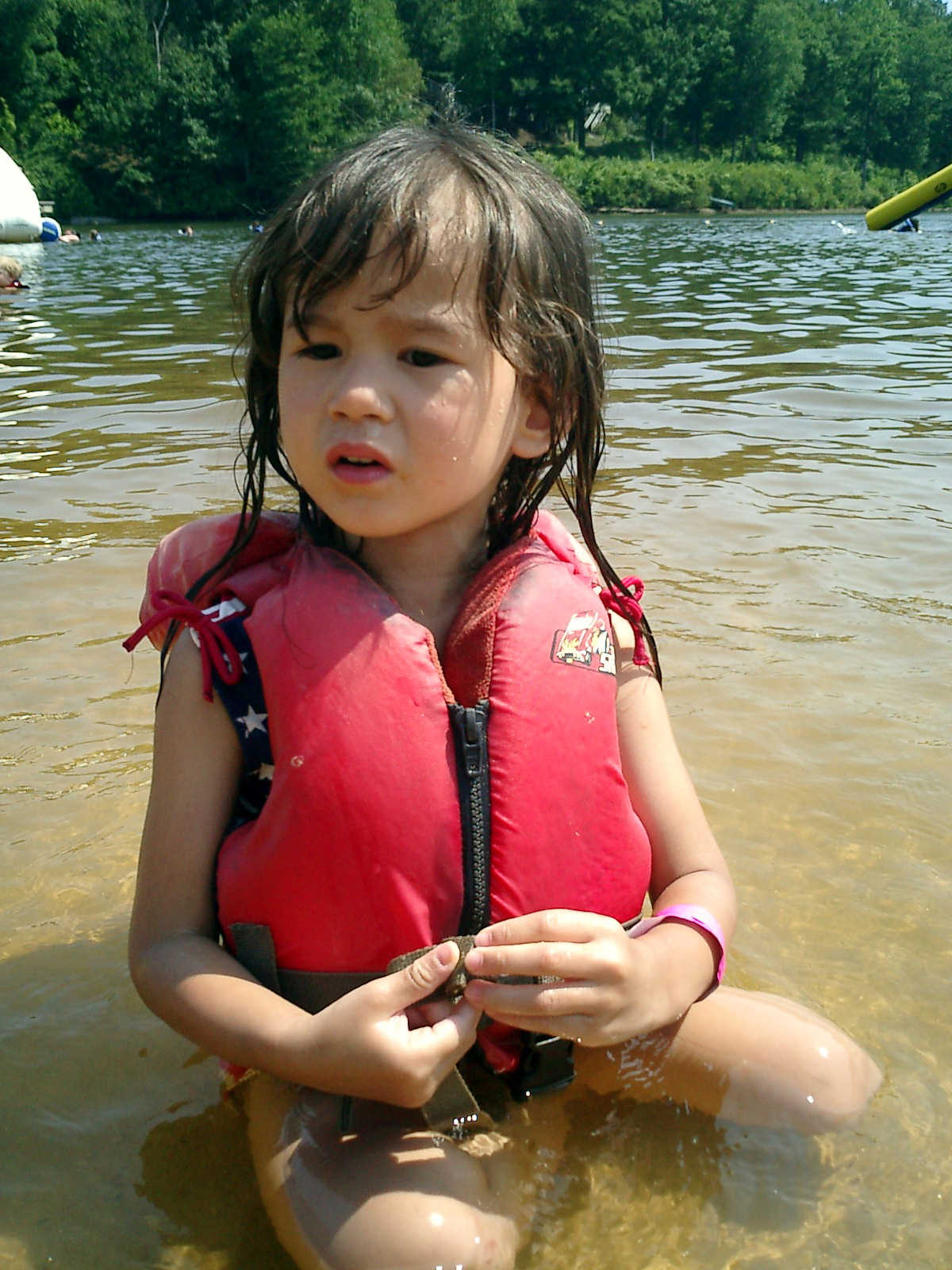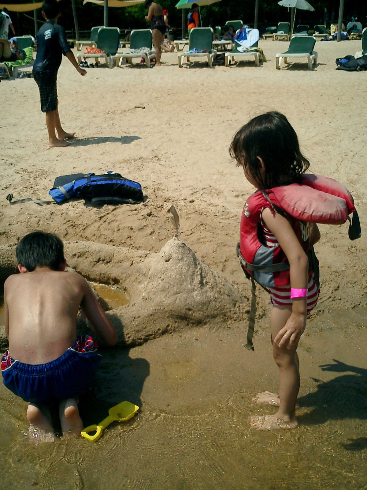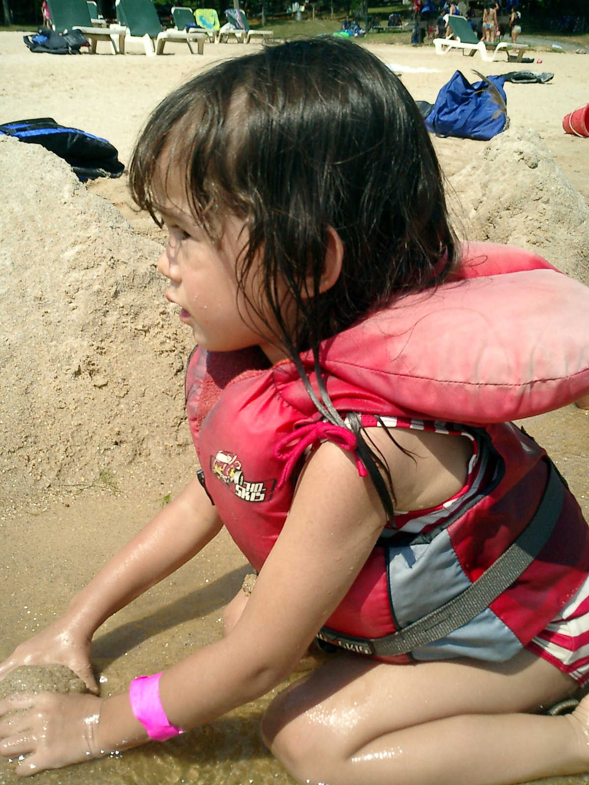 Nadine at 3 years and 8 months (July 5, 2010), at the iWintergreen lake, enjoying the water and helping build Nolan's sand castle!