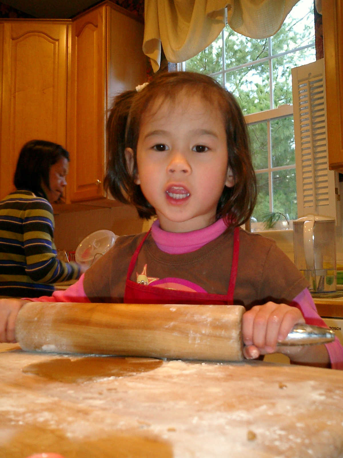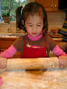 Nadine at 4 years (Dec 5, 2010), helping Mommy make Christmas cookies, for Nolan's postponed Birthday Party, later in the day. You can really roll that dough!
