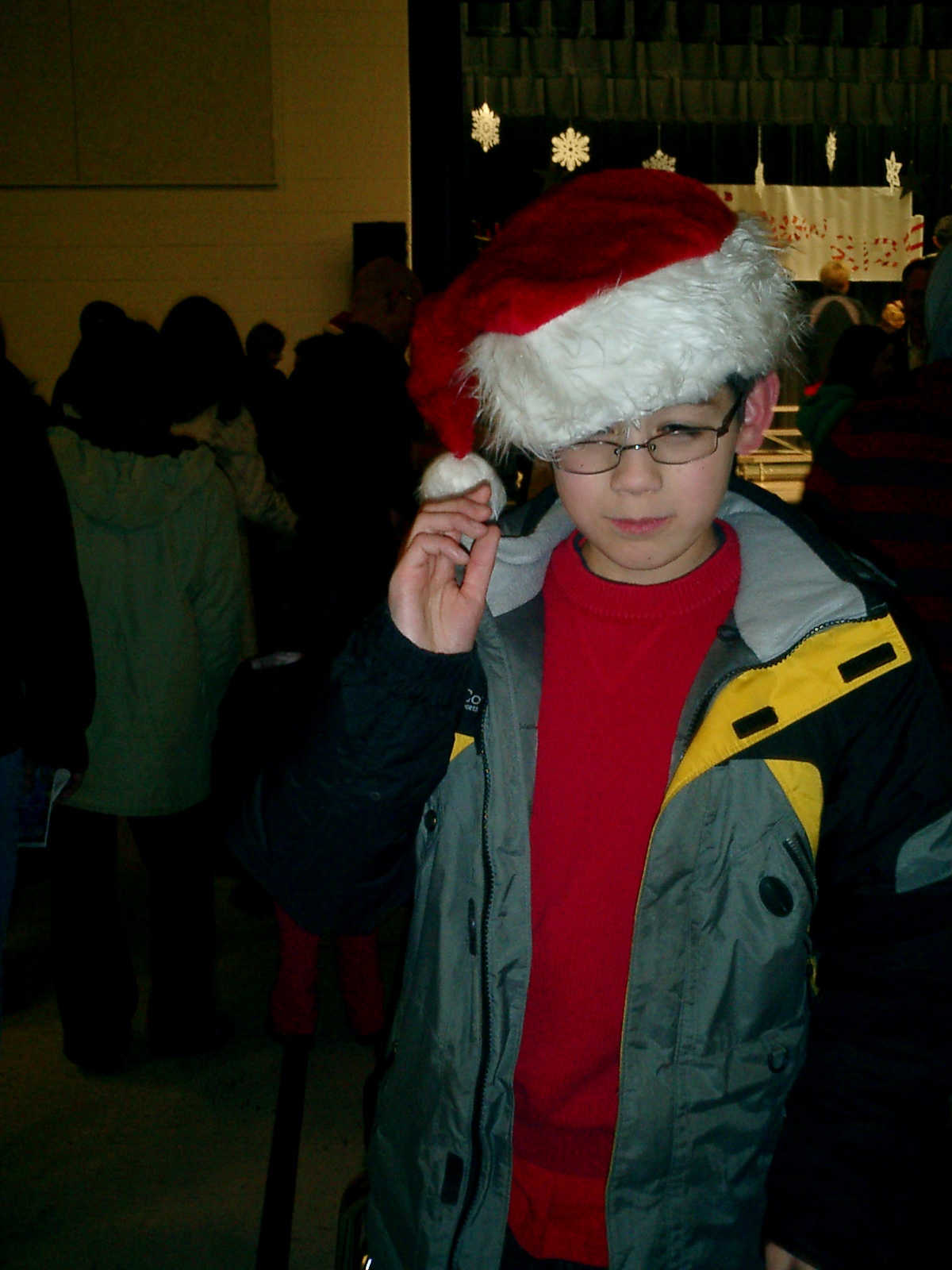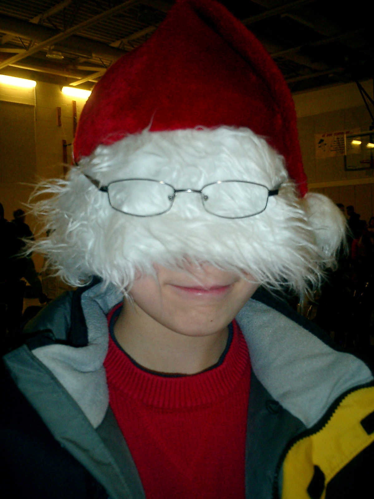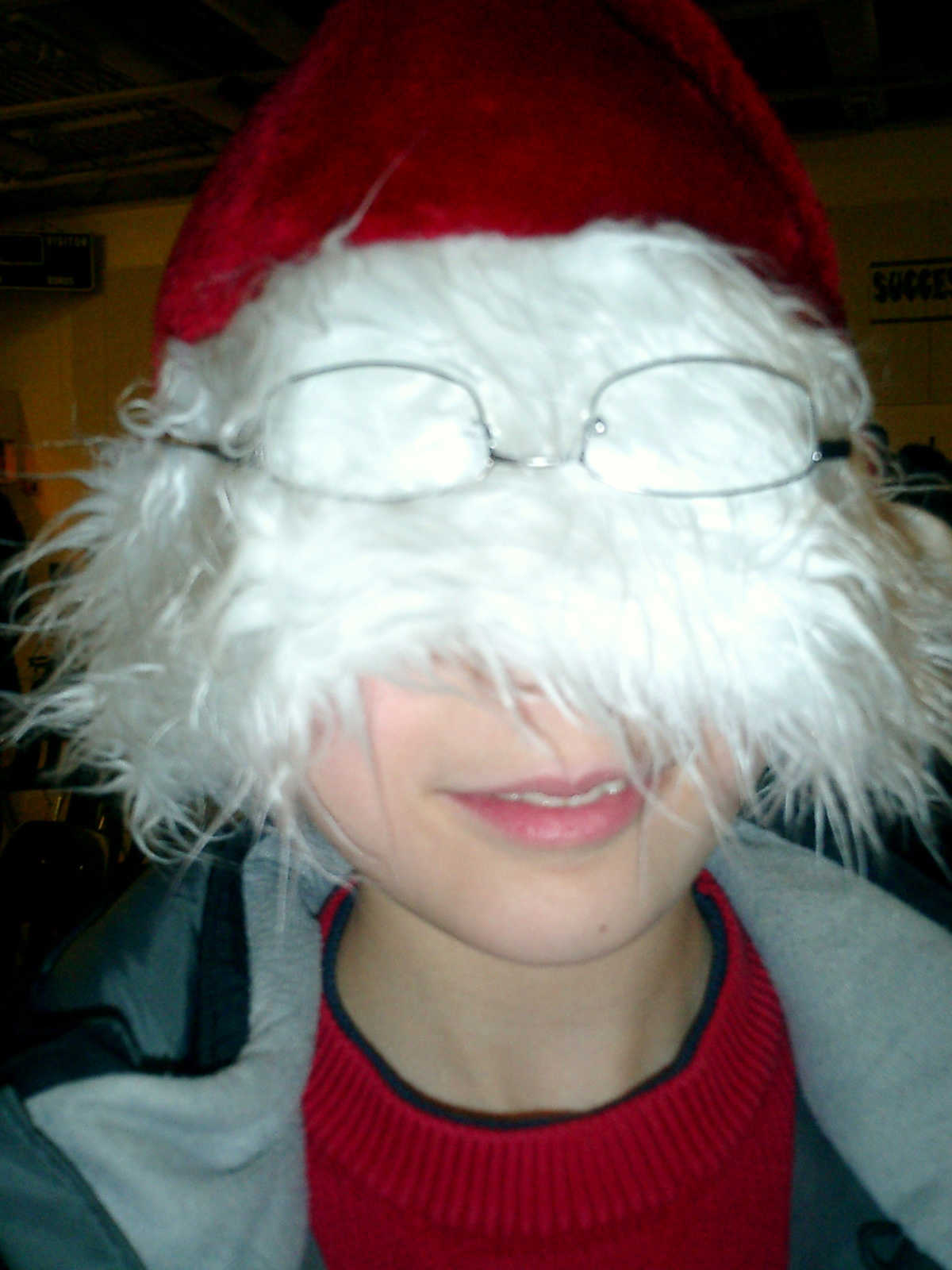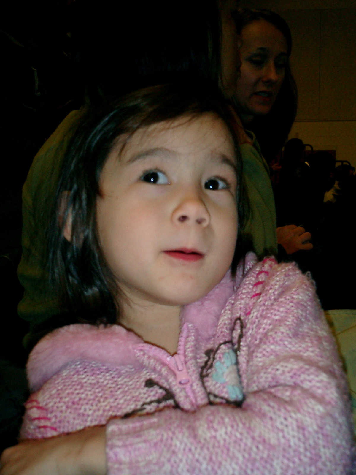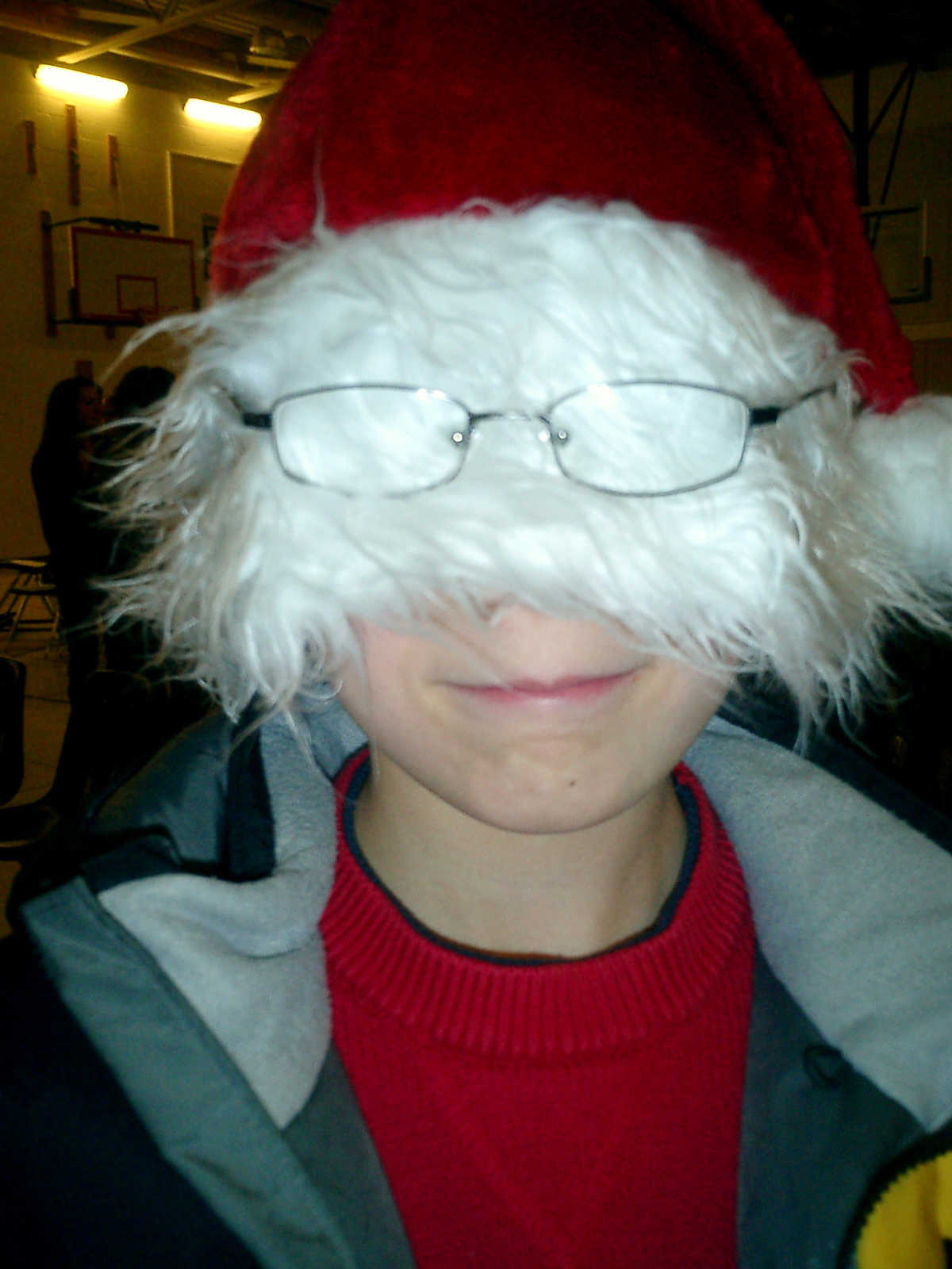 Nadine at 4 years and 1 month (Dec 21, 2010), clowning around at Nolan's school Winter Holiday play. Is that Nolan with the silly hat?