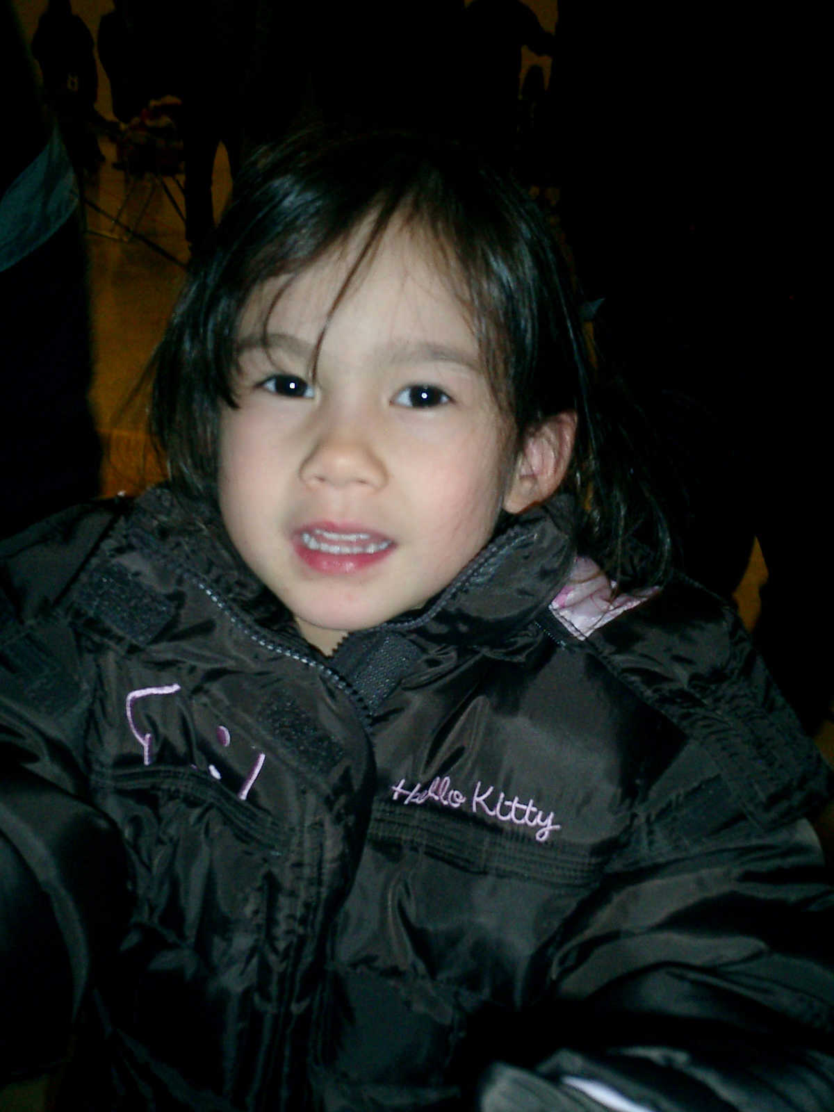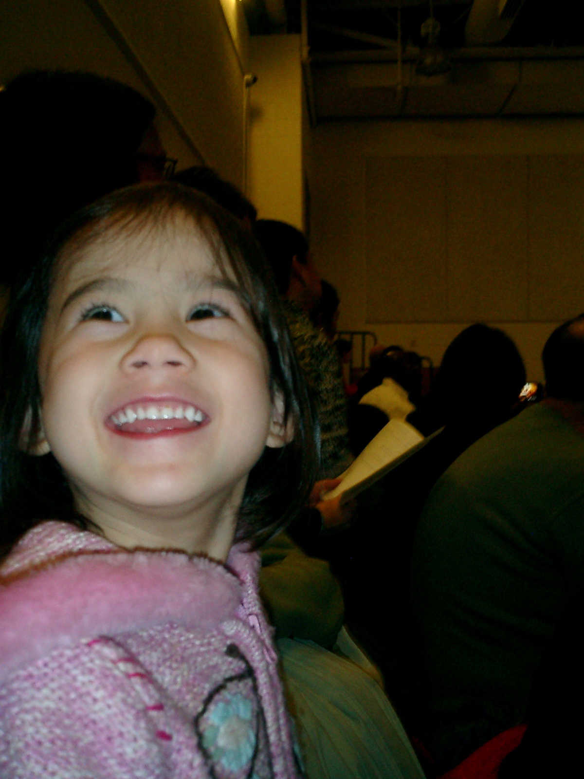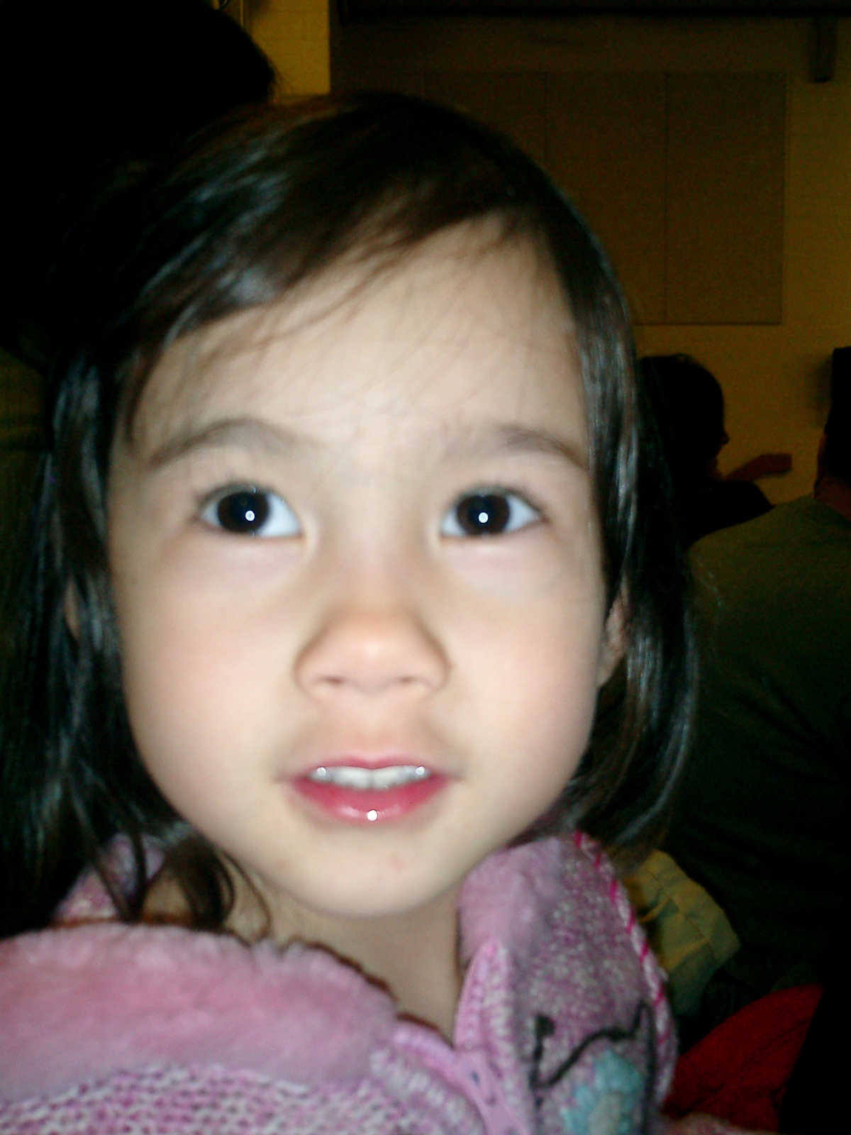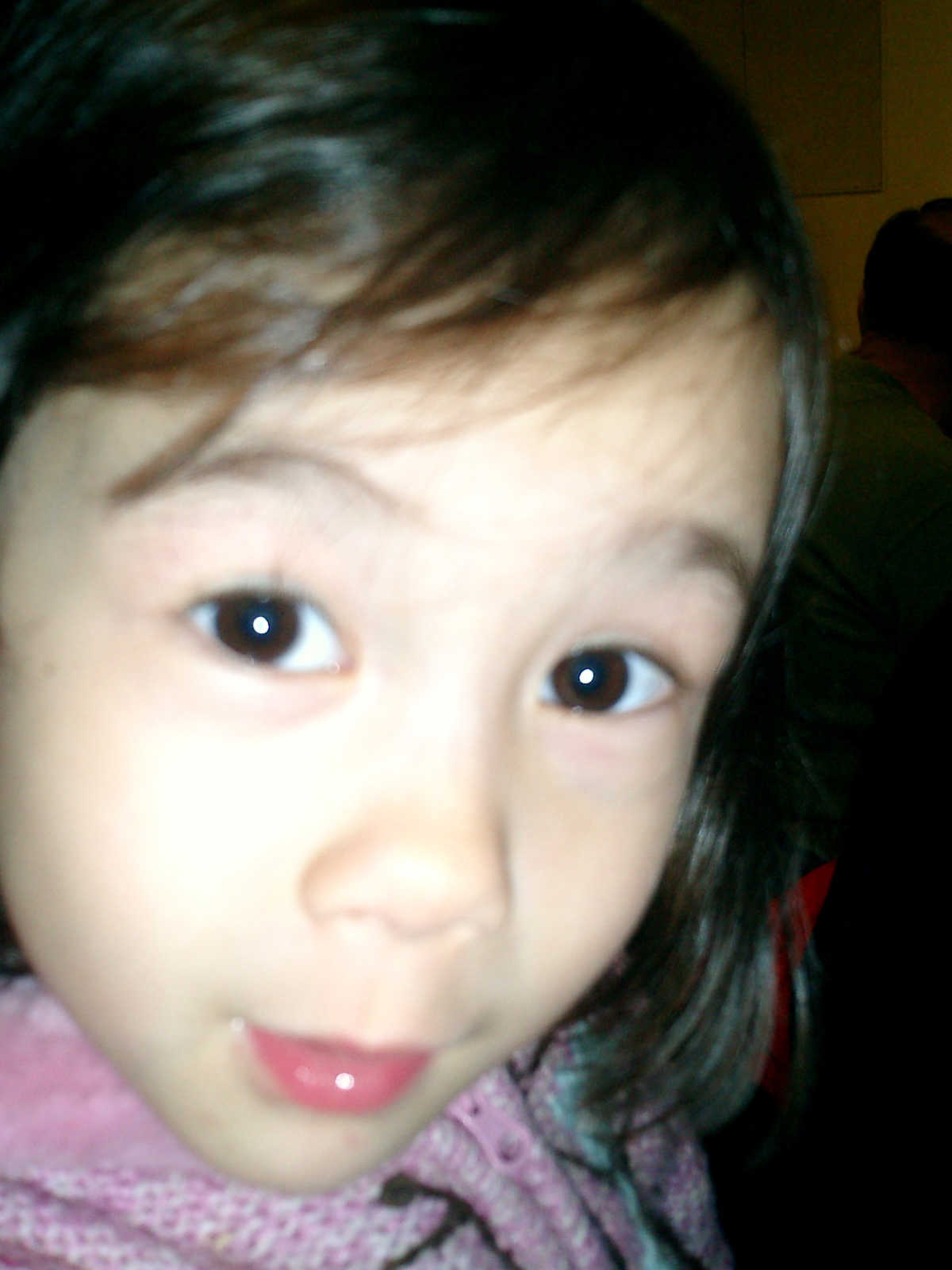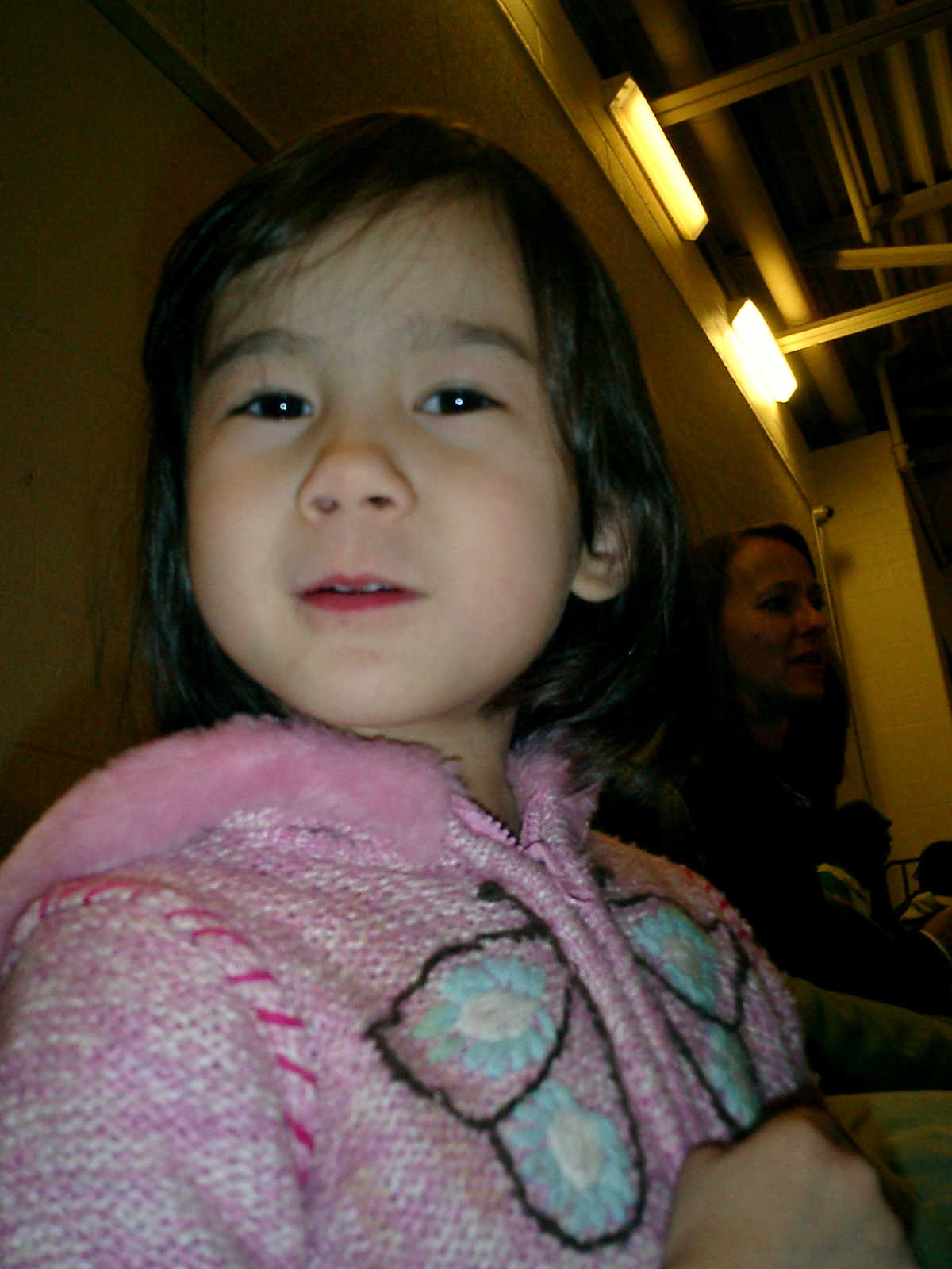 Nadine at 4 years and 1 month (Dec 21, 2010), clowning around at Nolan's school Winter Holiday play. Is that Nolan with the silly hat?