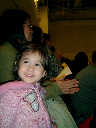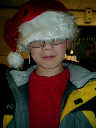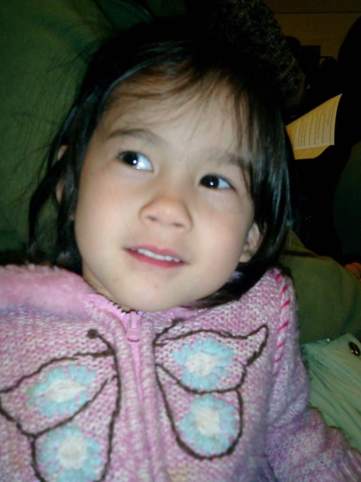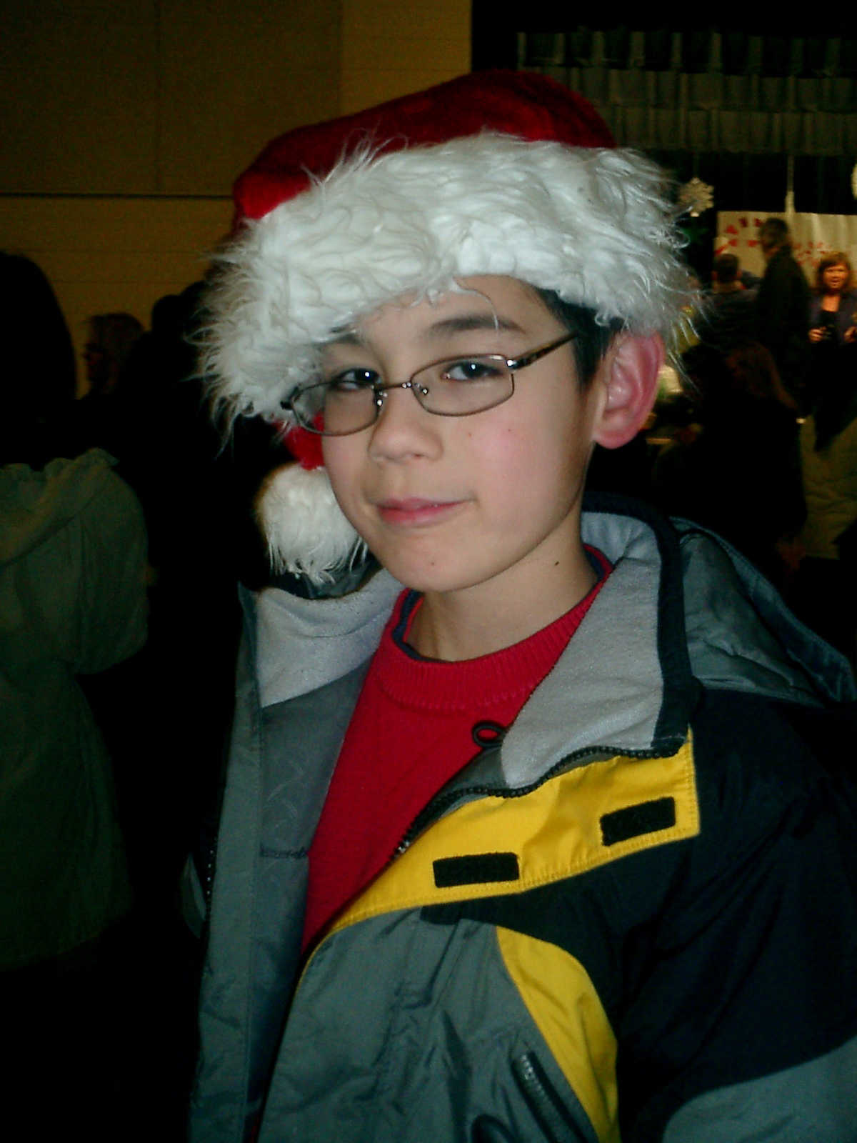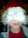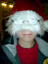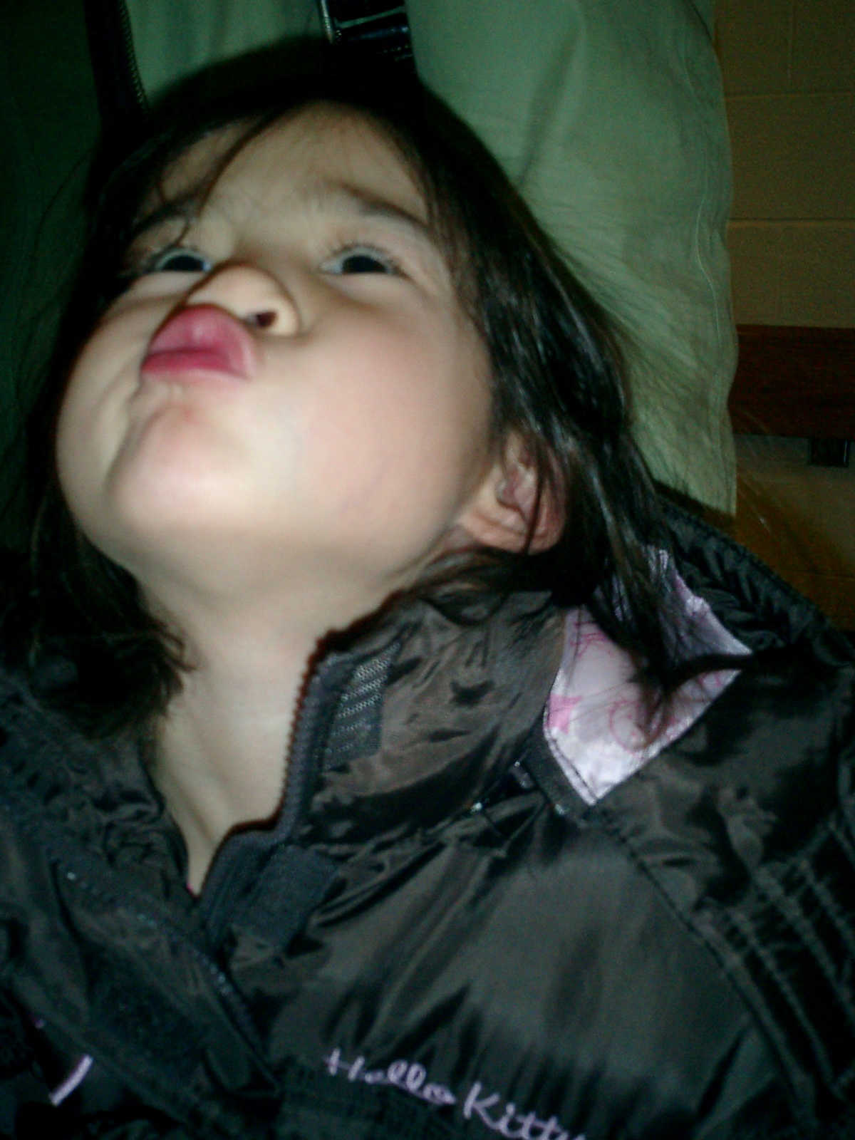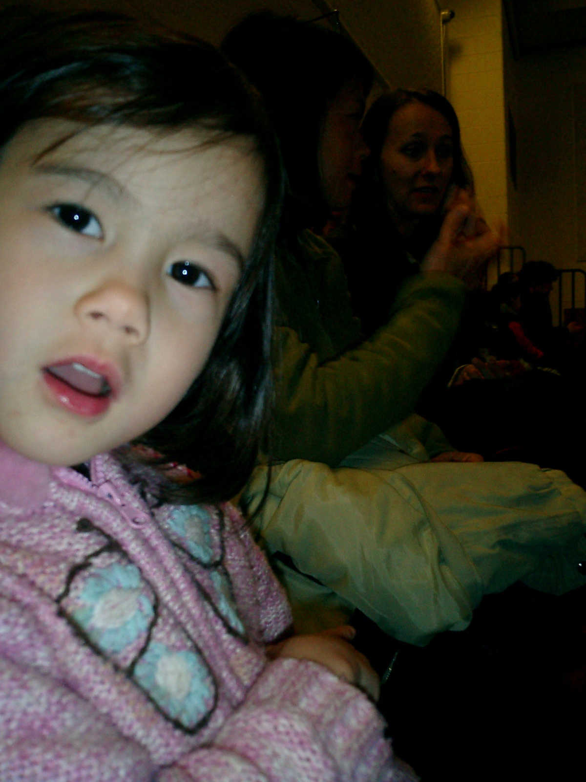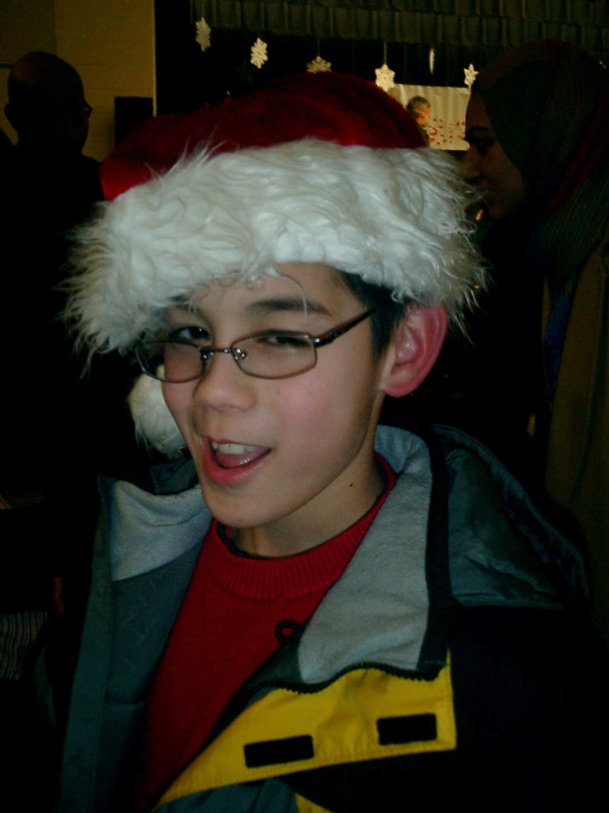 Nadine at 4 years and 1 month (Dec 21, 2010), clowning around at Nolan's school Winter Holiday play. Is that Nolan with the silly hat?