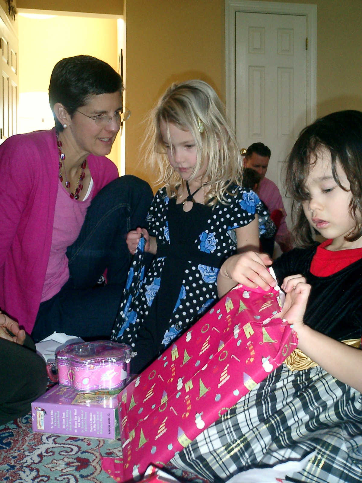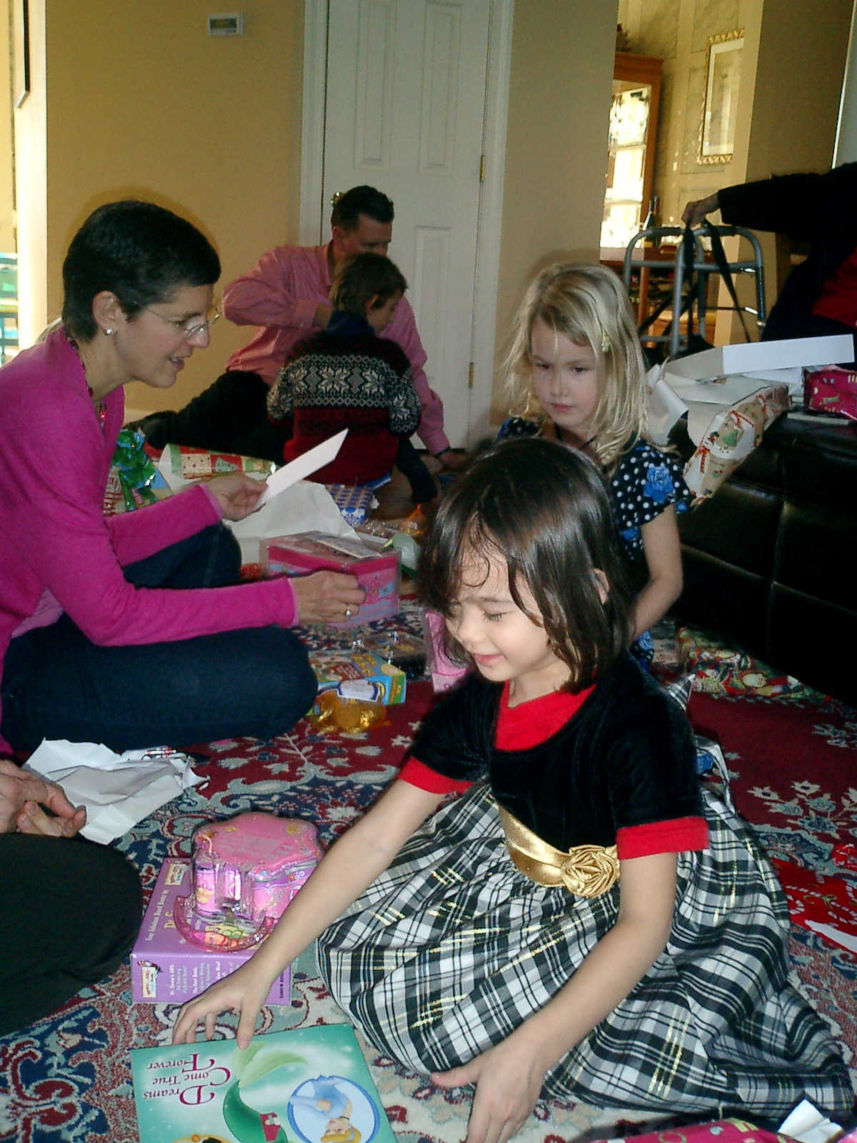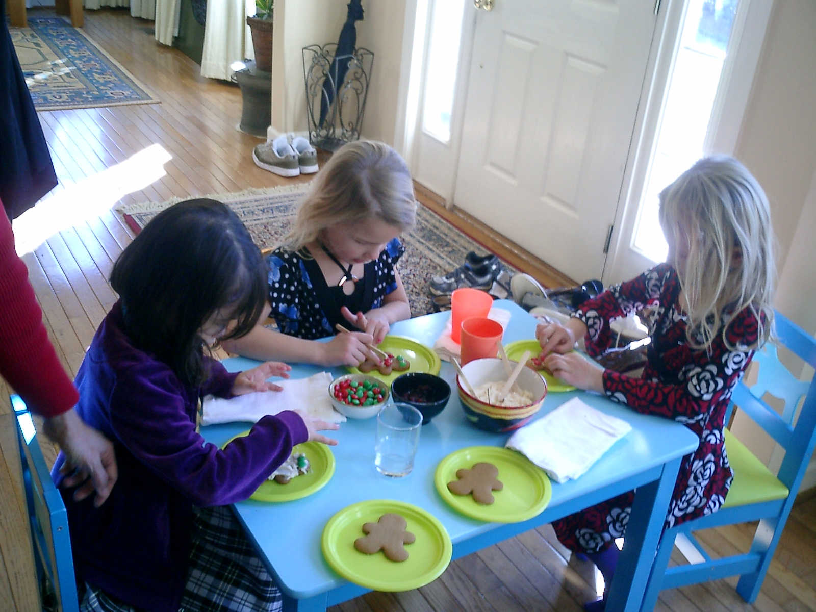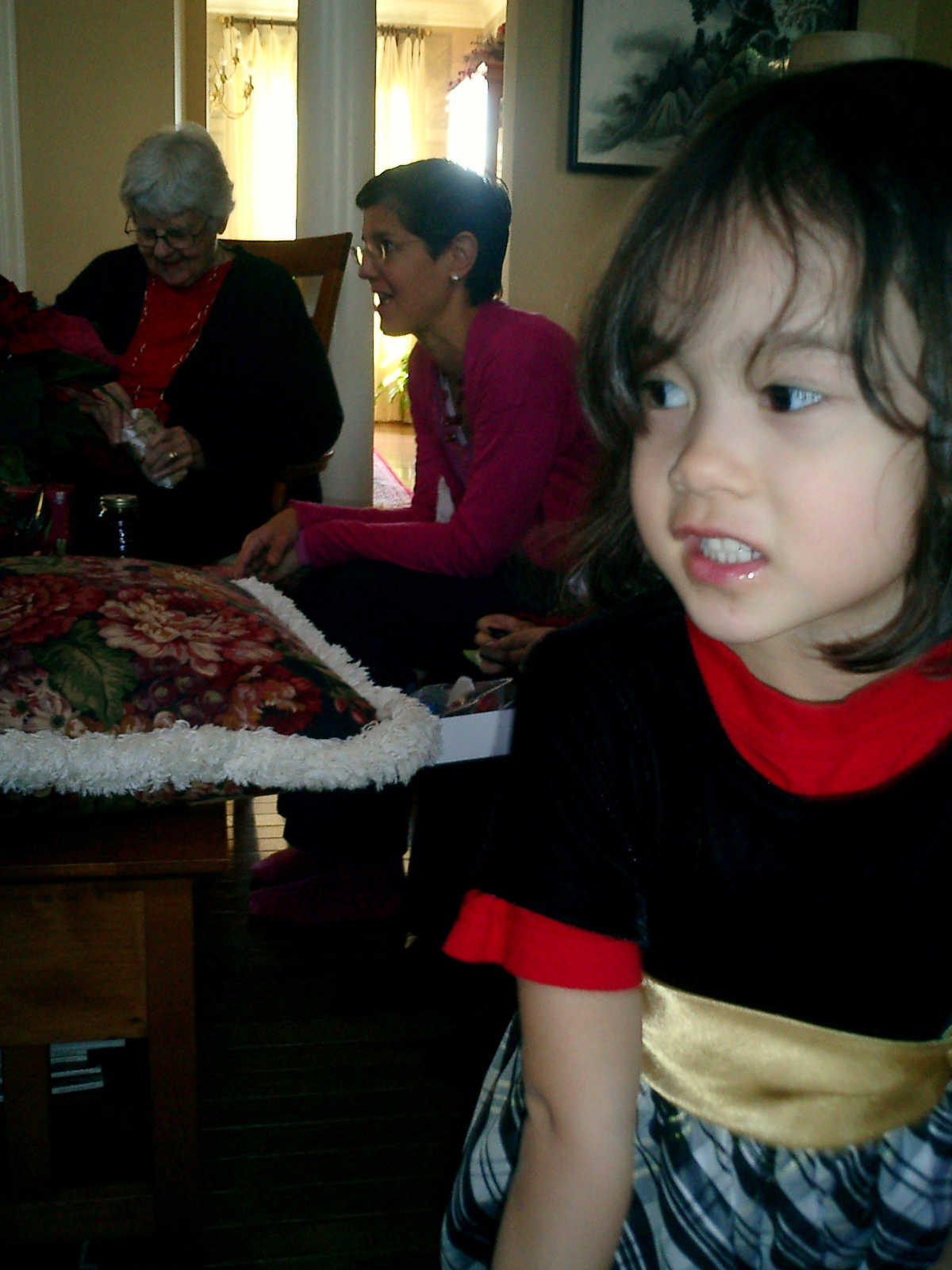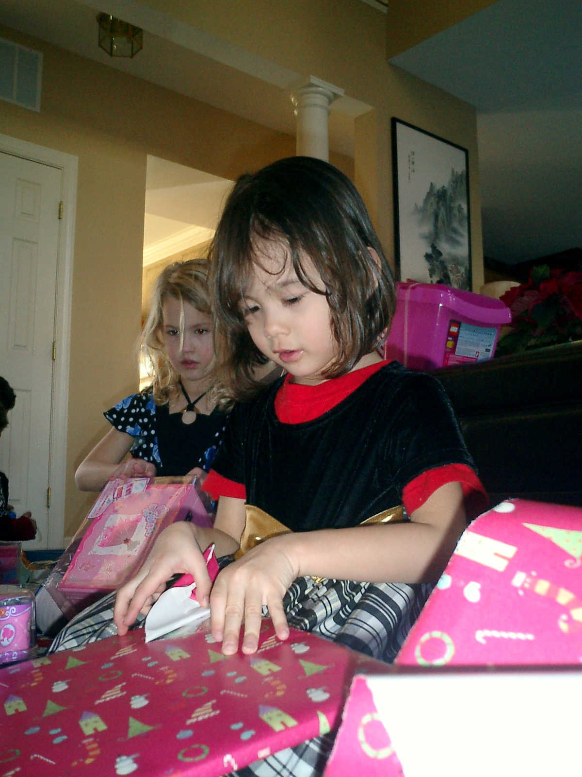 Nadine at 4 years and 1 month (Dec 24, 2010), celebrating Christmas with her cousins Katie, Charlotte, and Kaz. Wow, you got to make gingerbread men, and then got a lot of presents from everyone!