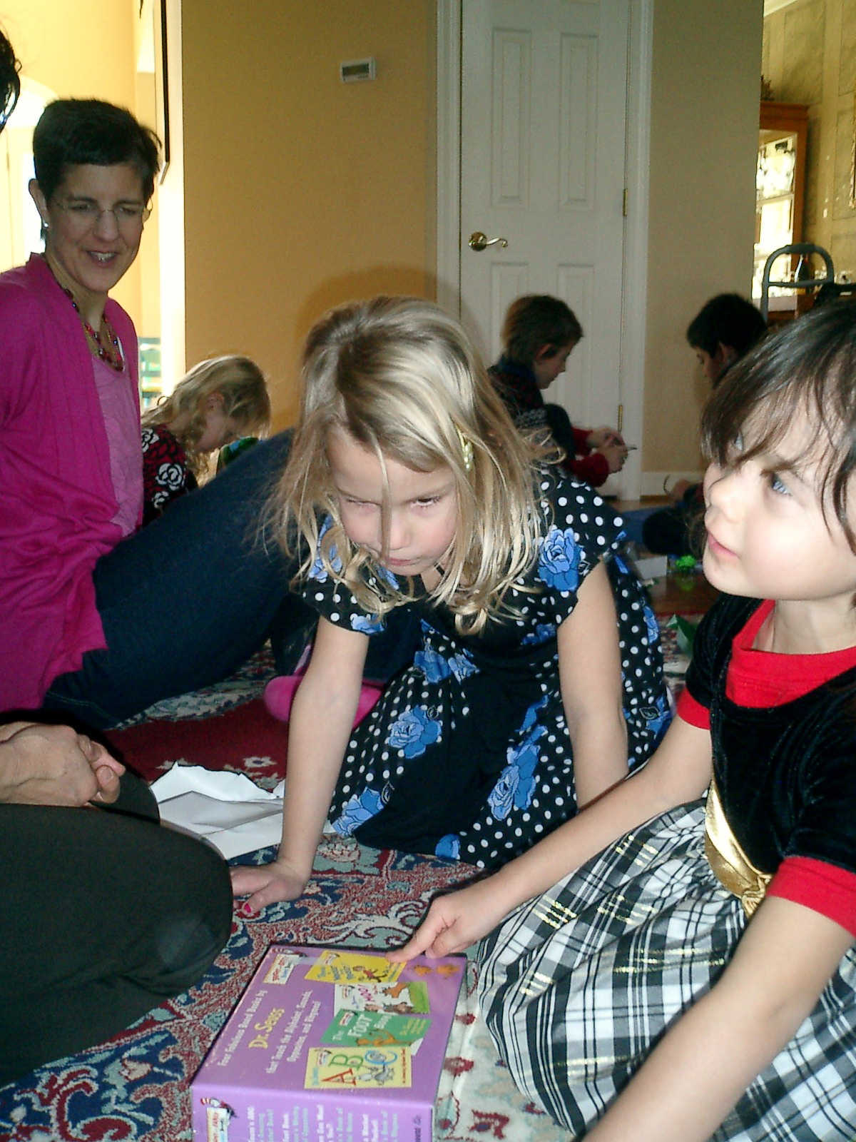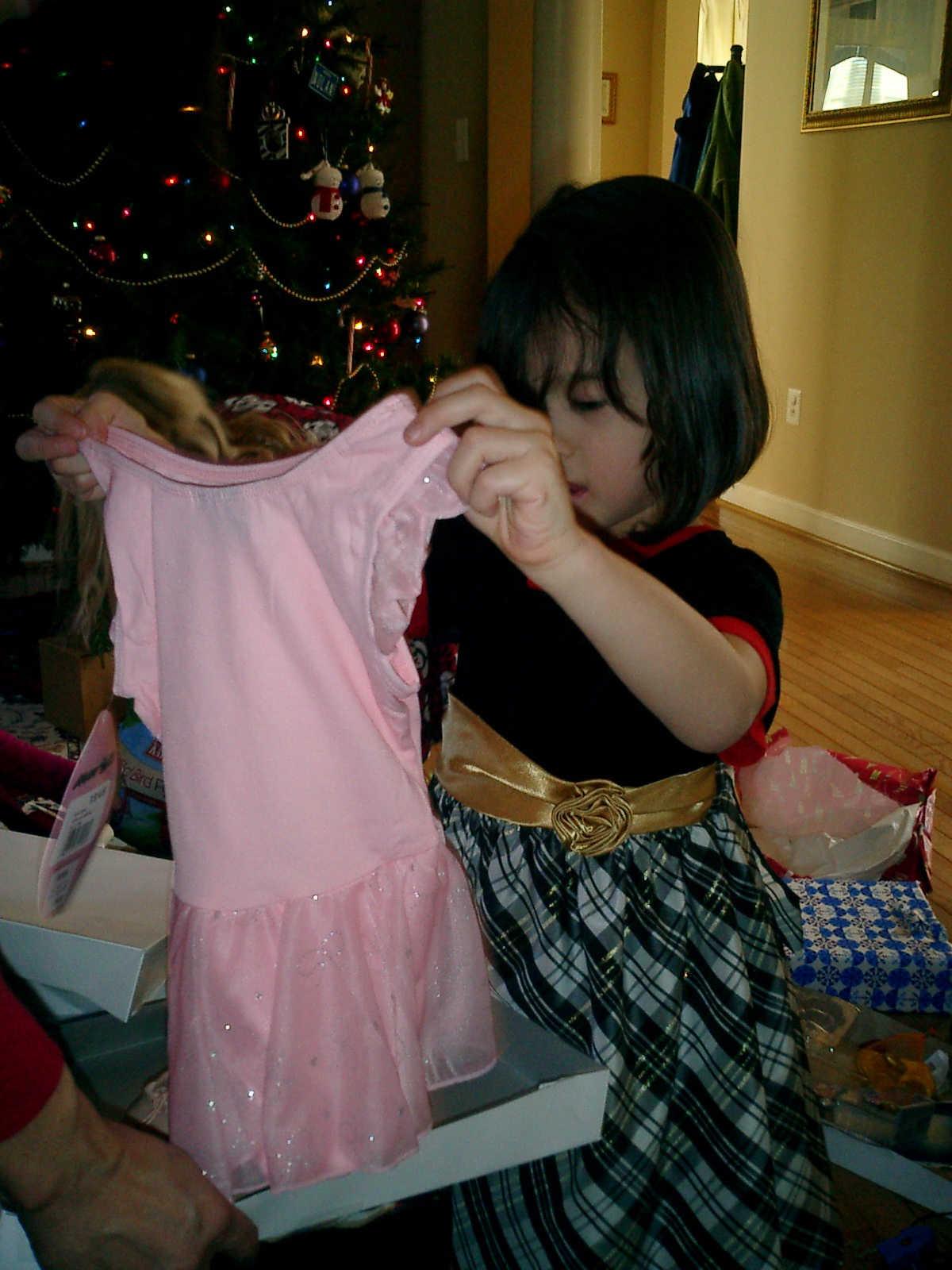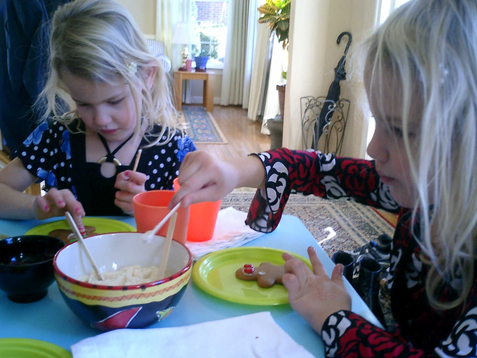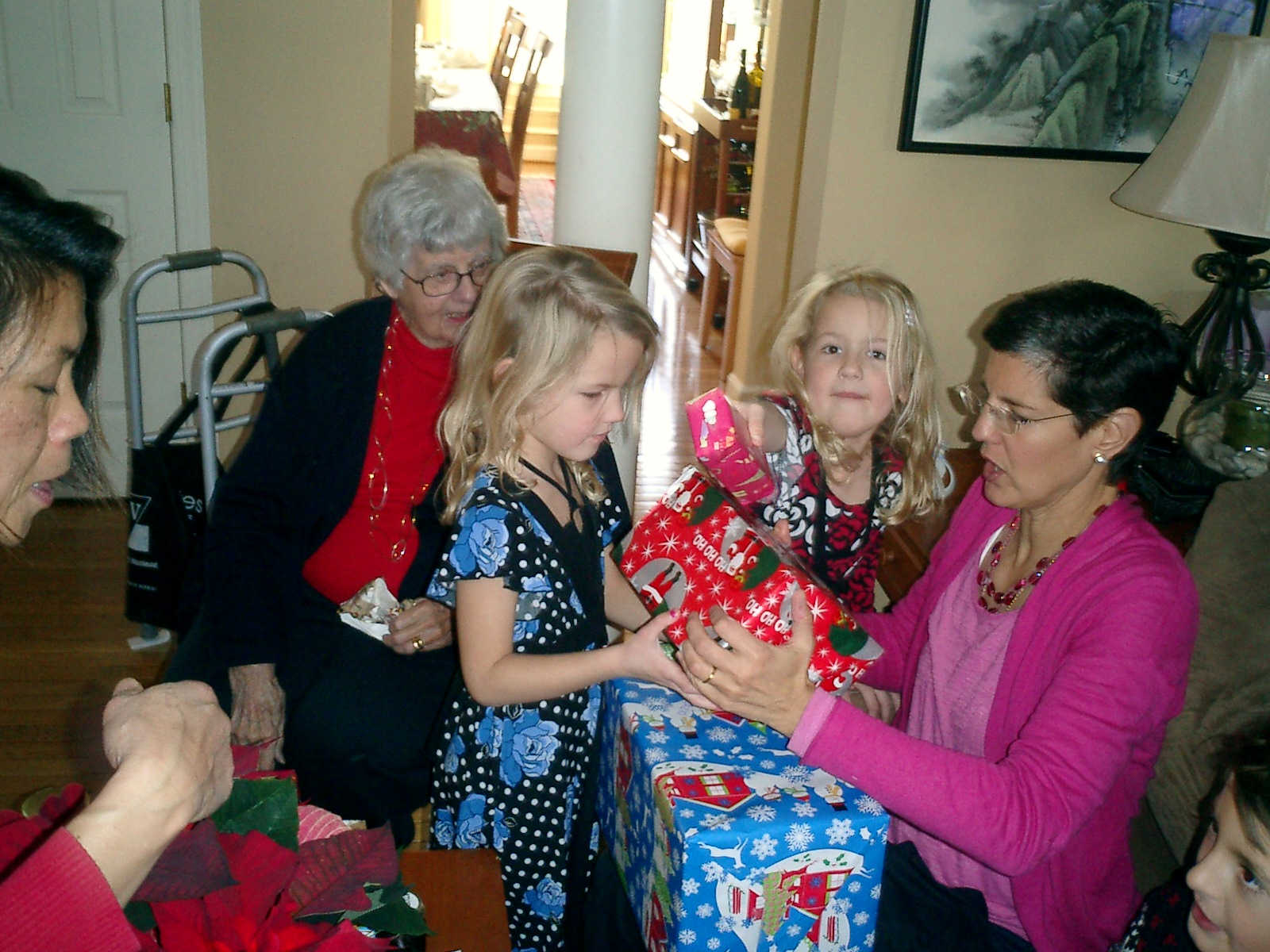 Nadine at 4 years and 1 month (Dec 24, 2010), celebrating Christmas with her cousins Katie, Charlotte, and Kaz. Wow, you got to make gingerbread men, and then got a lot of presents from everyone!