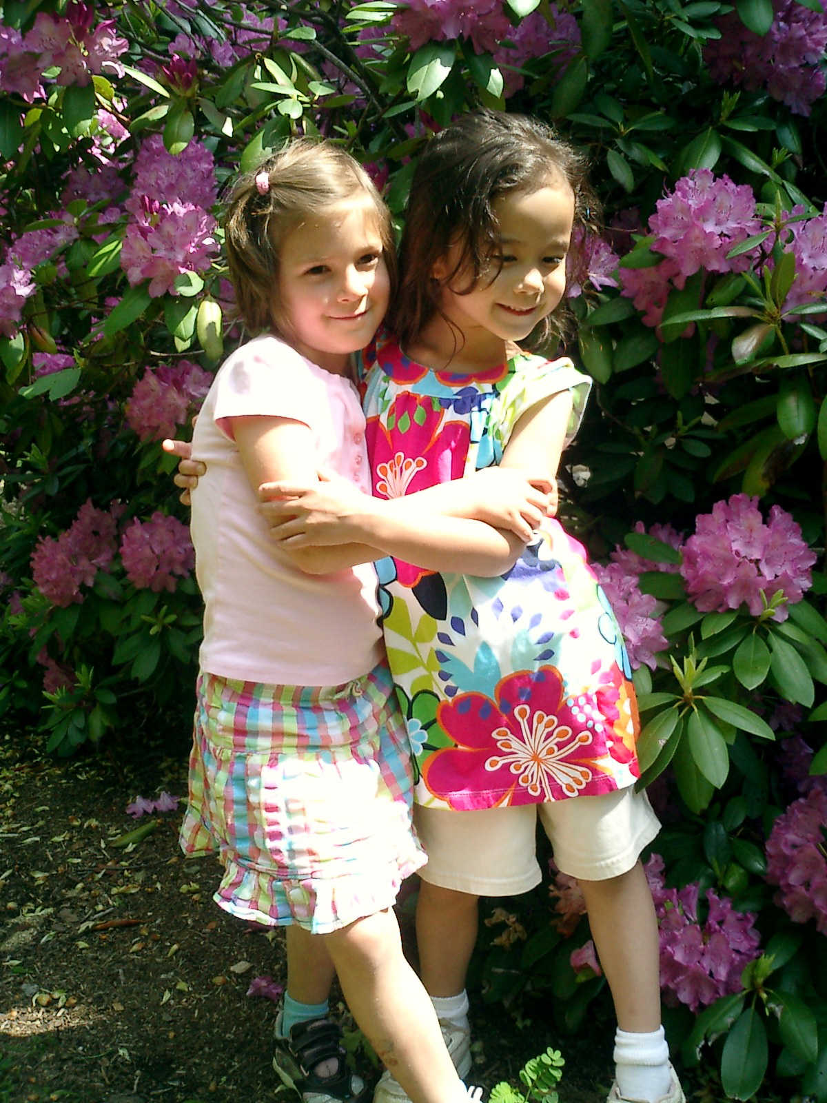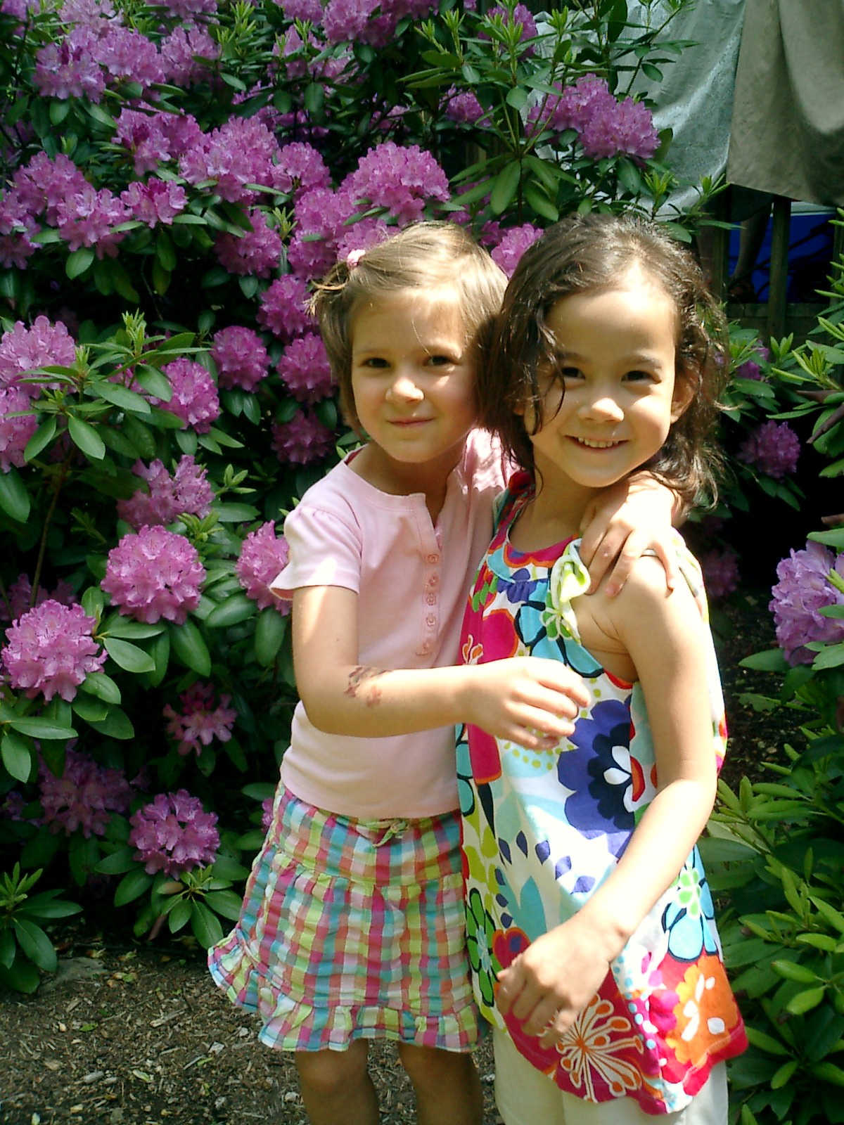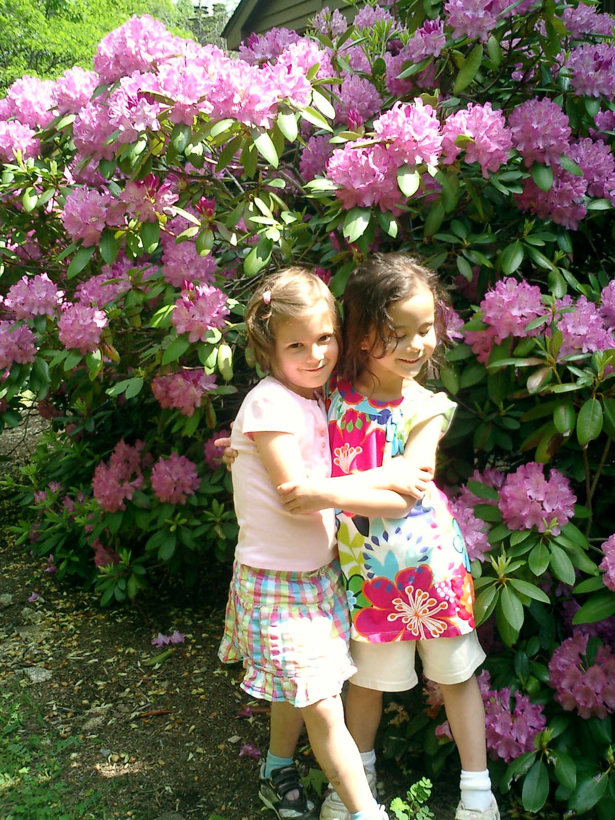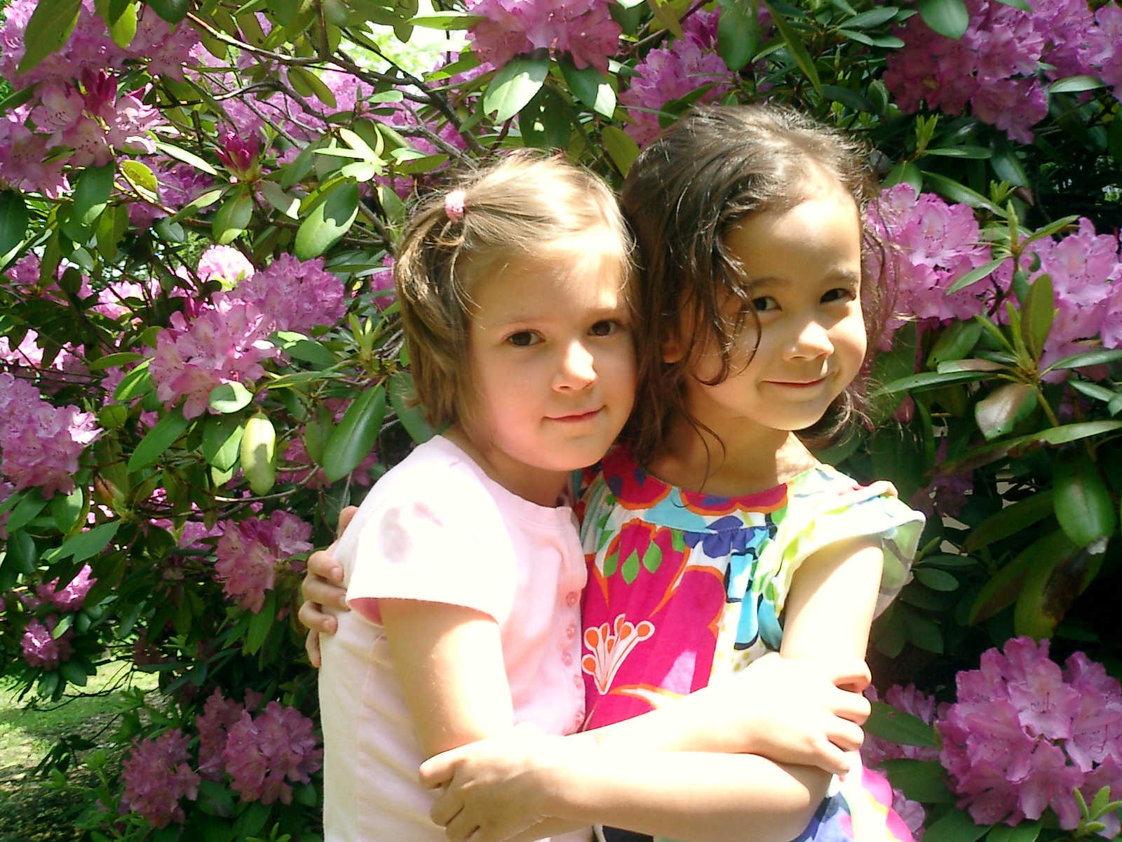 Nadine at 4 years and 6 months (May 30, 2011), having fun at Wintergreen with her best friend Katya. Nadine, you girls look so pretty with those Spring flowers!