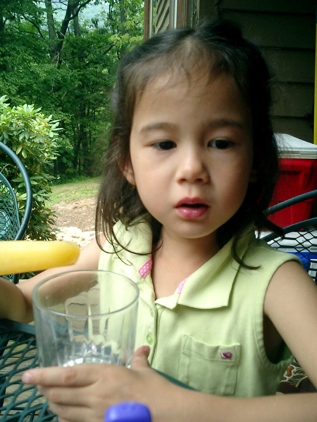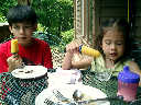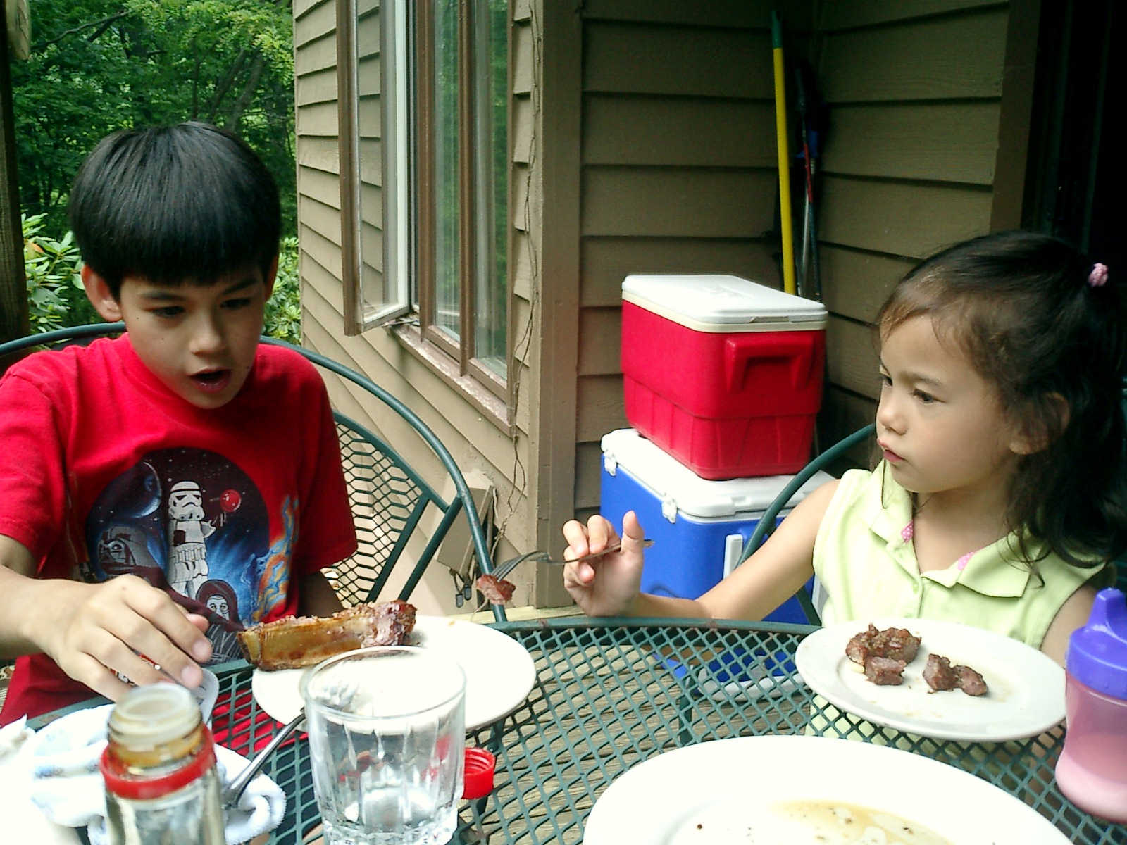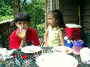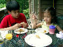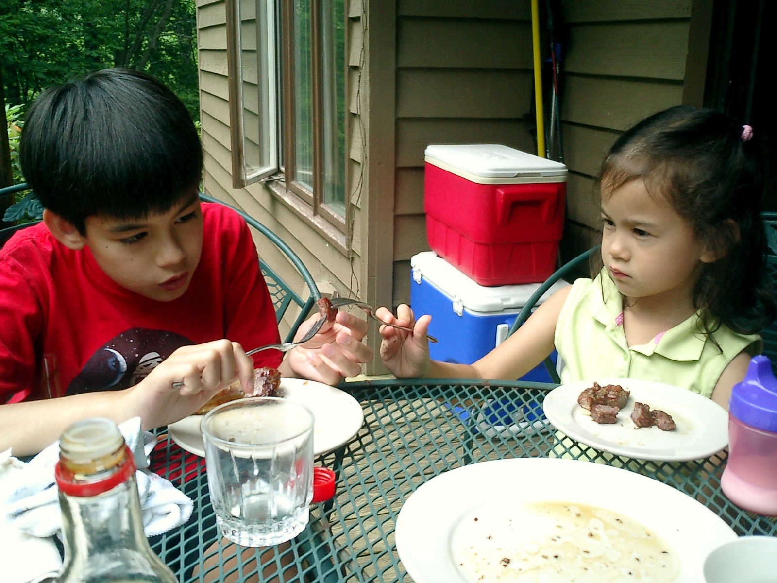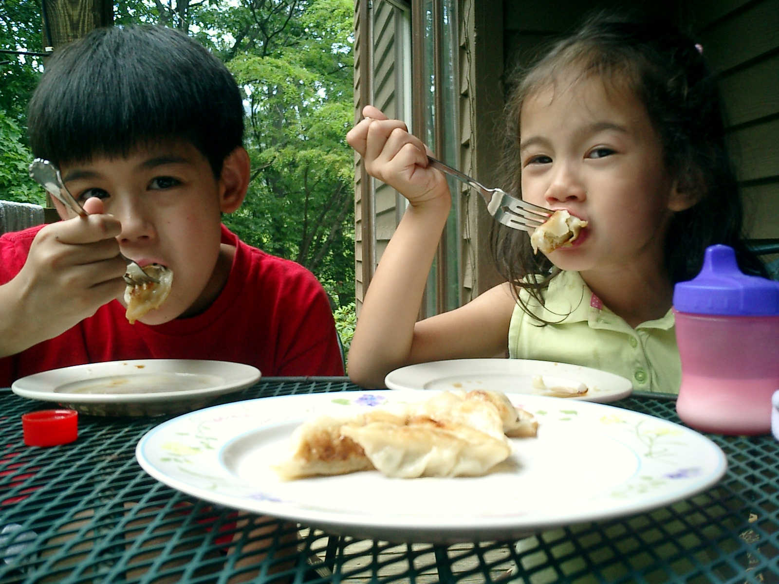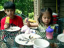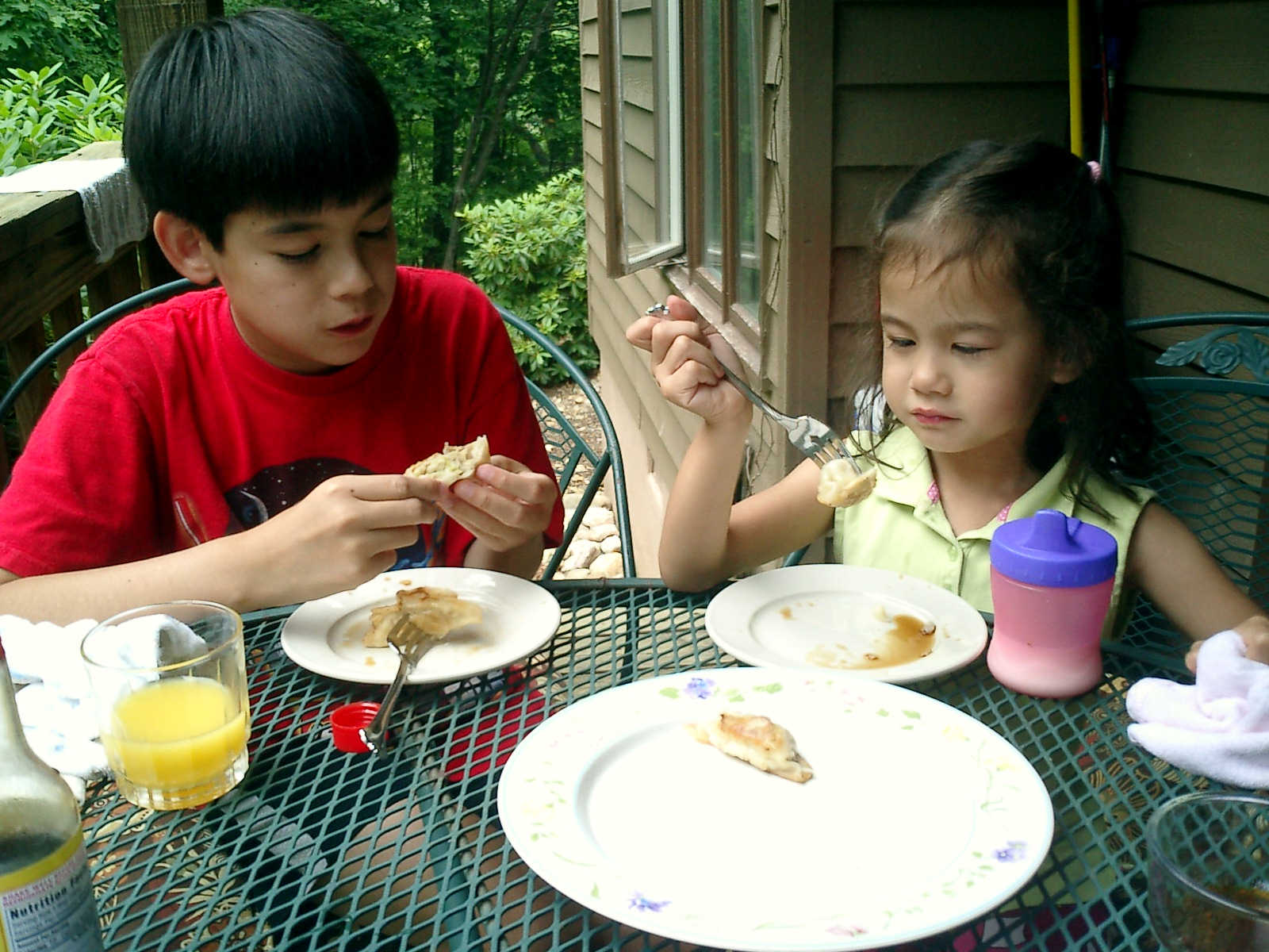Nadine at 4 years and 7 months (Jul 3, 2011), enjoying a big lunch at Wintergreen, with Nolan. How are the fried dumplings? Delicious!