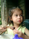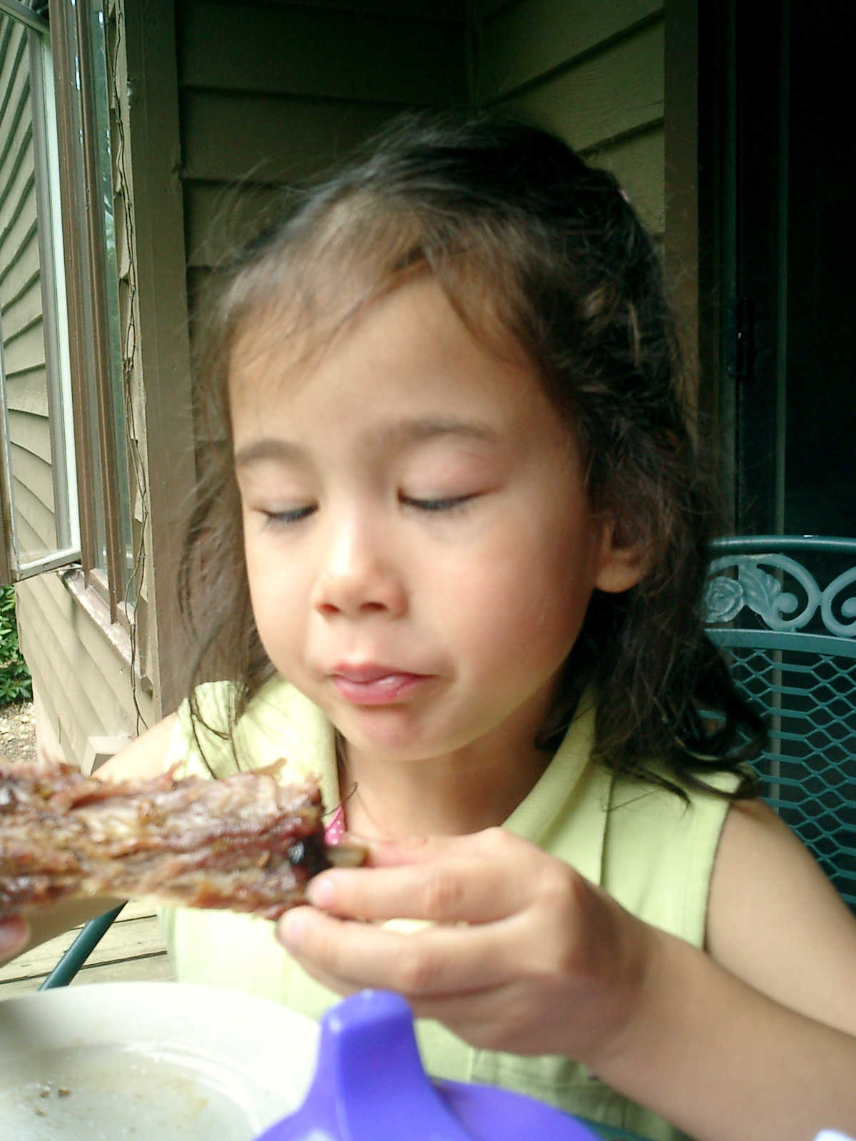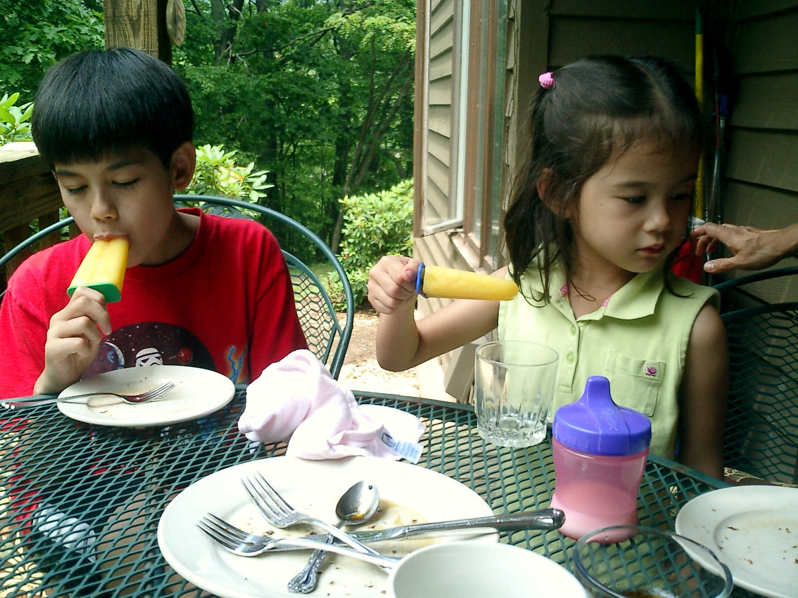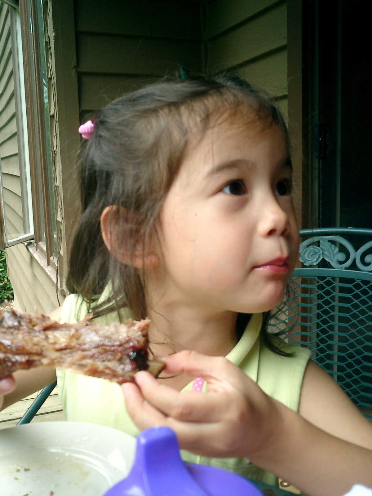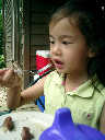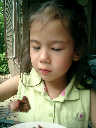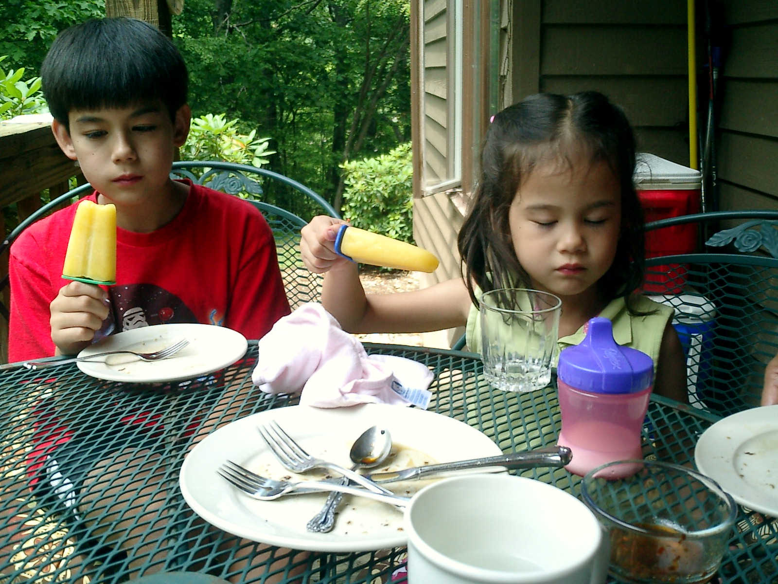 Nadine at 4 years and 7 months (Jul 3, 2011), enjoying a big lunch at Wintergreen, with Nolan. How are the fried dumplings? Delicious!