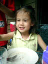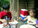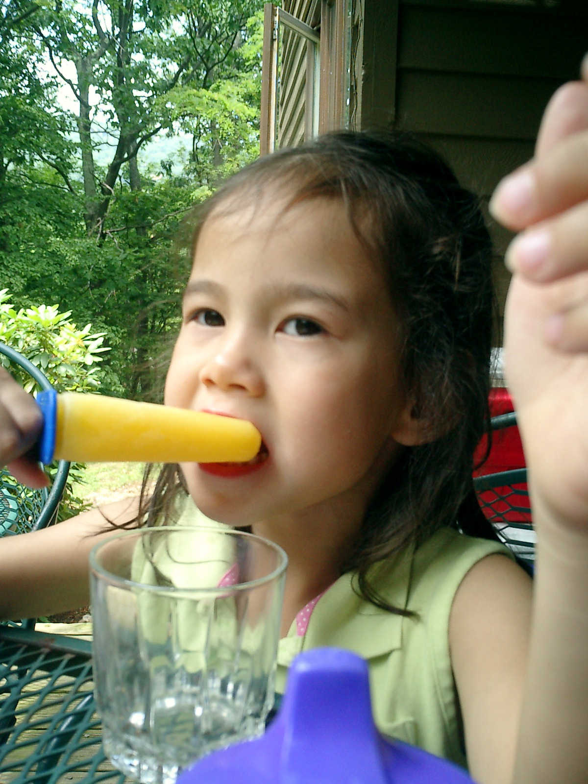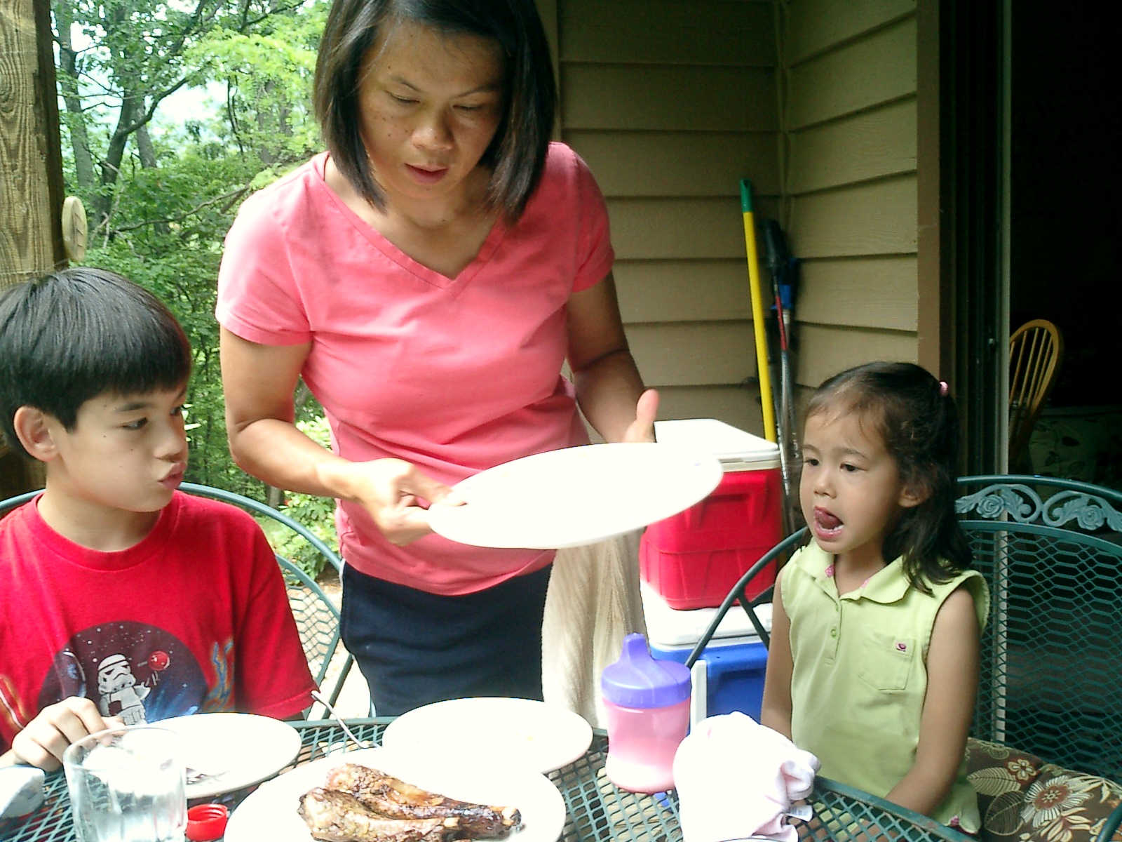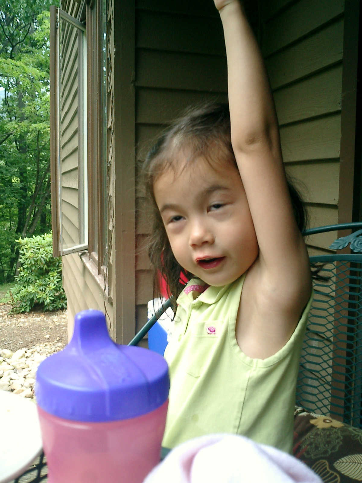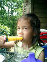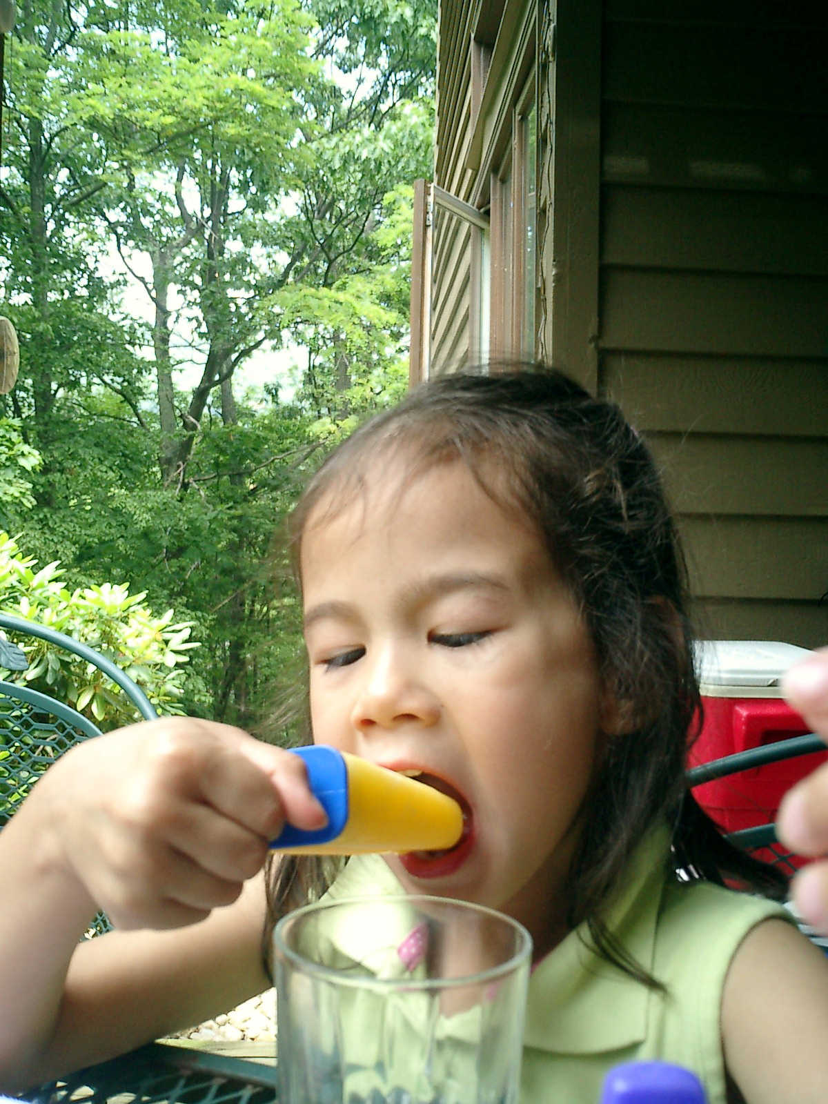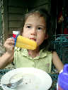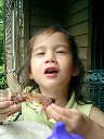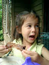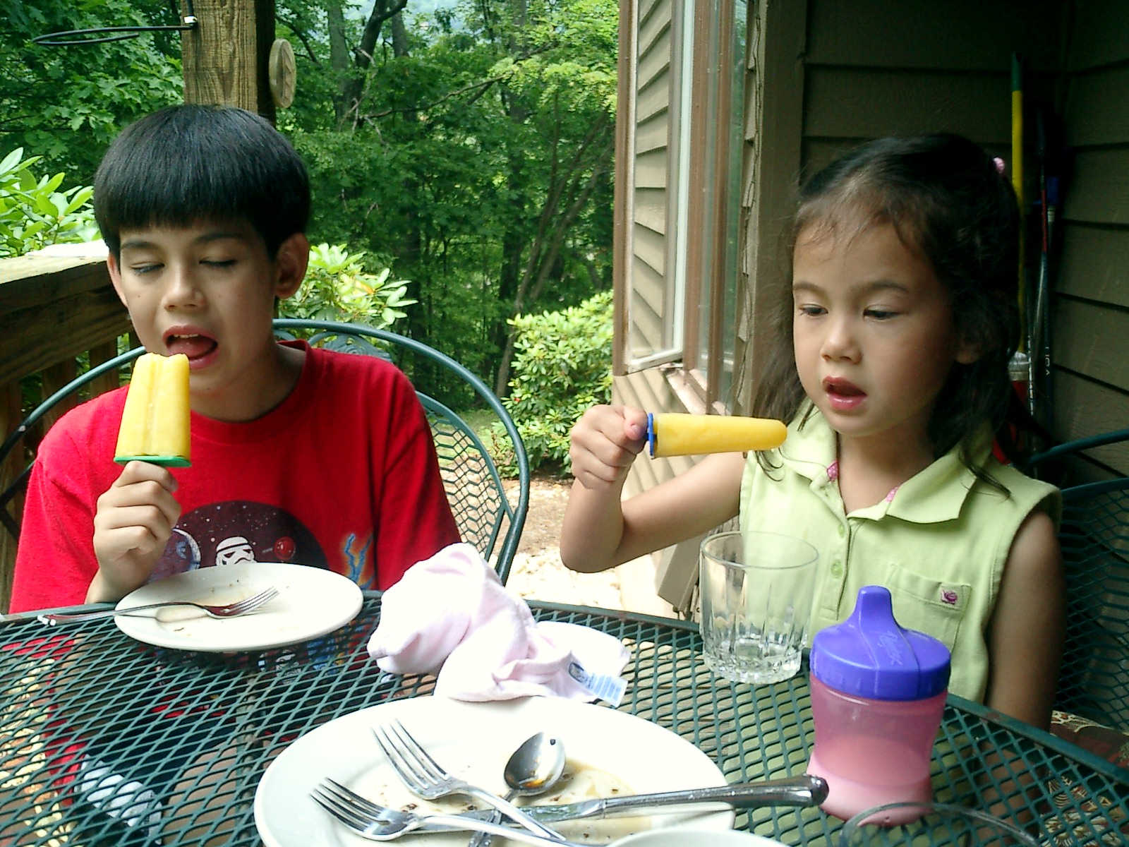 Nadine at 4 years and 7 months (Jul 3, 2011), enjoying a big lunch at Wintergreen, with Nolan. How are the fried dumplings? Delicious!