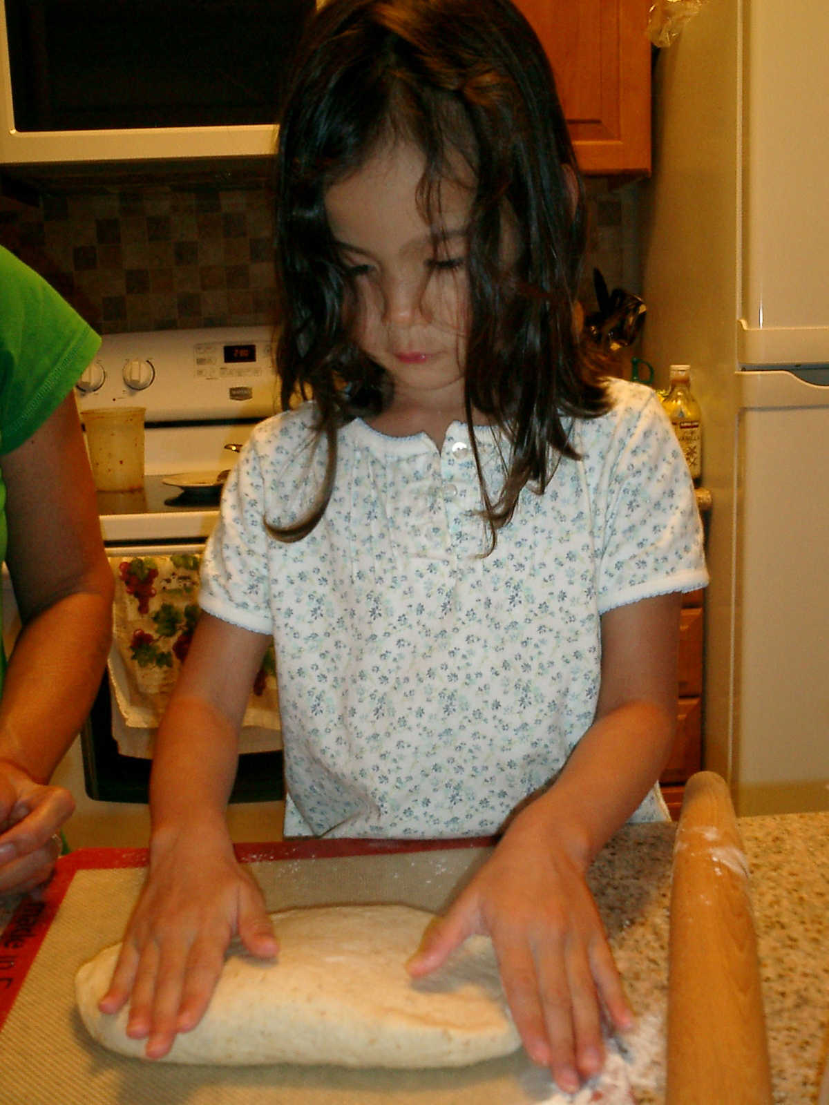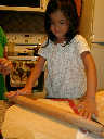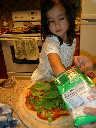 Nadine at 4 years and 9 months (Aug 13, 2011), helping Mommy make pizza at Wintergreen. Nadine, did you enjoy the fresh spinich? Fresh basil too!