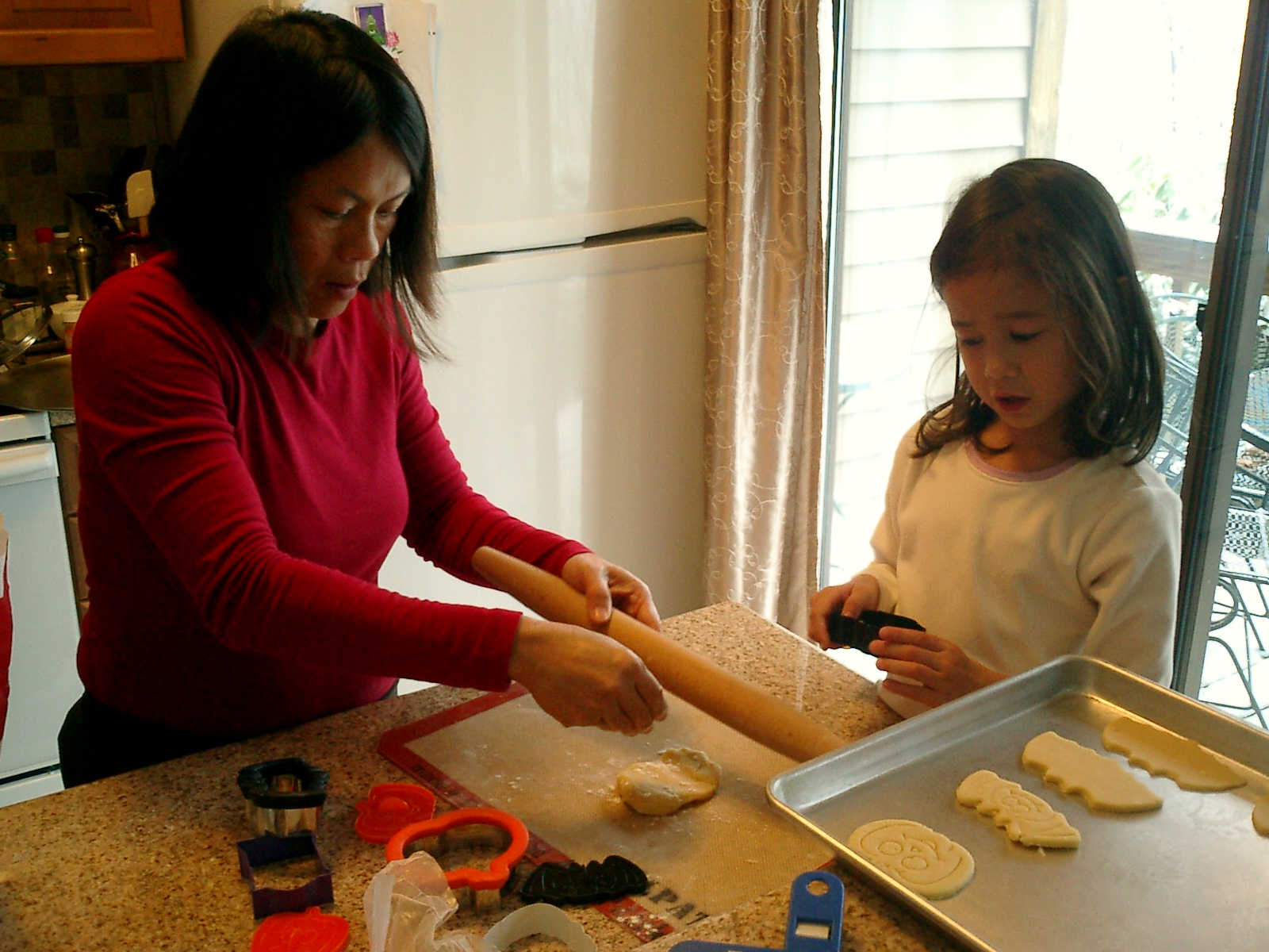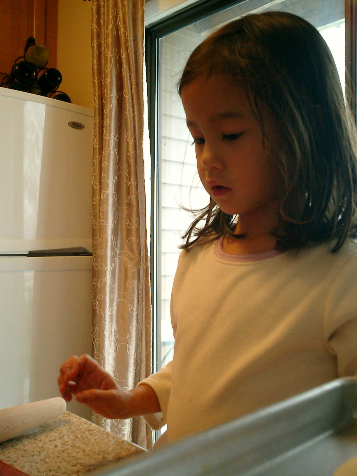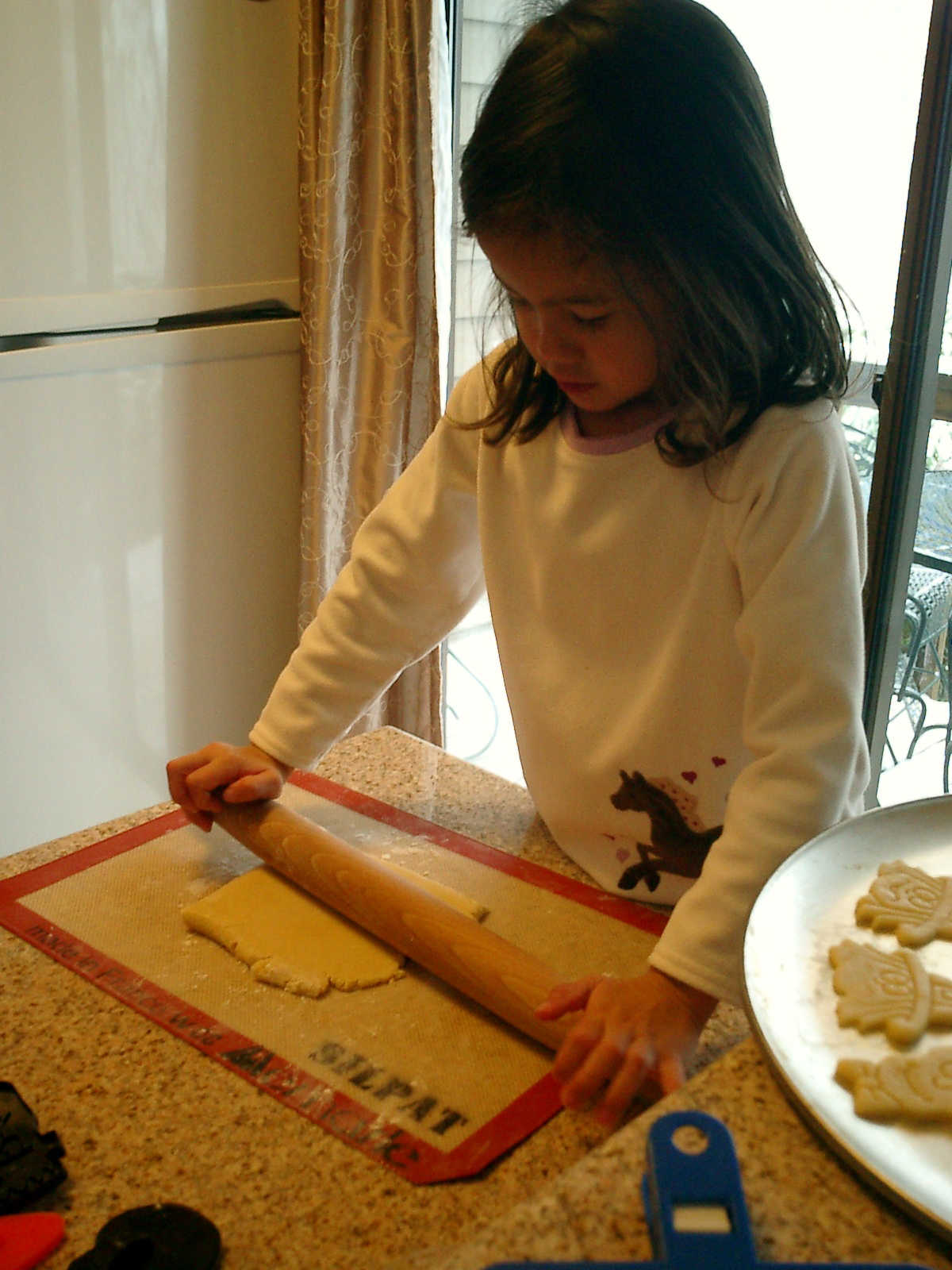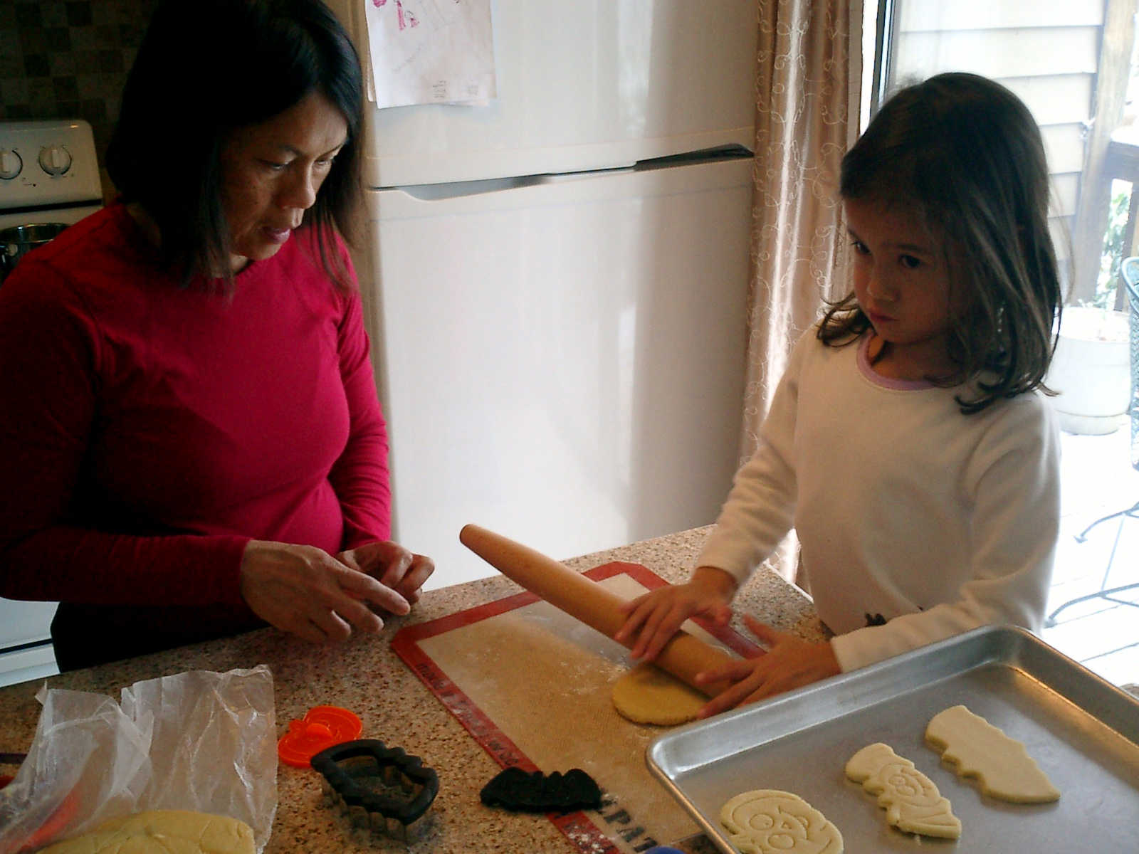 Nadine at 4 years and 11 months (Oct 29, 2011), helping Mommy bake Halloween cookies. It was cold outside, but nice and warm inside with those cookies baking and the fireplace roaring!