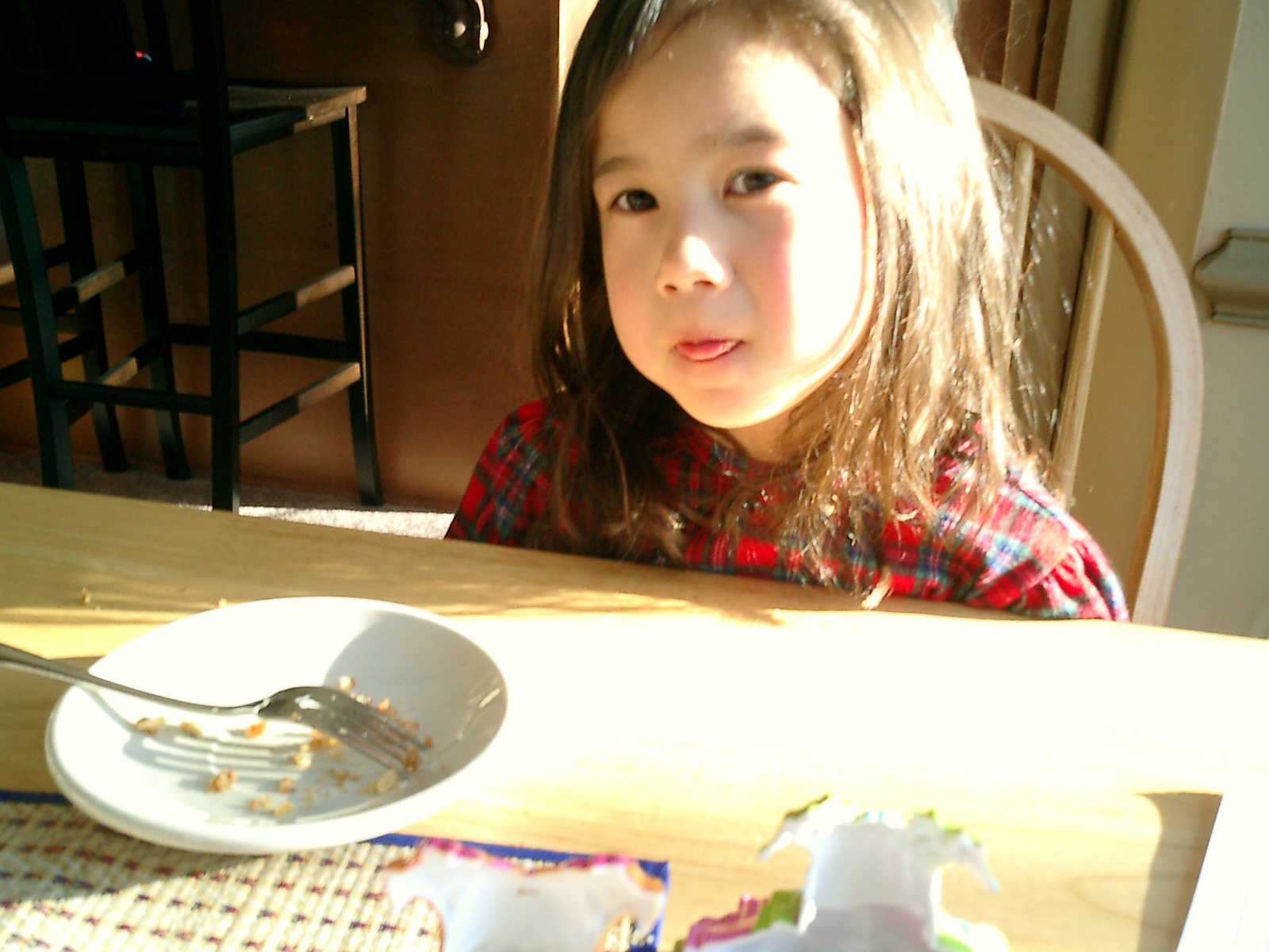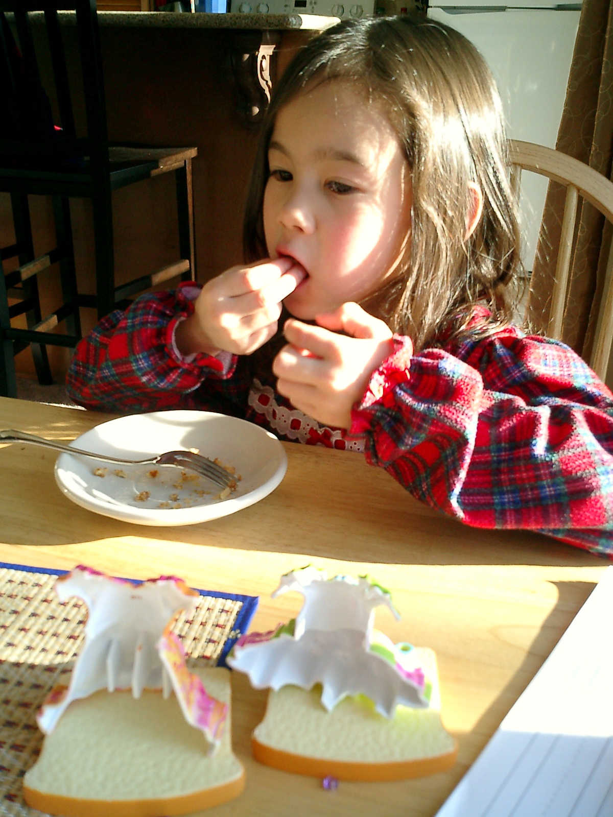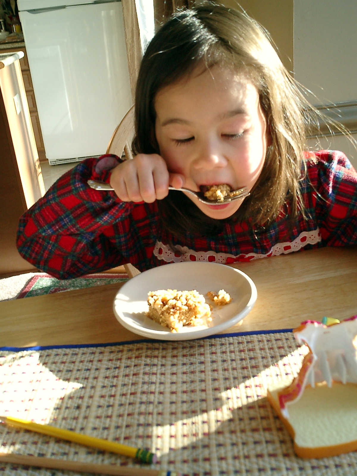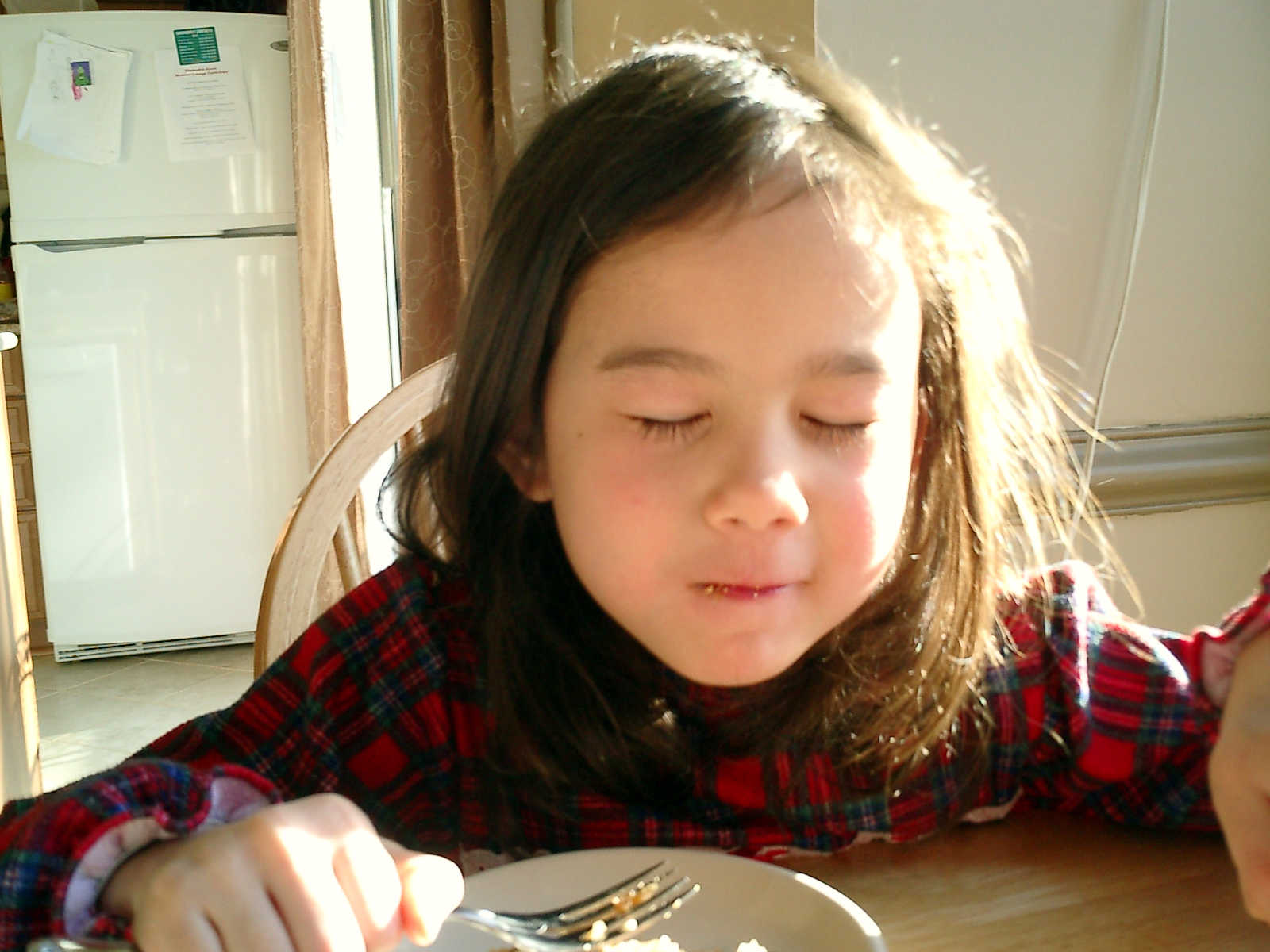 Nadine at 5 years and 3 months (Feb 11, 2012), enjoying cake for breakfast. Mmmmmm!