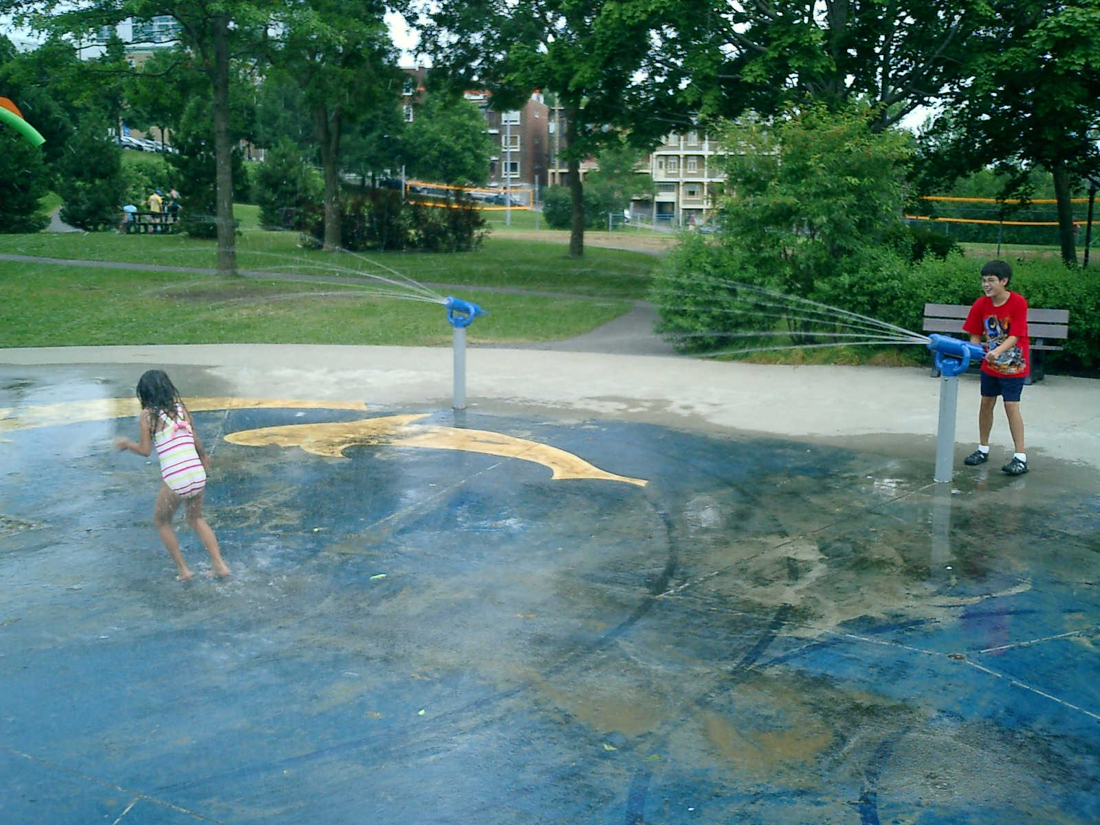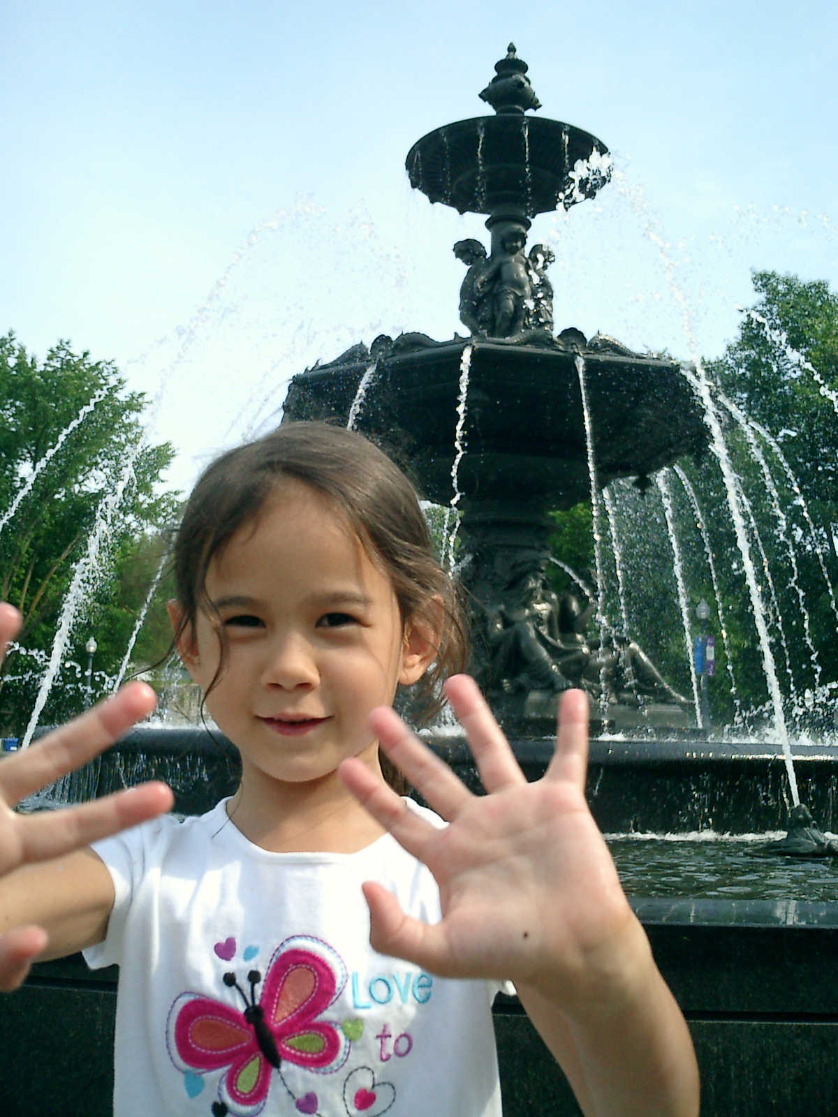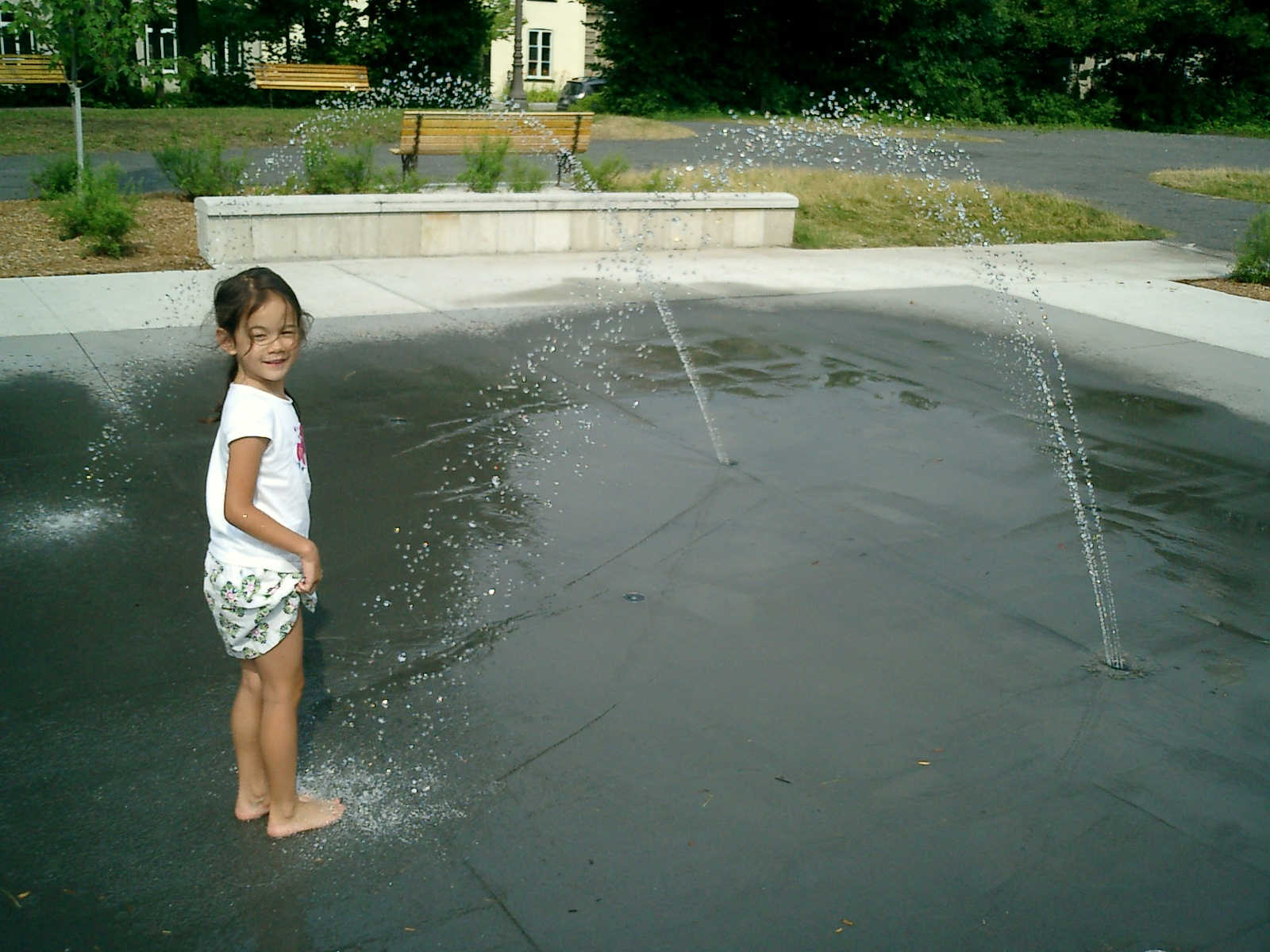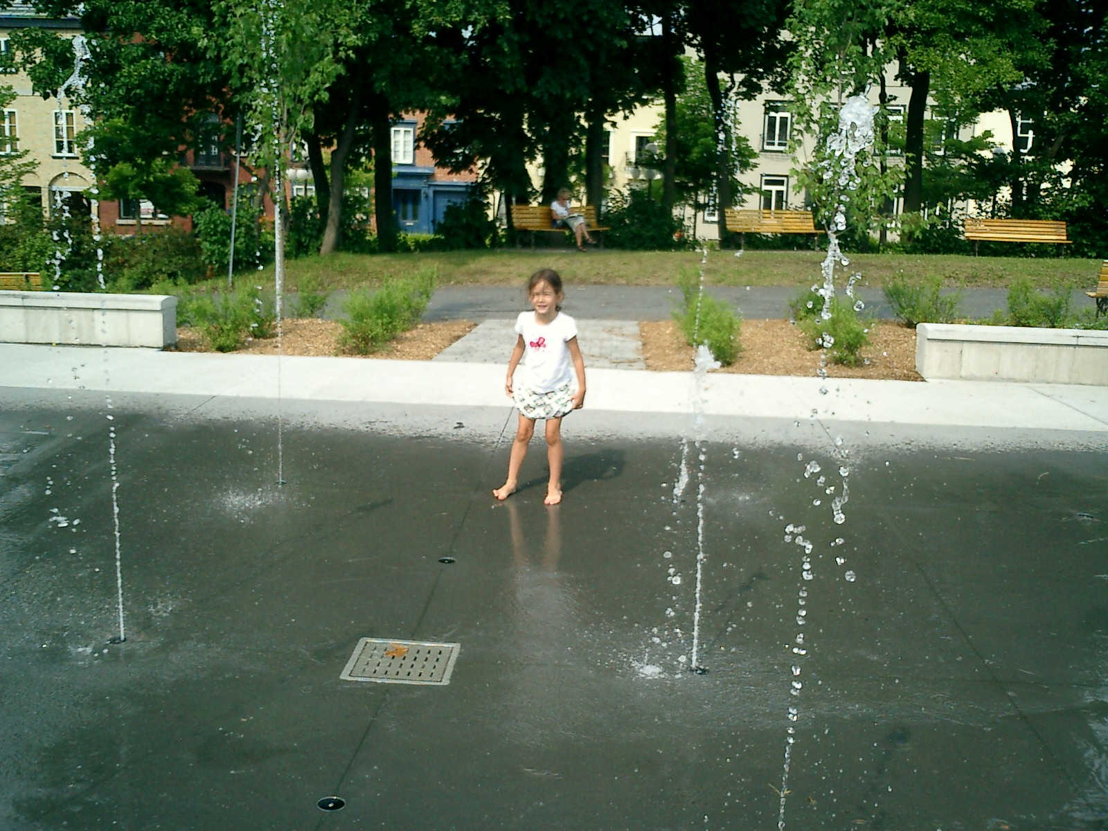 Nadine at 5 years and 8 months (Jul 17, 2012), beating the heat in downtown Quebec City, visiting the fountains and playground water sprinklers too!