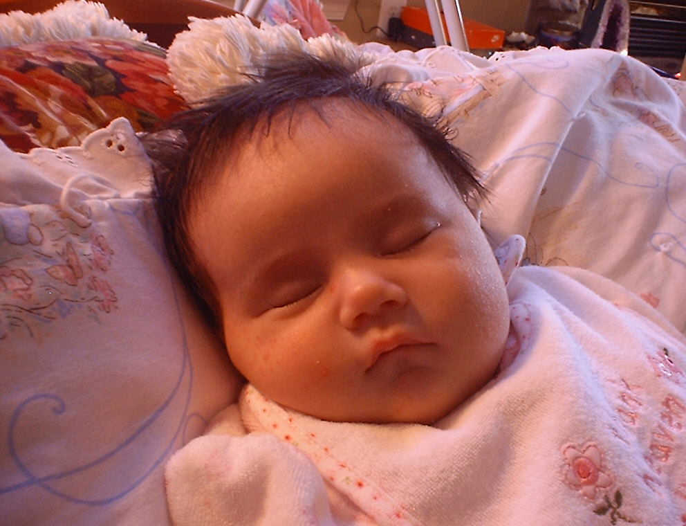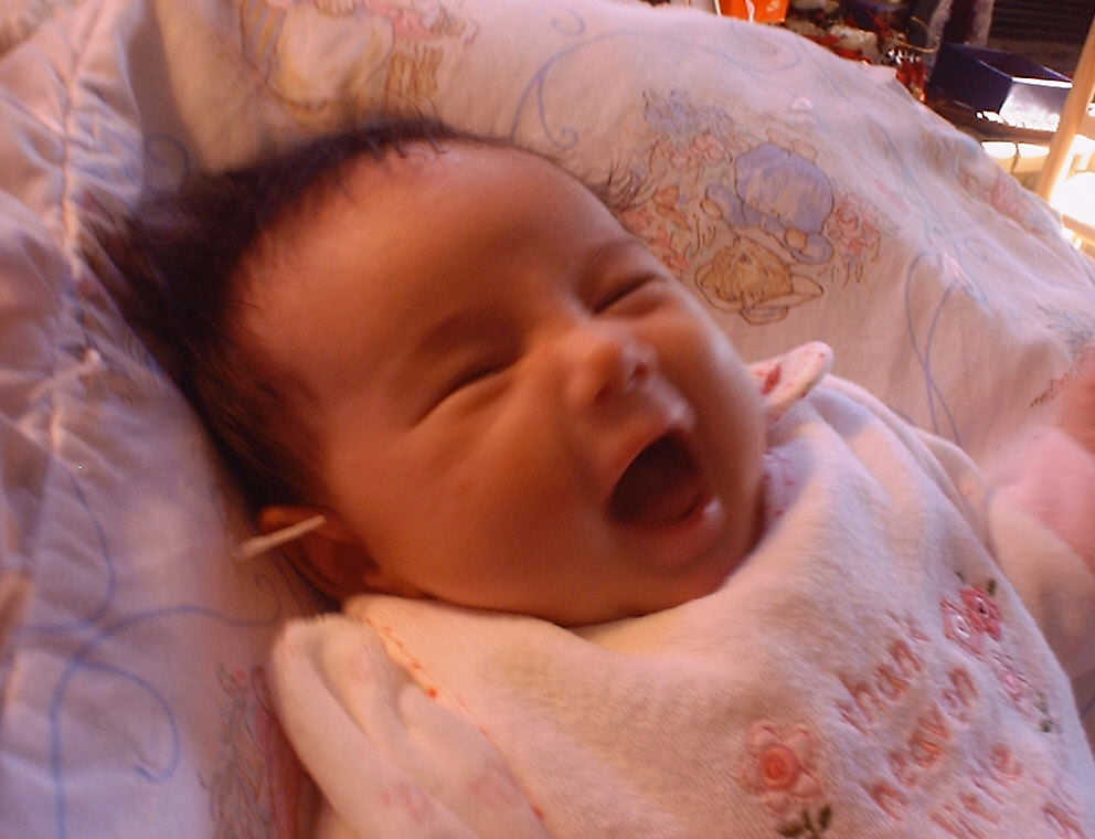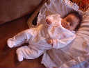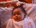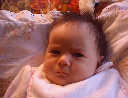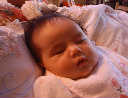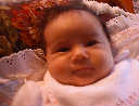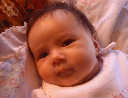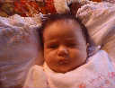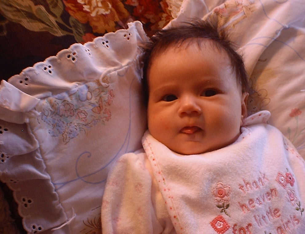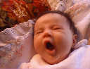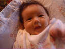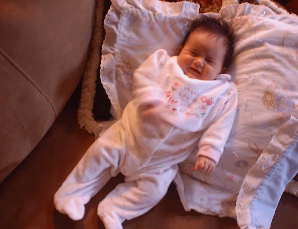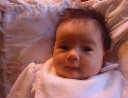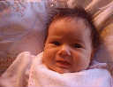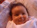 | Nadine at six weeks, getting a little exercise from "tummy time" -- look, she can lift her head already! After the "workout", it's time for some giggles, yawns, and of course a nap. Nadine, you are growing every day -- you're eyes are so bright, and just look at that smile! |