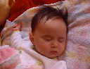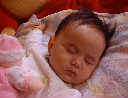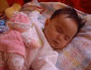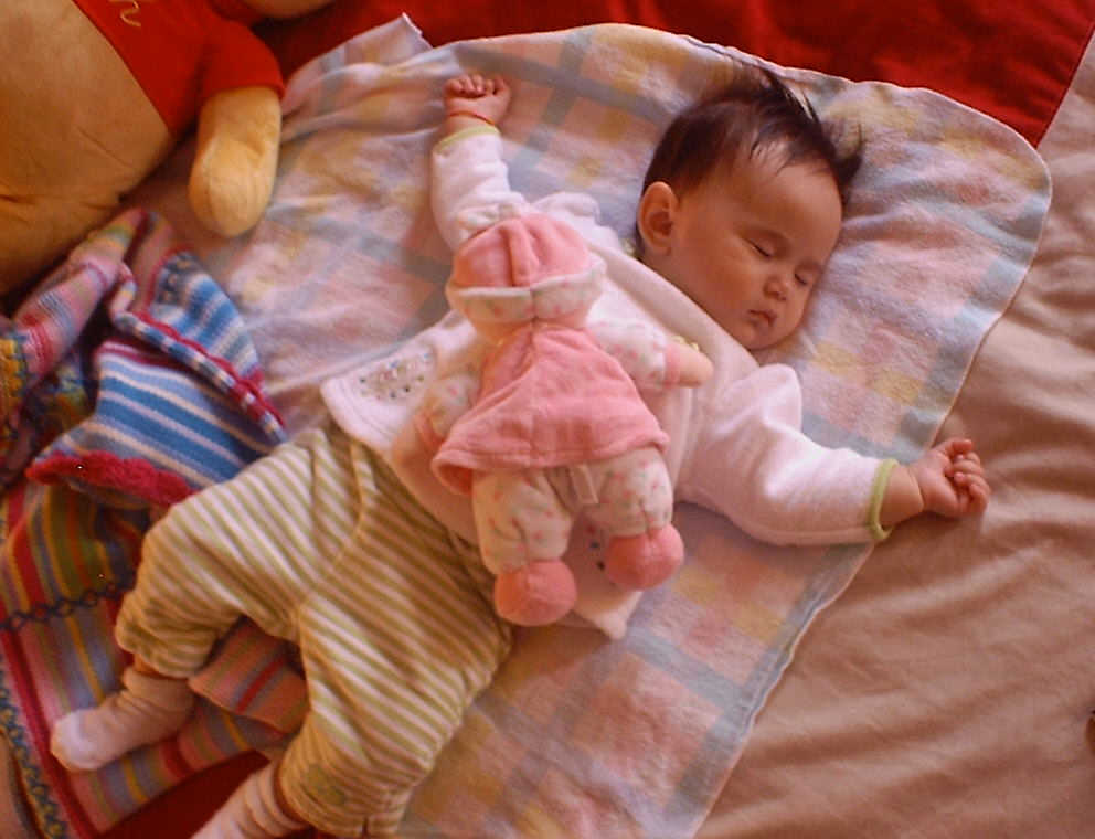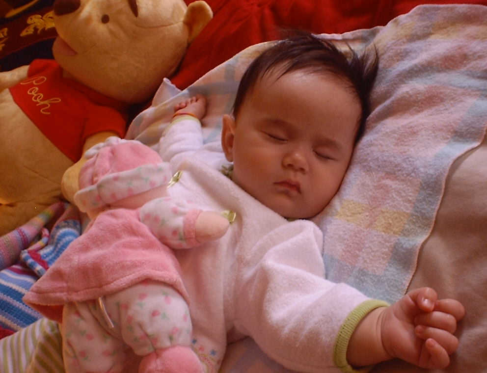 Nadine at four months (Mar 24, 2007), taking an afternoon nap in her brother Nolan's room, accompanied by Pooh Bear and her little doll. Boy Nadine, that sleep sure looks peaceful!