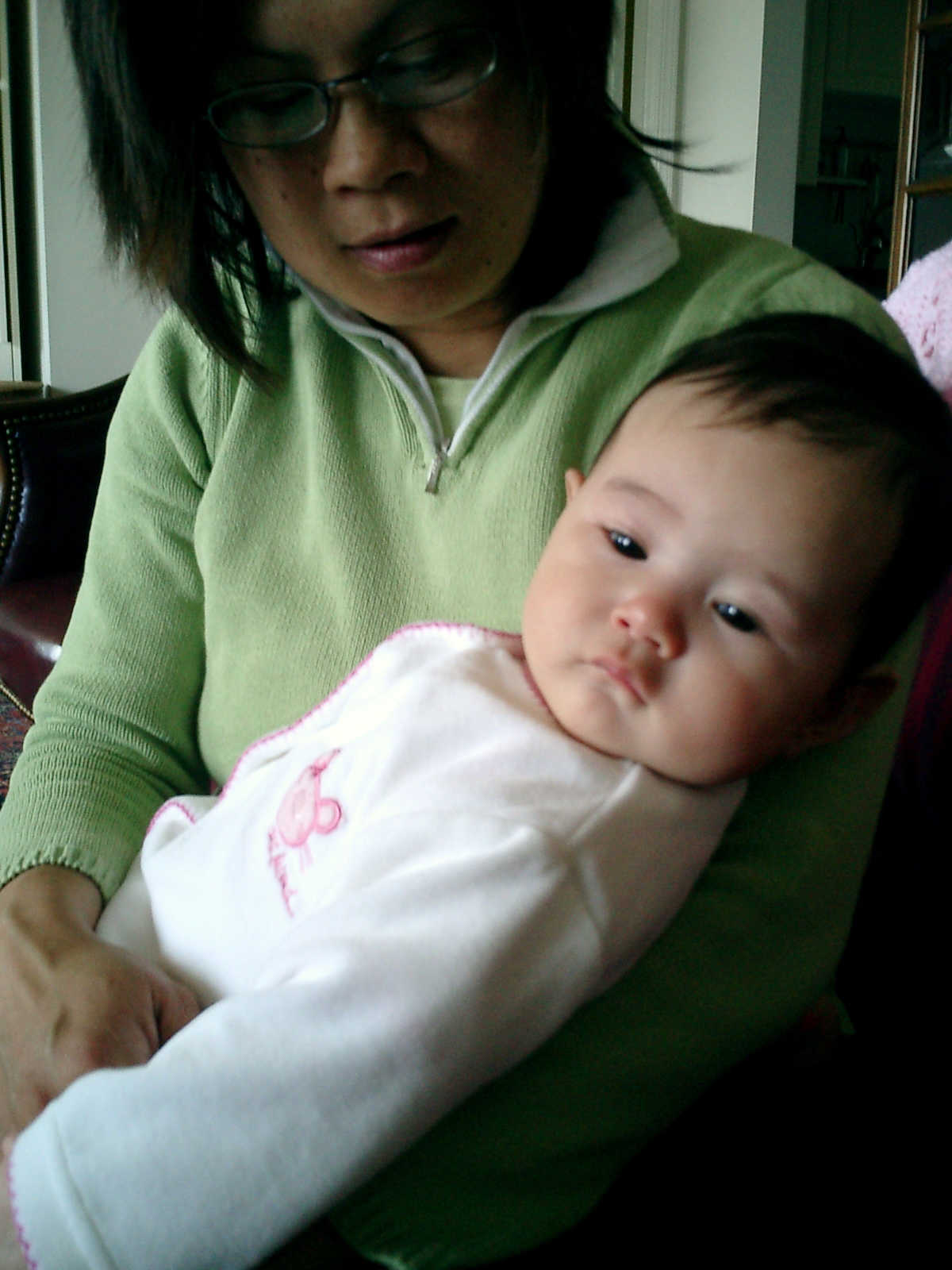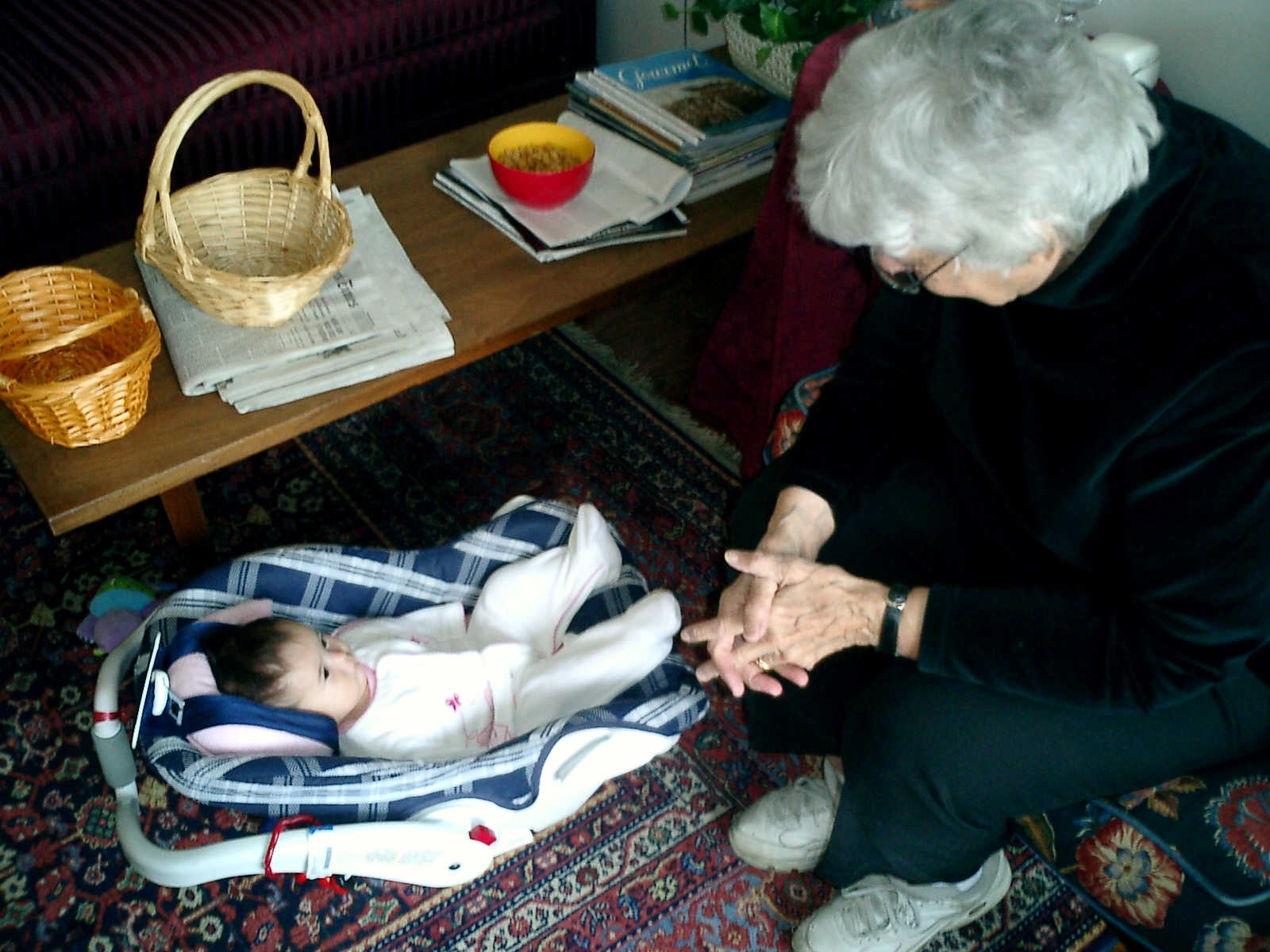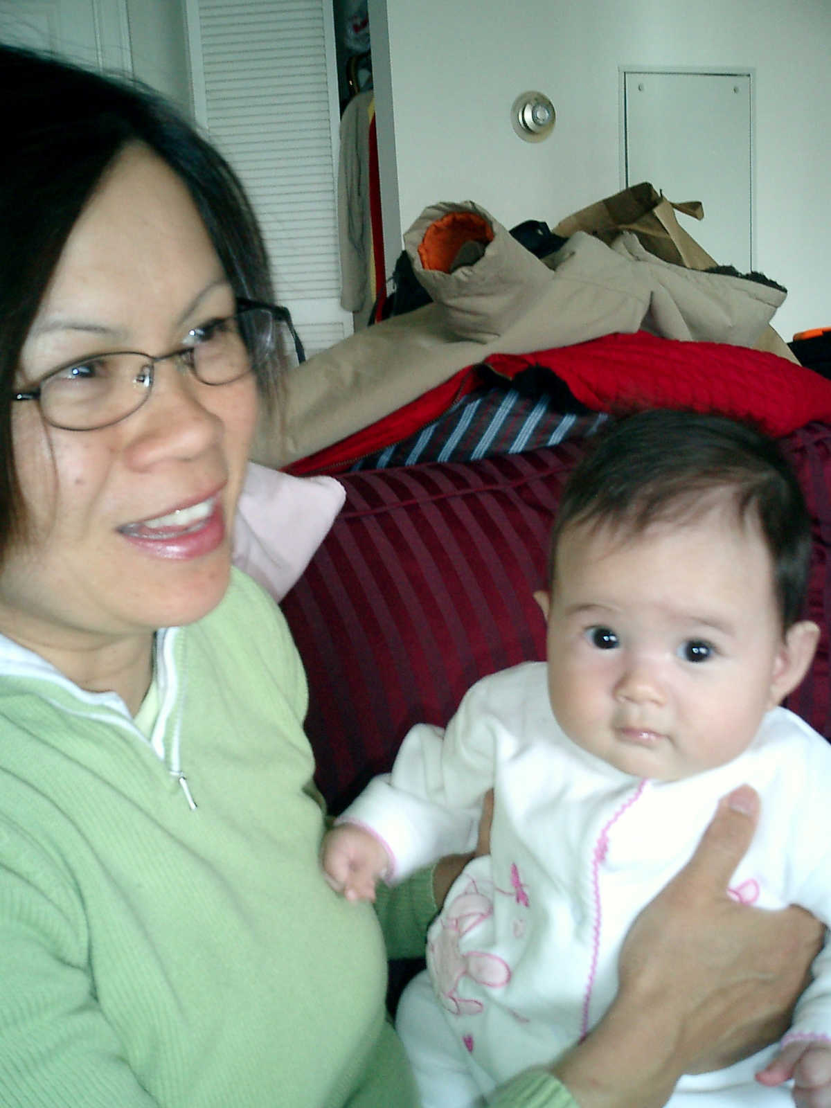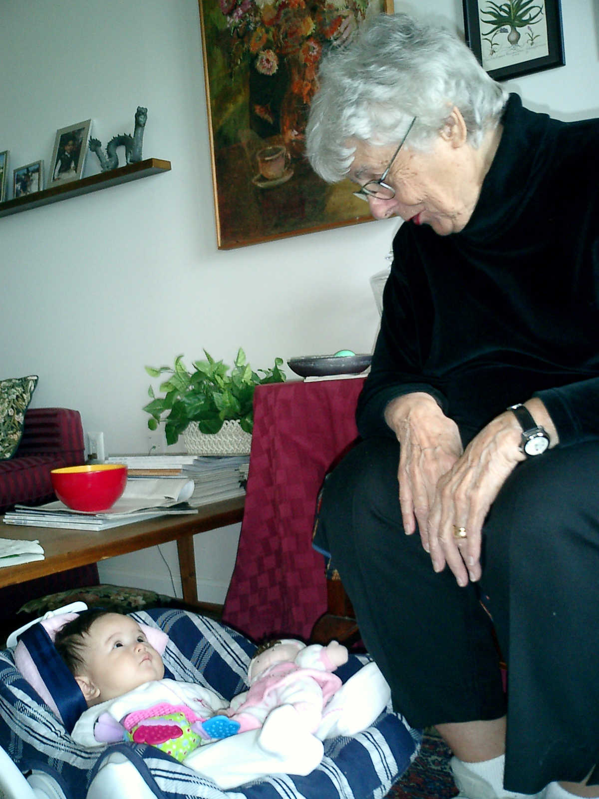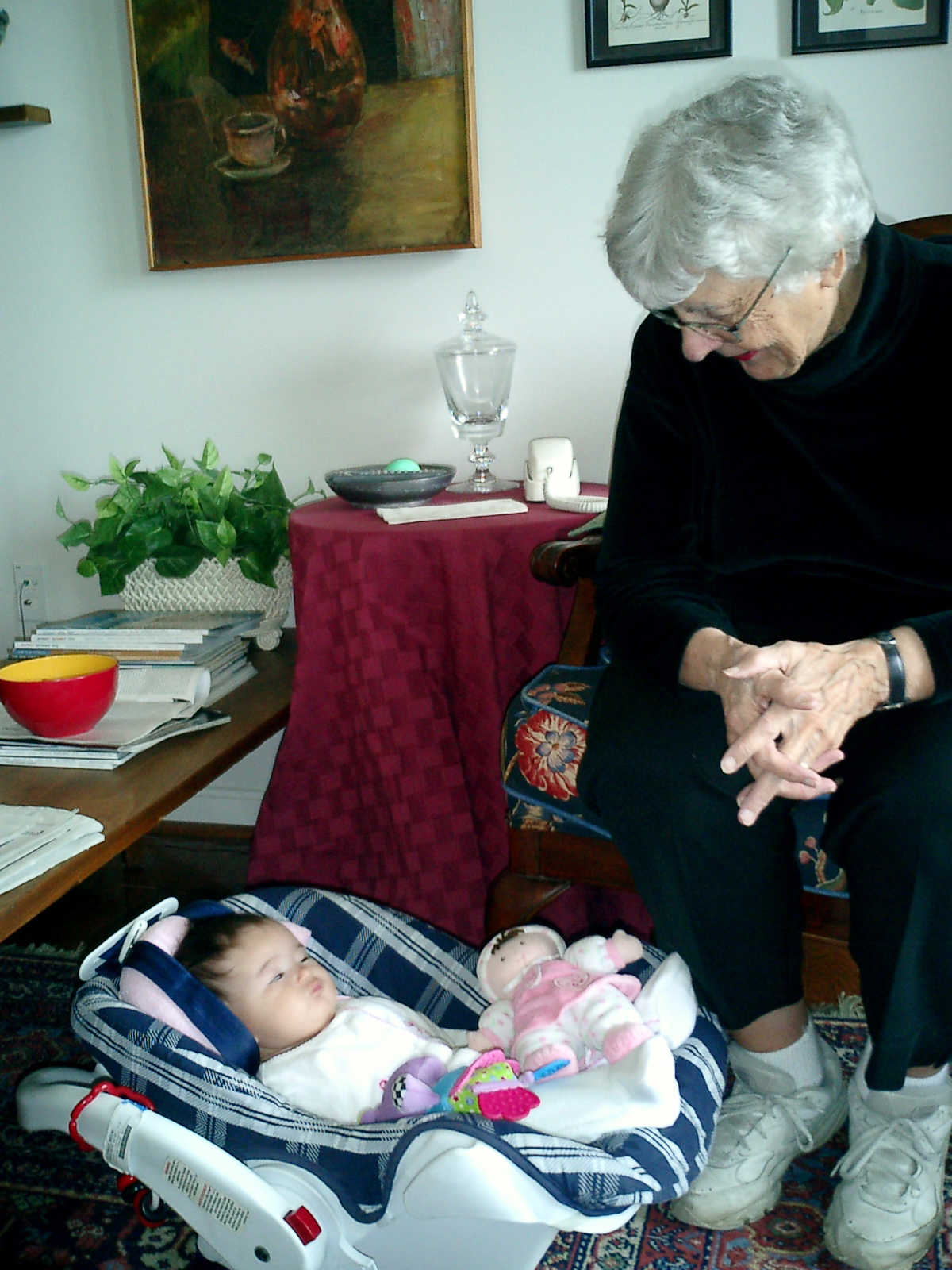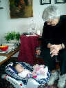 | Nadine at four and a half months (April 8, 2007), enjoying Easter Sunday at Grandma Alexander's home. Nolan does a great job finding fourteen colored Easter eggs (including two the Easter Bunny somehow hid in the refridgerator!). Nadine says, "Happy Easter everyone!" |