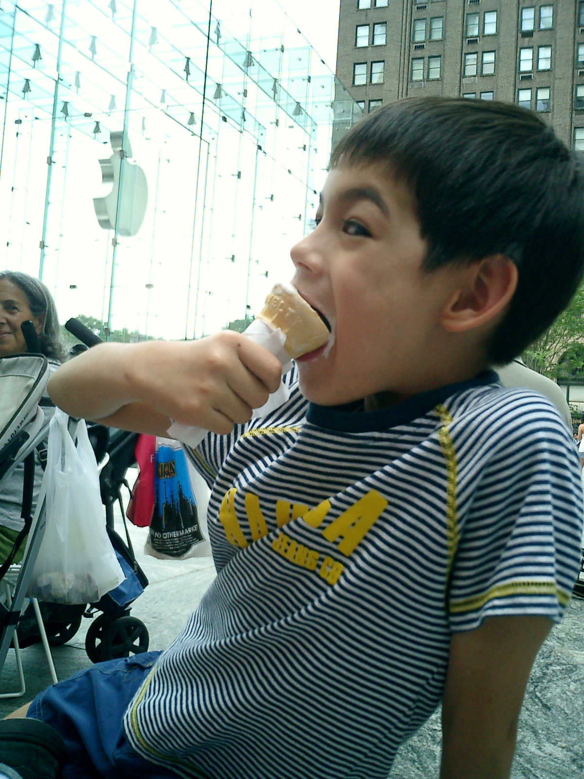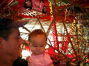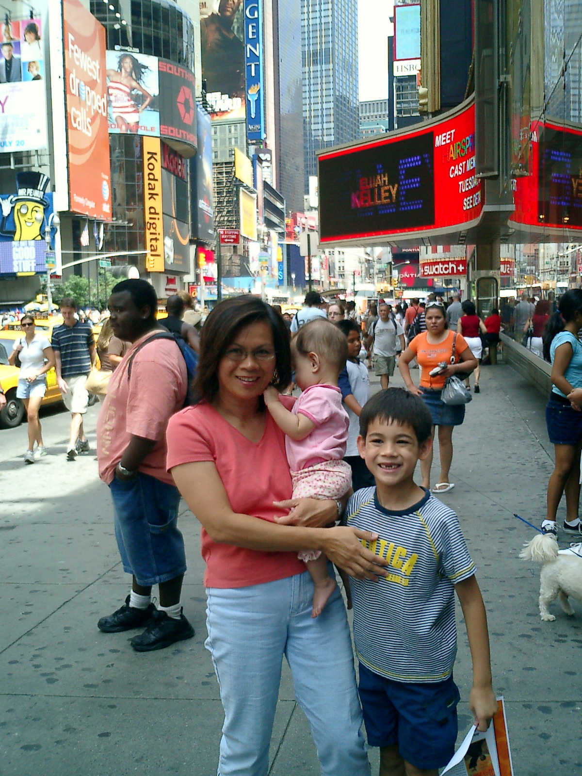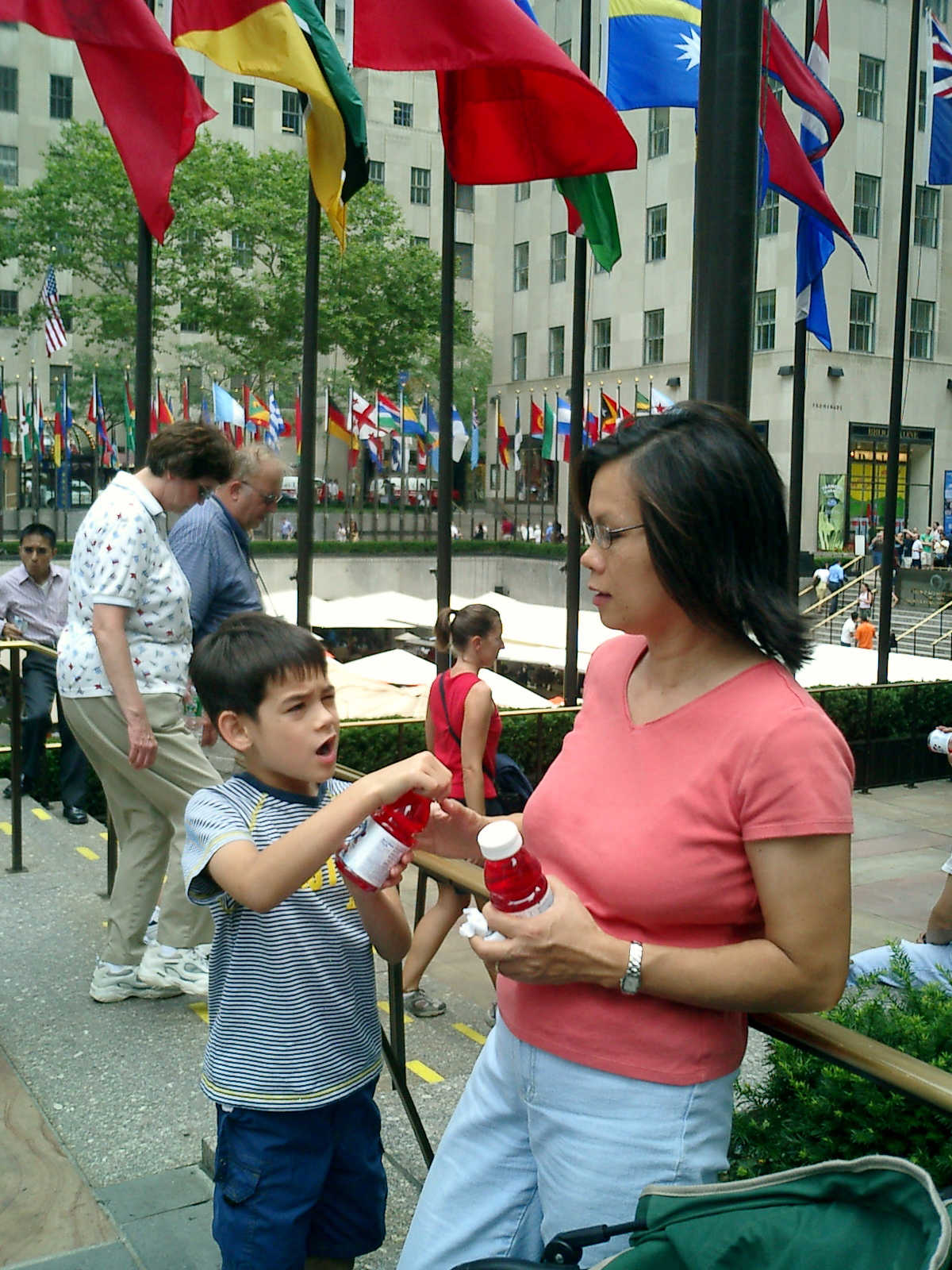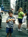 | New York City, here we come!!! Nadine at 7 and a half months (July 13, 2007), looking calm and composed as we stroll through mid-town Manhattan. First stop: Toys-R-Us with its giant Shrek, then on to Rockefeller Center and 59th Street (across from the Plaza Hotel) for a little refreshment. (Next stop: FAO Schwartz.) |