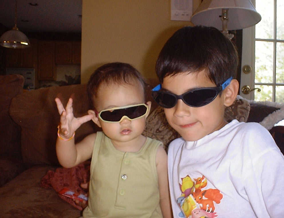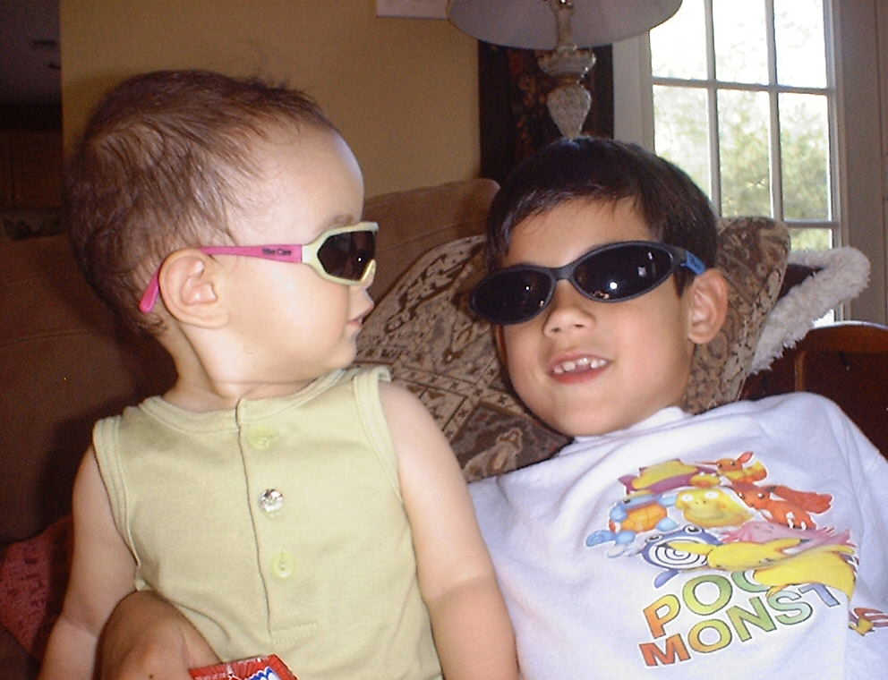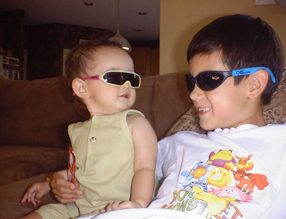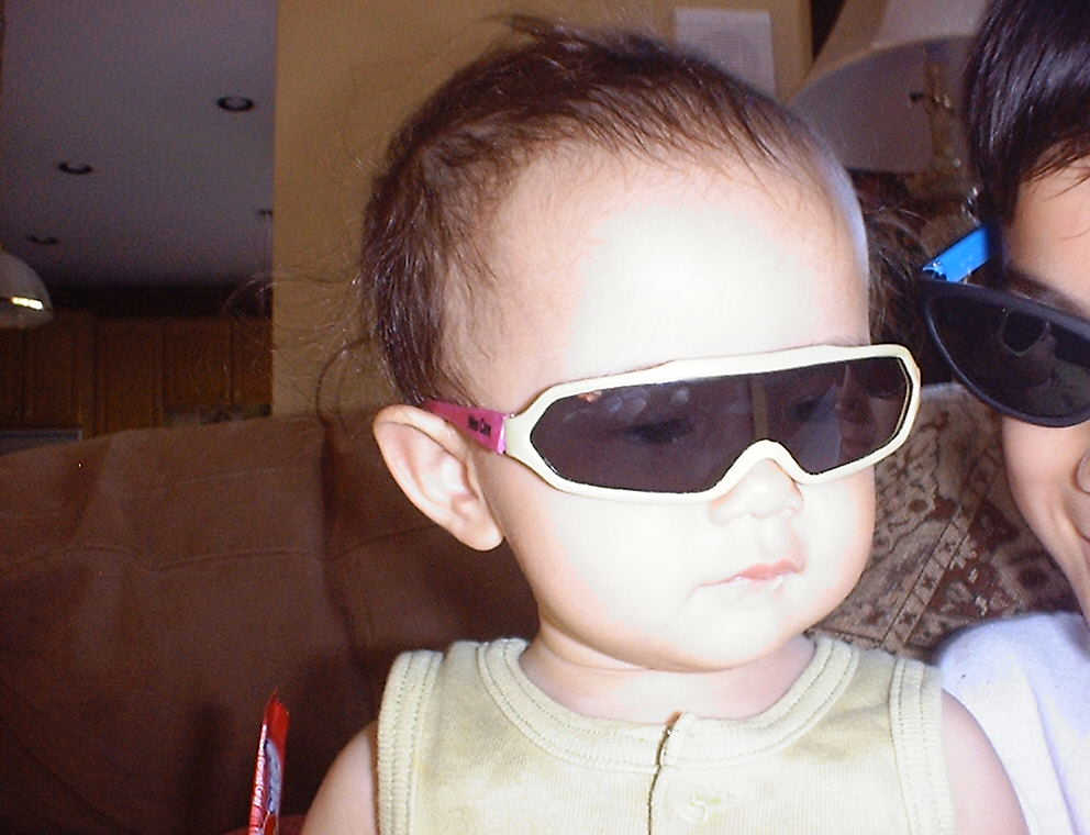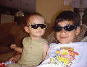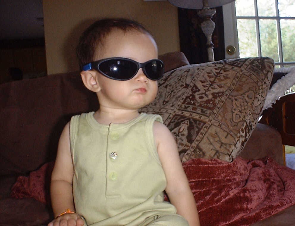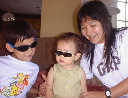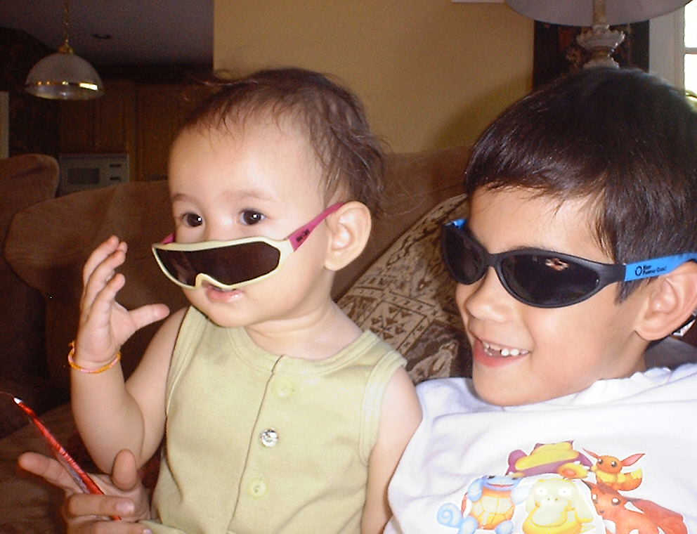 | Nadine at 10 and a half months (Oct 8, 2007), celebrating Columbus Day with her brother Nolan by trying on some cool shades to beat the heat. Both of you look like movie stars! Nadine, you look happy to have visitors; it that Aunt Tuke and Great Aunt Tai? |
