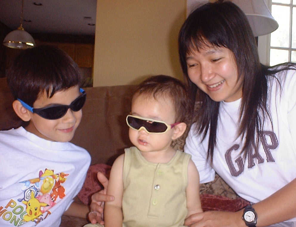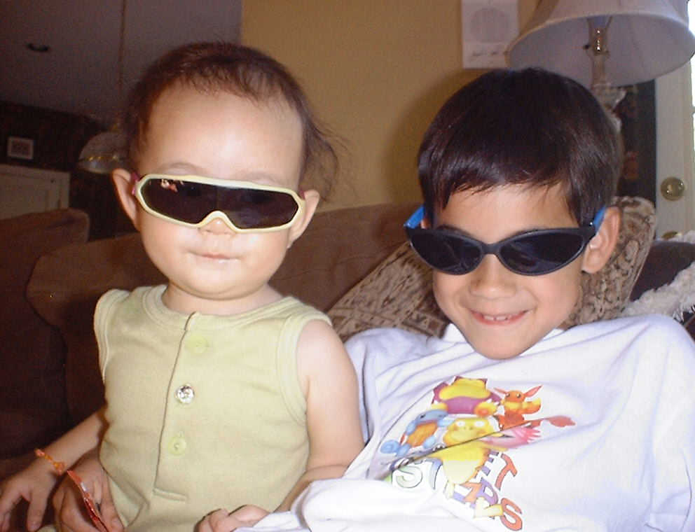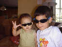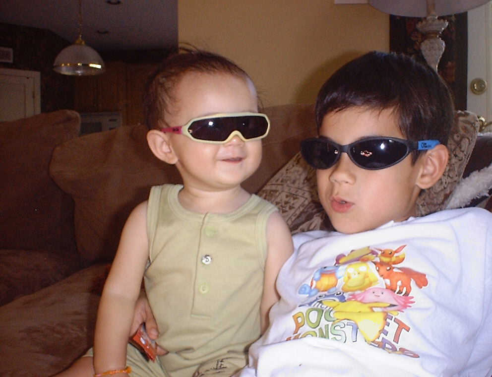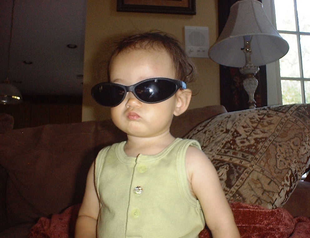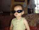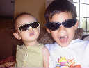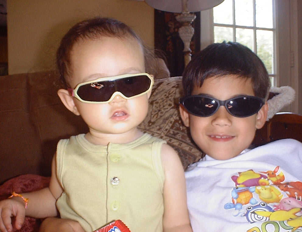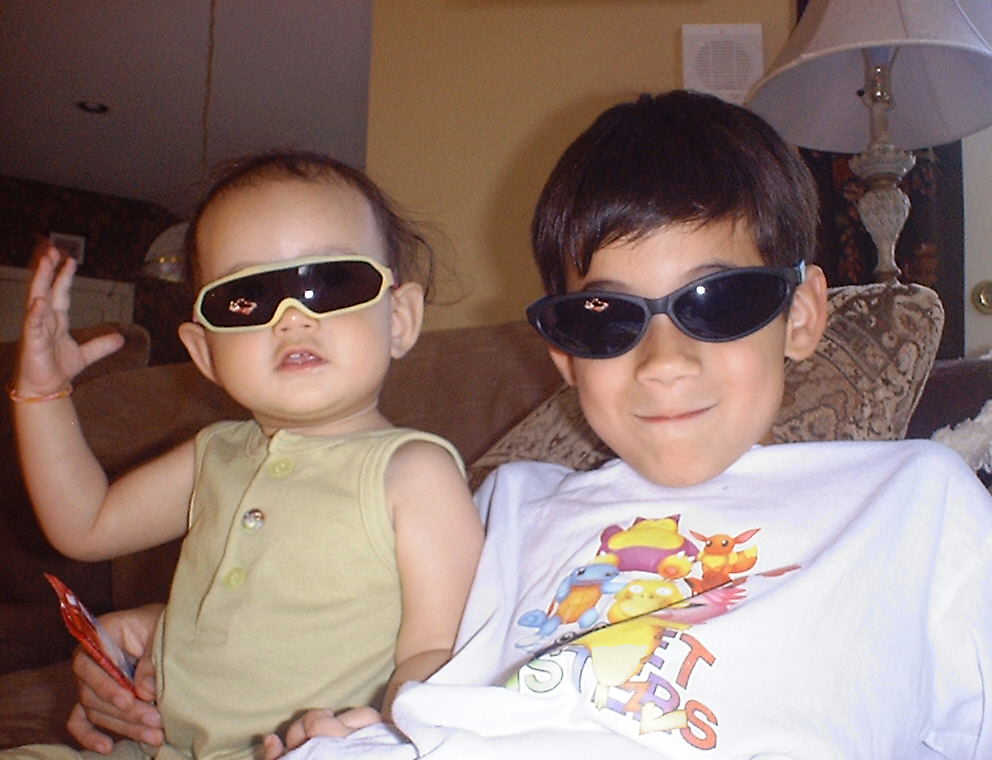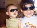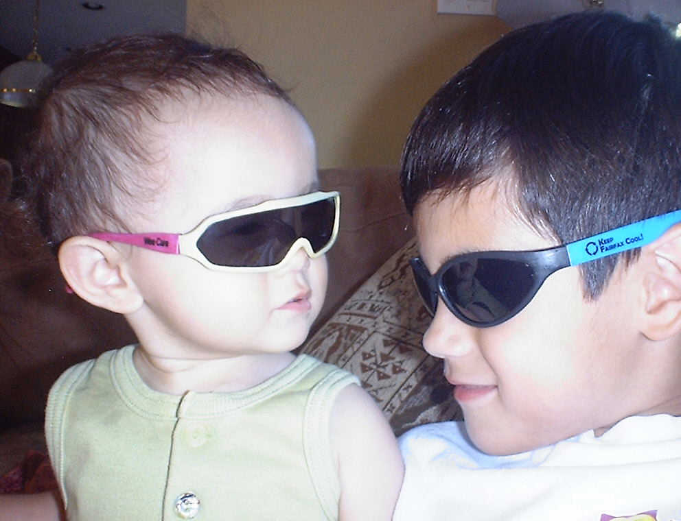 | Nadine at 10 and a half months (Oct 8, 2007), celebrating Columbus Day with her brother Nolan by trying on some cool shades to beat the heat. Both of you look like movie stars! Nadine, you look happy to have visitors; it that Aunt Tuke and Great Aunt Tai? |