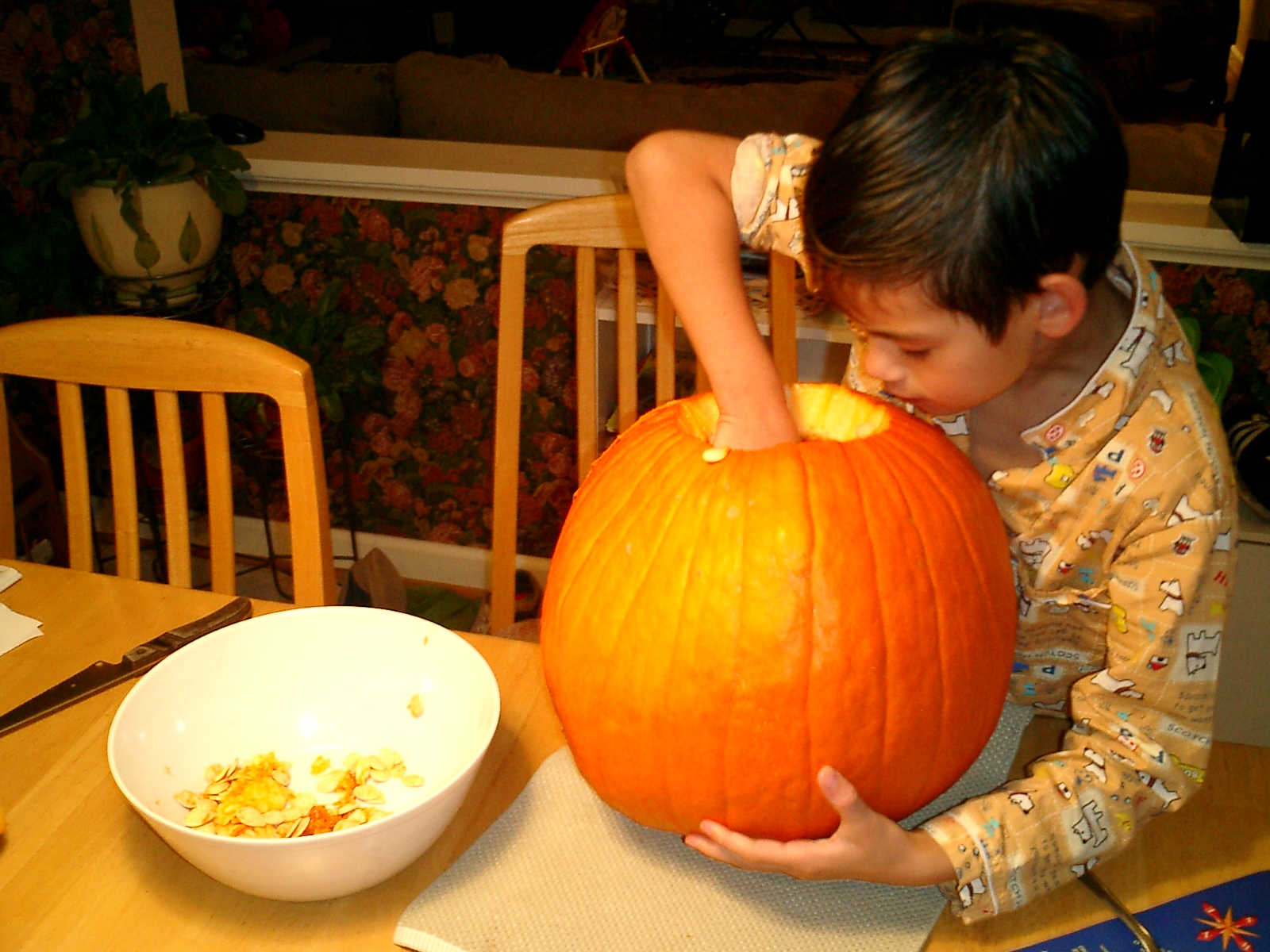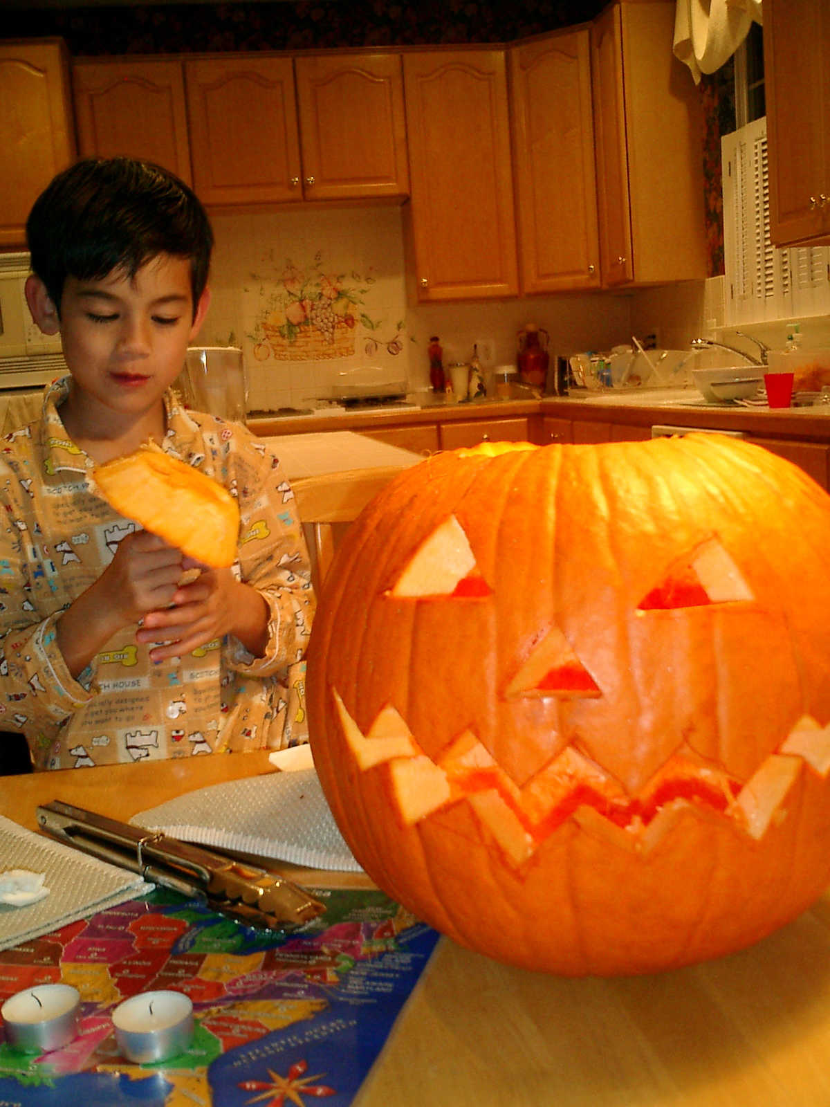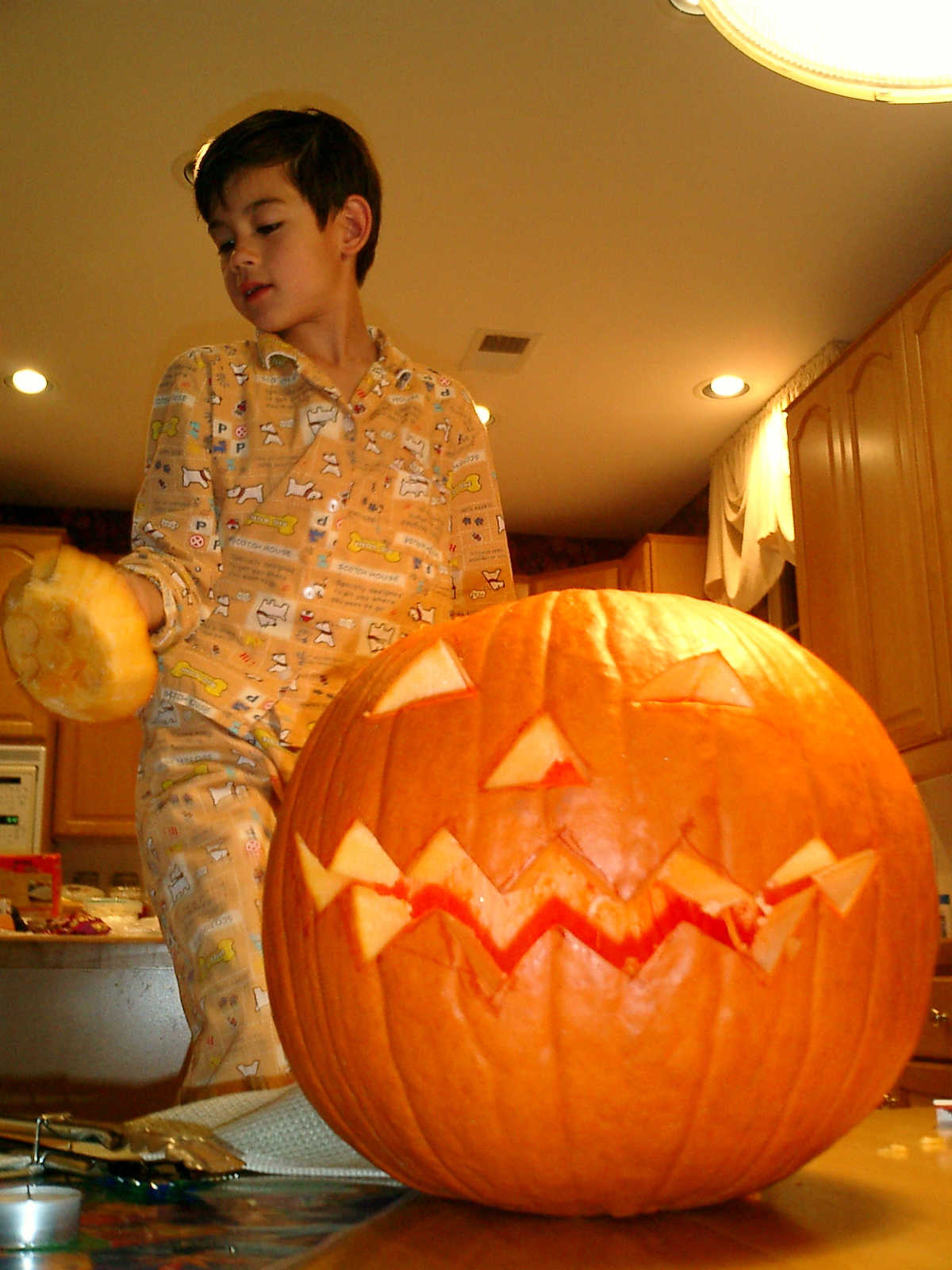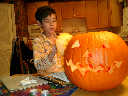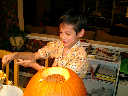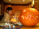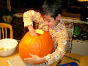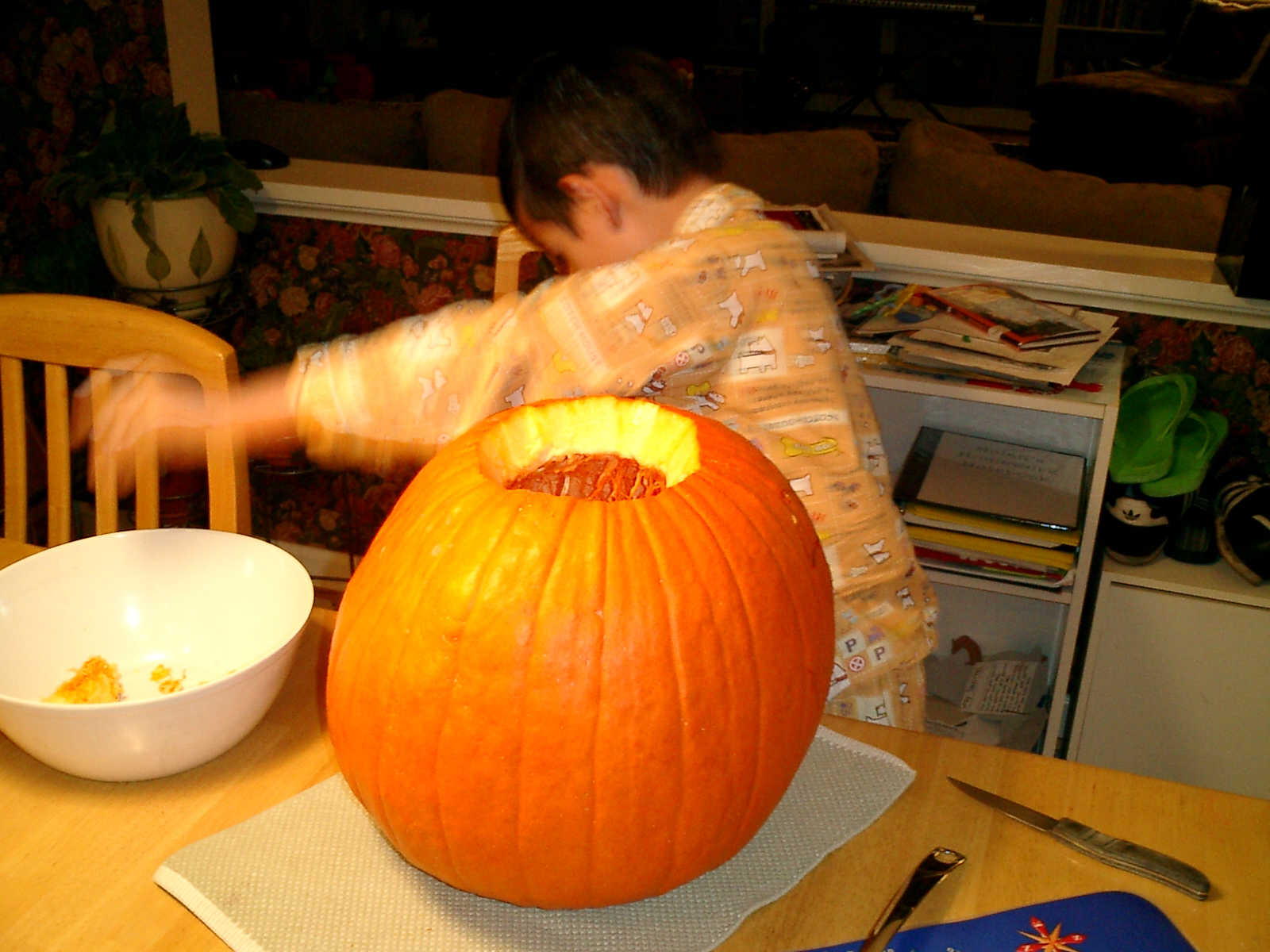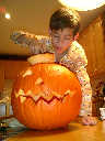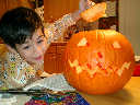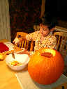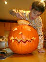 | Nadine at 11 months (Oct 29, 2007), watching Nolan carve the pumpkin for Halloween. Nadine, is that you crawling across the table, trying to get a better view? What a great big pumpkin we had this year, and just look at that scary Jack-o-Lantern face! |