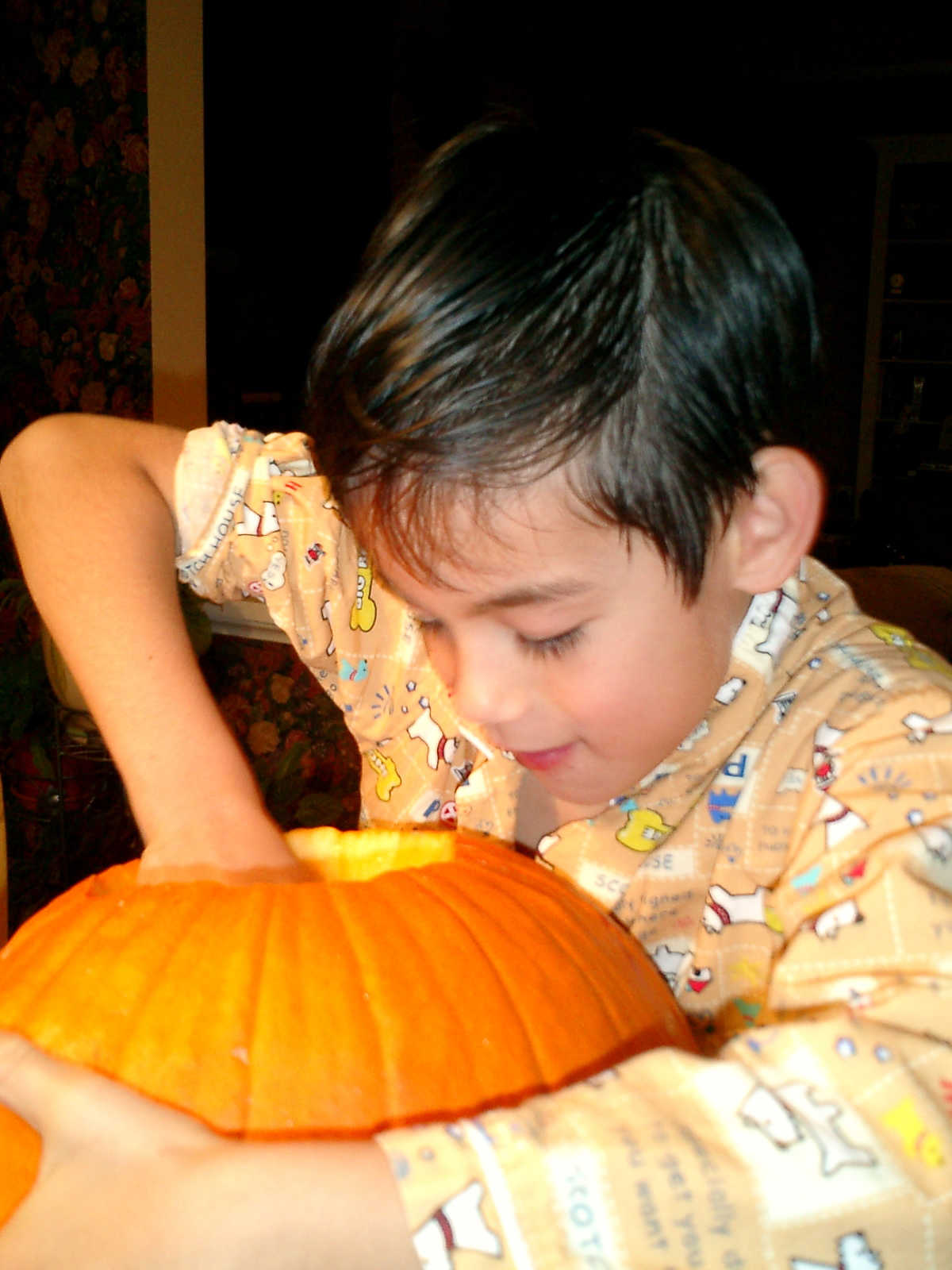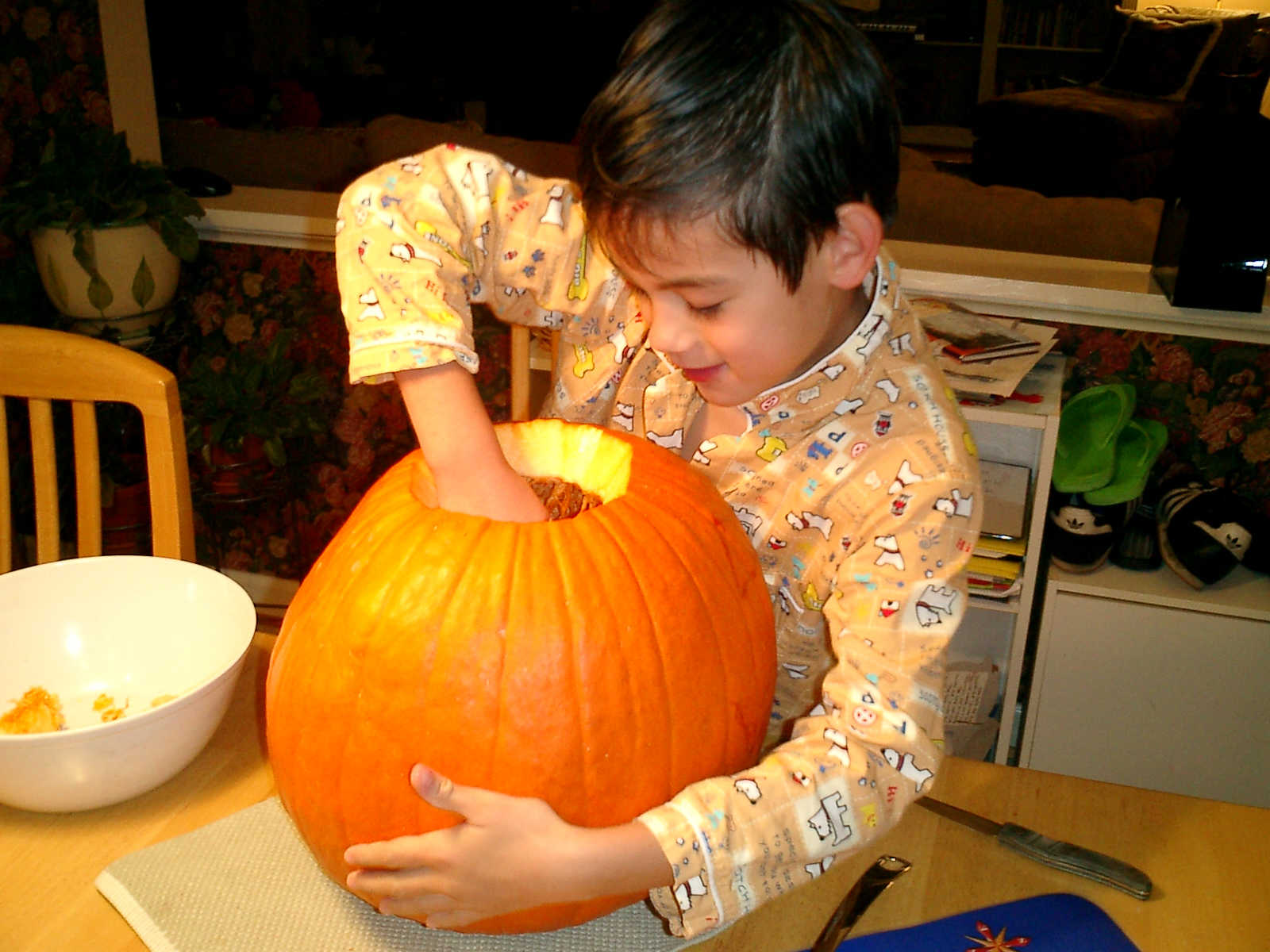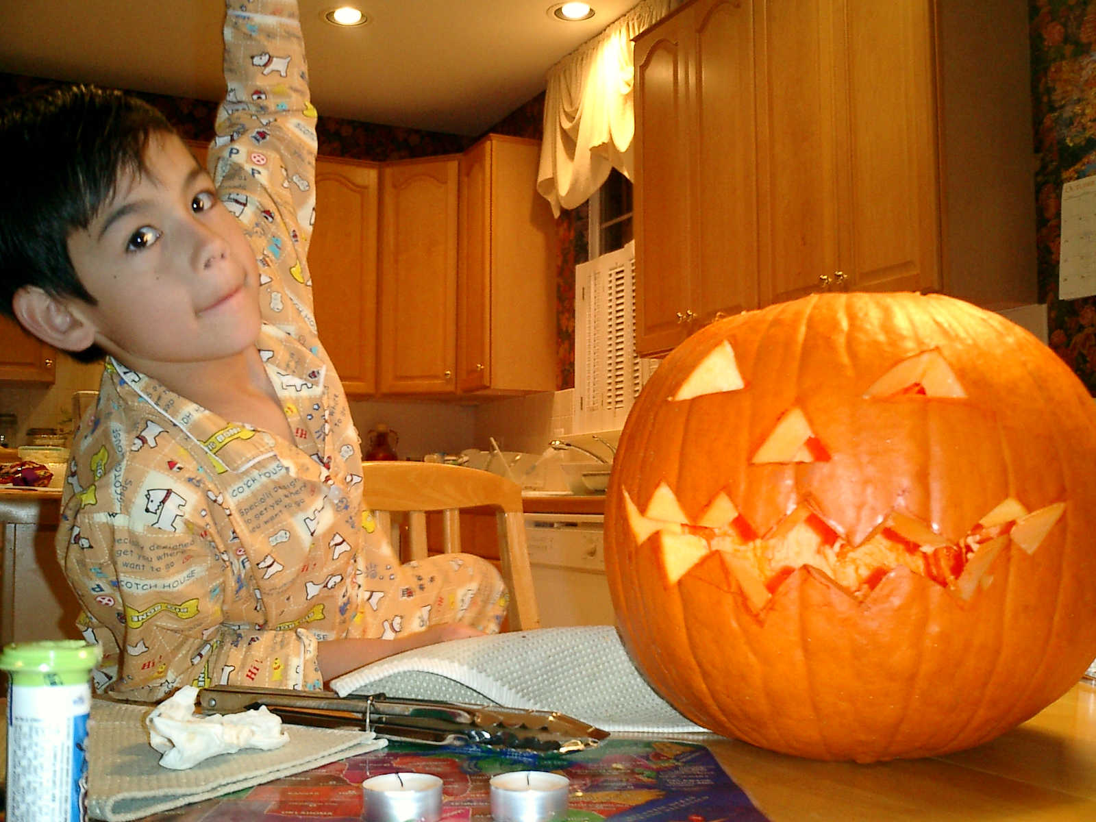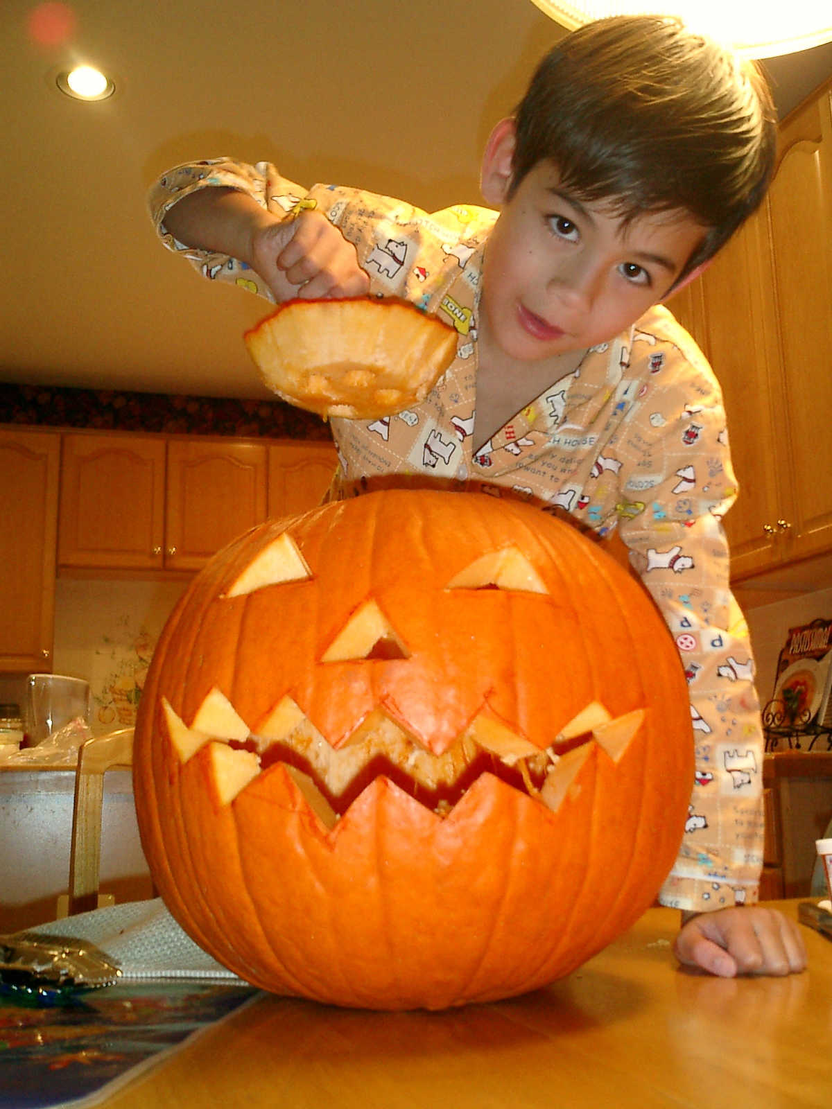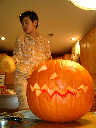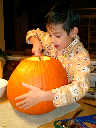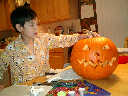 | Nadine at 11 months (Oct 29, 2007), watching Nolan carve the pumpkin for Halloween. Nadine, is that you crawling across the table, trying to get a better view? What a great big pumpkin we had this year, and just look at that scary Jack-o-Lantern face! |