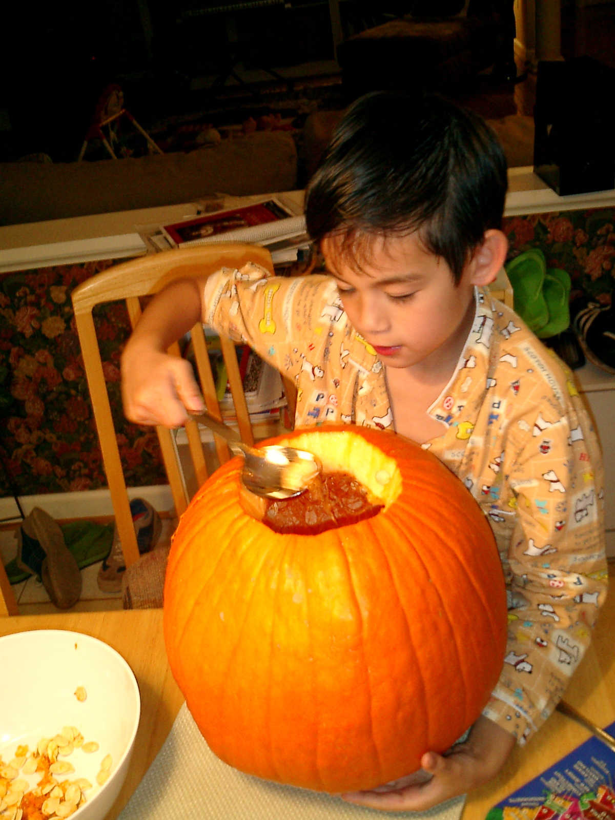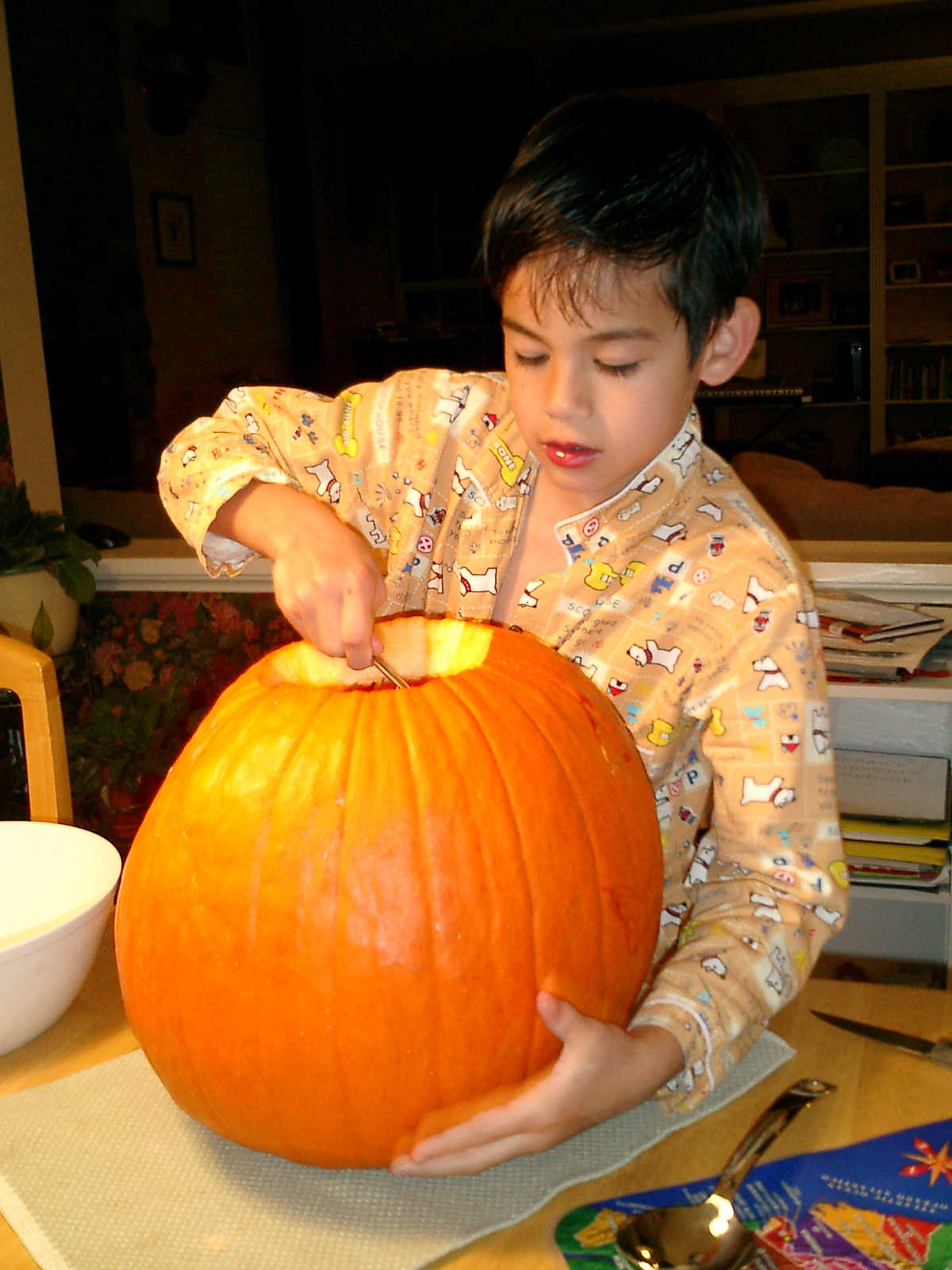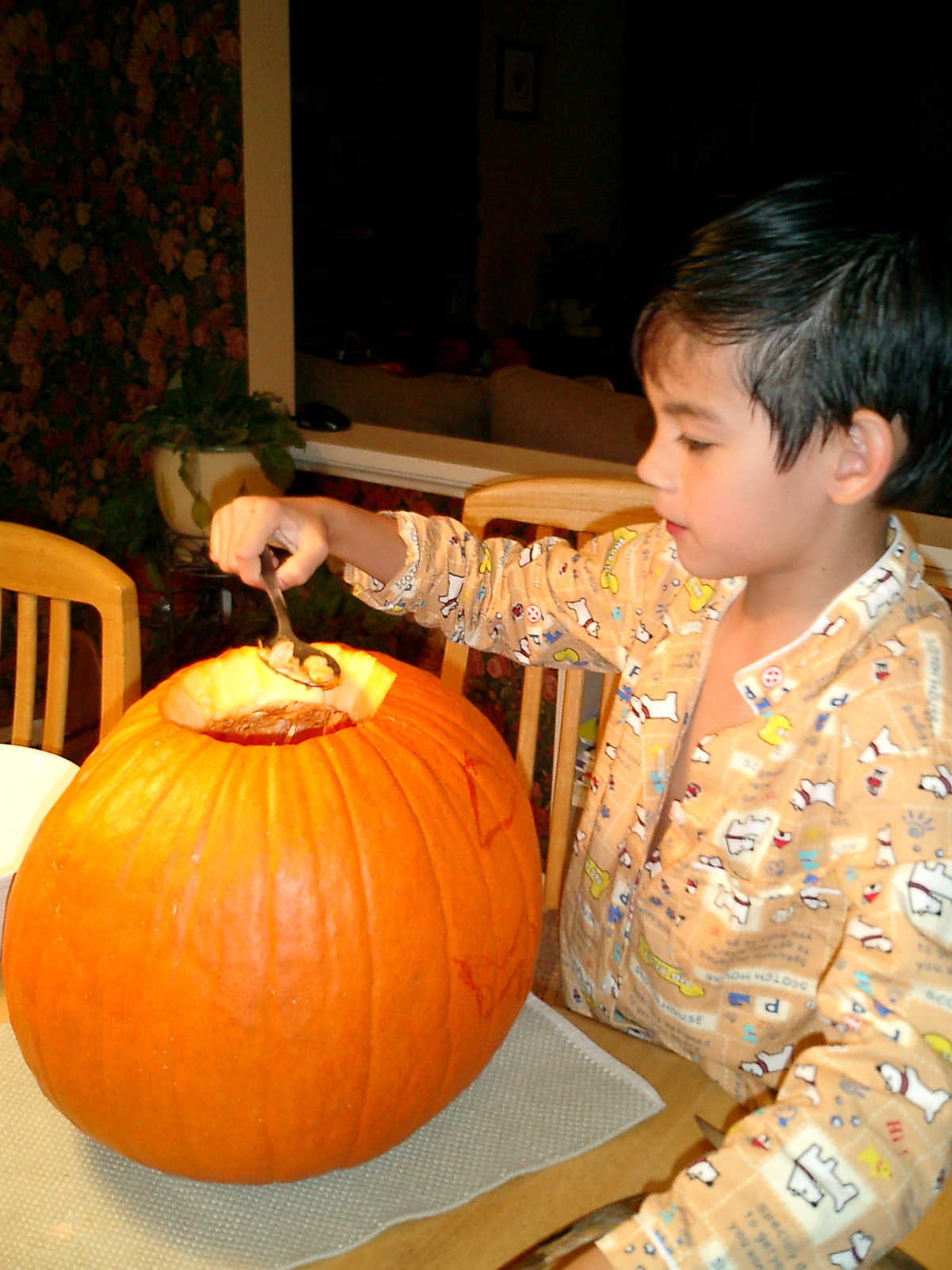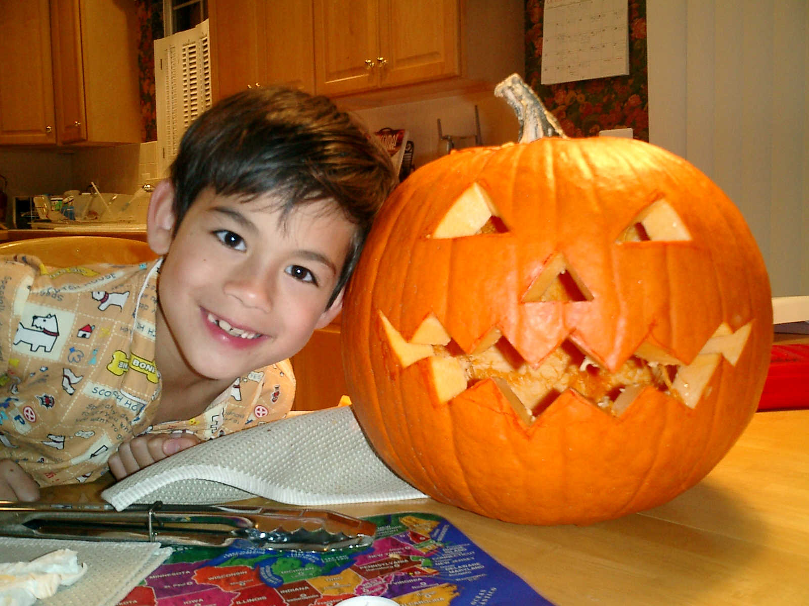| Nadine at 11 months (Oct 29, 2007), watching Nolan carve the pumpkin for Halloween. Nadine, is that you crawling across the table, trying to get a better view? What a great big pumpkin we had this year, and just look at that scary Jack-o-Lantern face! |