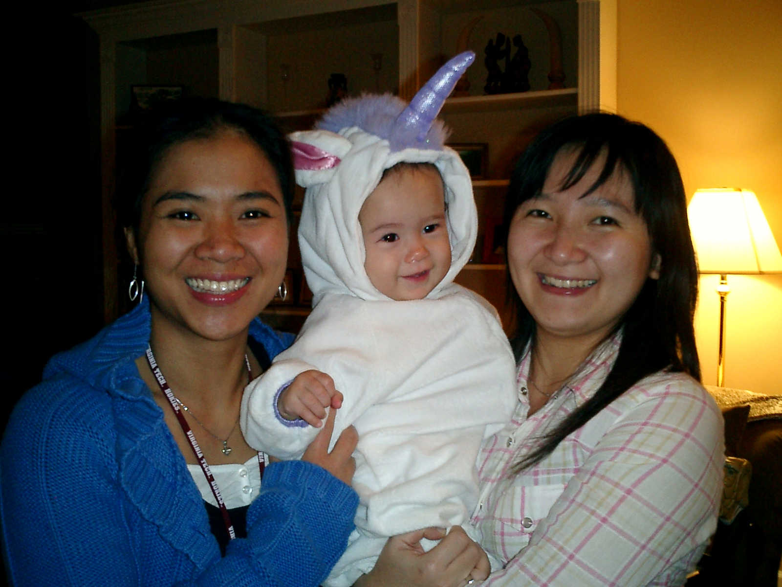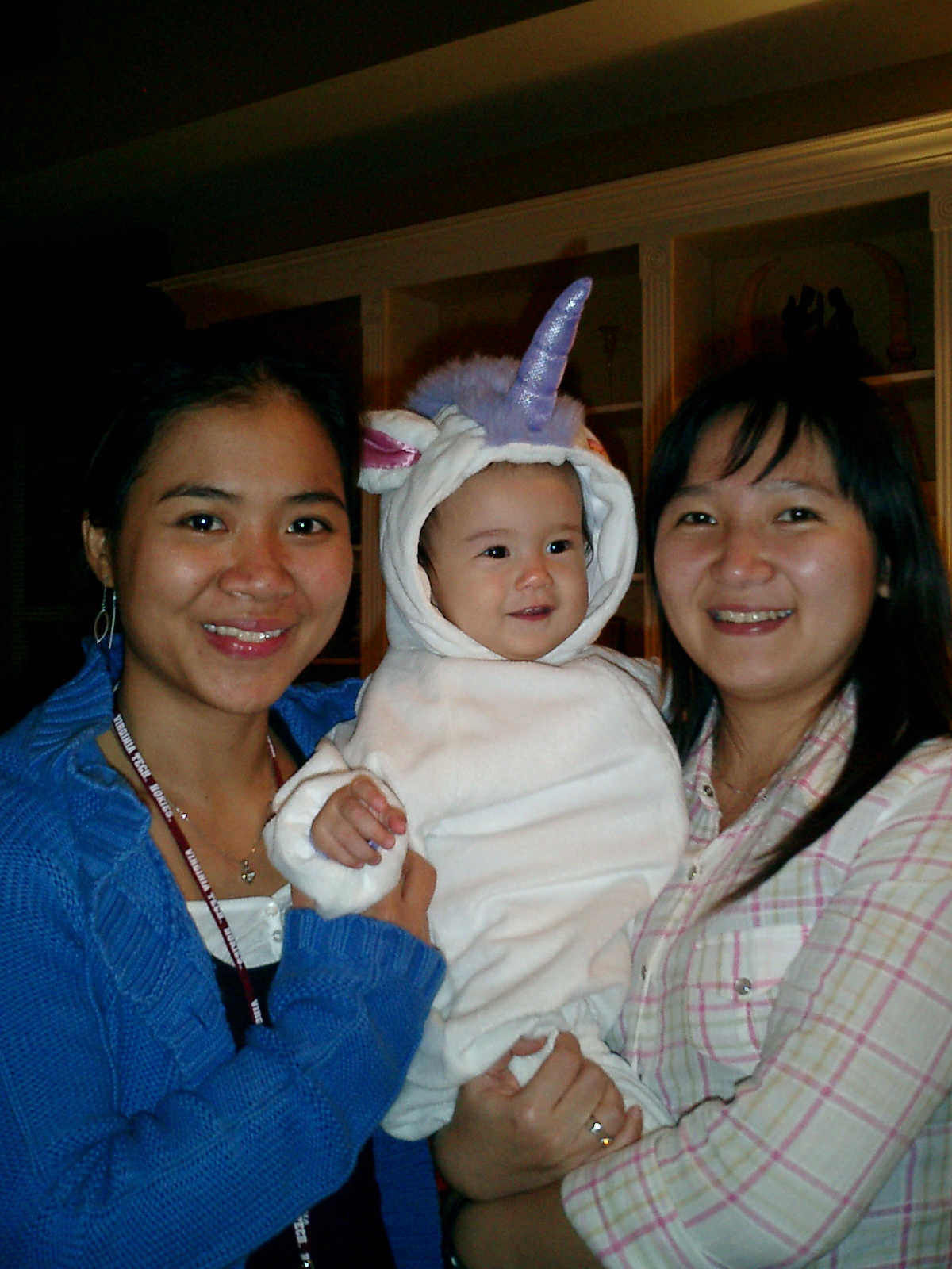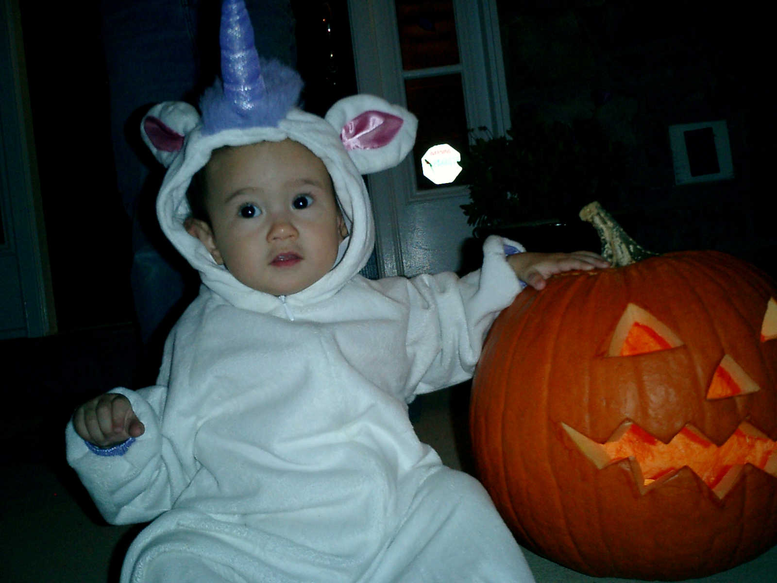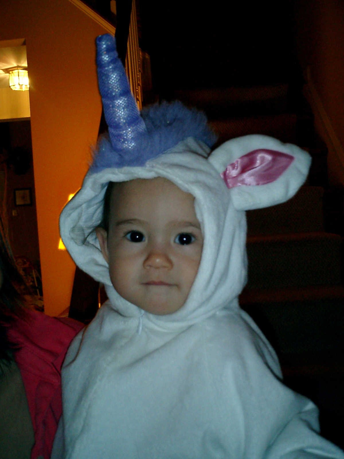 | Nadine at 11 months (Oct 31, 2007), dressed up like a unicorn on Halloween night. Although Nadine did not get to go out trick-or-treating this year, she was definitely in the Halloween spirit in her costume, greeting trick-or-treaters at our door, and encouraging a when he got tired from so much trick-or-treating. Nadine, is that Aunt Noy and Aunt Tuke holding you? Is that you checking on the pumpkin on the front steps? |