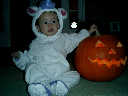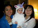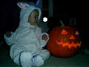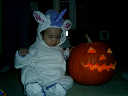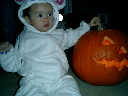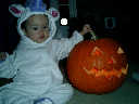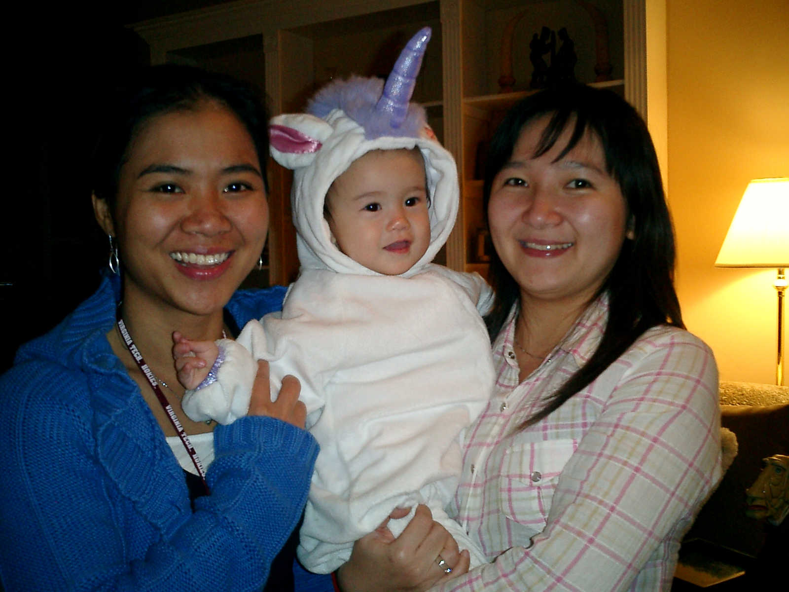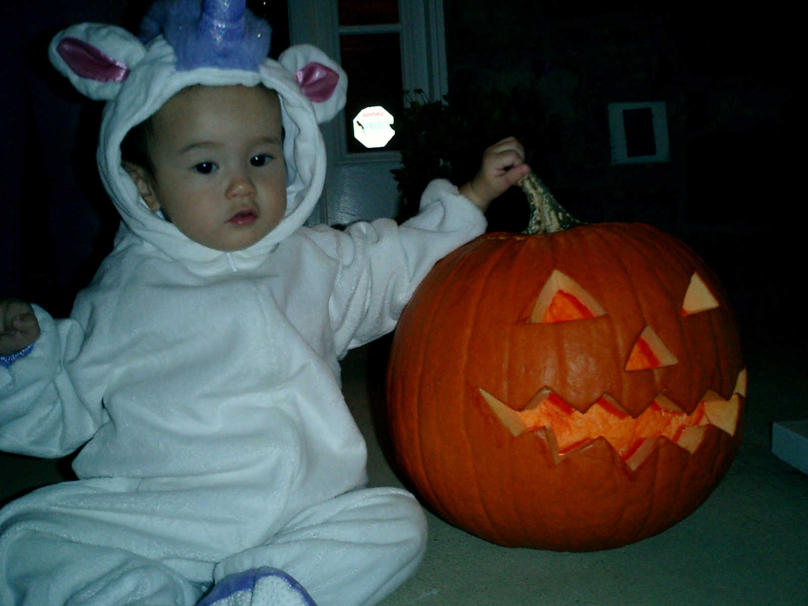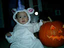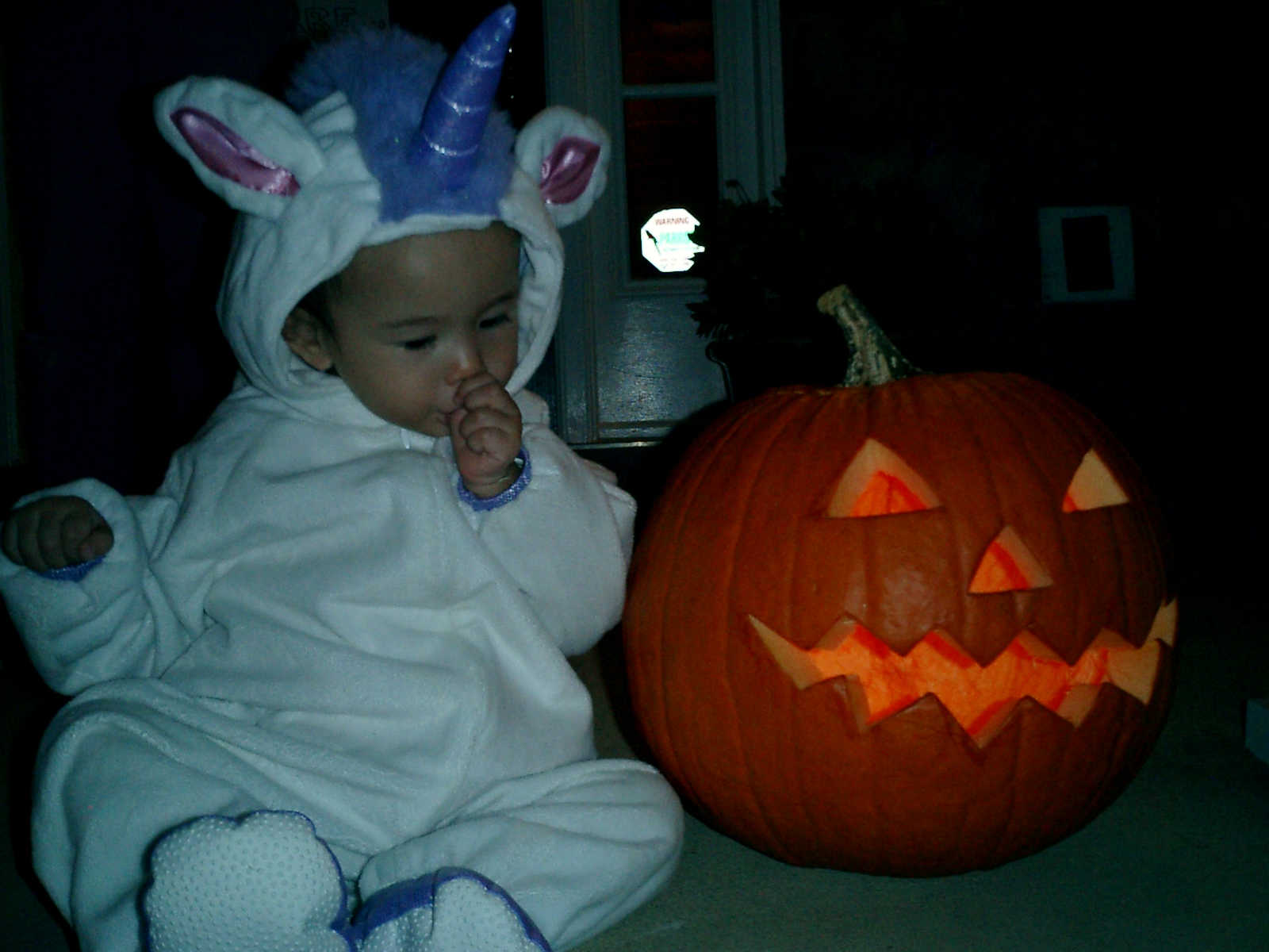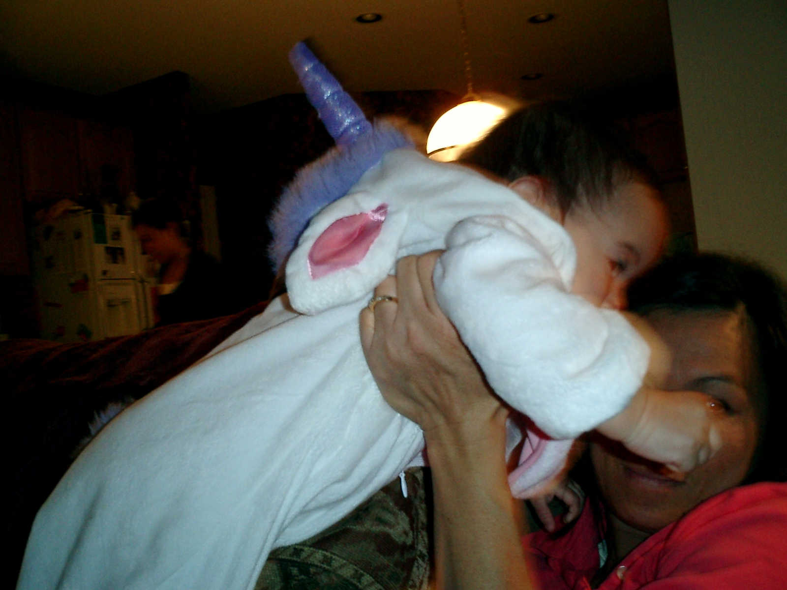 | Nadine at 11 months (Oct 31, 2007), dressed up like a unicorn on Halloween night. Although Nadine did not get to go out trick-or-treating this year, she was definitely in the Halloween spirit in her costume, greeting trick-or-treaters at our door, and encouraging a when he got tired from so much trick-or-treating. Nadine, is that Aunt Noy and Aunt Tuke holding you? Is that you checking on the pumpkin on the front steps? |