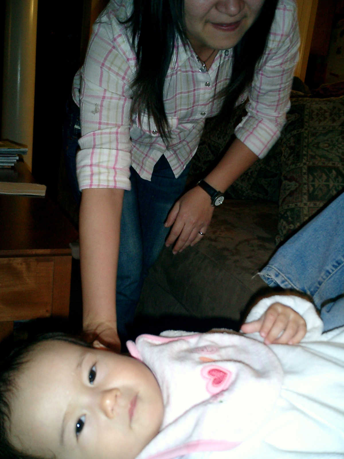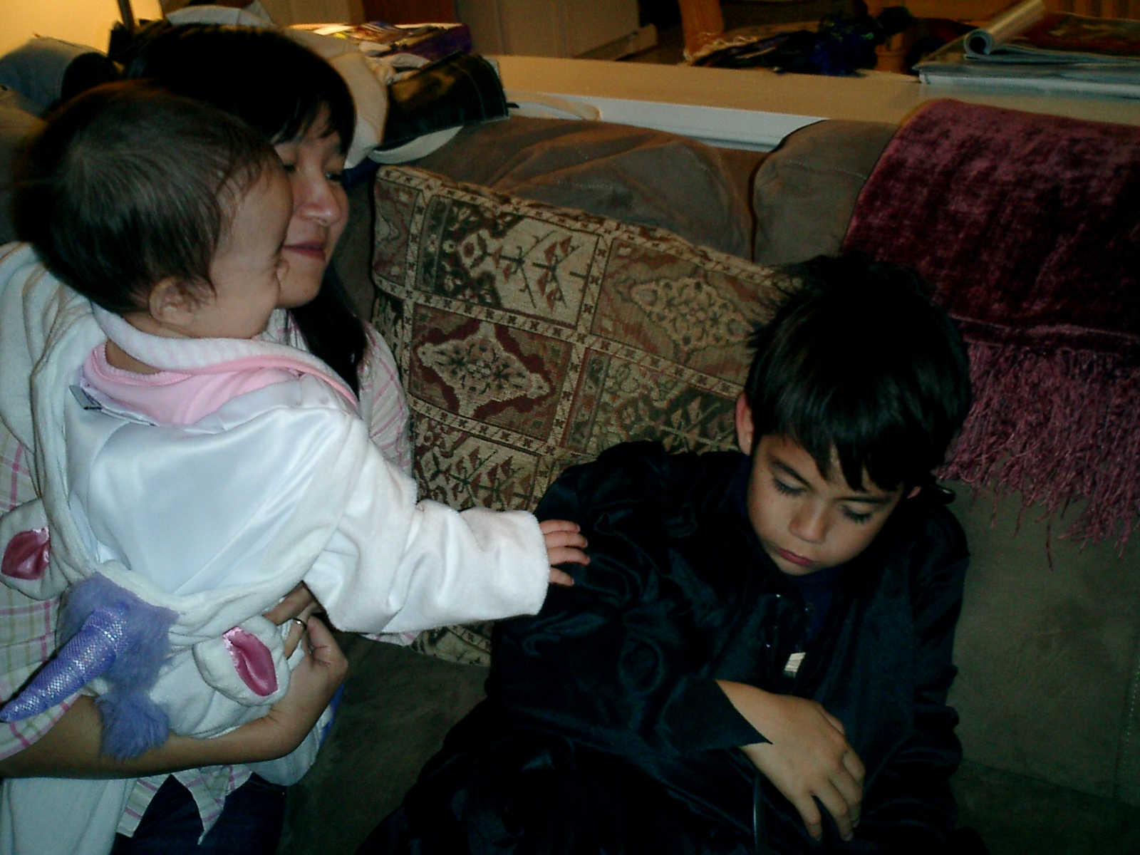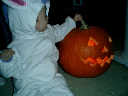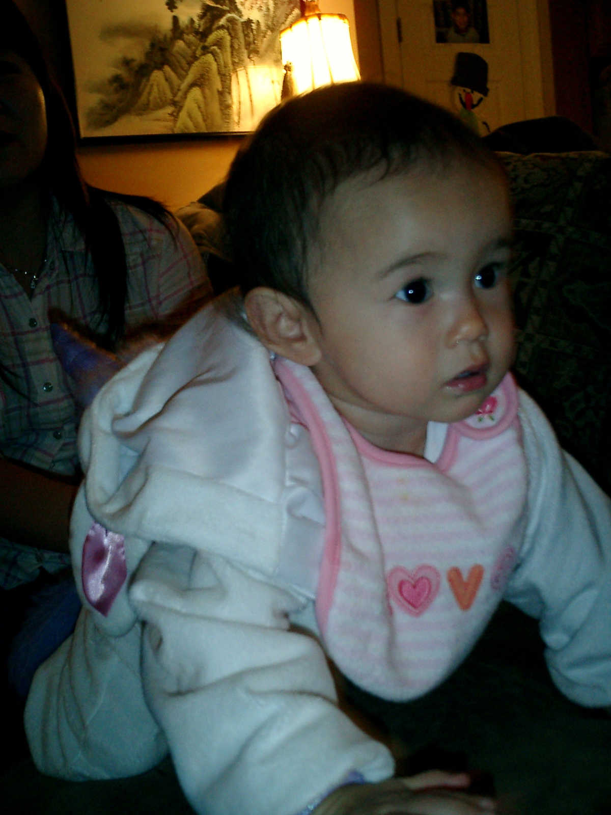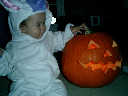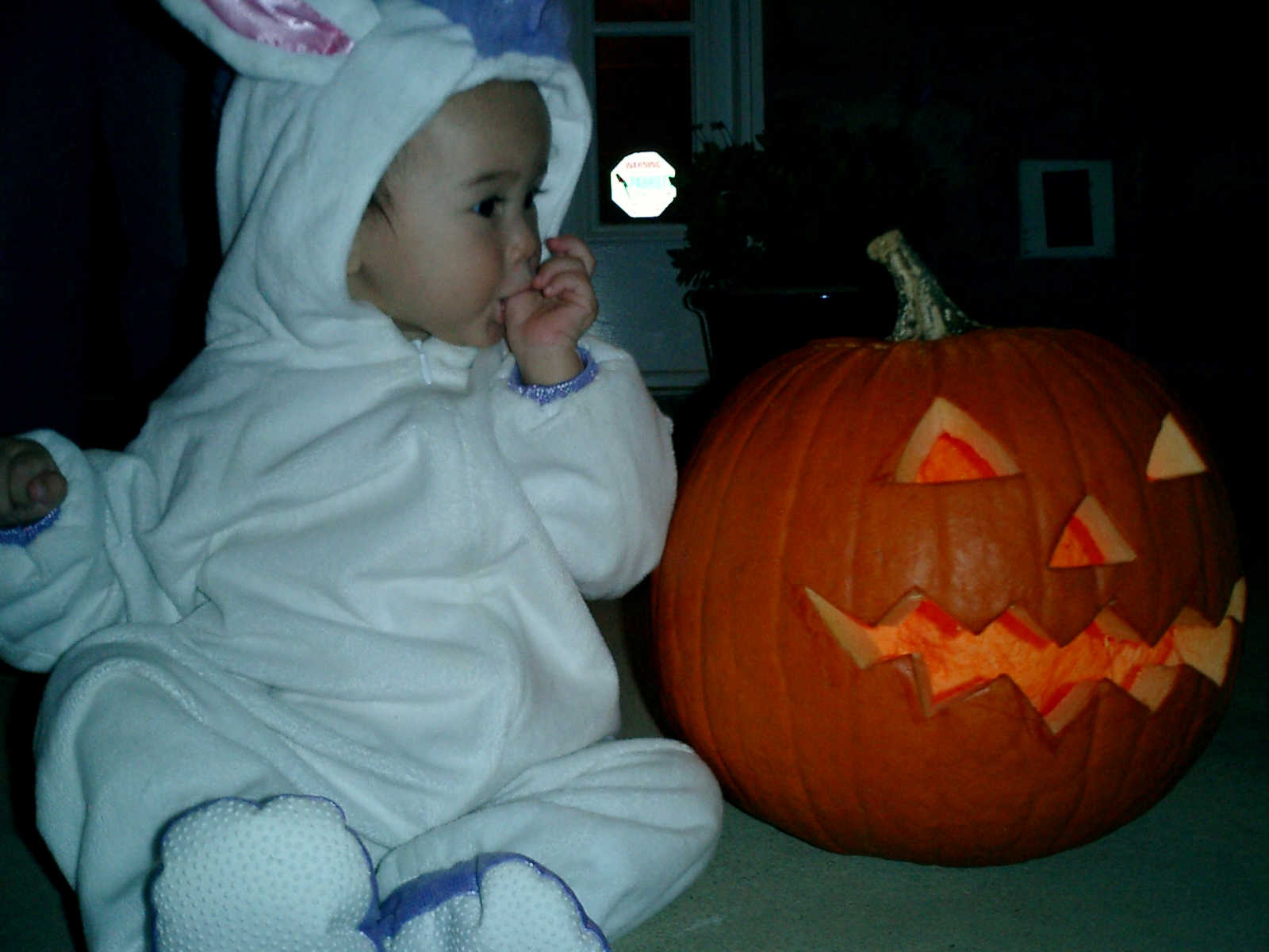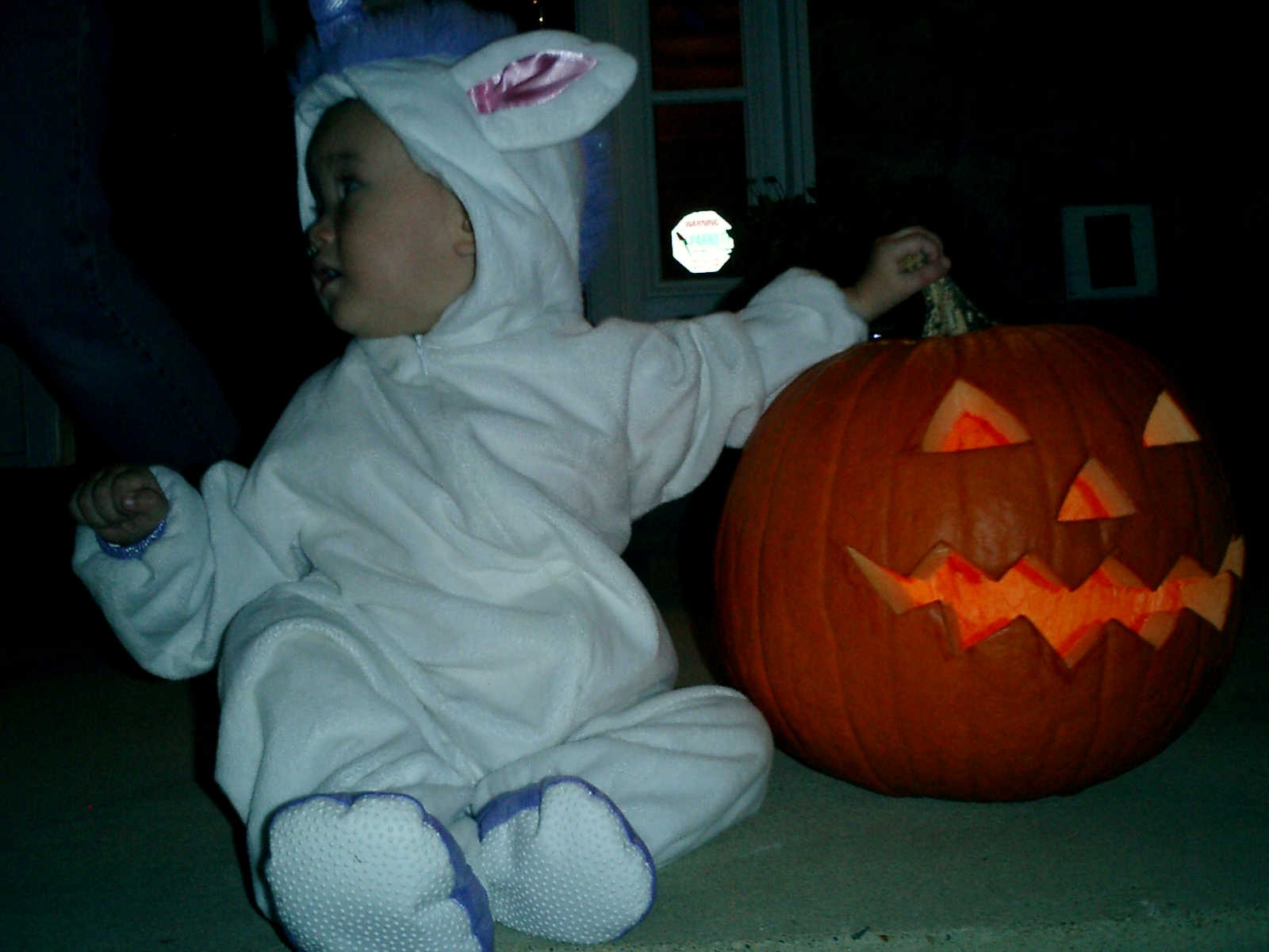 | Nadine at 11 months (Oct 31, 2007), dressed up like a unicorn on Halloween night. Although Nadine did not get to go out trick-or-treating this year, she was definitely in the Halloween spirit in her costume, greeting trick-or-treaters at our door, and encouraging a when he got tired from so much trick-or-treating. Nadine, is that Aunt Noy and Aunt Tuke holding you? Is that you checking on the pumpkin on the front steps? |