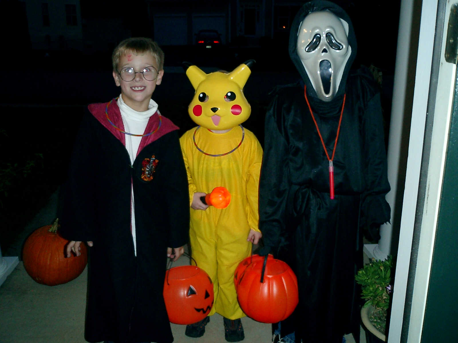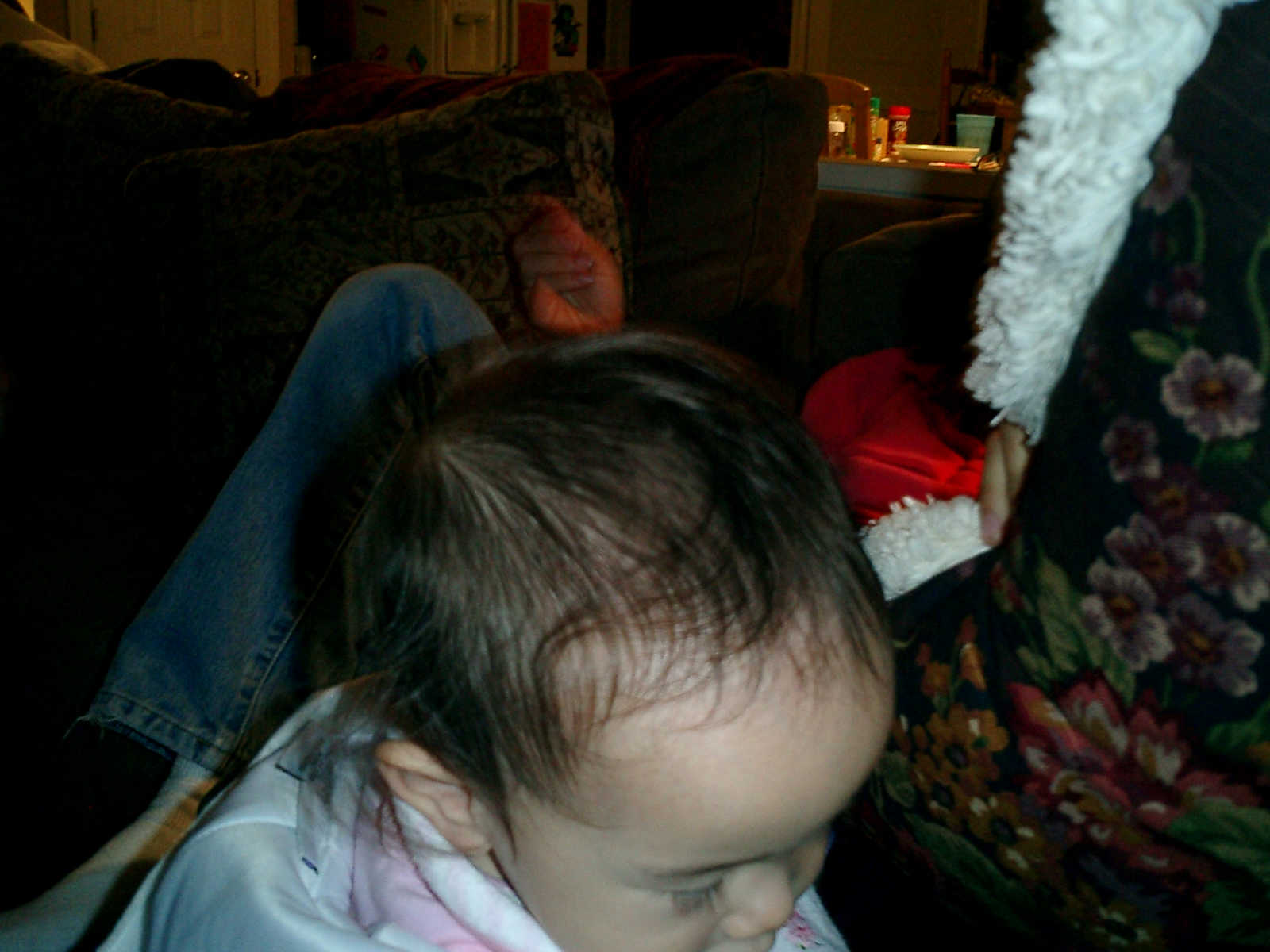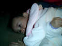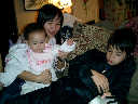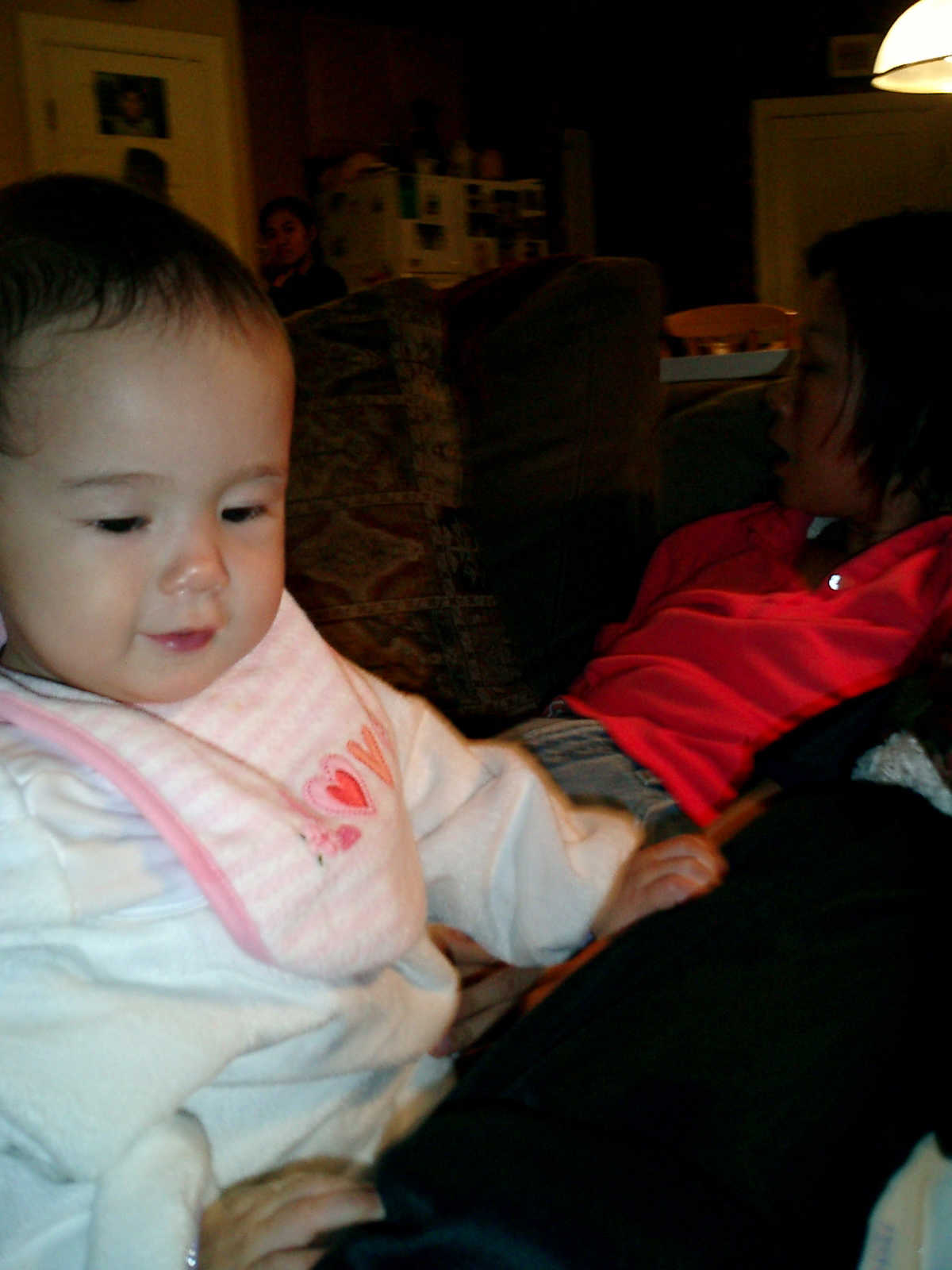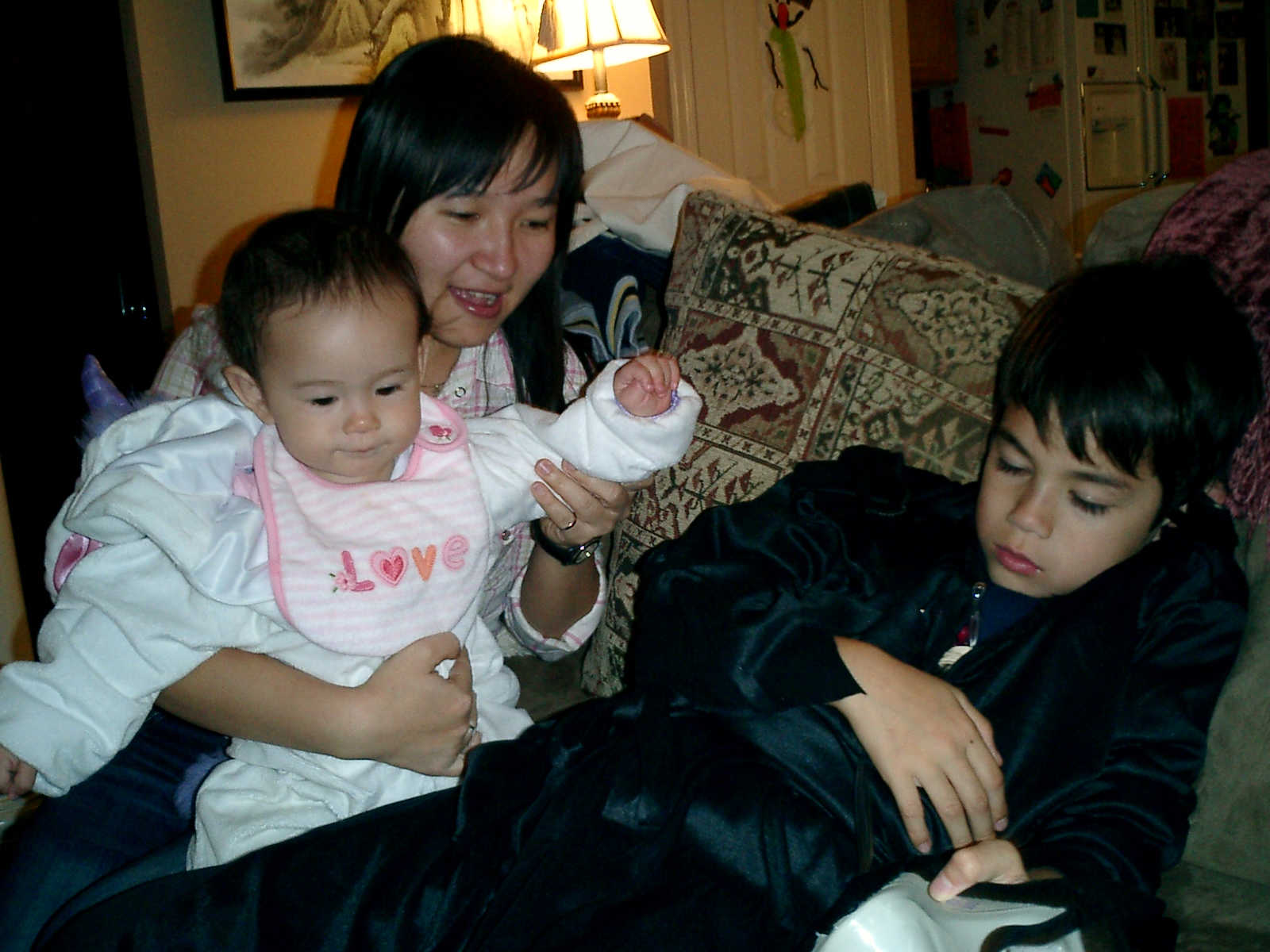 | Nadine at 11 months (Oct 31, 2007), dressed up like a unicorn on Halloween night. Although Nadine did not get to go out trick-or-treating this year, she was definitely in the Halloween spirit in her costume, greeting trick-or-treaters at our door, and encouraging a when he got tired from so much trick-or-treating. Nadine, is that Aunt Noy and Aunt Tuke holding you? Is that you checking on the pumpkin on the front steps? |