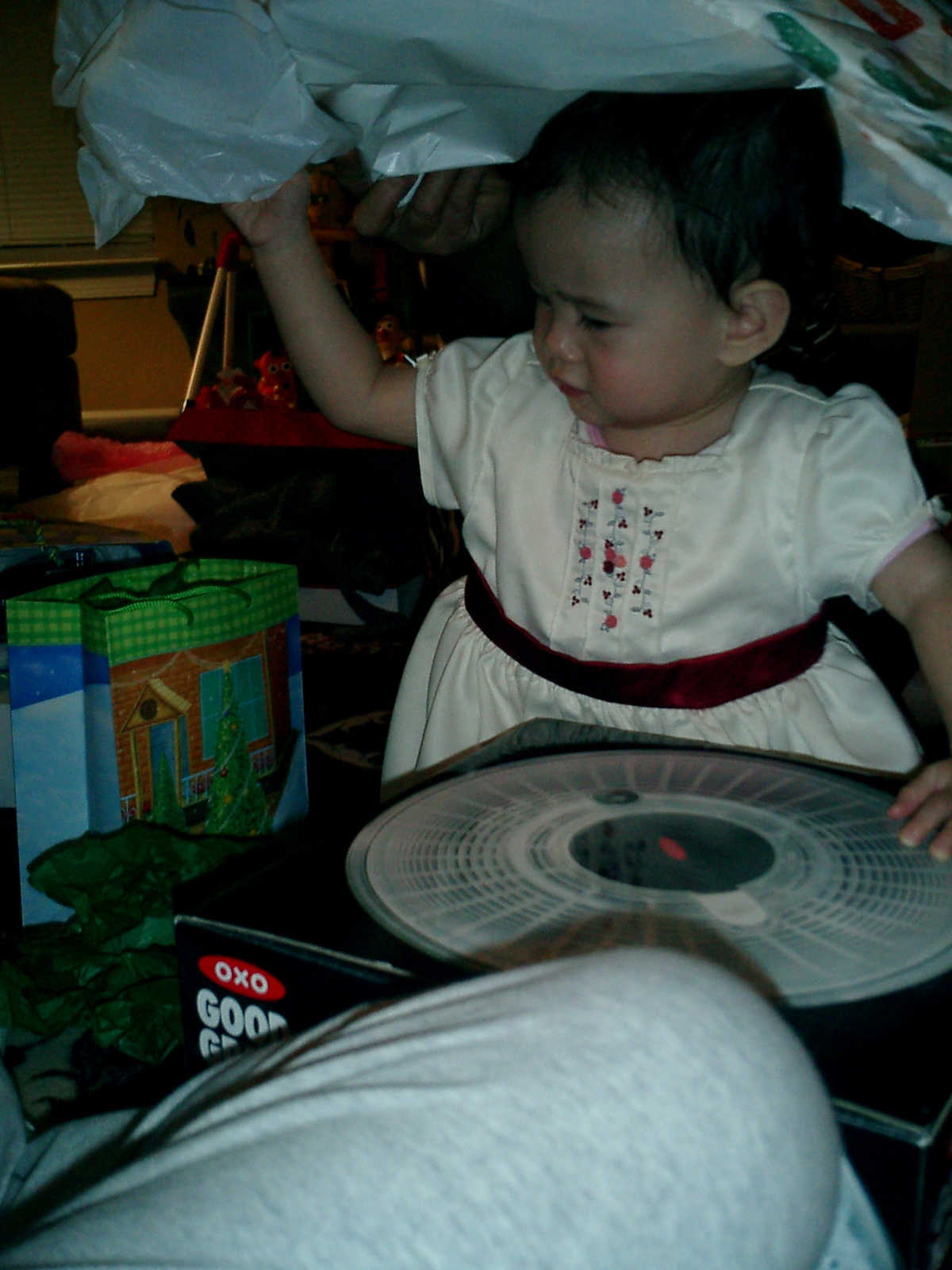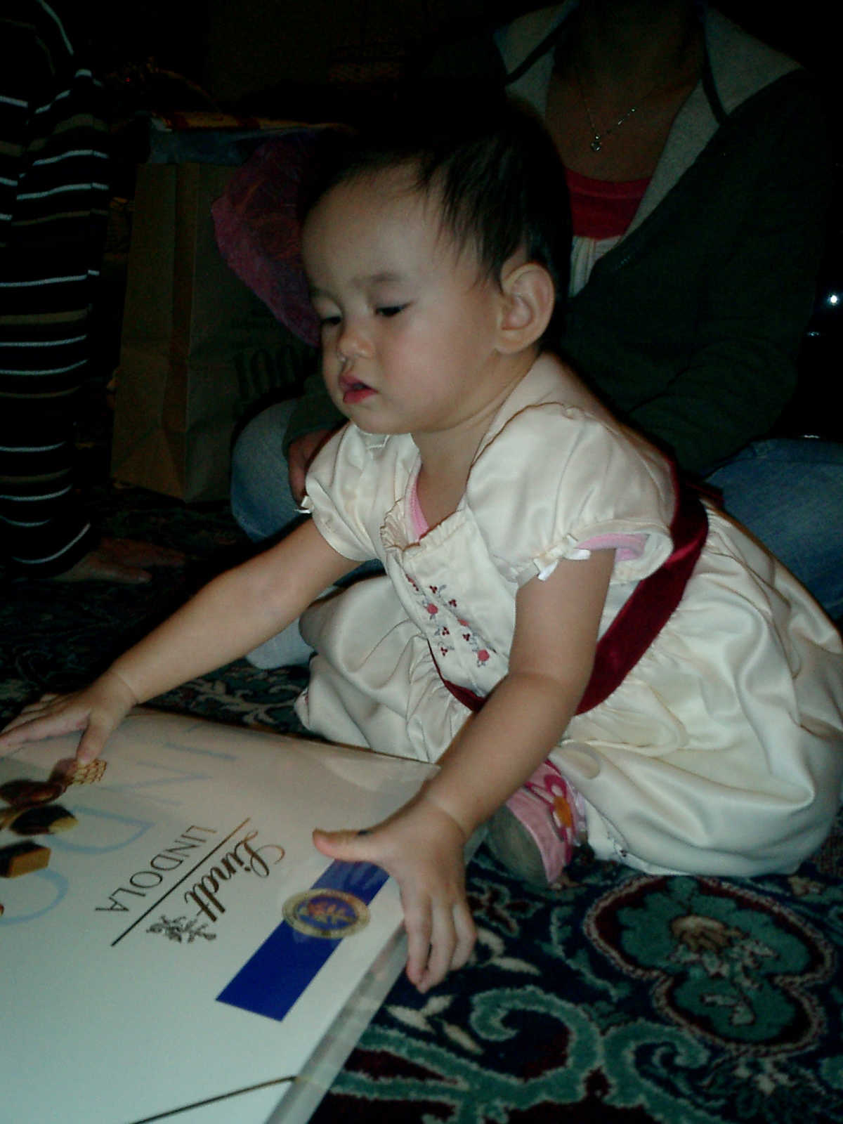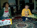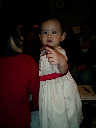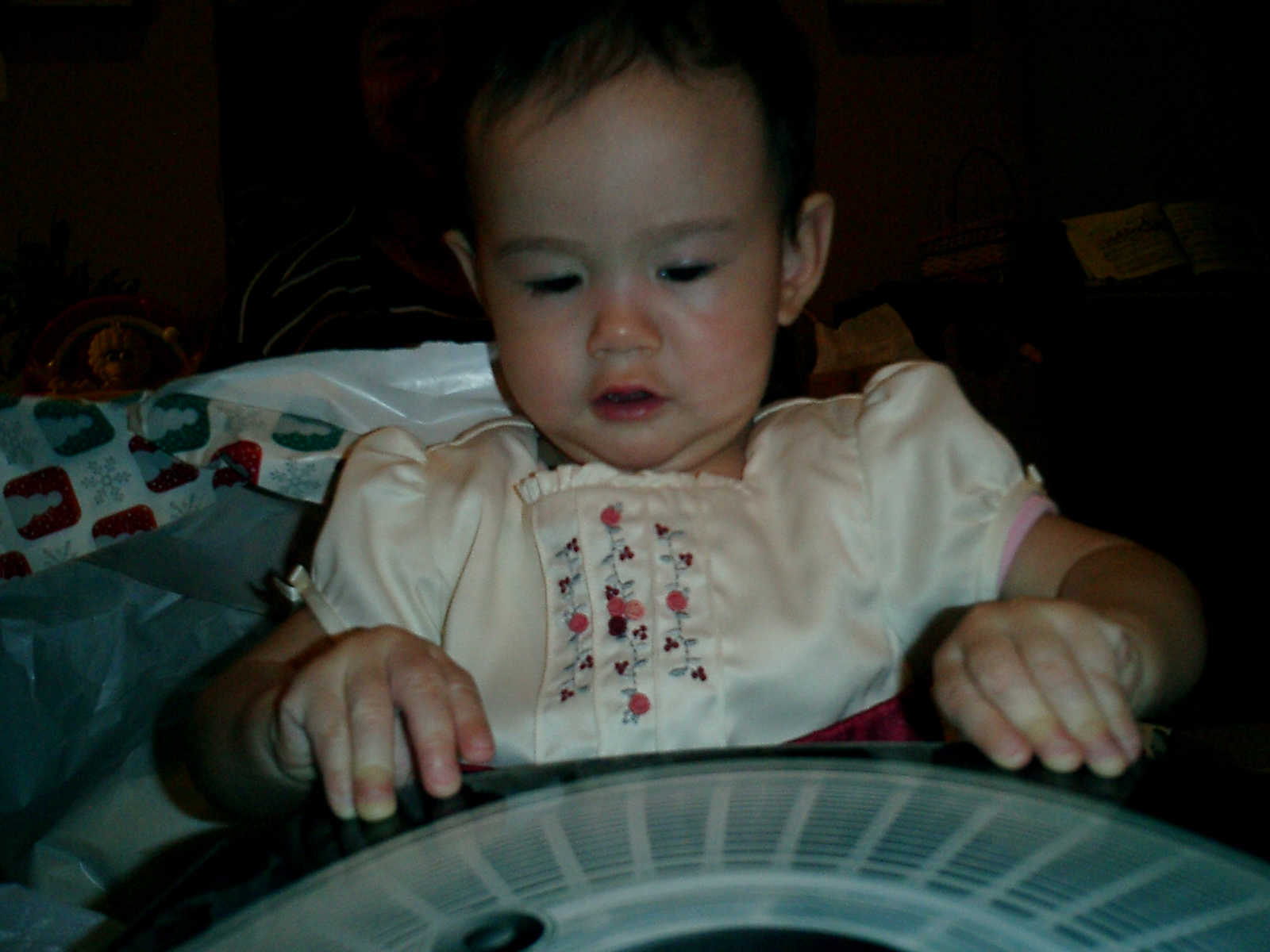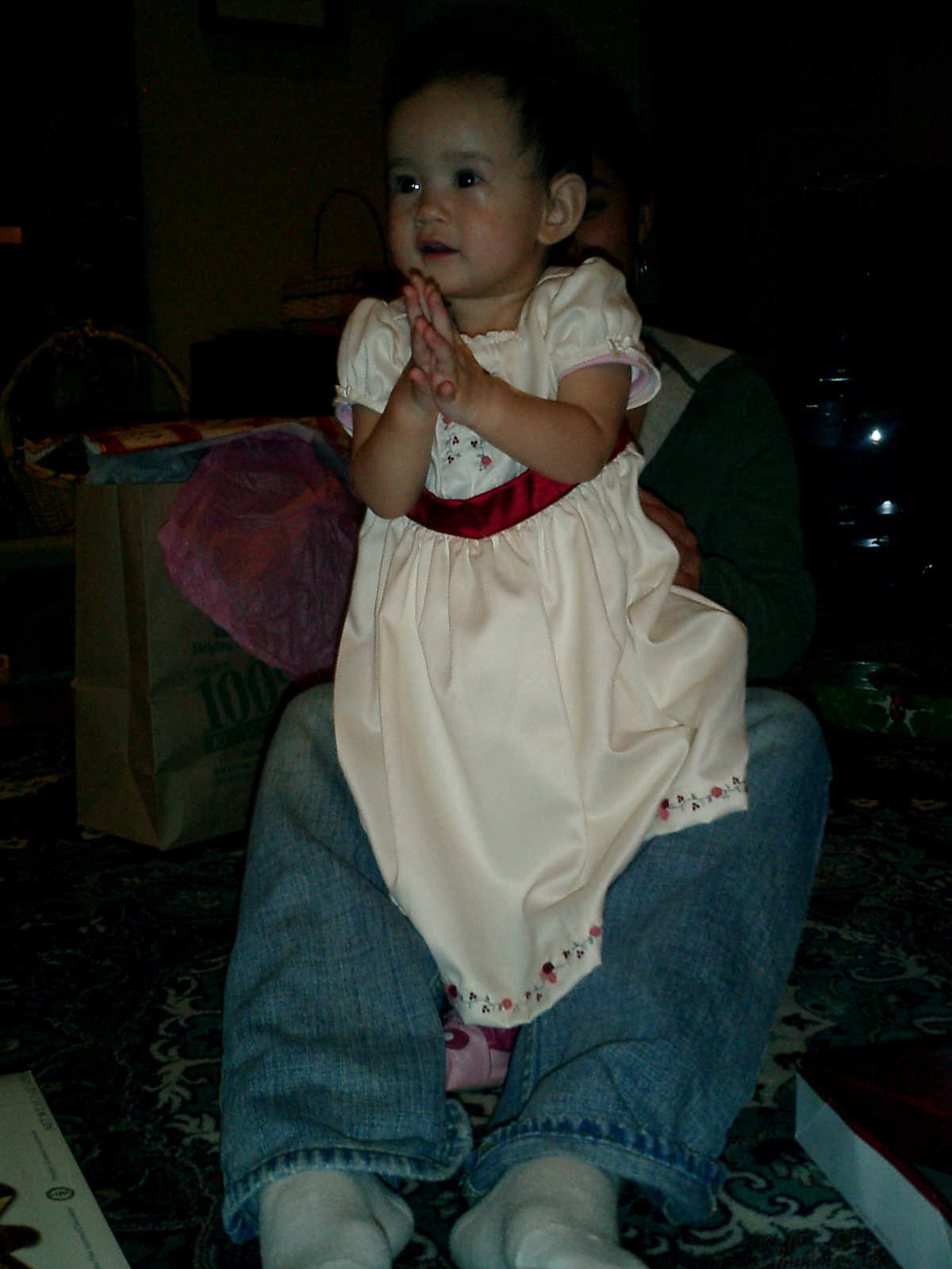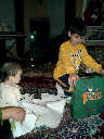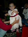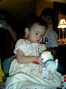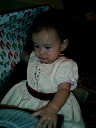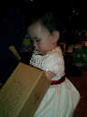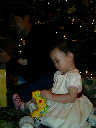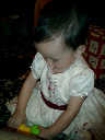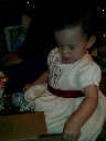 | Nadine at 13 months (Dec 23, 2007), opening a couple of her Christmas present a day or so early, just to help get in the Christmas spirit! And, wishing Aunt Noy a very Happy Birthday -- her brithday falls on December 27th. Nadine, we see you dressed up for the party -- you look beautiful! |