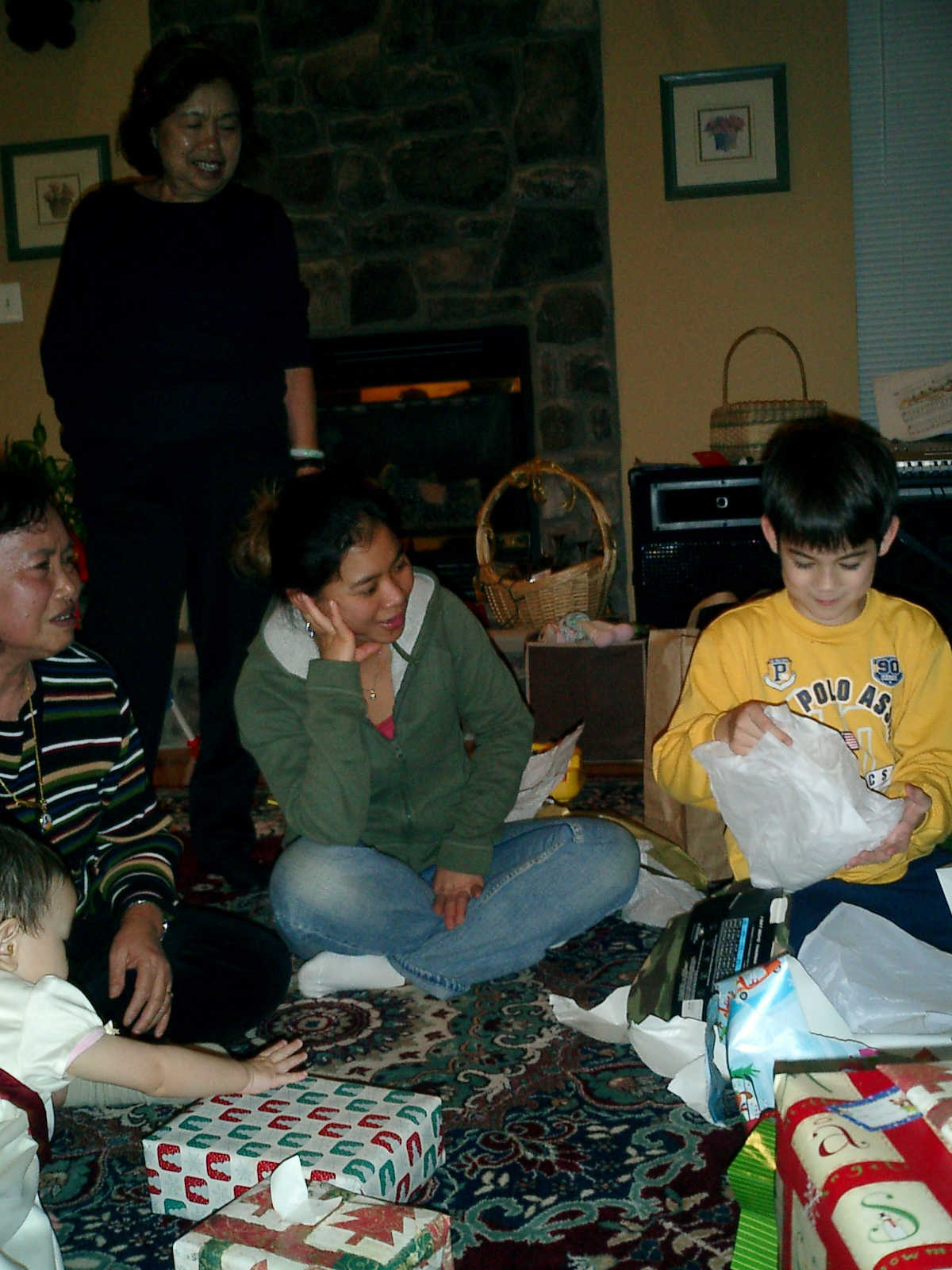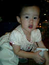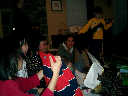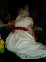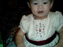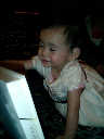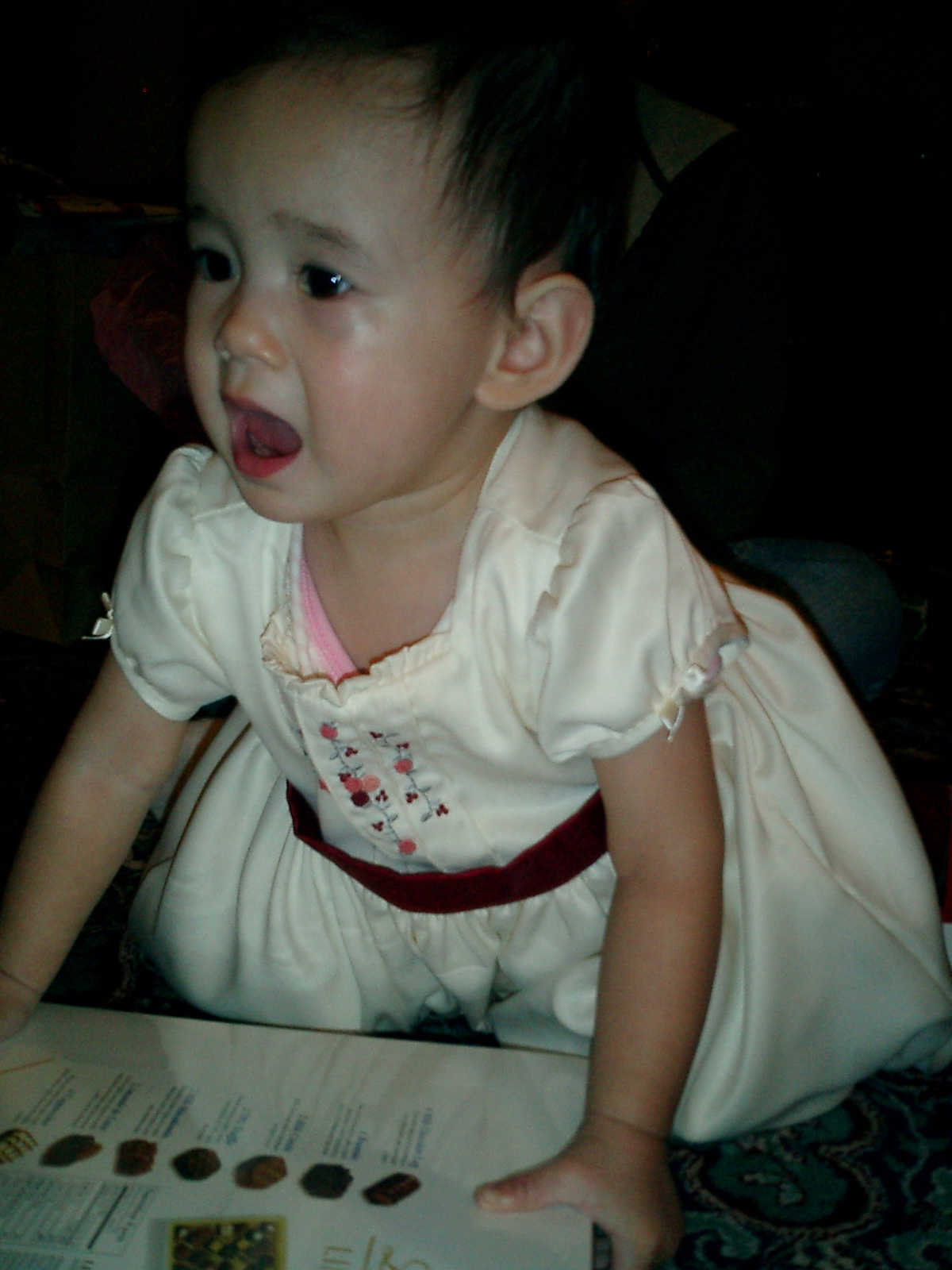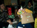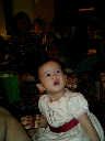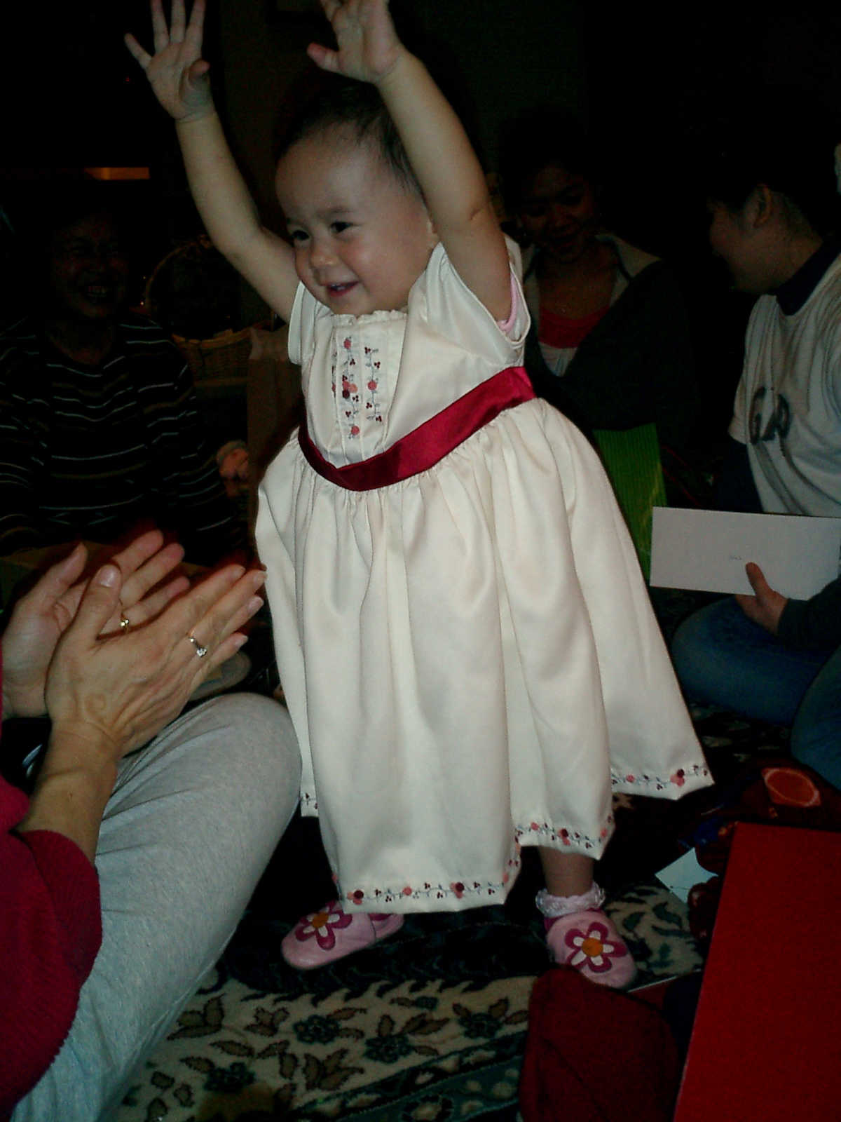 | Nadine at 13 months (Dec 23, 2007), opening a couple of her Christmas present a day or so early, just to help get in the Christmas spirit! And, wishing Aunt Noy a very Happy Birthday -- her brithday falls on December 27th. Nadine, we see you dressed up for the party -- you look beautiful! |