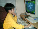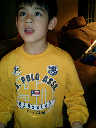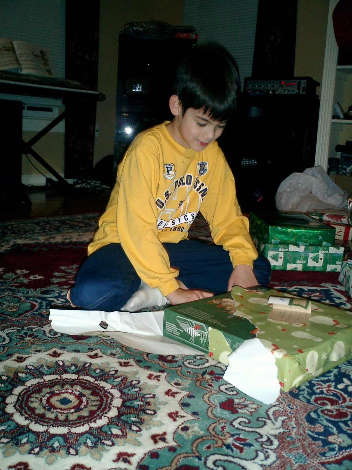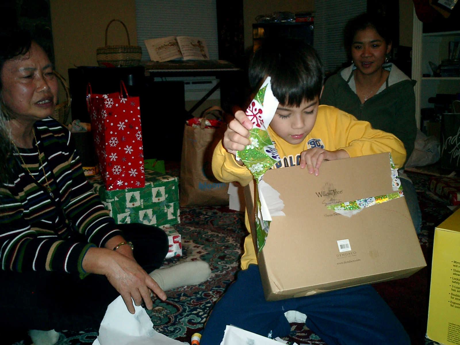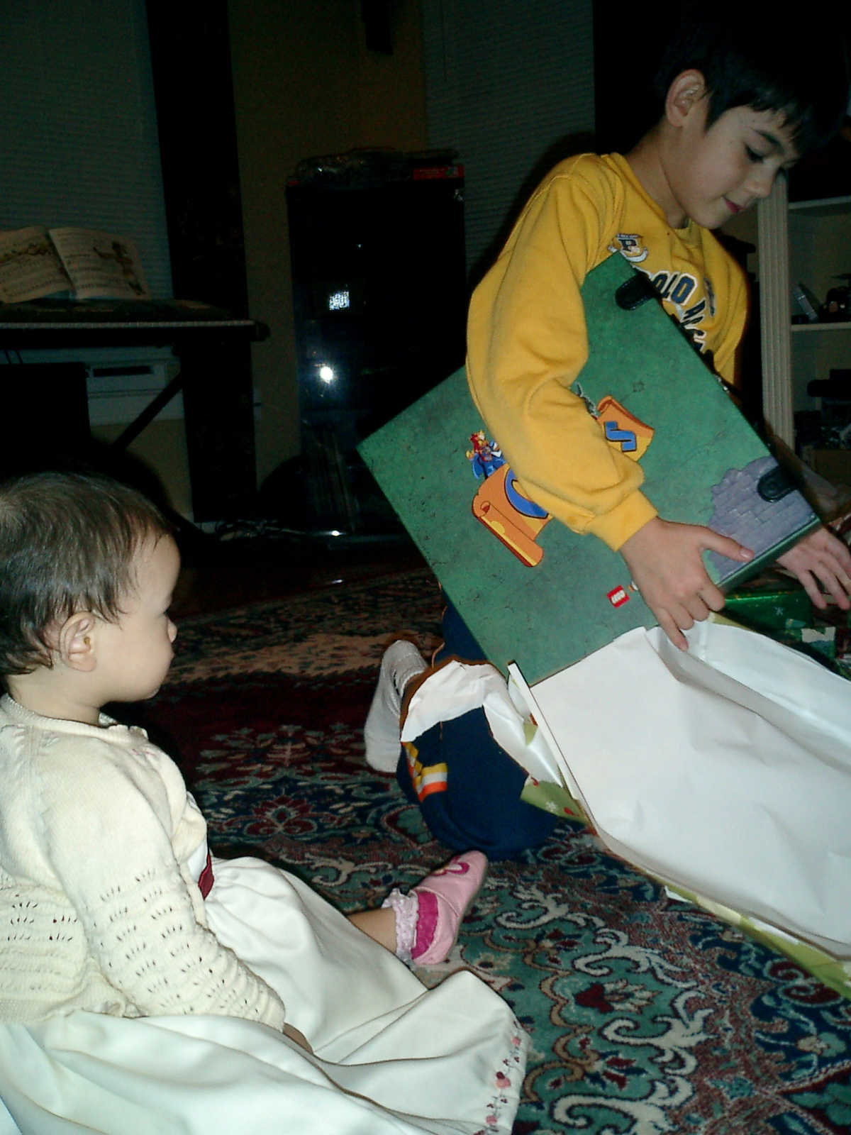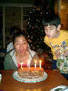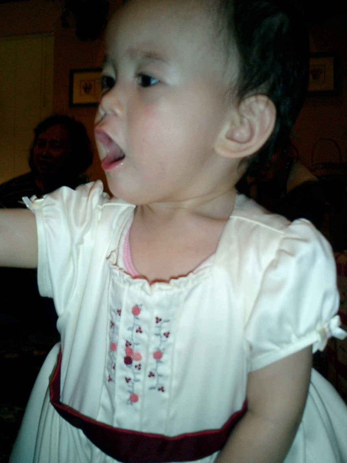 | Nadine at 13 months (Dec 23, 2007), opening a couple of her Christmas present a day or so early, just to help get in the Christmas spirit! And, wishing Aunt Noy a very Happy Birthday -- her brithday falls on December 27th. Nadine, we see you dressed up for the party -- you look beautiful! |