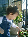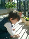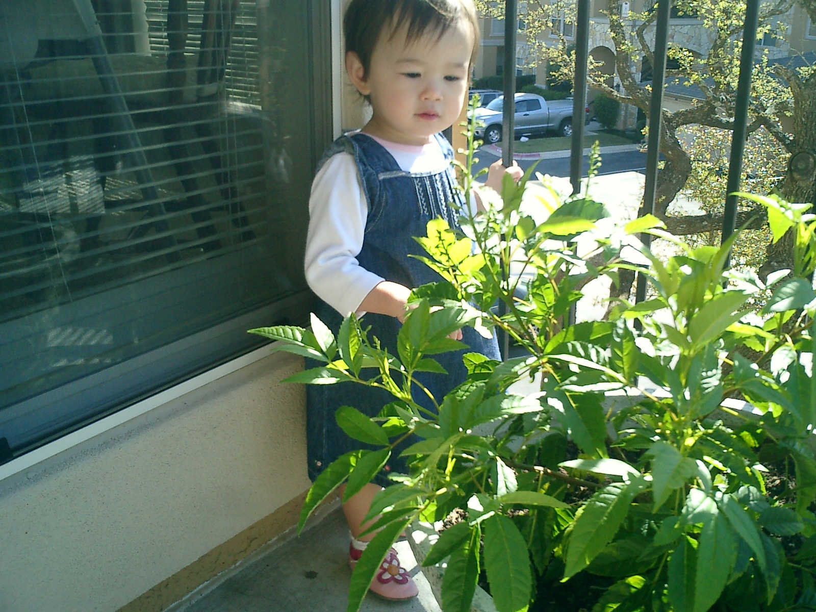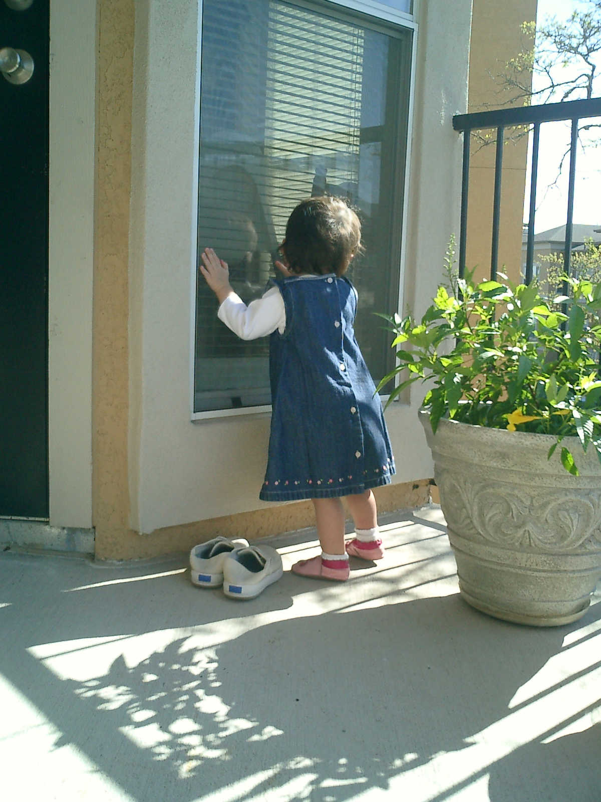 Nadine at 16 months (Mar 20, 2008), enjoying the early morning sunshine on Ms. Lilia's balcony. Nadine, you look like a real Texas girl in the blue jean dress!