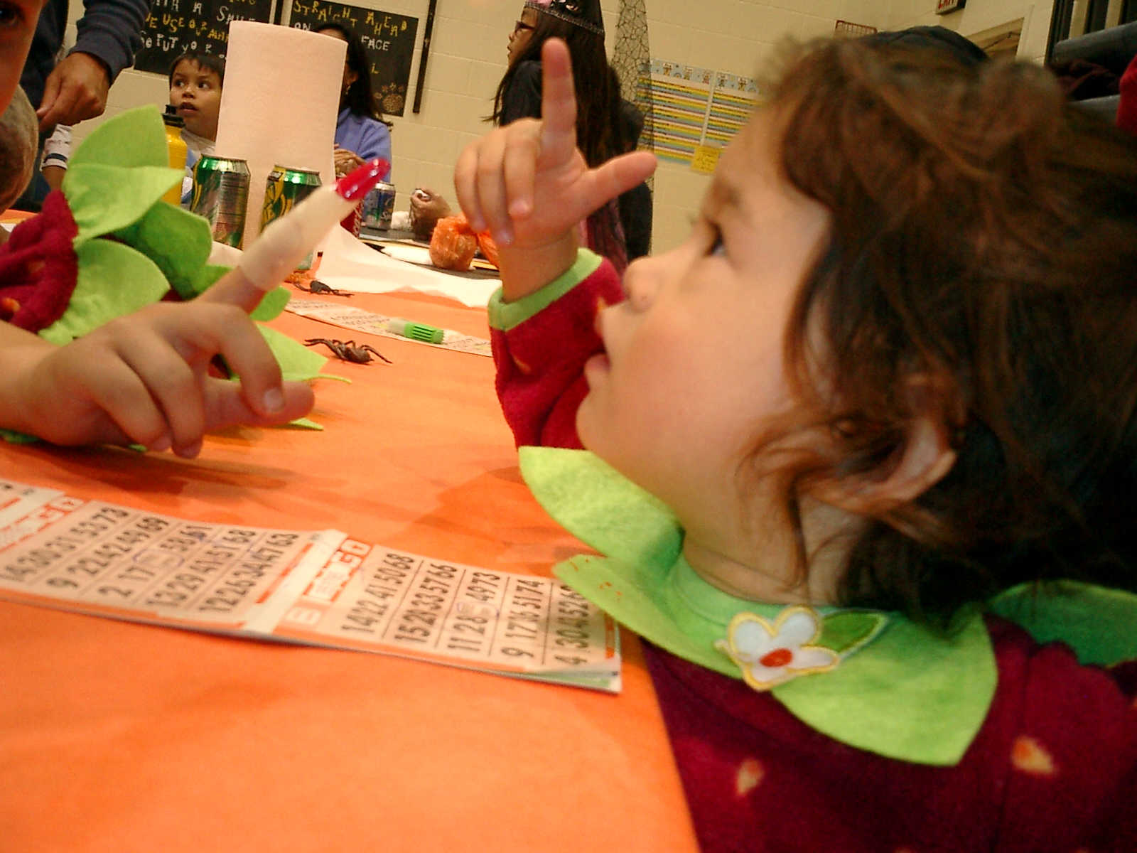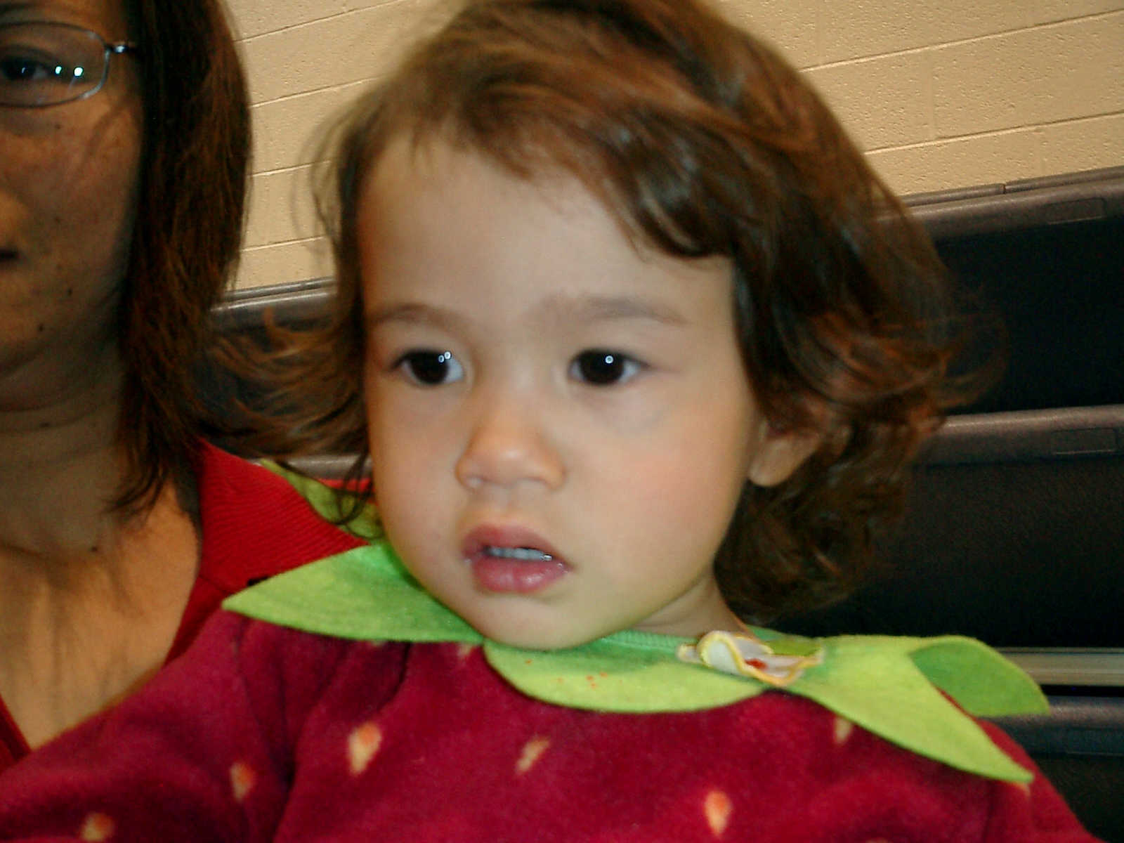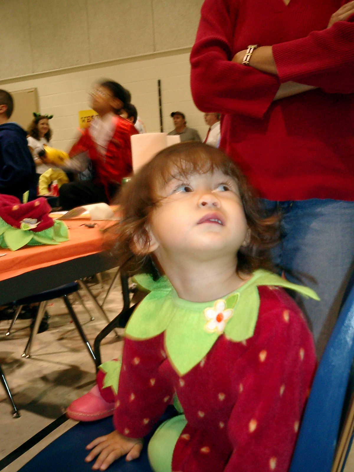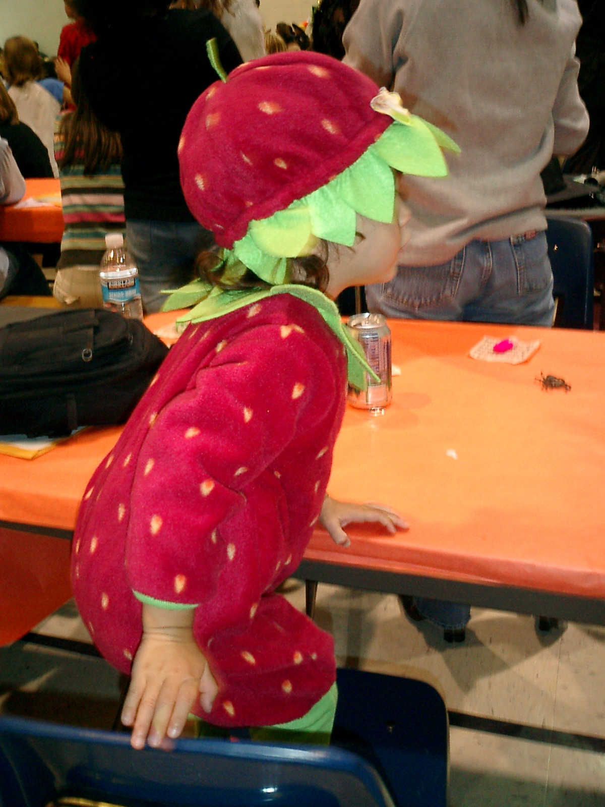 Nadine at 23 months (October 24, 2008), attending Halloween Bingo Night at Nolan's school. Nadine, how do you like being a strawberry? Very cute!