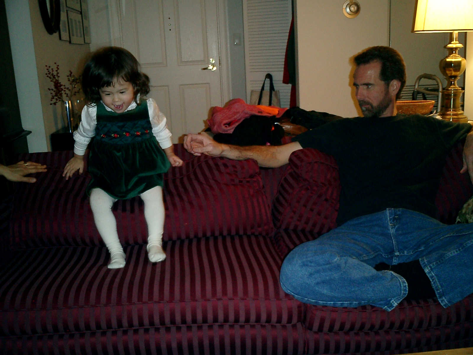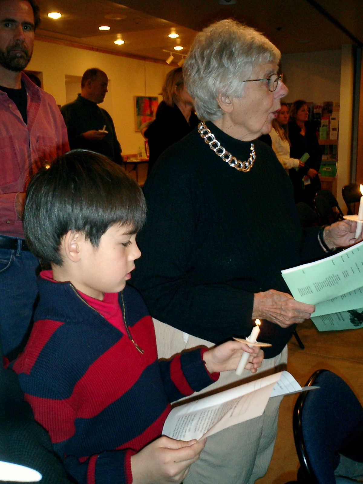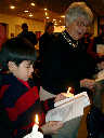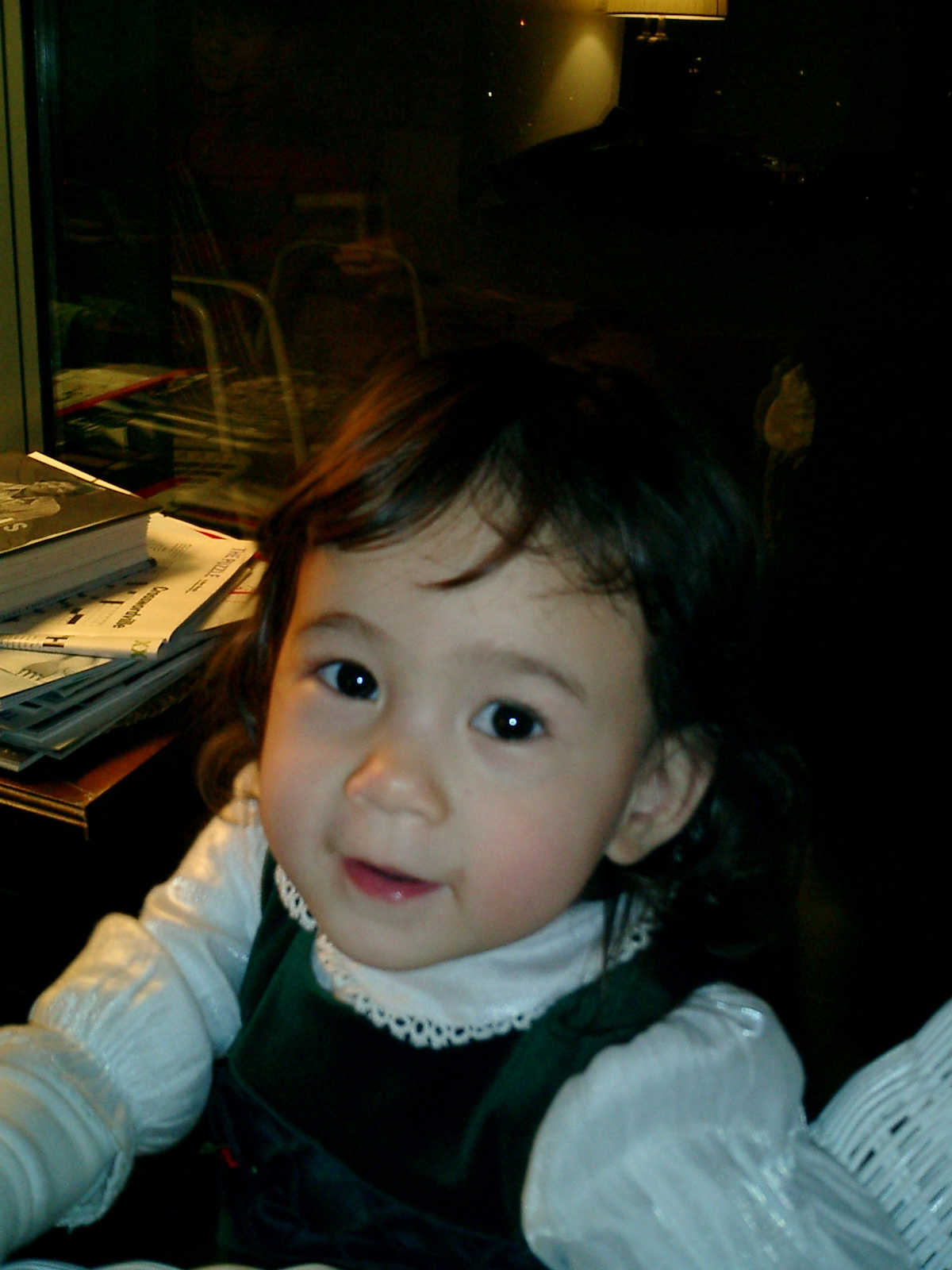 | Nadine at 25 months (December 24, 2008), celebrating Christmas Eve at the Arlington Unitarian Church. Nadine, did you enjoy the candle lighting ceremony? How about the Mitten Tree? We sure had fun at Grandma Alexander's house afterwards -- with Uncle David too! |