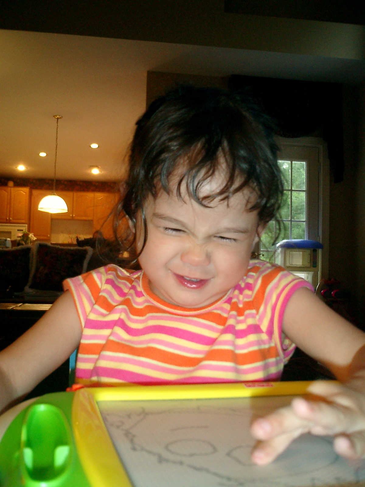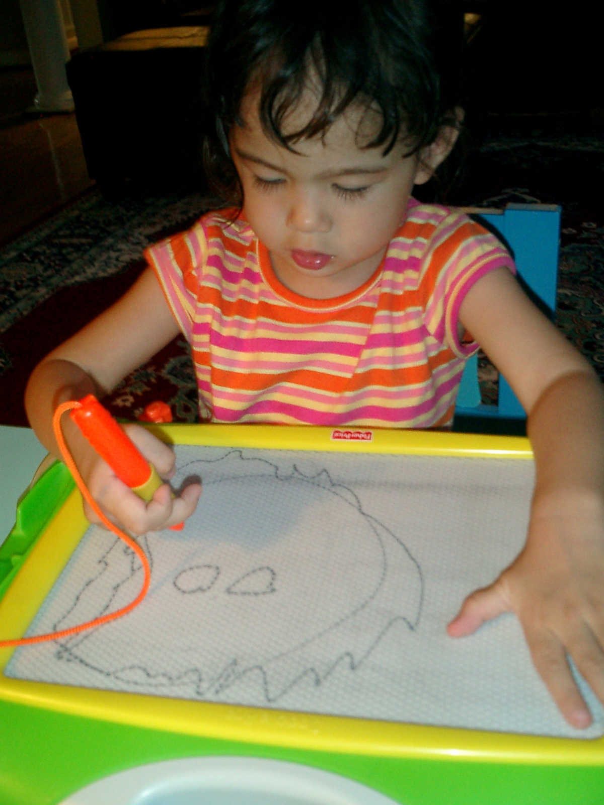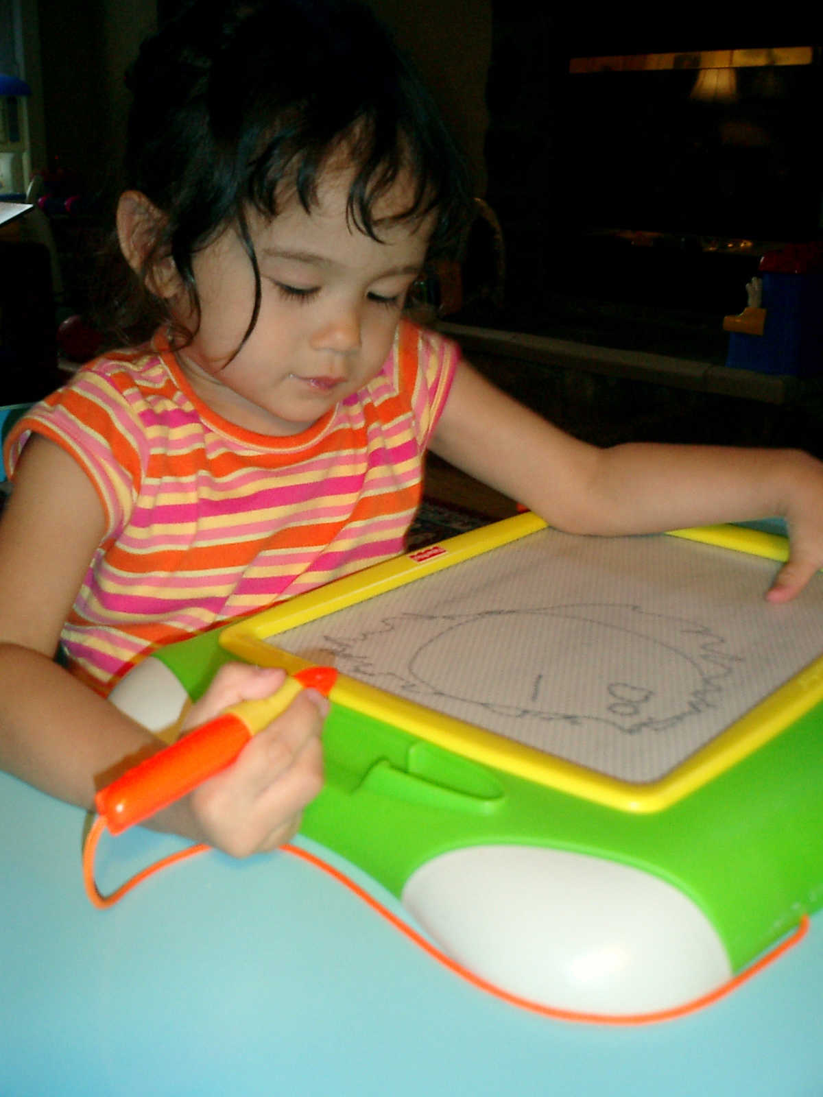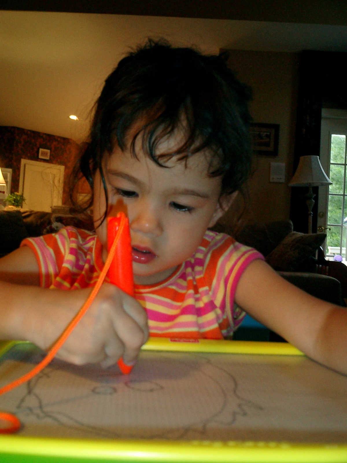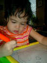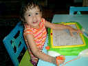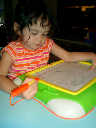 Nadine at 2 years and 6 months (June 7, 2009), drawing pictures on her Etch-A-Sketch. Nadine, you really love to draw pictures of Mommy, Daddy, and Nolan -- with big round heads, complete with tiny eyes and noses too! Very artistic!