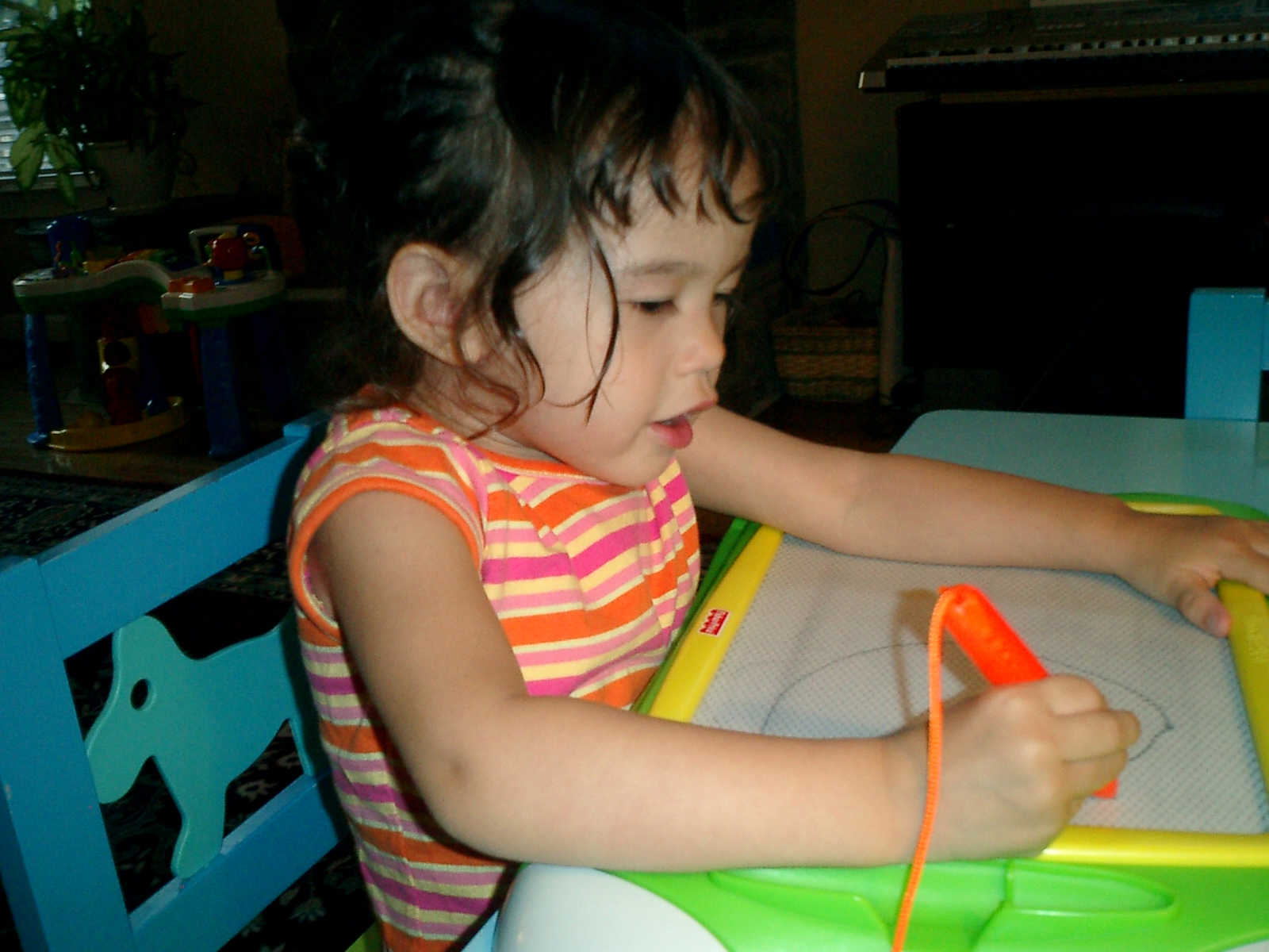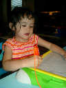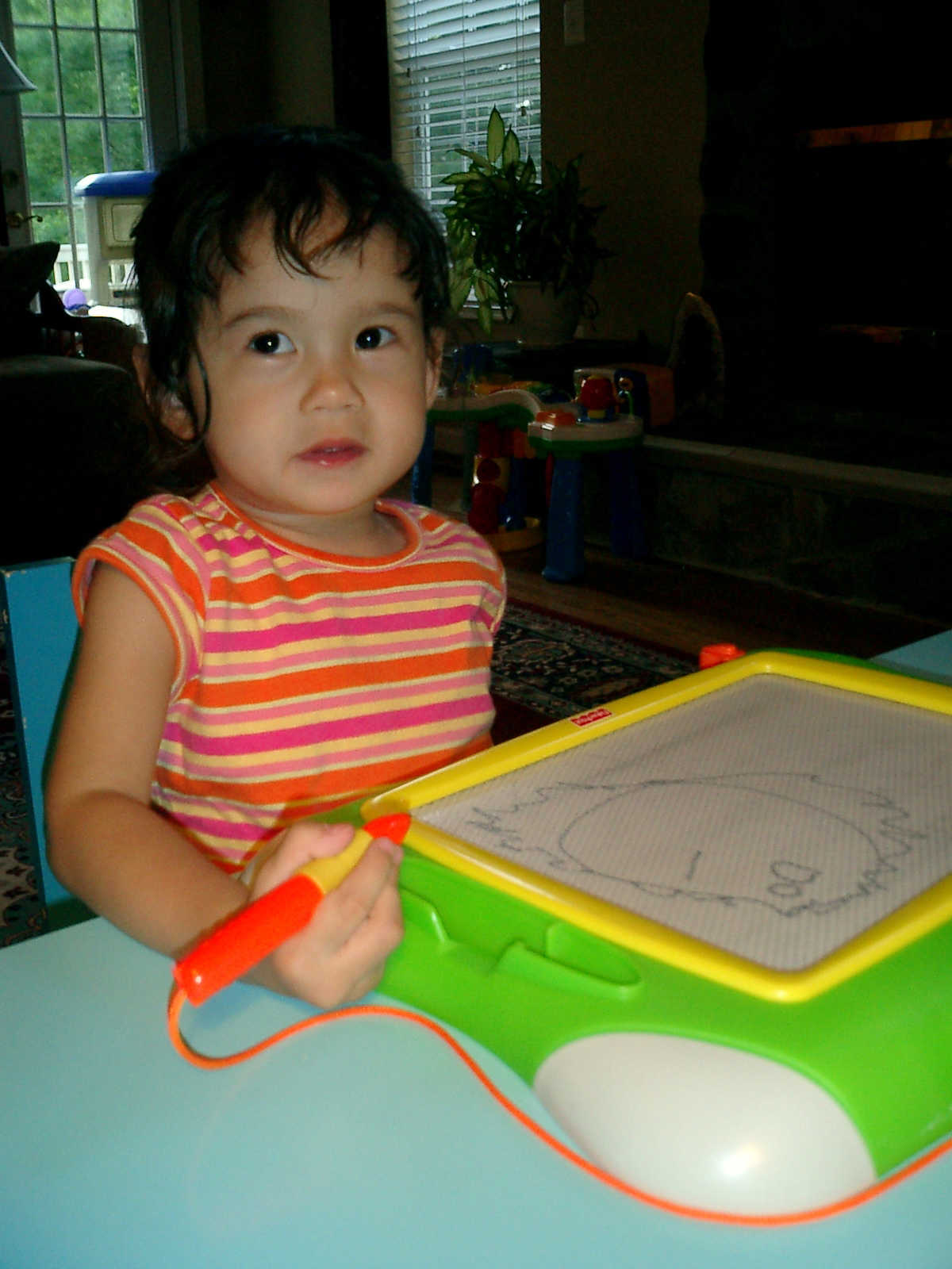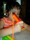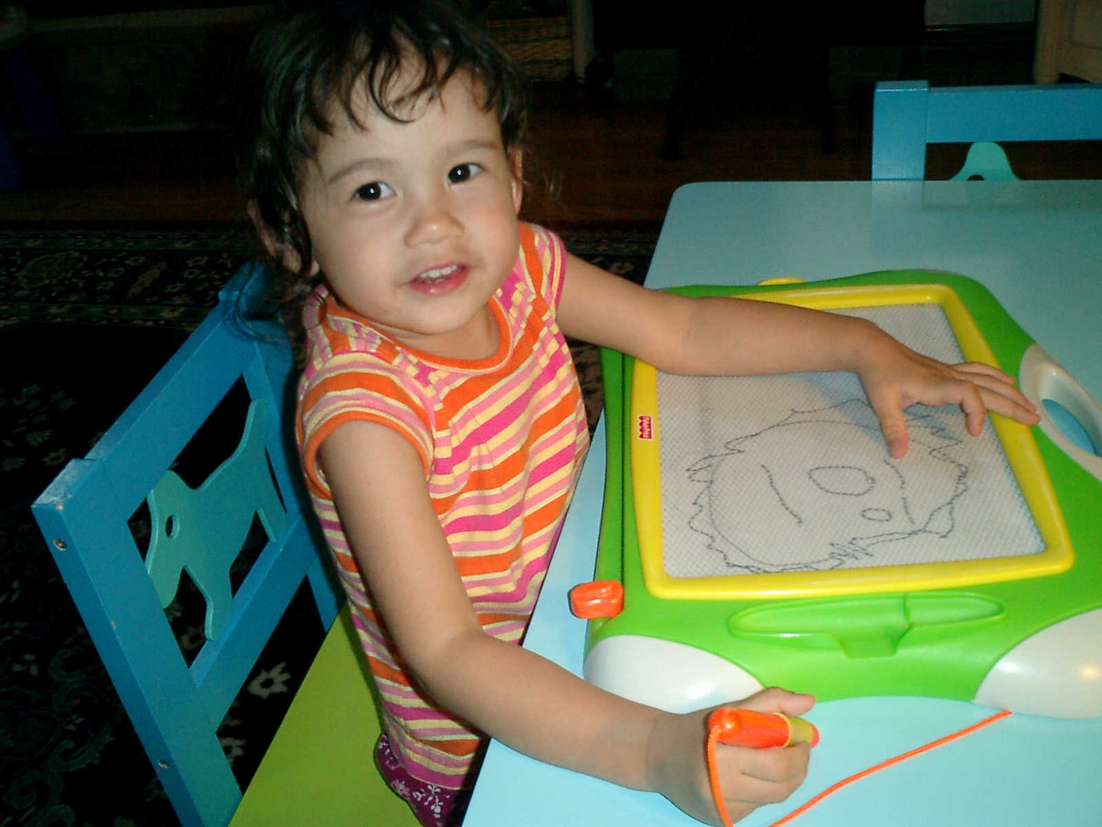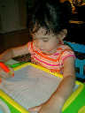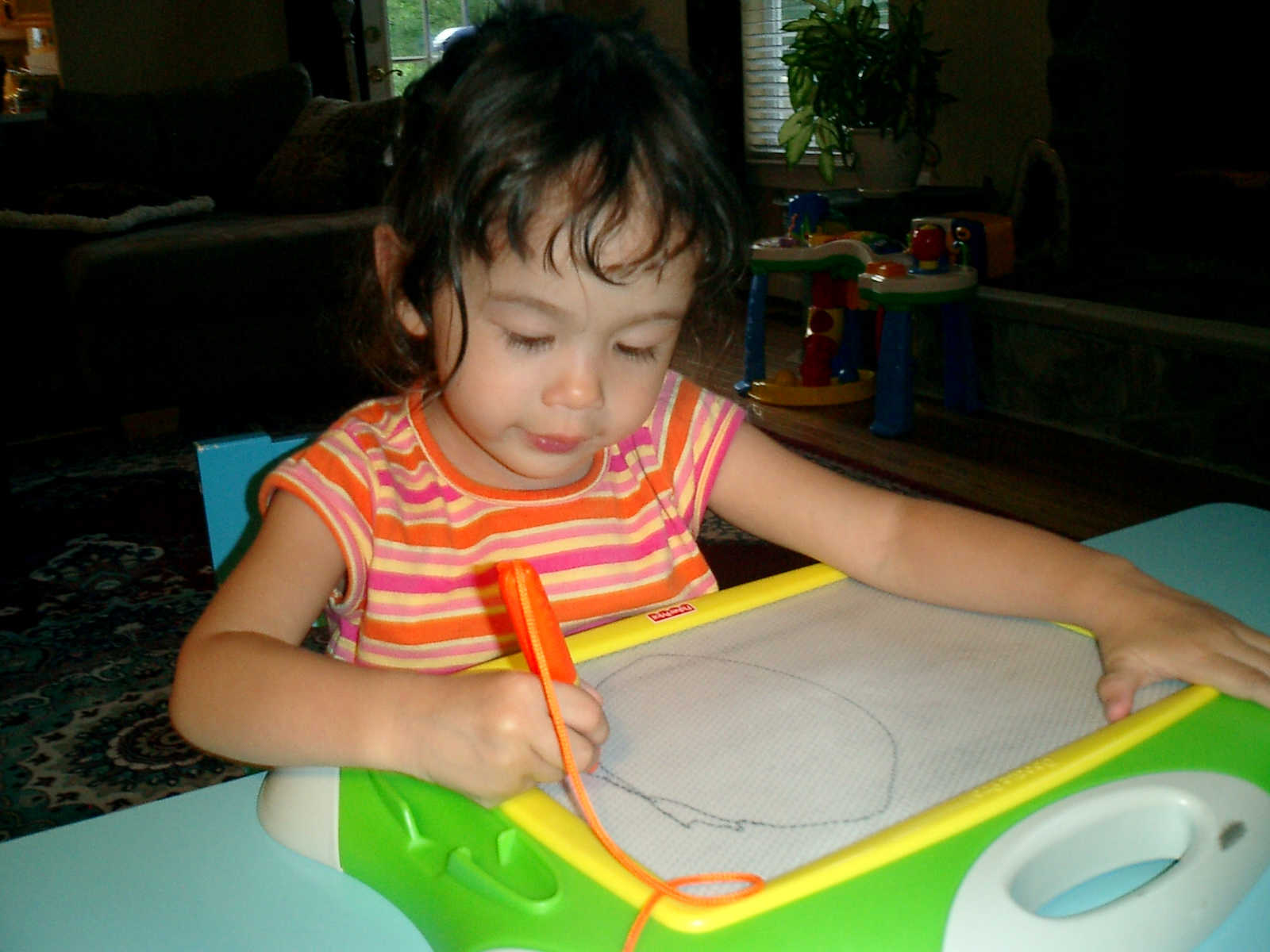 Nadine at 2 years and 6 months (June 7, 2009), drawing pictures on her Etch-A-Sketch. Nadine, you really love to draw pictures of Mommy, Daddy, and Nolan -- with big round heads, complete with tiny eyes and noses too! Very artistic!
