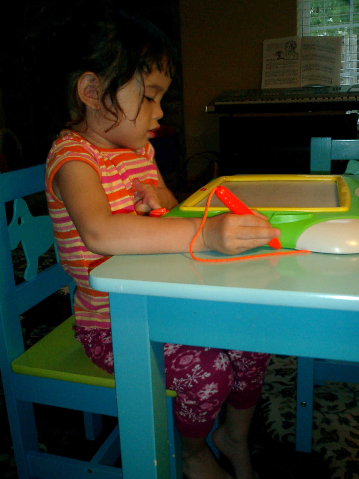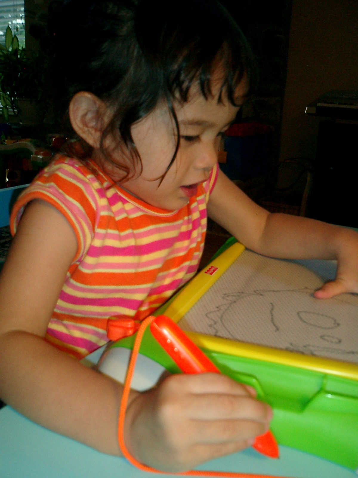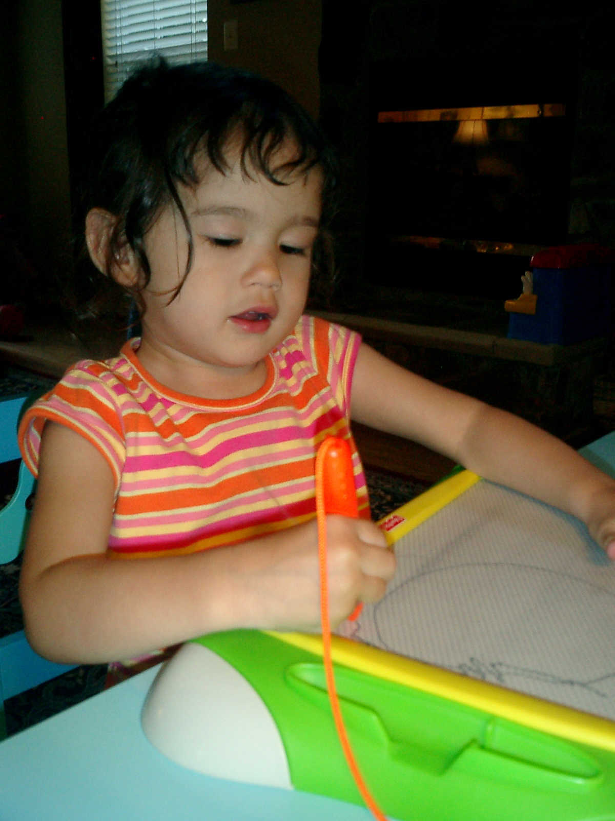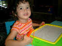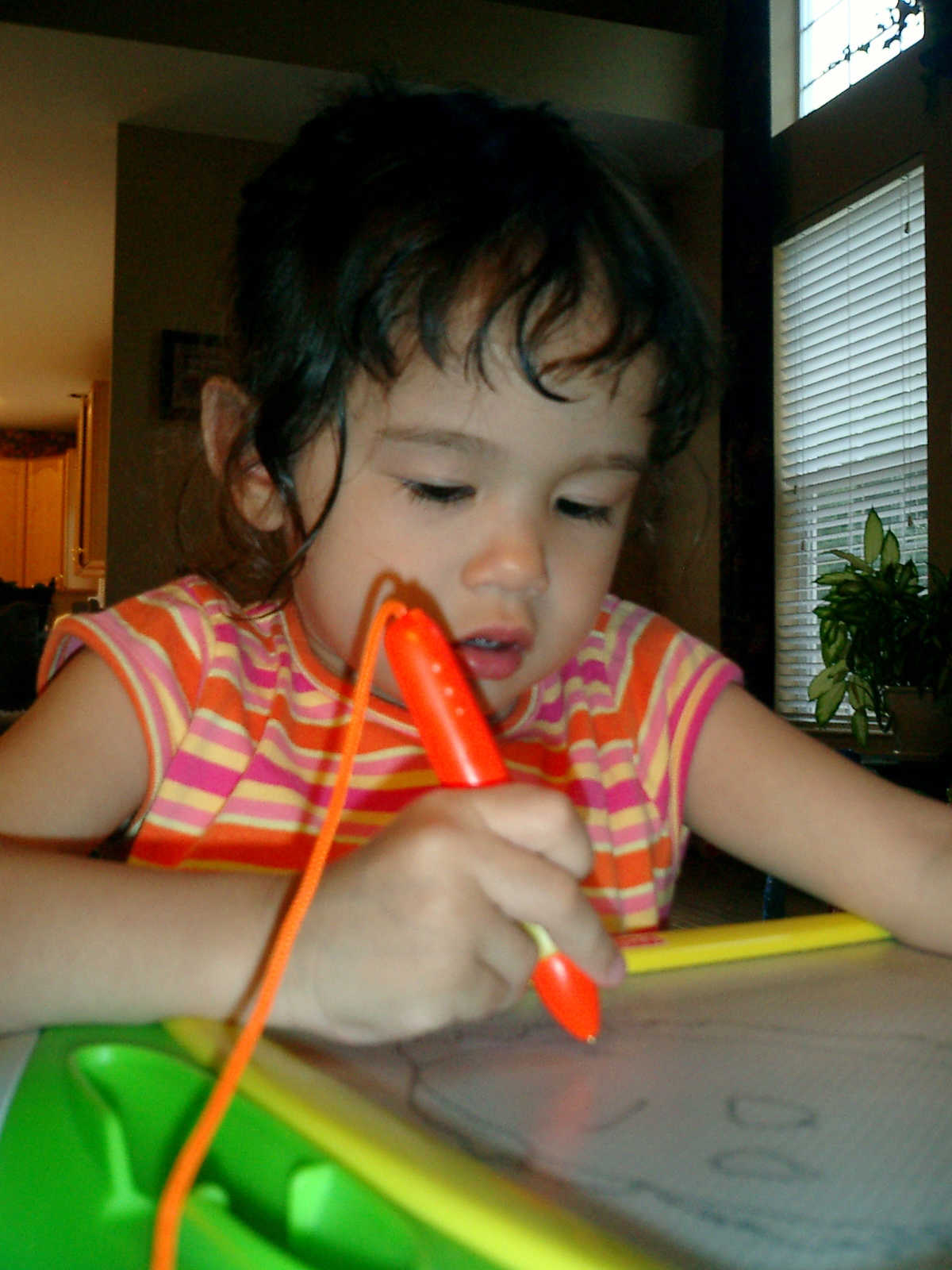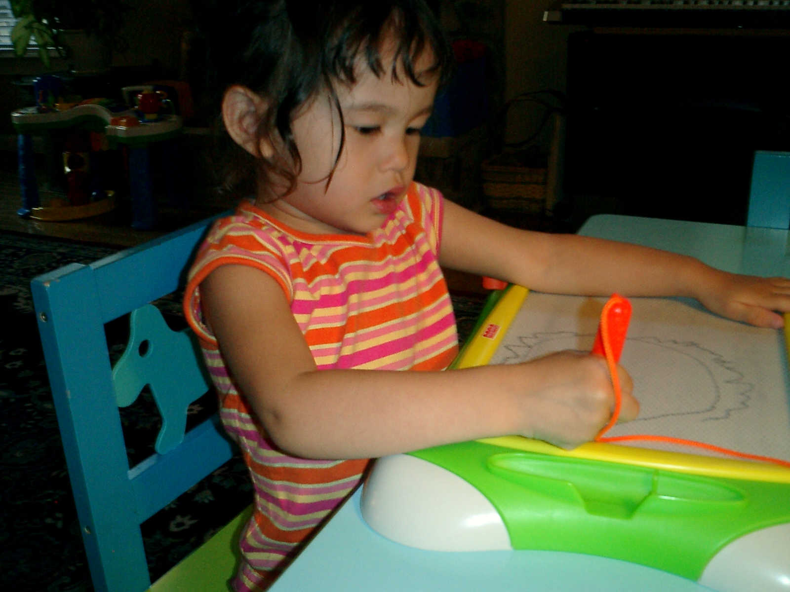 Nadine at 2 years and 6 months (June 7, 2009), drawing pictures on her Etch-A-Sketch. Nadine, you really love to draw pictures of Mommy, Daddy, and Nolan -- with big round heads, complete with tiny eyes and noses too! Very artistic!