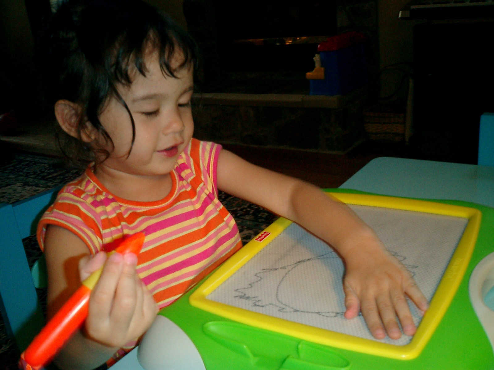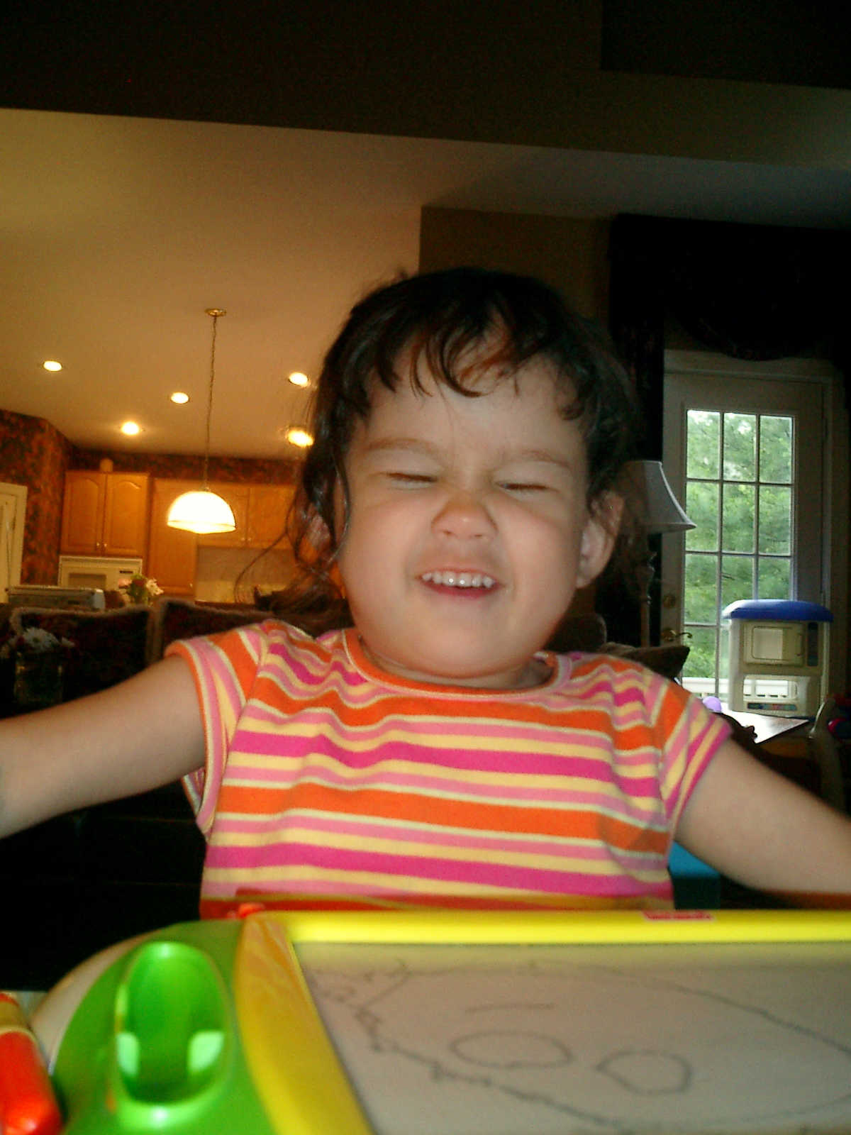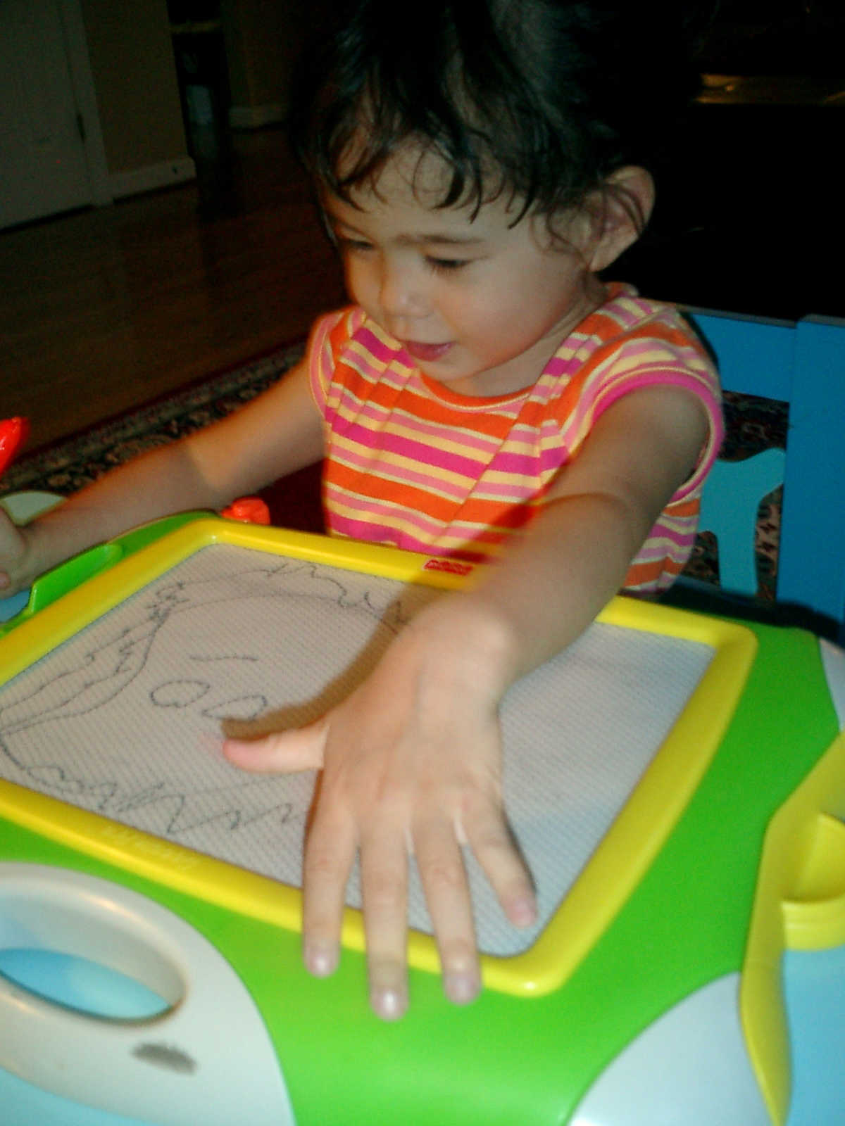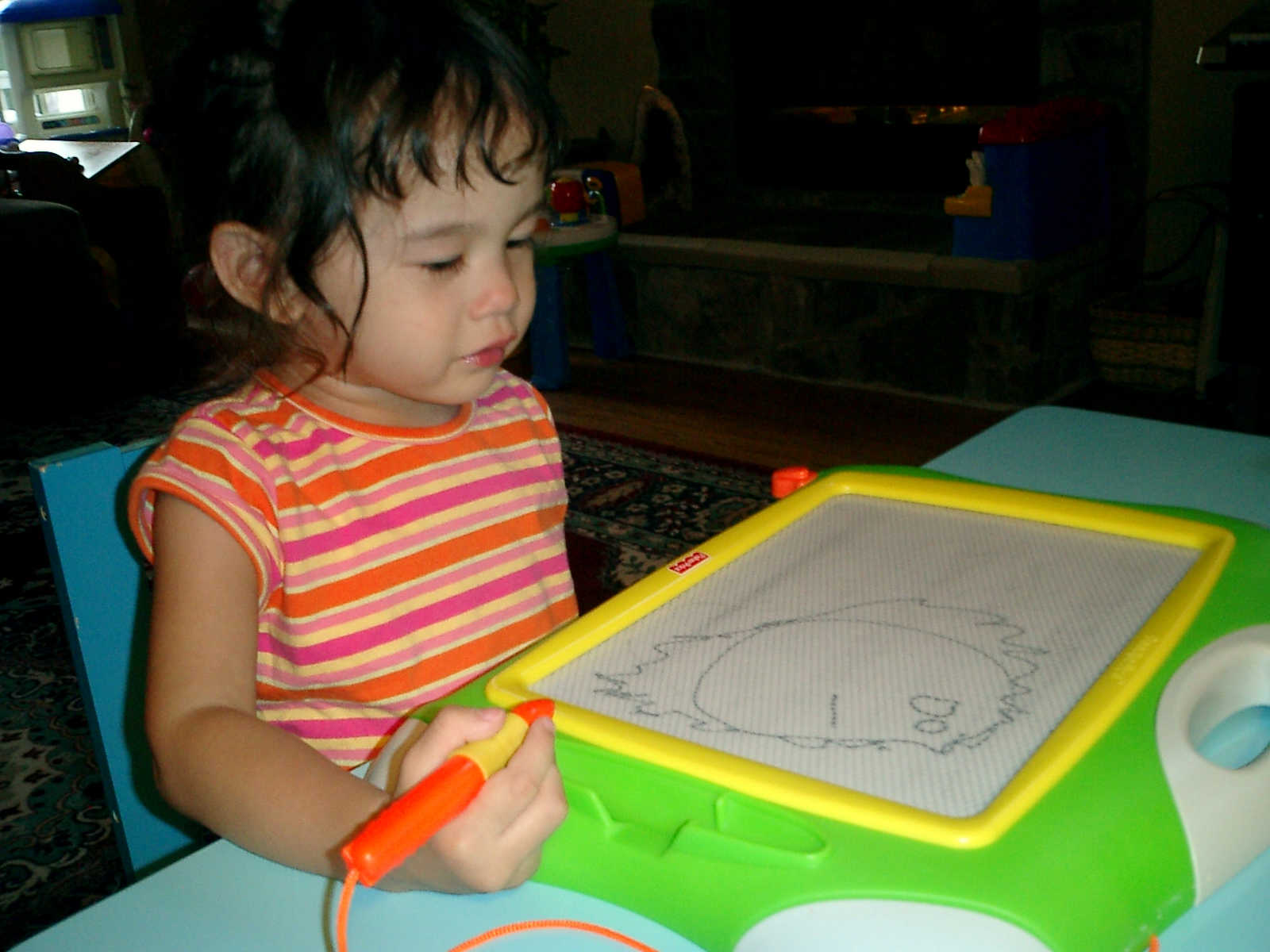 Nadine at 2 years and 6 months (June 7, 2009), drawing pictures on her Etch-A-Sketch. Nadine, you really love to draw pictures of Mommy, Daddy, and Nolan -- with big round heads, complete with tiny eyes and noses too! Very artistic!