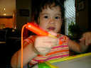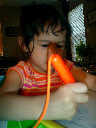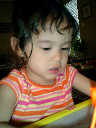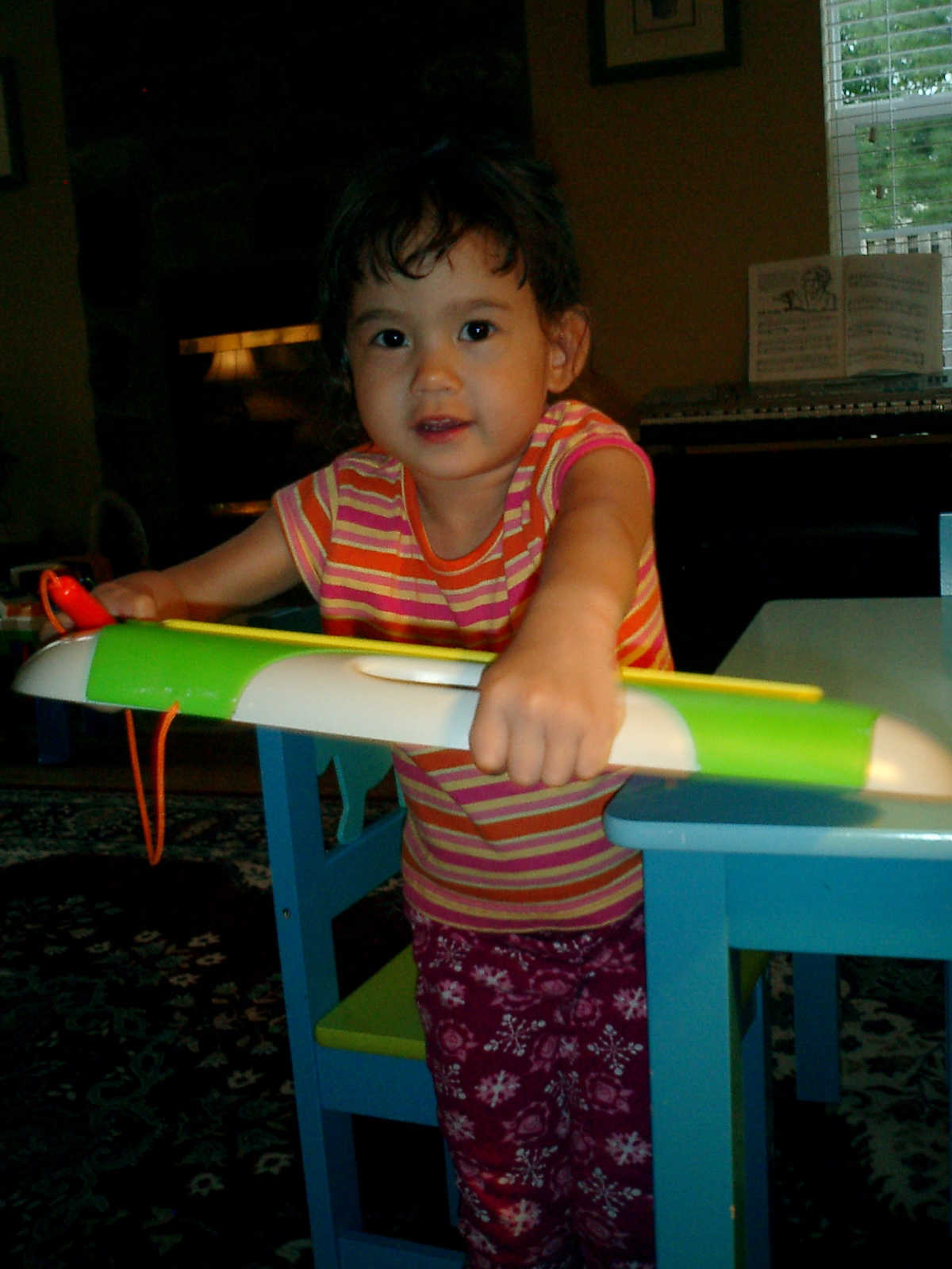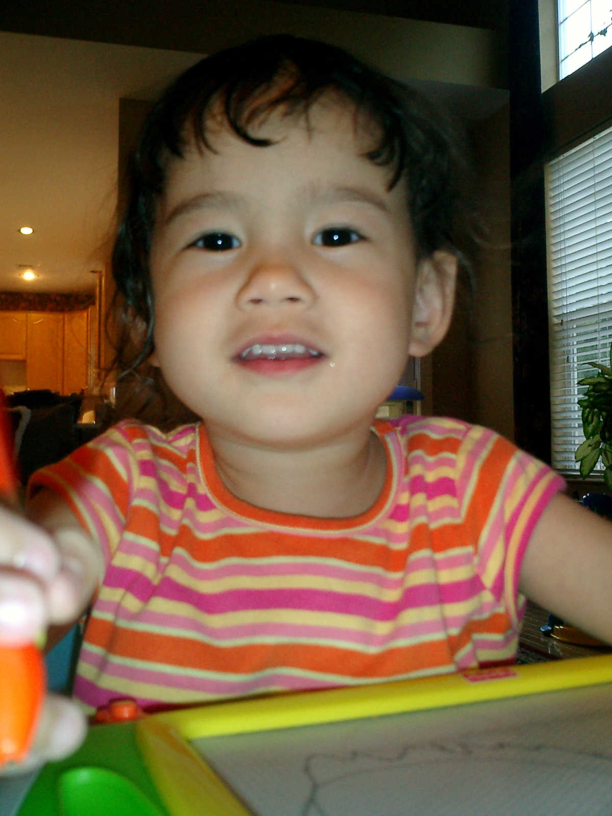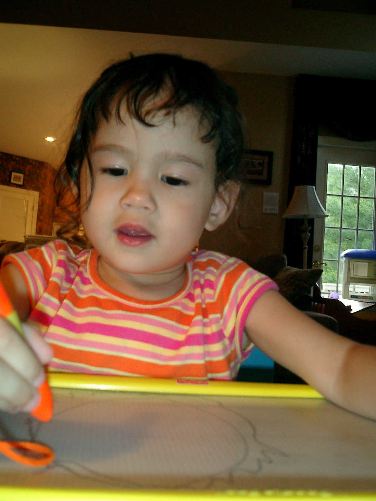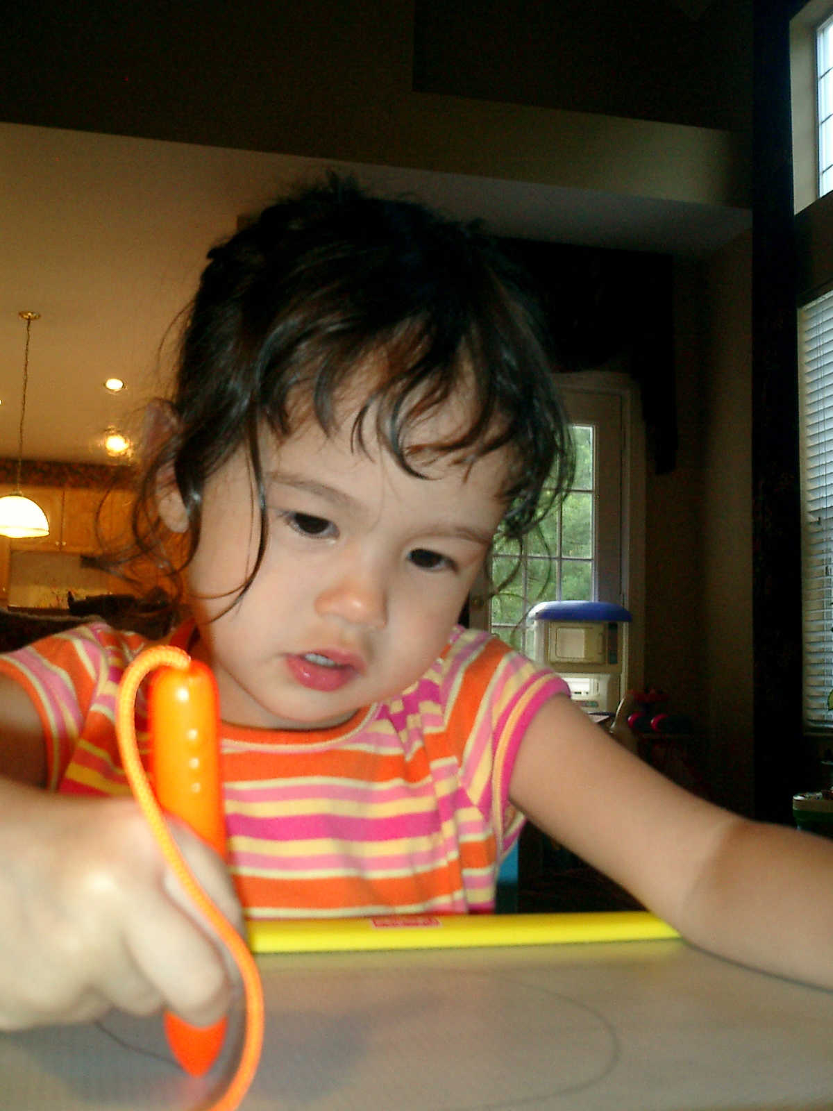 Nadine at 2 years and 6 months (June 7, 2009), drawing pictures on her Etch-A-Sketch. Nadine, you really love to draw pictures of Mommy, Daddy, and Nolan -- with big round heads, complete with tiny eyes and noses too! Very artistic!