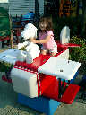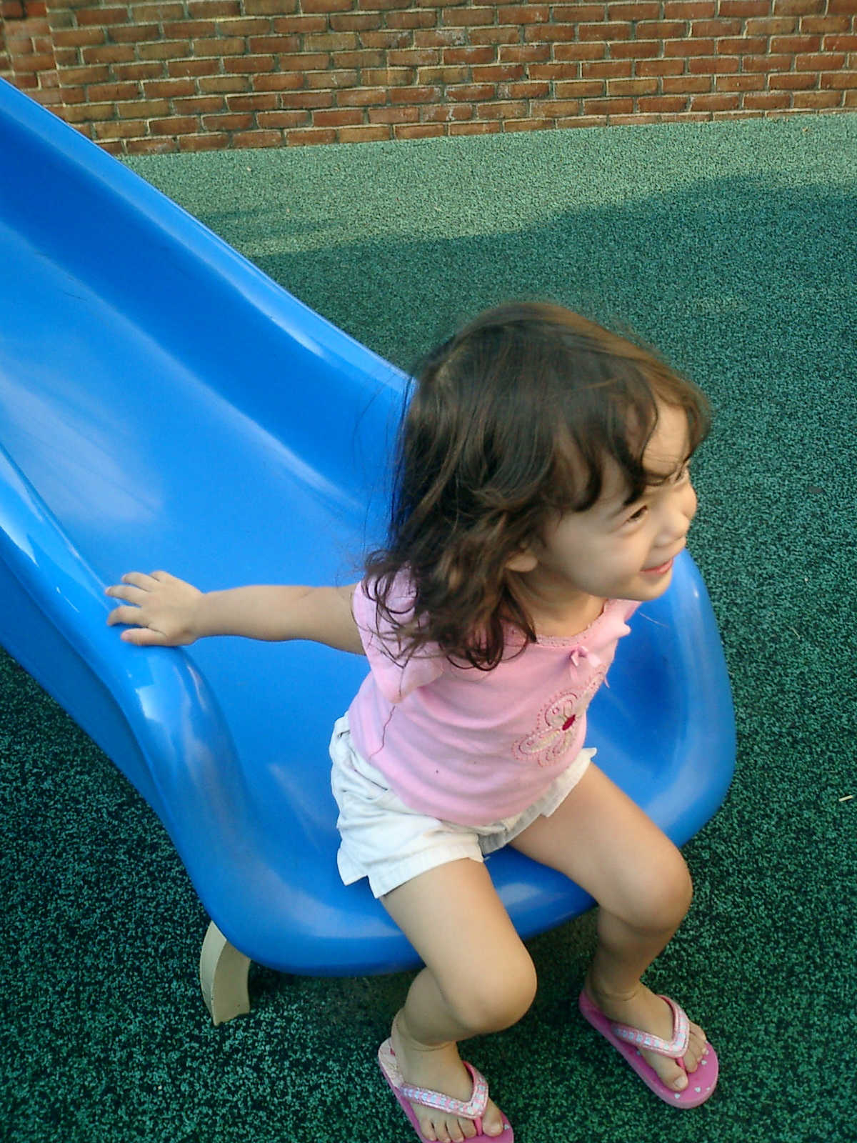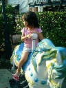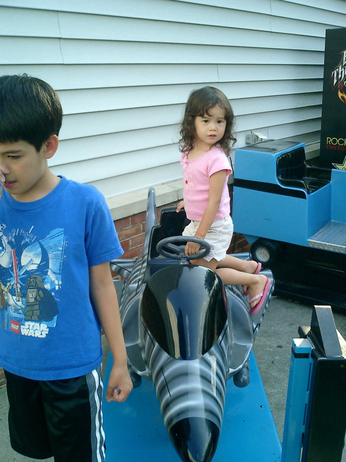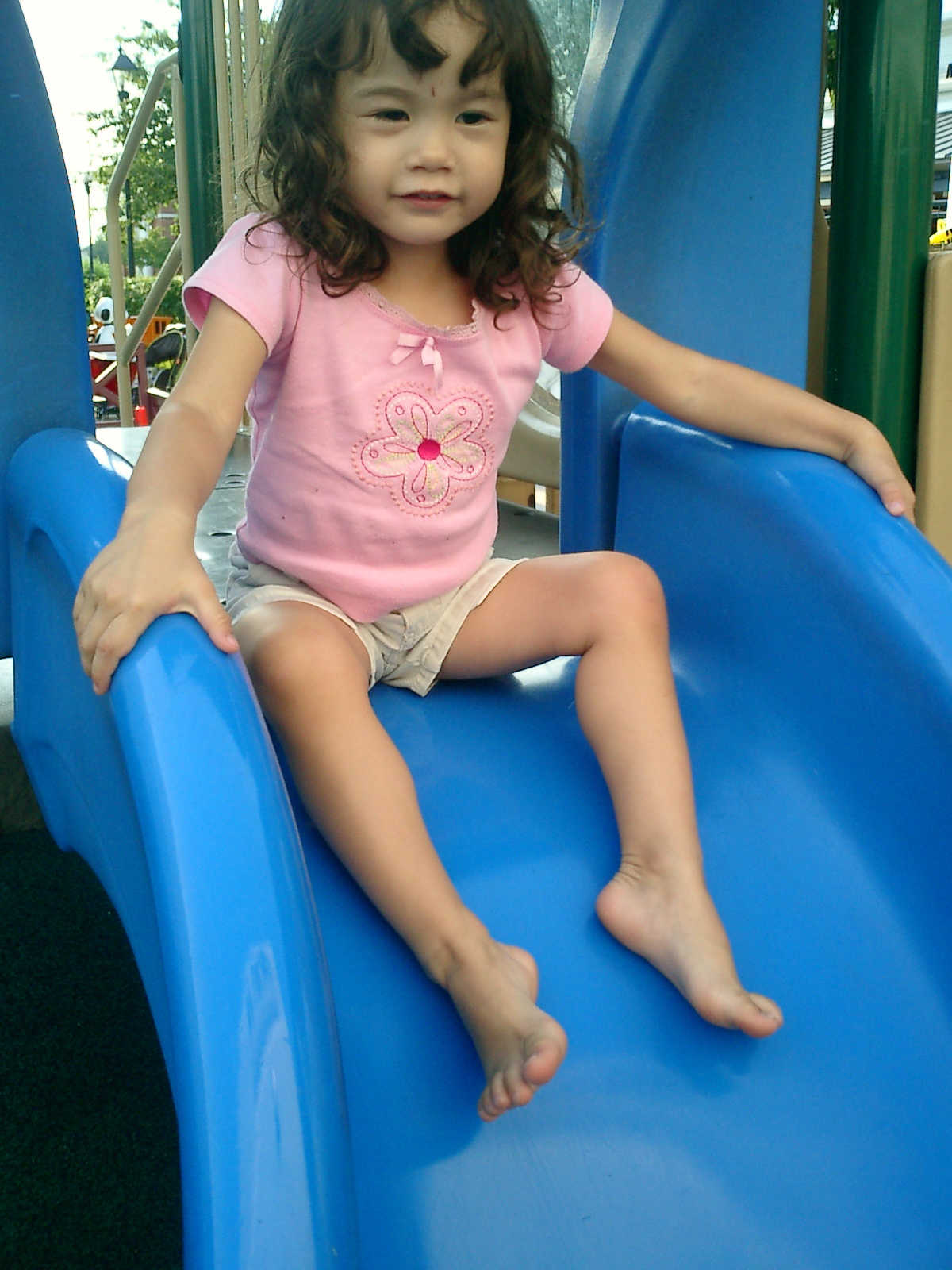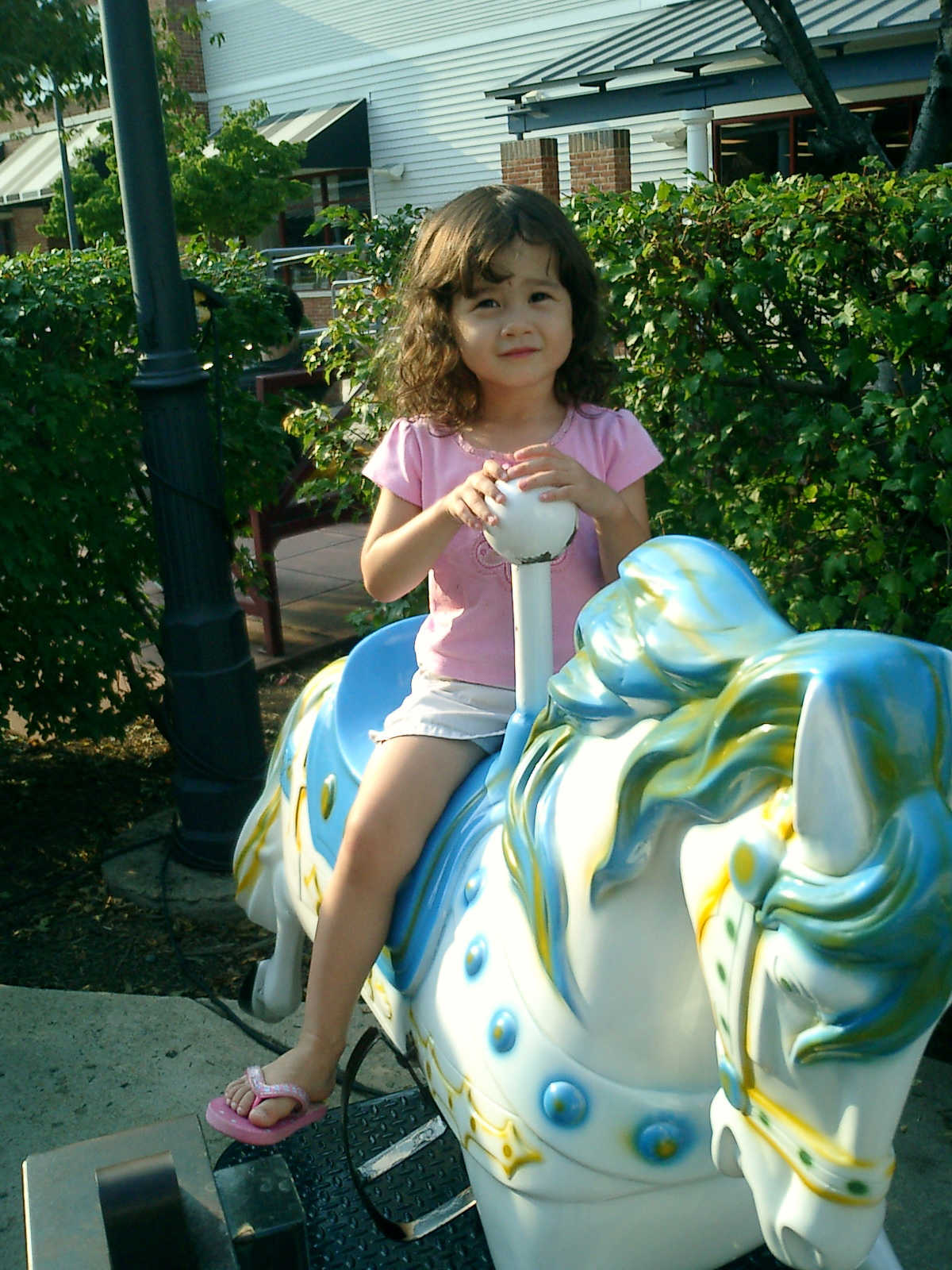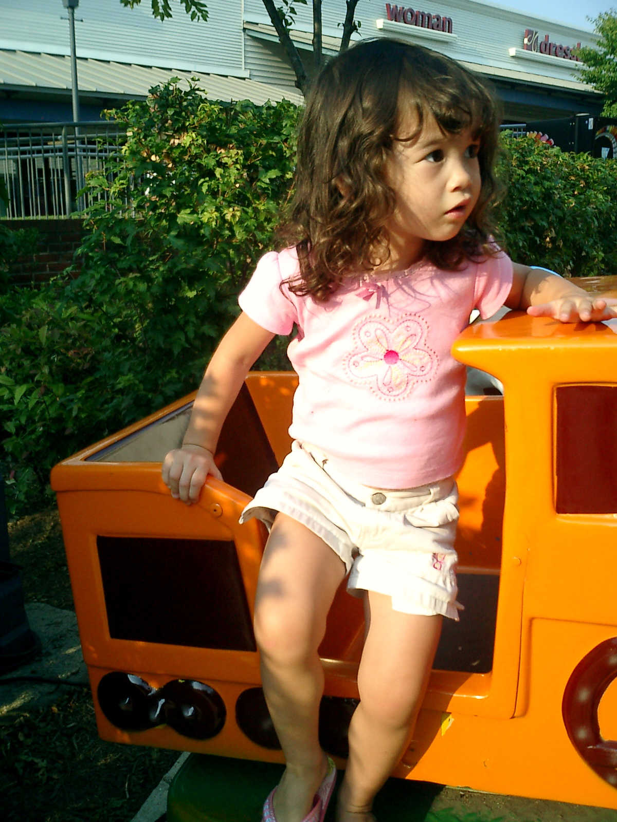 Nadine at 2 years and 8 months (July 21, 2009), at leesburg Outlet Mall with Nolan, having fun on the playground and rides. Nadine, the most fun was just climbing up onto all them, wasn't it?